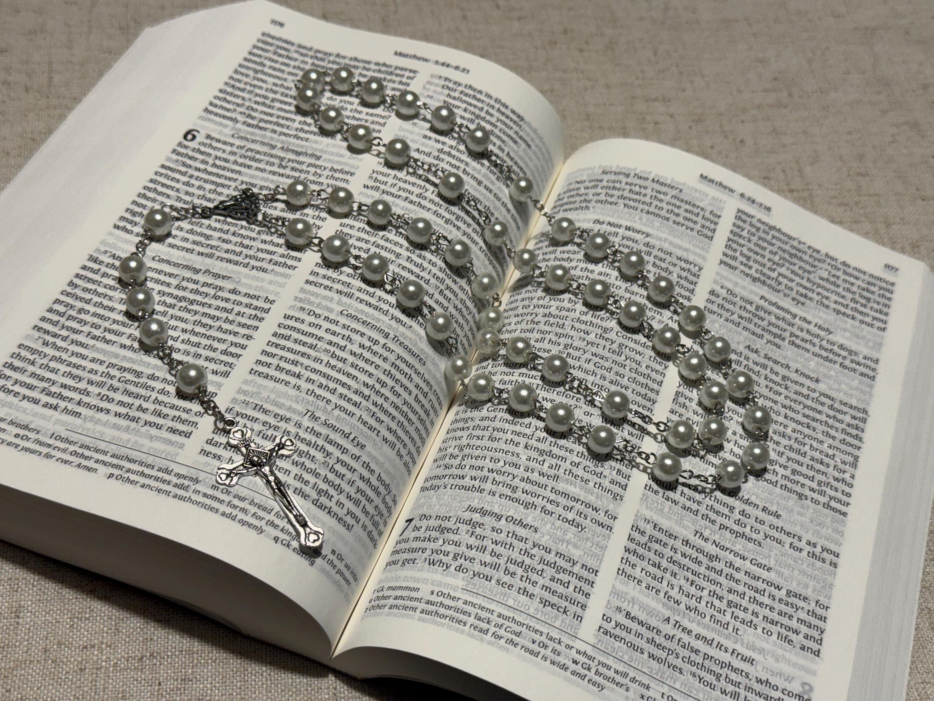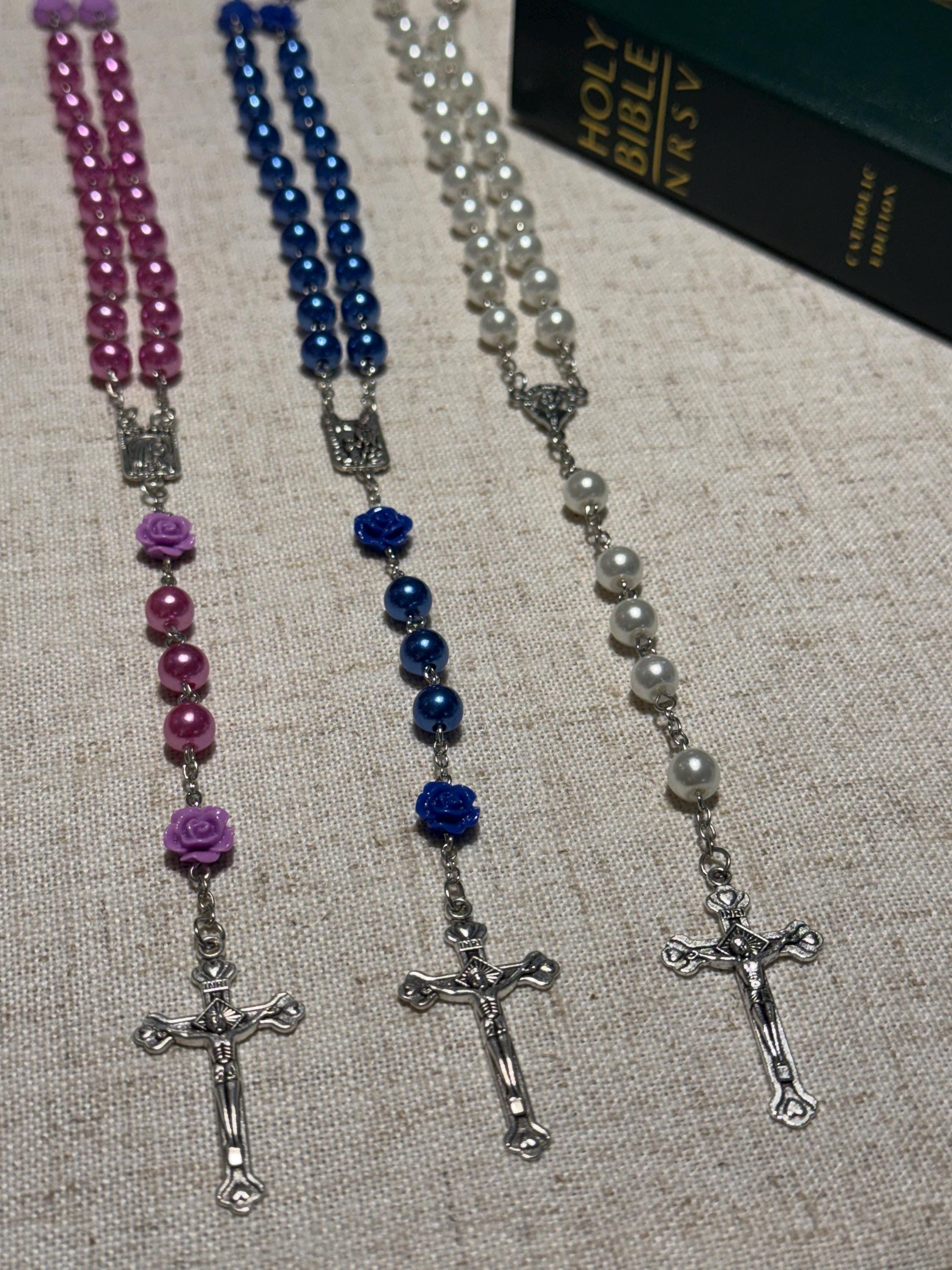 Experience the gentle elegance of our faux pearls baptism rosary, designed to inspire devotion and grace during sacred moments. Whether preparing for a rosary for communion or seeking an elegant faux rosary for a meaningful gift, this piece blends tradition with luminous beauty. Crafted with soft luminous beads and a durable metal chain, it offers both comfort and lasting reverence.