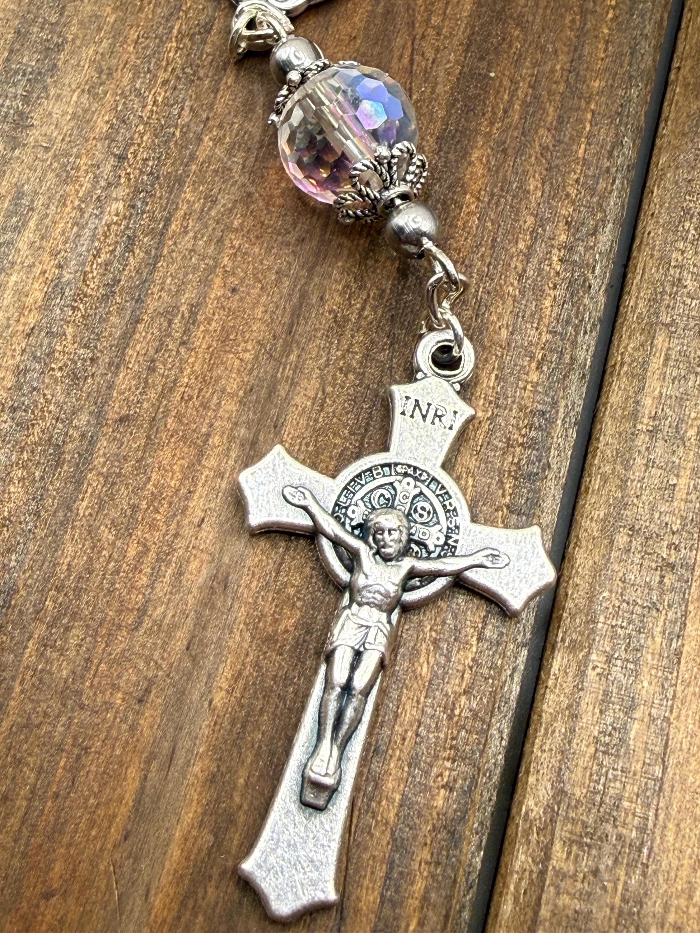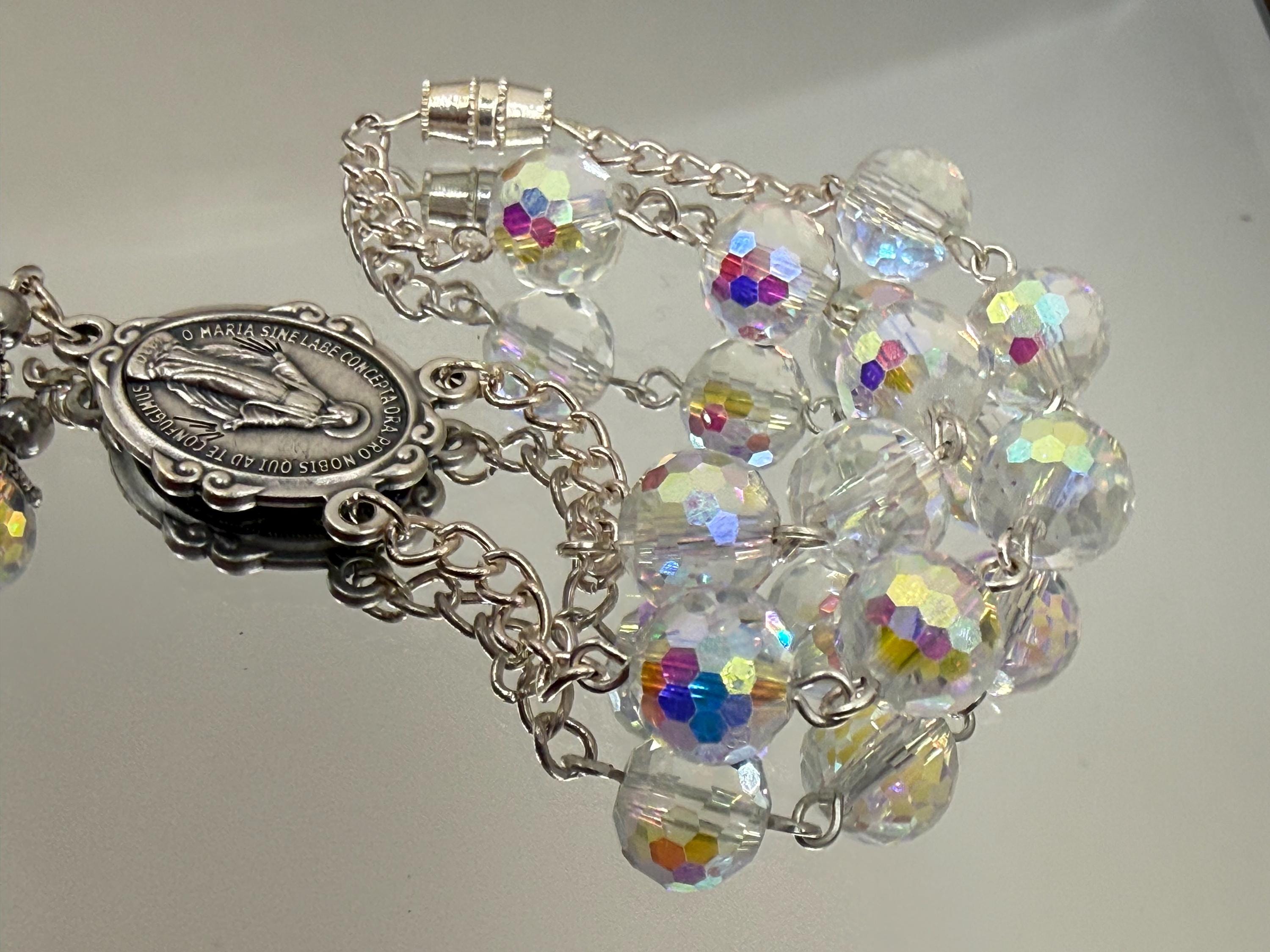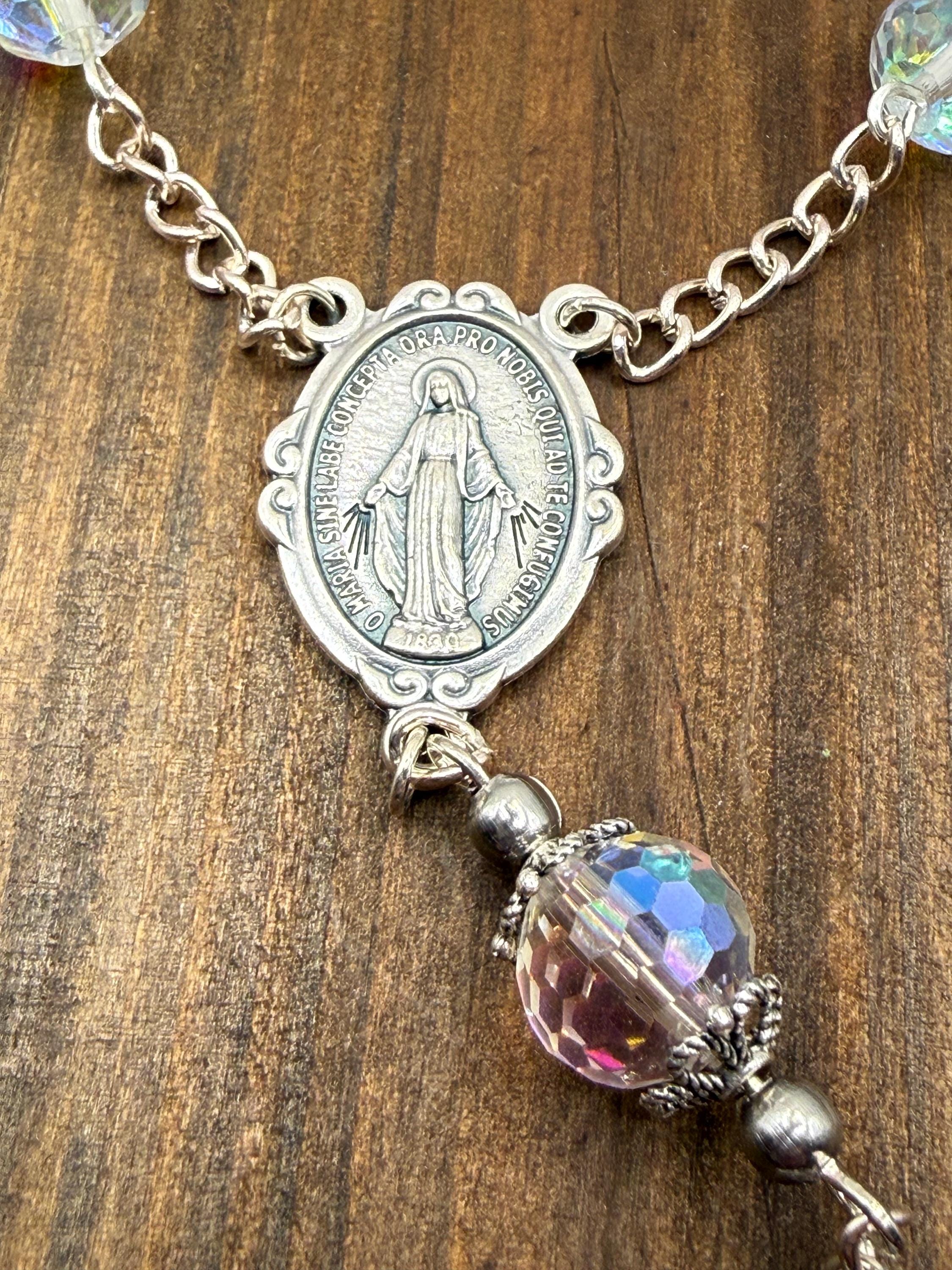 Experience a moment of calm and devotion on every journey with this handmade car rosary, thoughtfully designed for prayer and reflection. Featuring radiant Austrian crystals and an Italian-crafted centerpiece of Our Lady of Grace, this piece beautifully blends faith and elegance. Perfect for those seeking a meaningful accessory that honors Catholic traditions such as confirmation and first communion.