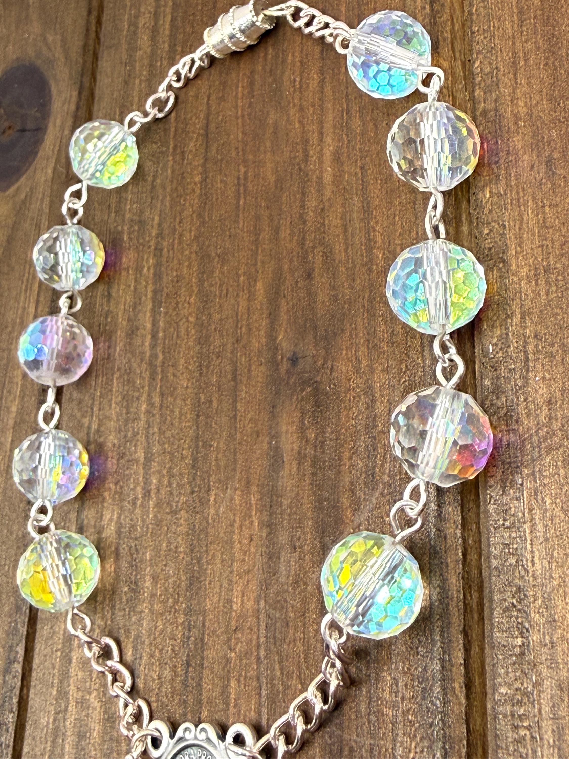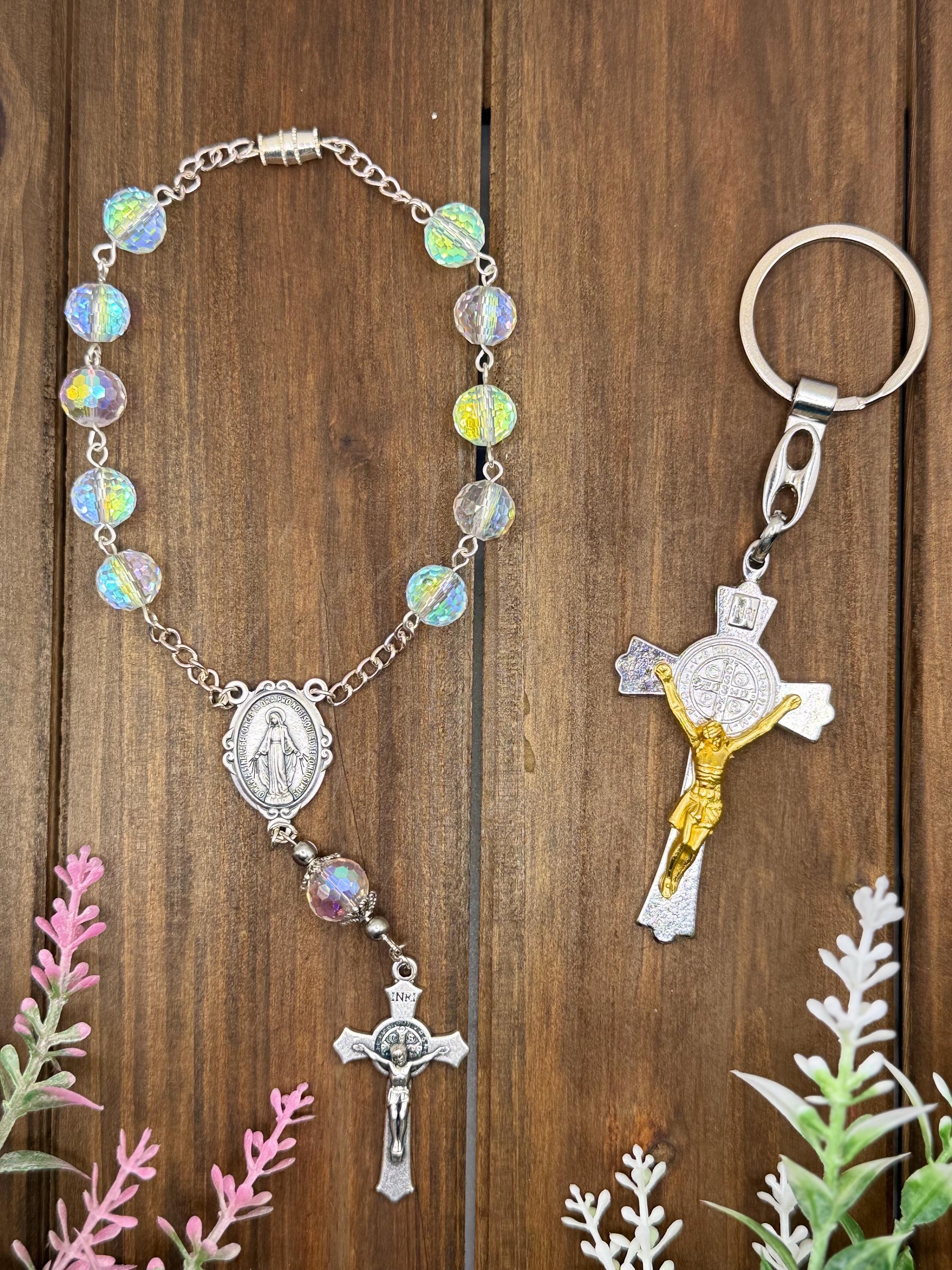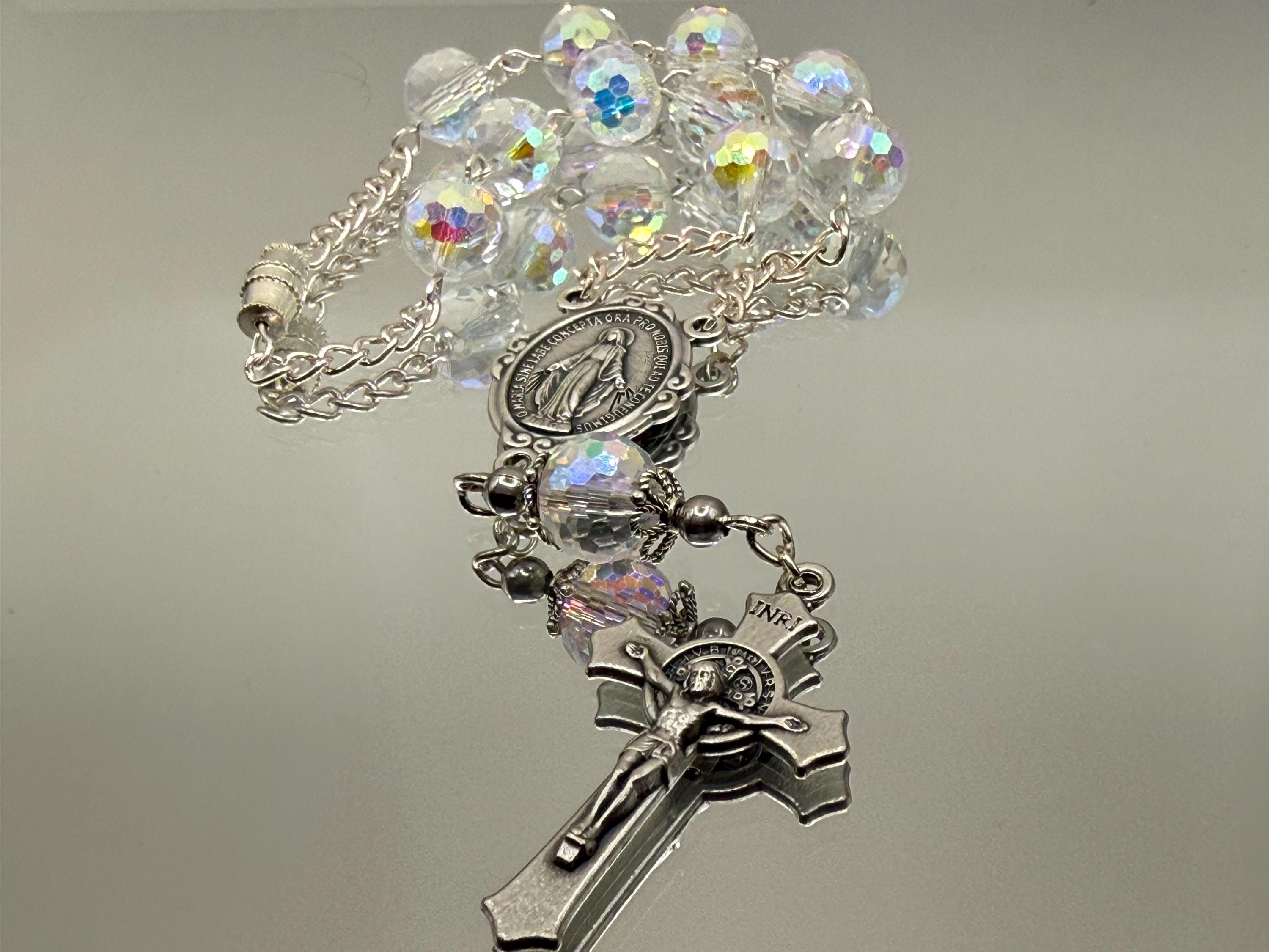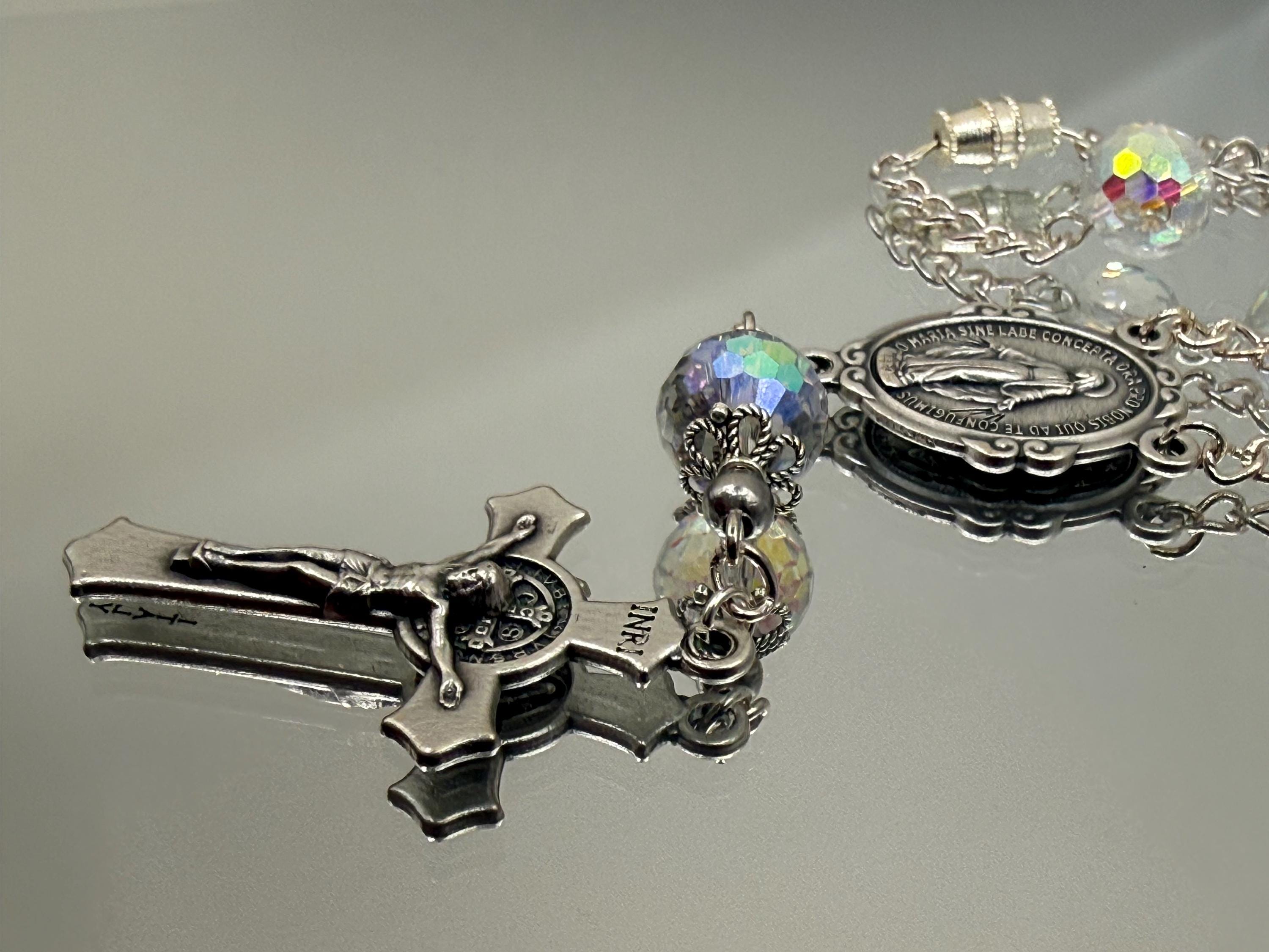 Experience a moment of calm and devotion on every journey with this handmade car rosary, thoughtfully designed for prayer and reflection. Featuring radiant Austrian crystals and an Italian-crafted centerpiece of Our Lady of Grace, this piece beautifully blends faith and elegance. Perfect for those seeking a meaningful accessory that honors Catholic traditions such as confirmation and first communion.