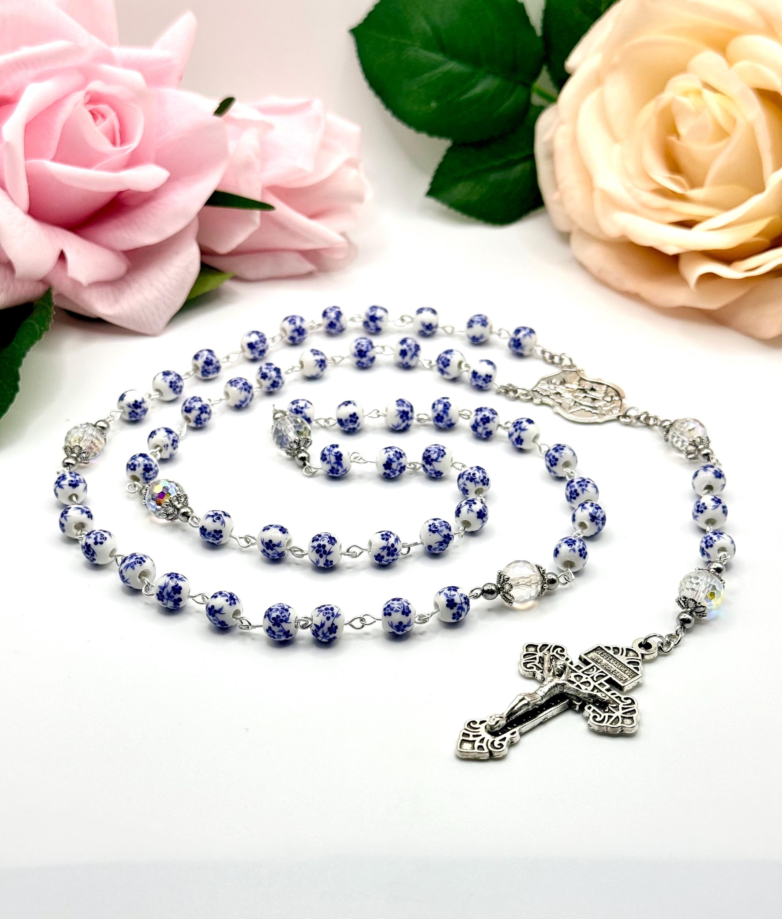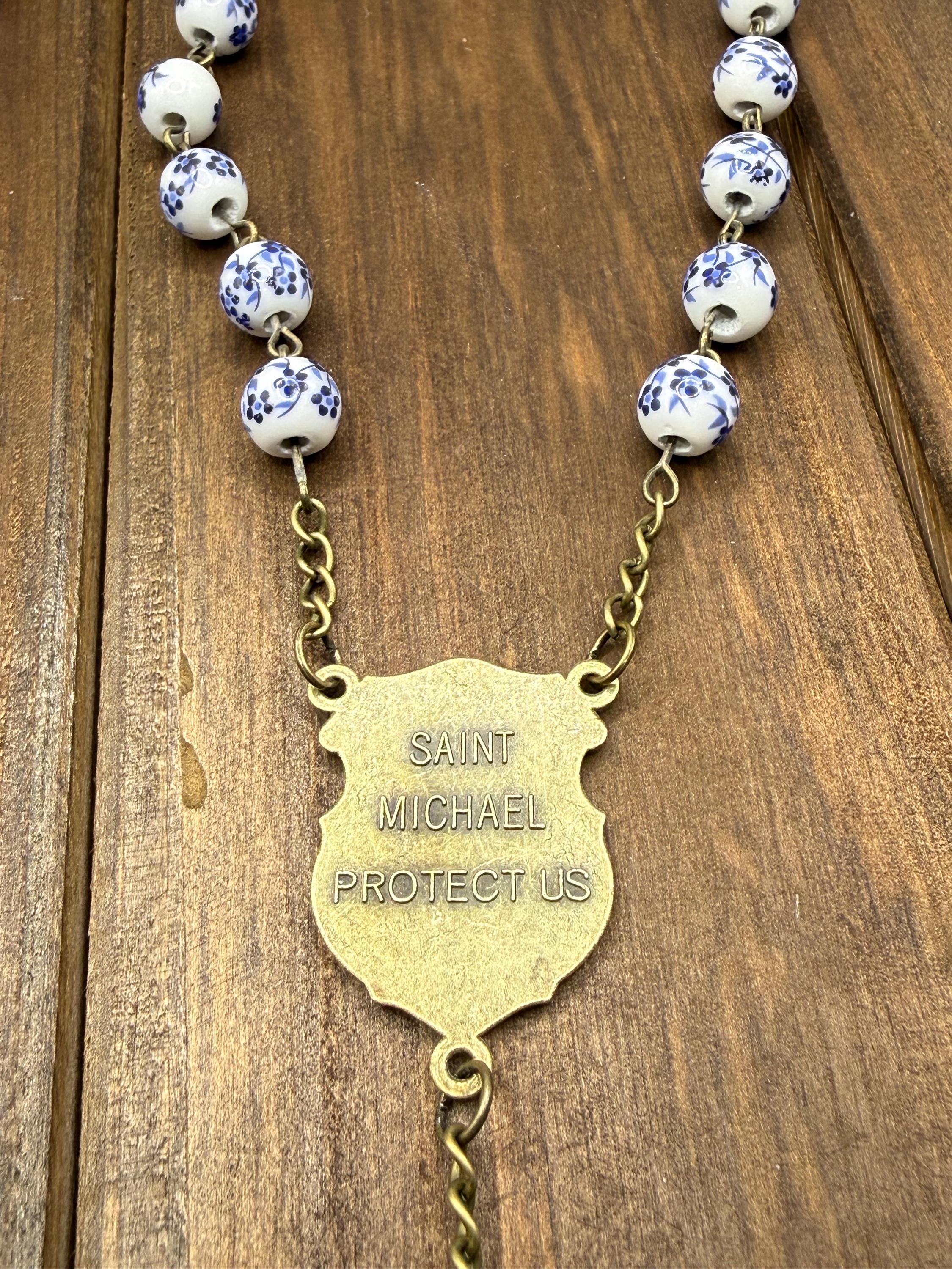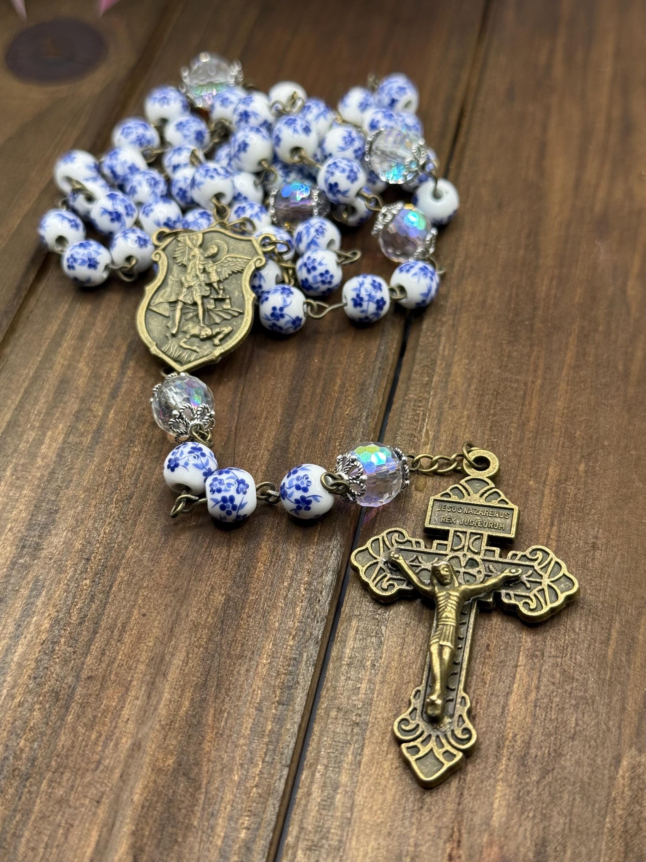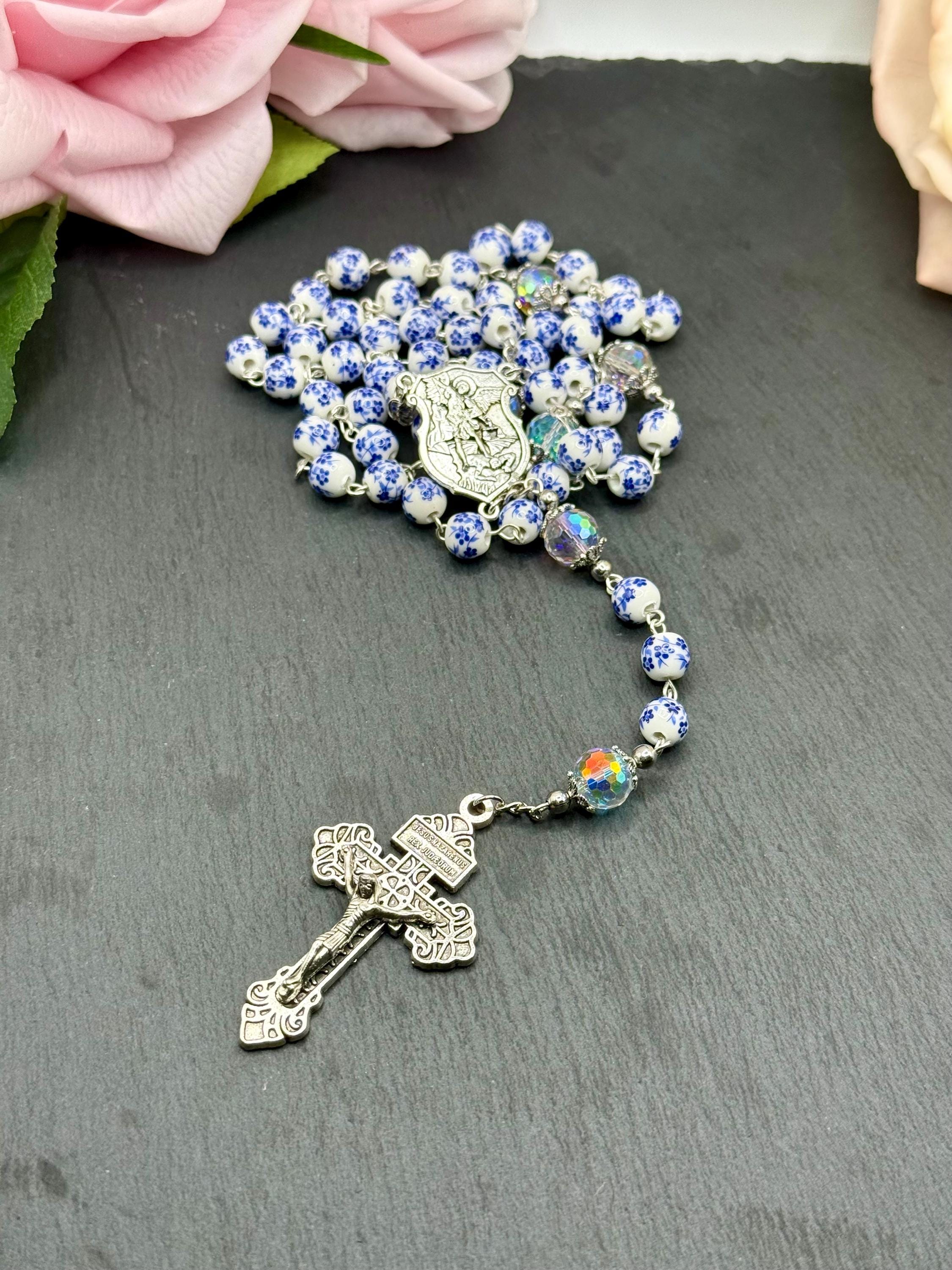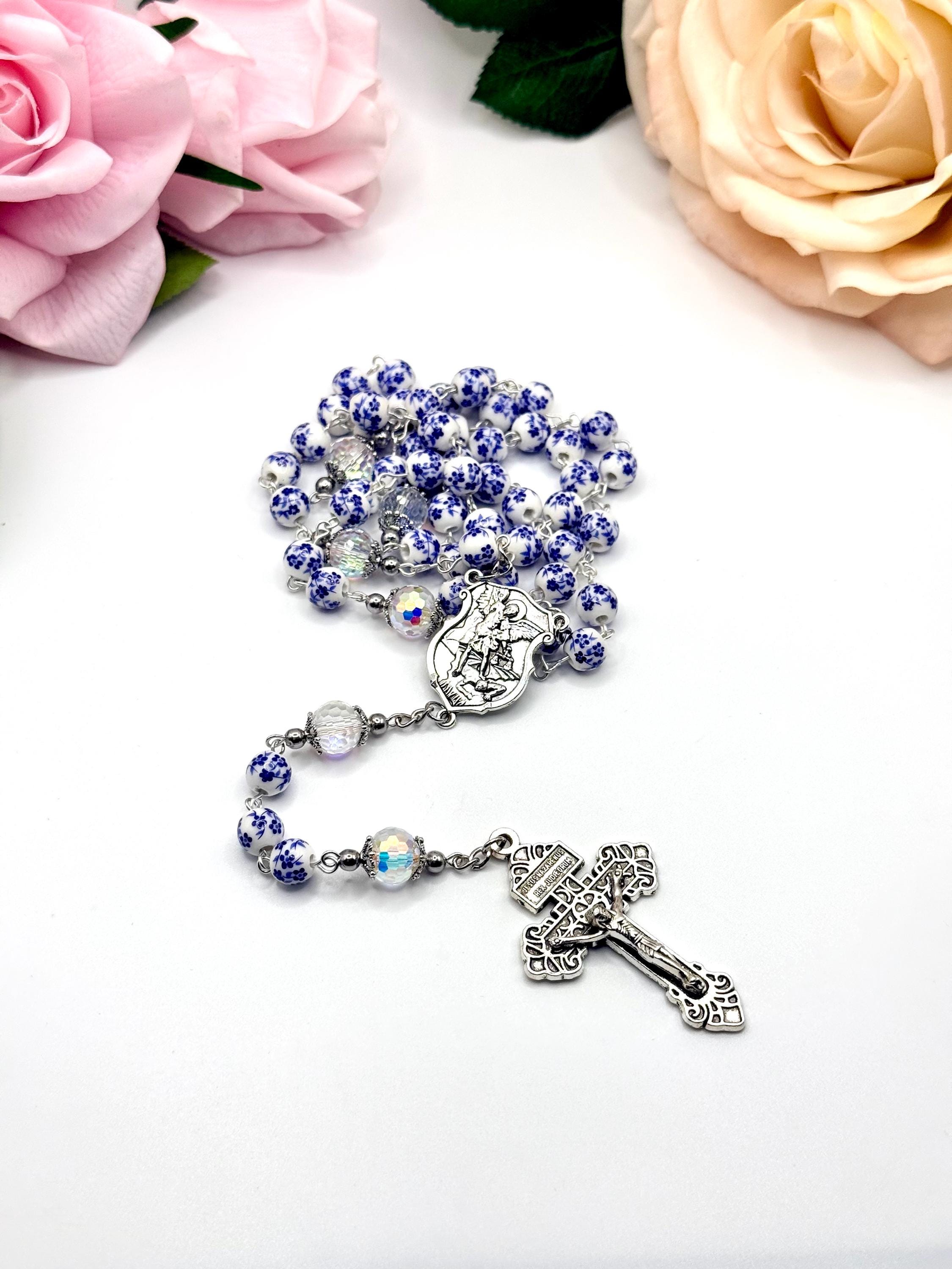 Discover a rosary that beautifully blends tradition and artistry, featuring delicate blue flower ceramic beads that inspire peaceful prayer moments. This antique rosary, accented with a Saint Michael medal, offers both spiritual significance and vintage charm for daily devotion or special occasions. Crafted with care, it makes a thoughtful Catholic gift cherished for years.
