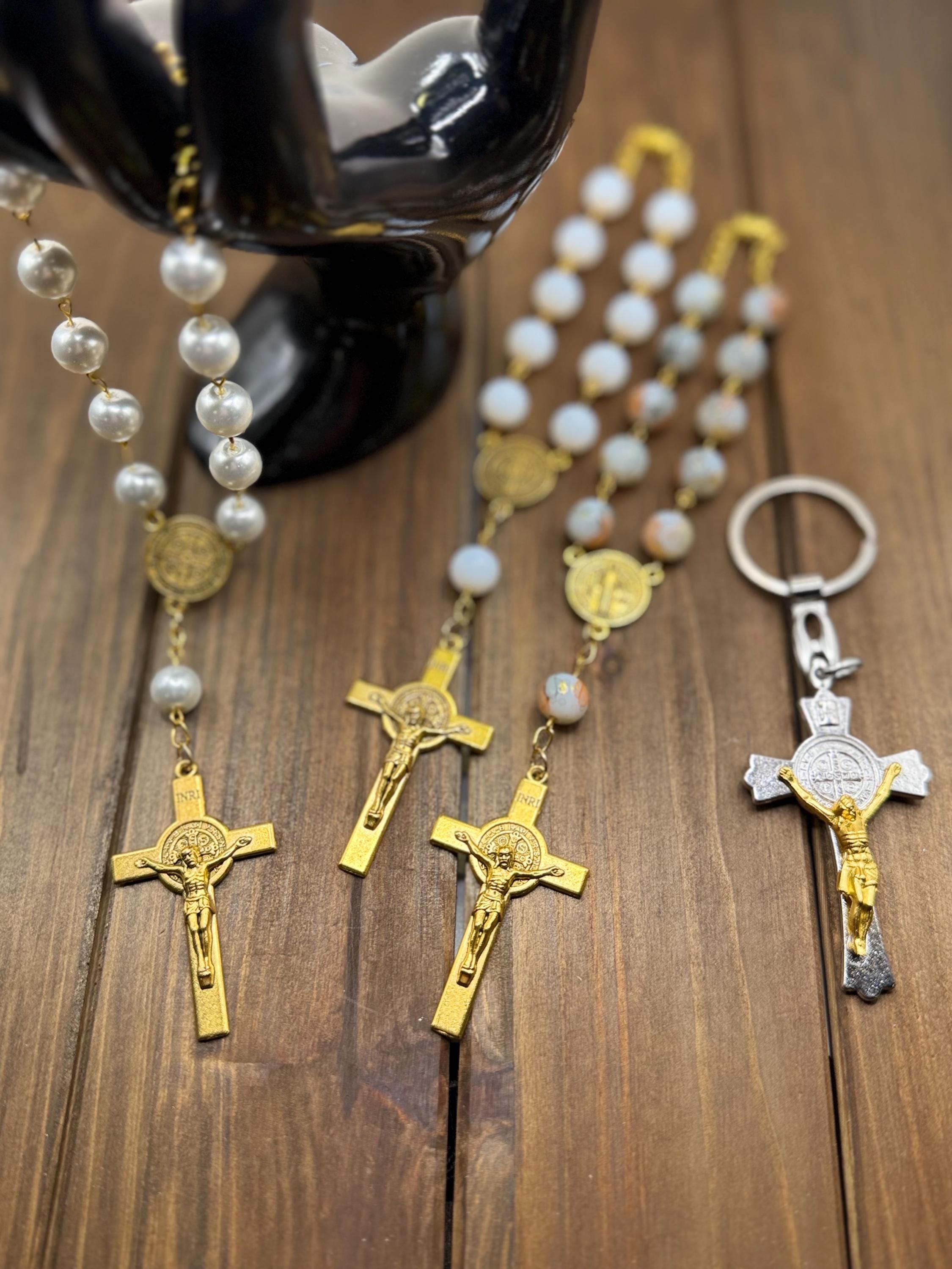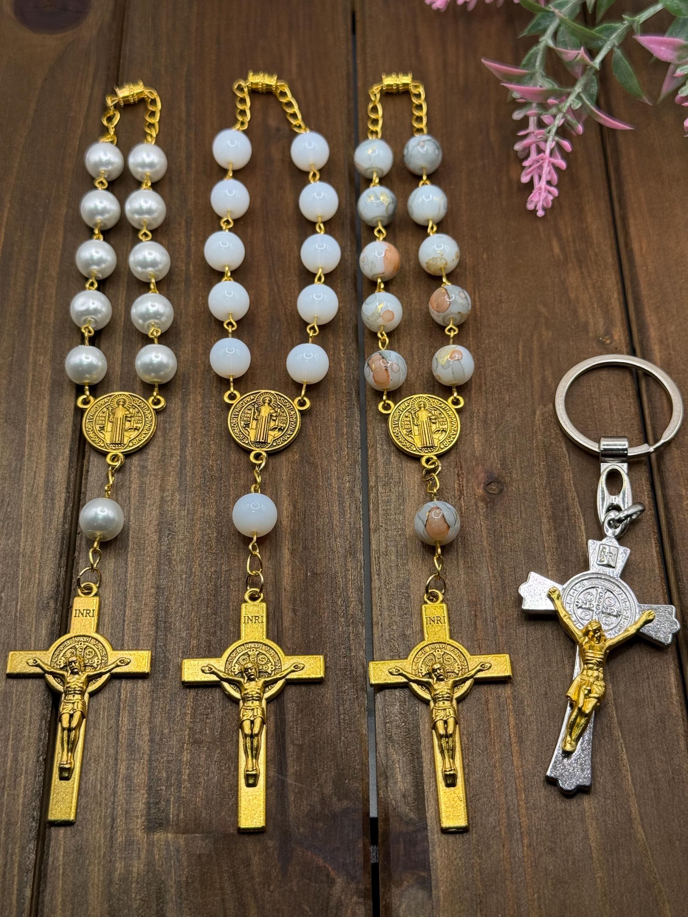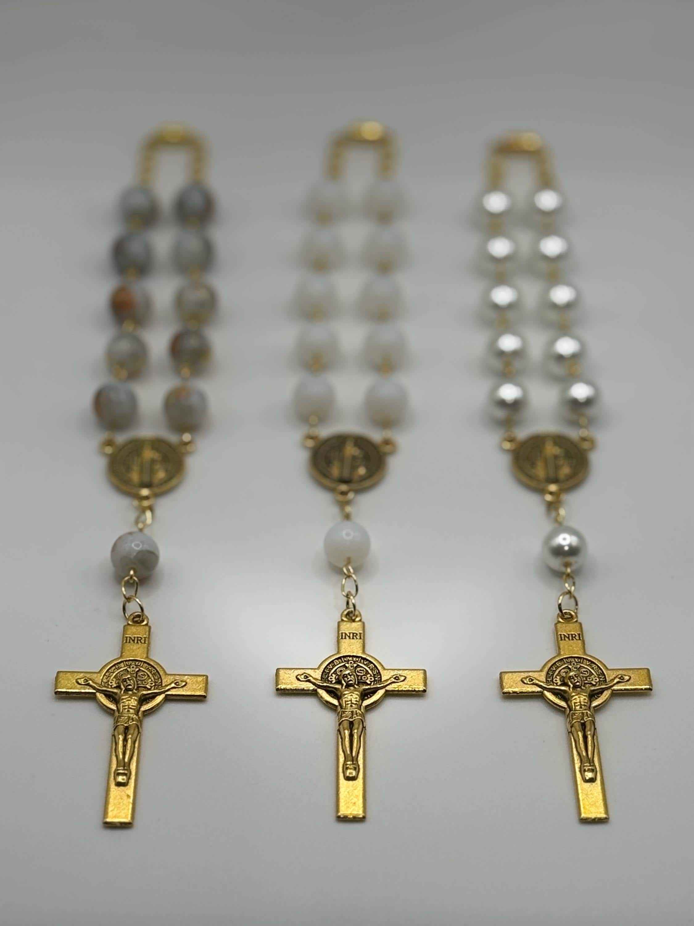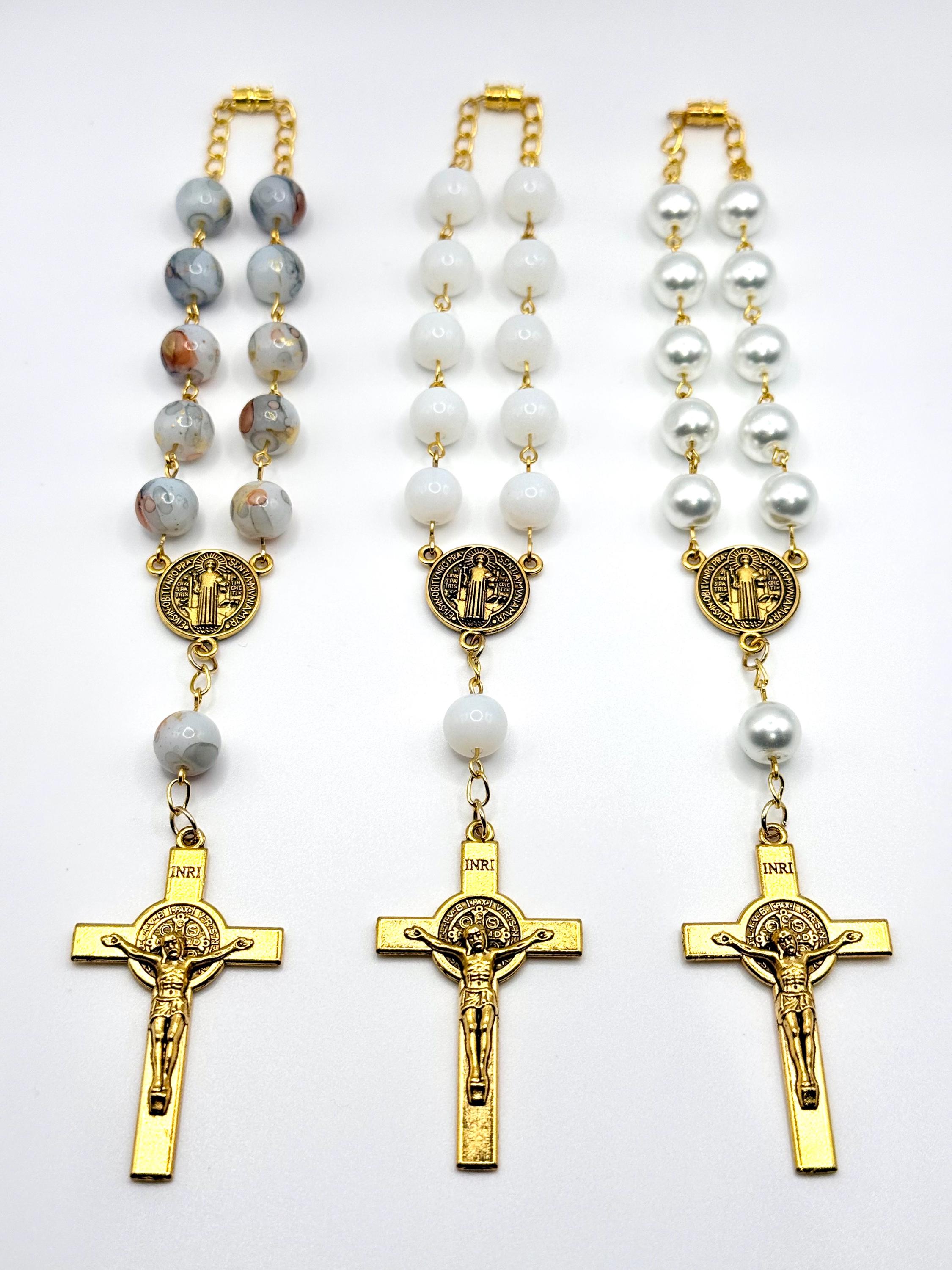 Travel with peace and grace using this handmade gold glass car rosary, thoughtfully designed to bring spiritual calm to every journey. Choose from white glass beads, pearl beads, or patterned beads to match your style, each featuring a Saint Benedict medal and a delicate crucifix car charm that inspire devotion on the road. The secure screw-on clasp ensures your prayer beads vehicle accessory stays safely displayed, making it a perfect Catholic travel gift or a meaningful rosary for driving.