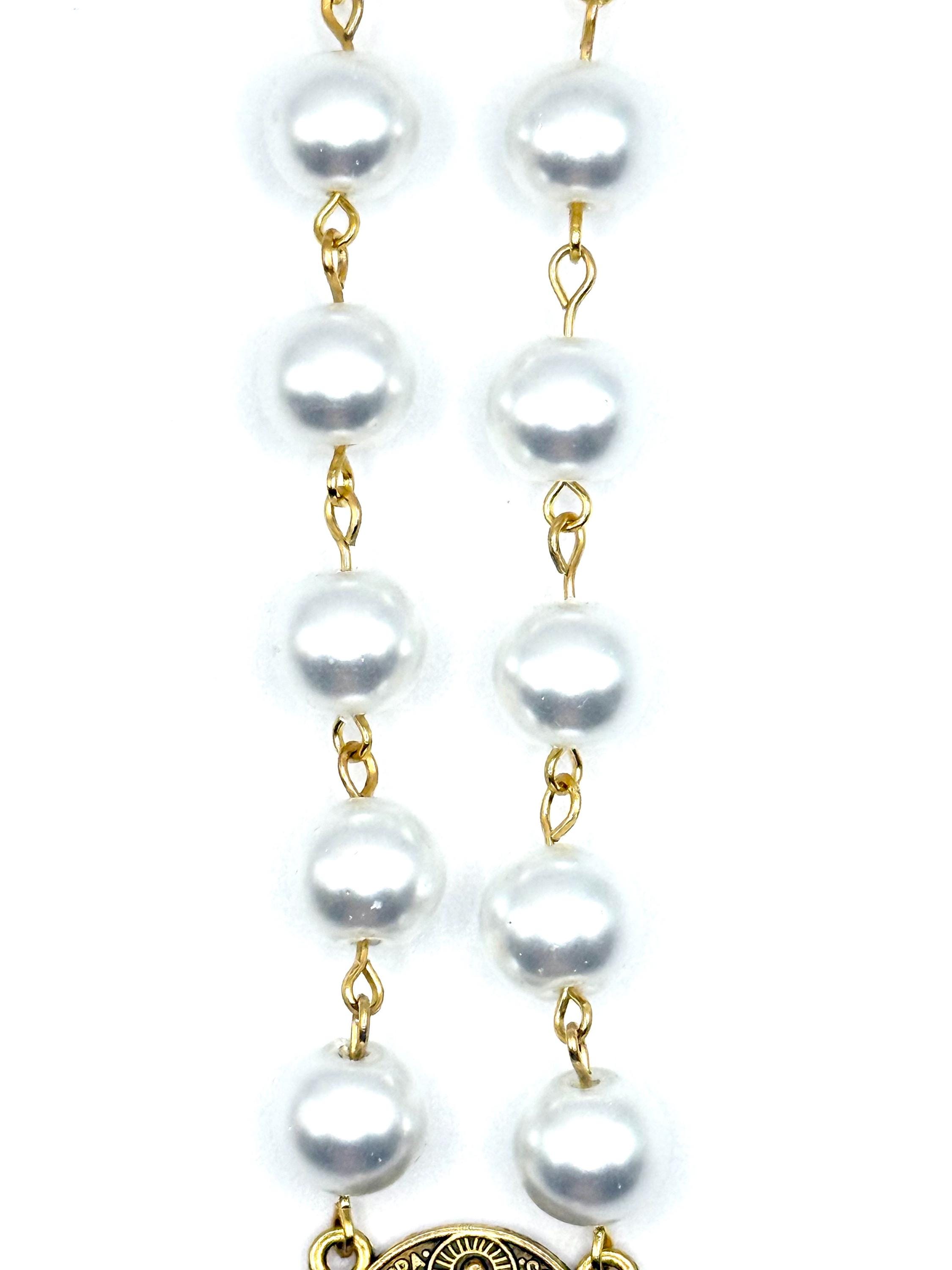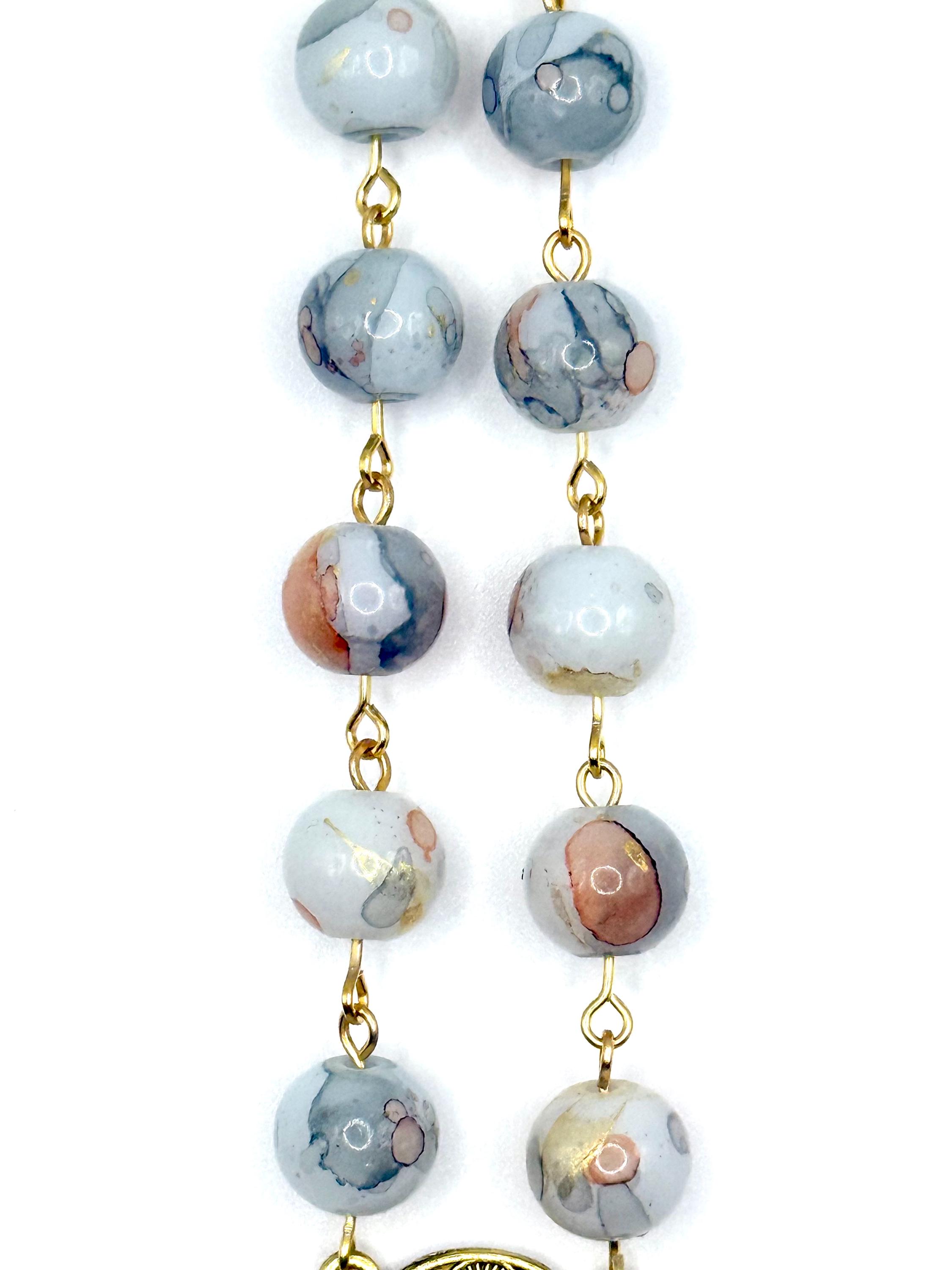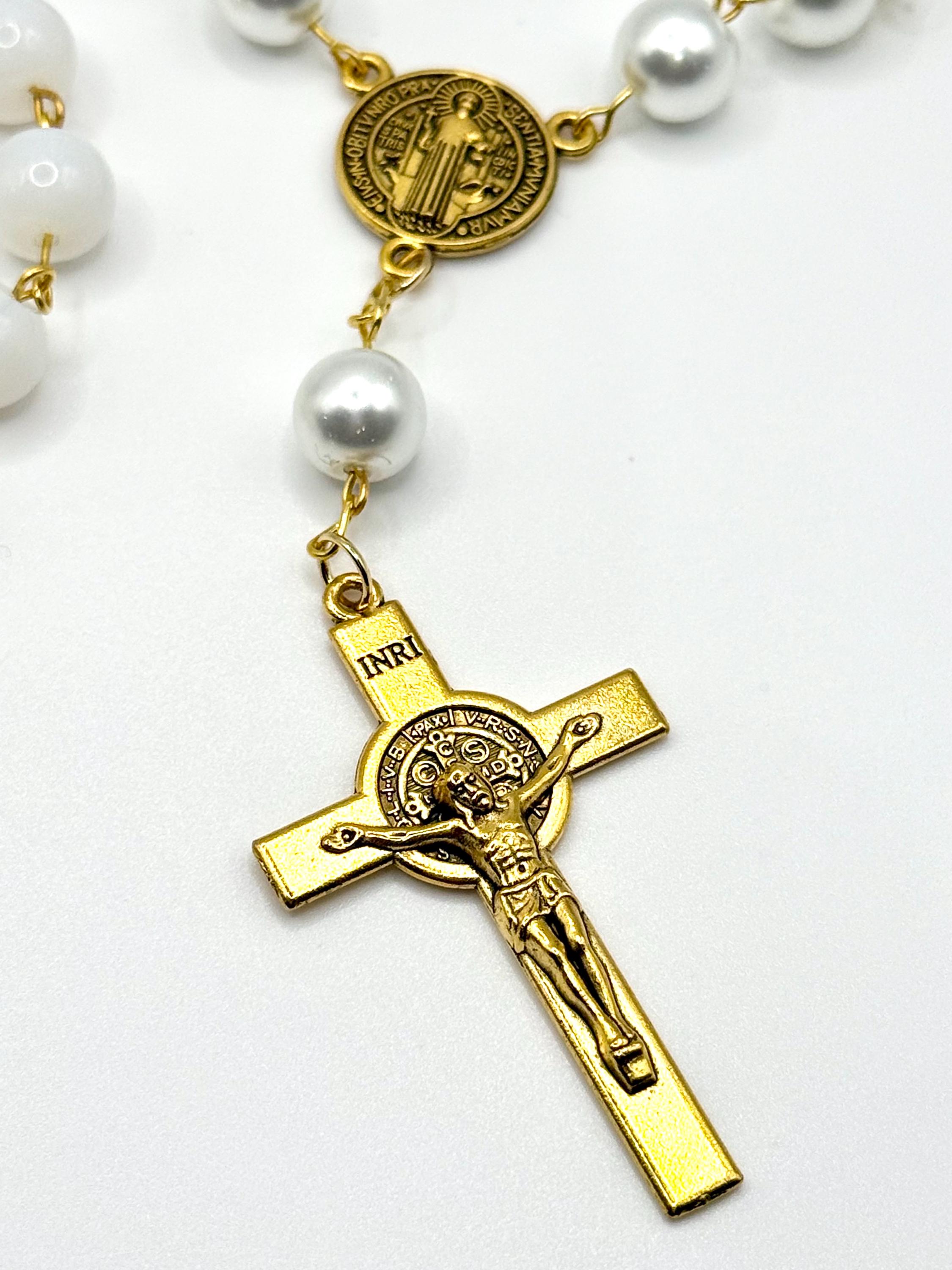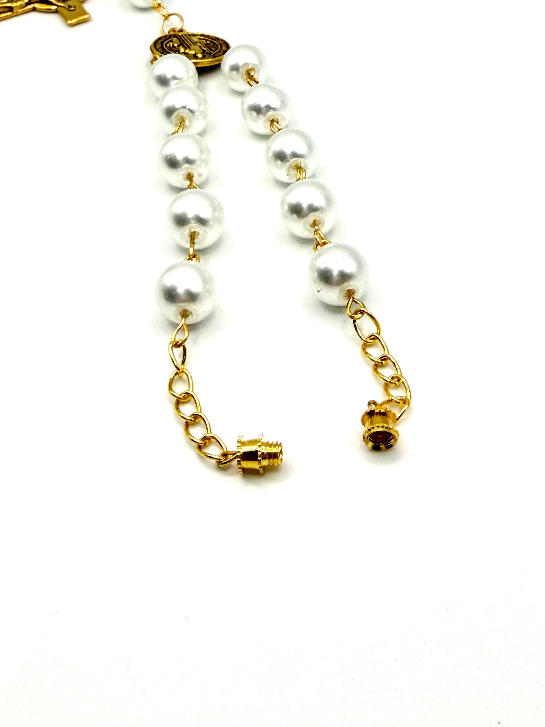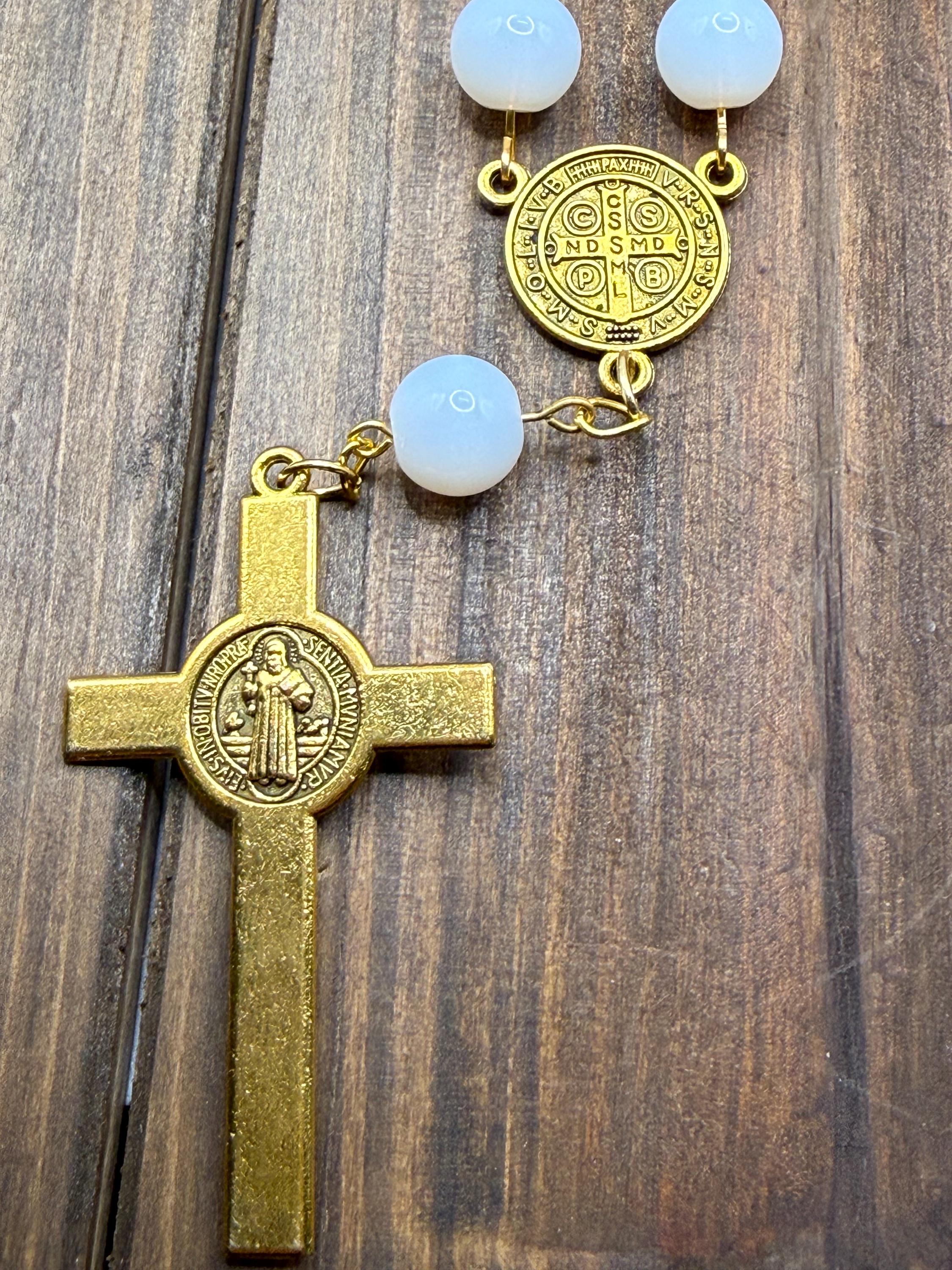 Travel with peace and grace using this handmade gold glass car rosary, thoughtfully designed to bring spiritual calm to every journey. Choose from white glass beads, pearl beads, or patterned beads to match your style, each featuring a Saint Benedict medal and a delicate crucifix car charm that inspire devotion on the road. The secure screw-on clasp ensures your prayer beads vehicle accessory stays safely displayed, making it a perfect Catholic travel gift or a meaningful rosary for driving.