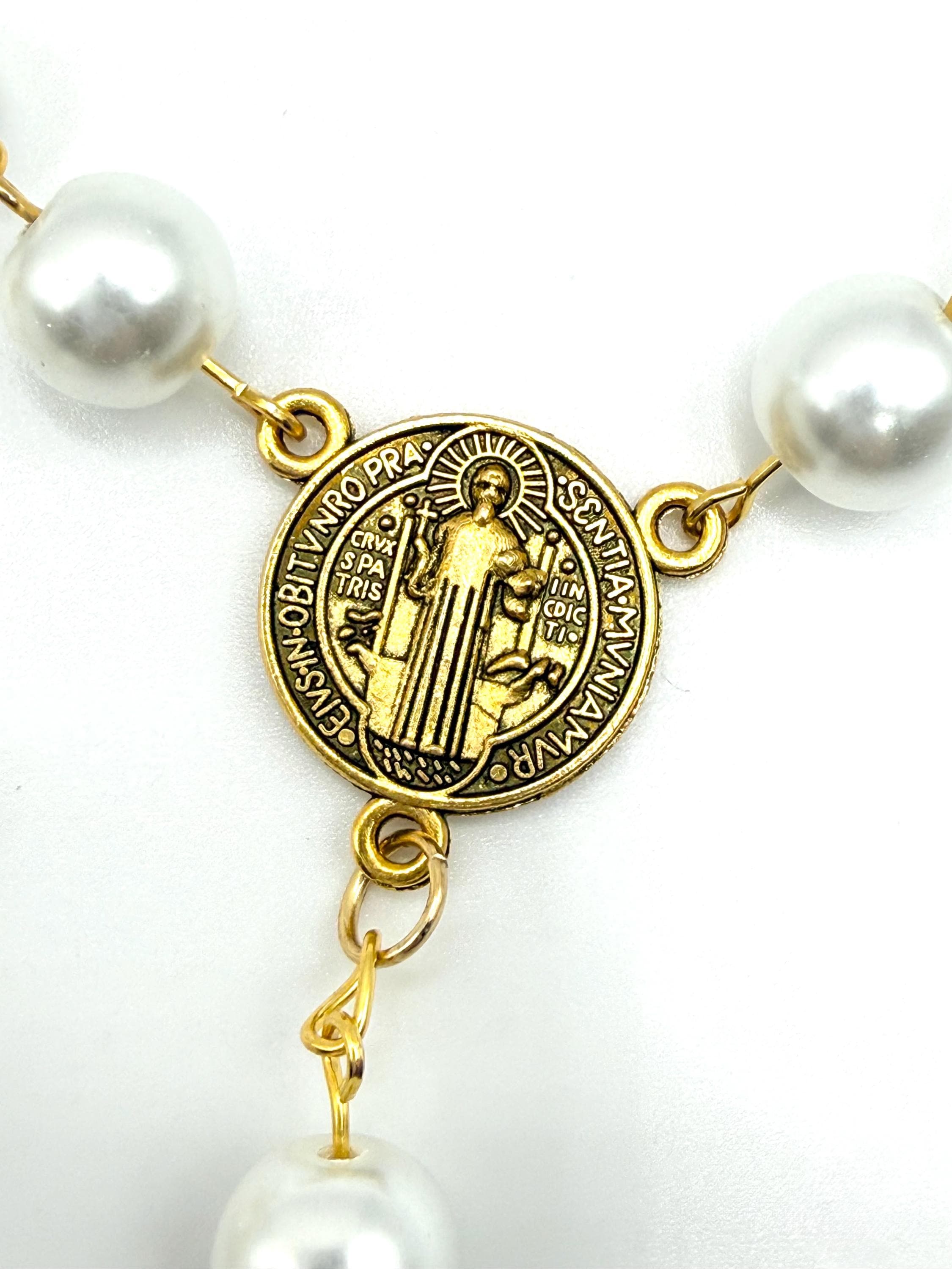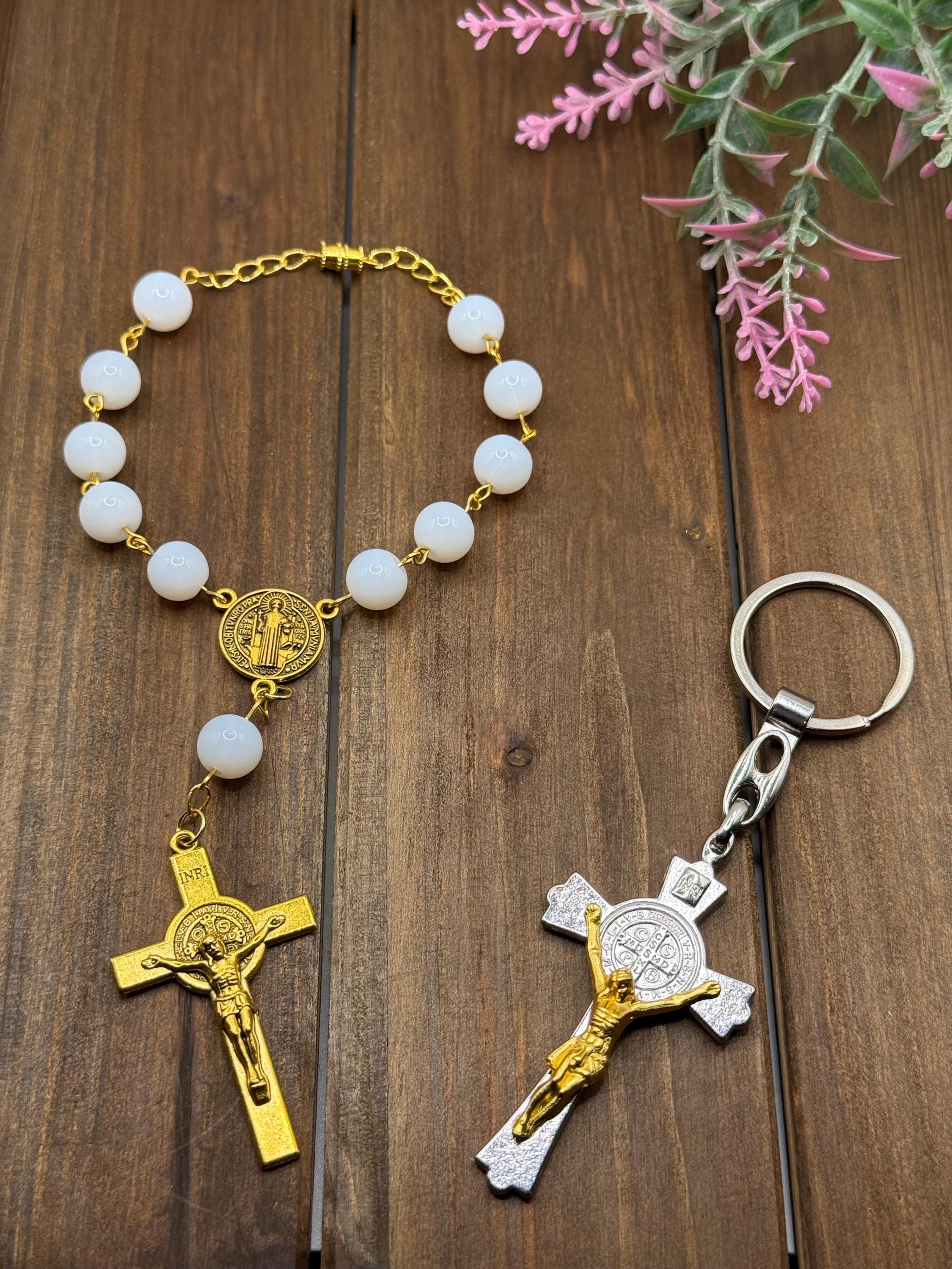 - Features Saint Benedict medal centerpiece and crucifix car charm