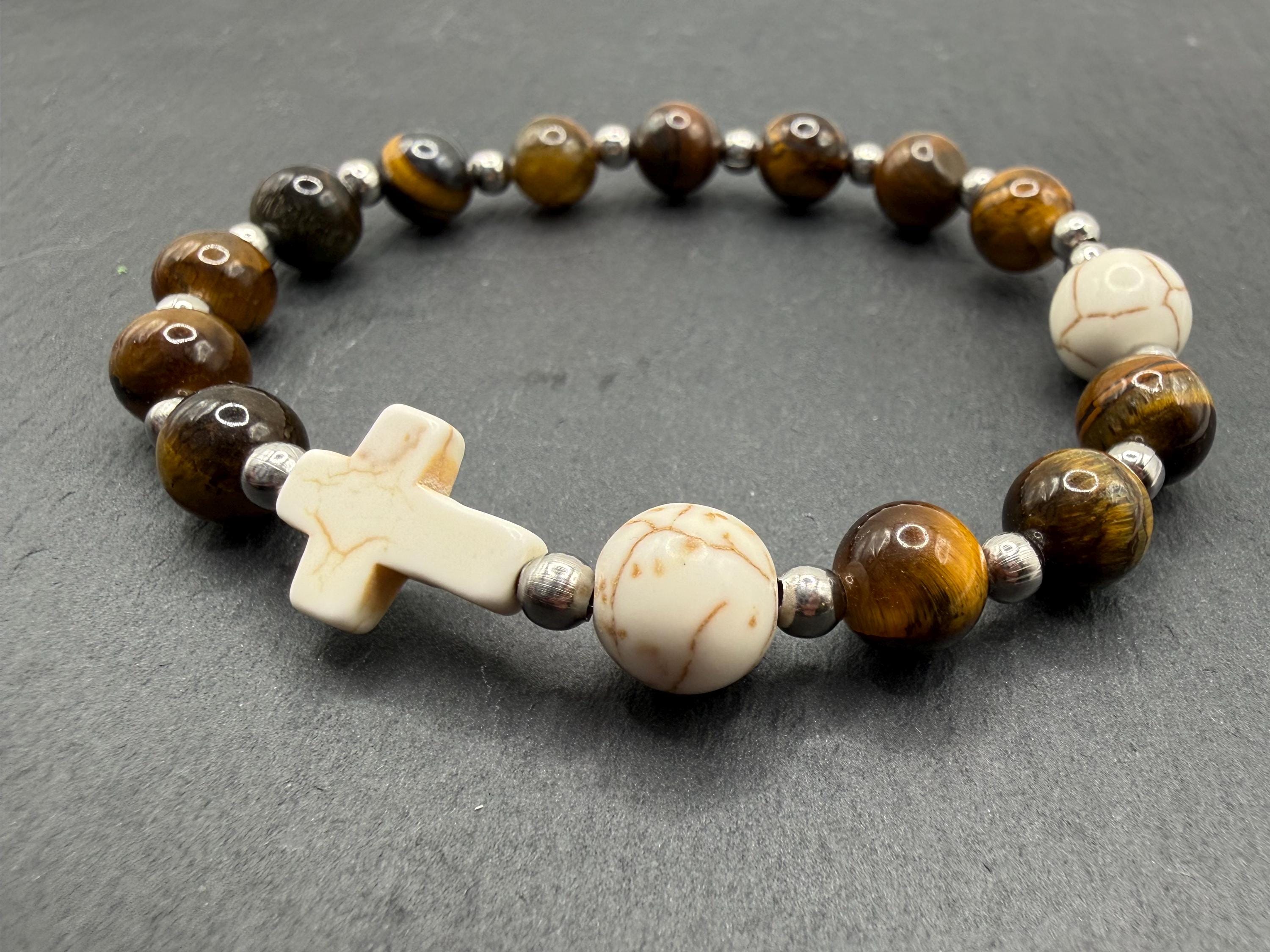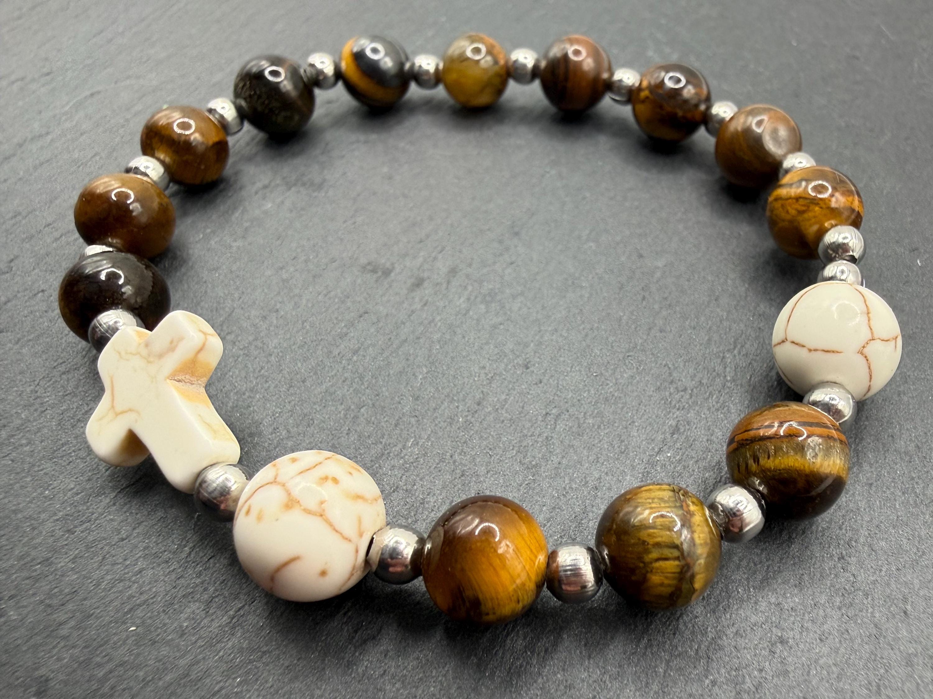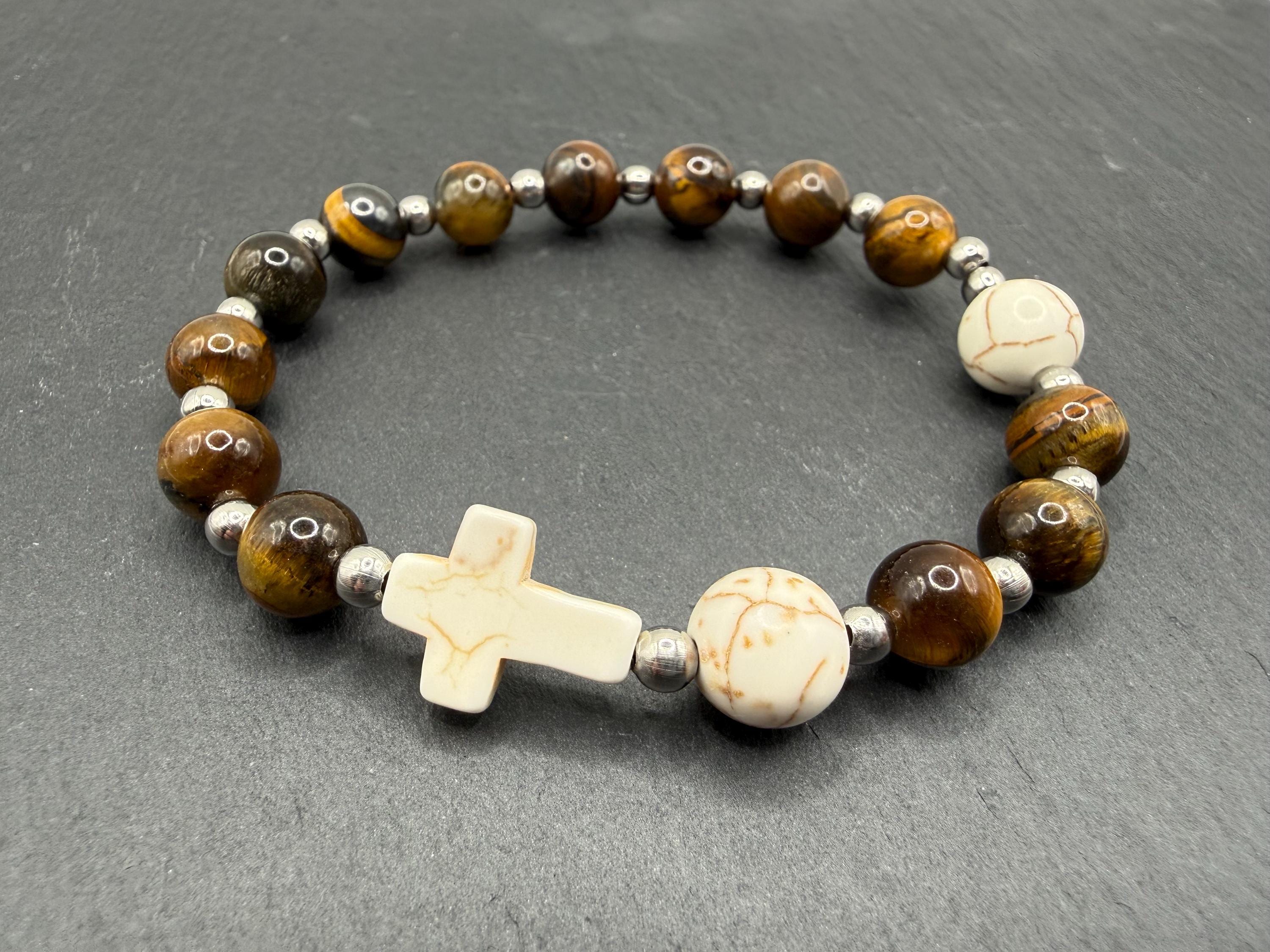Experience a meaningful blend of faith and style with this men's rosary bracelet, crafted to inspire devotion and confidence. Featuring genuine Tiger’s Eye beads paired with Howlite prayer beads, this elegant men’s rosary serves as a powerful faith reminder gift for any occasion. Each piece is designed to support your spiritual journey while adding a touch of refined masculinity.