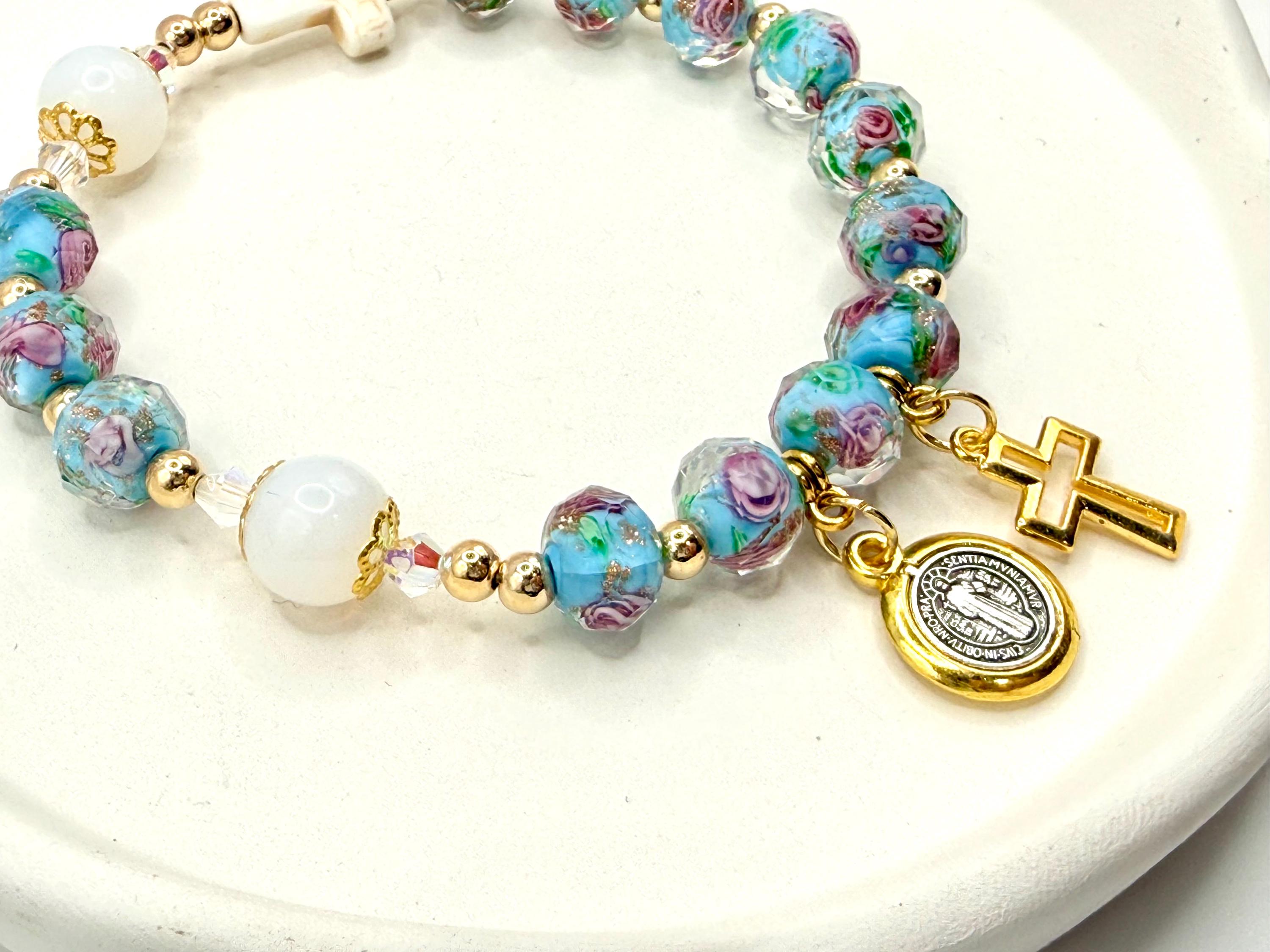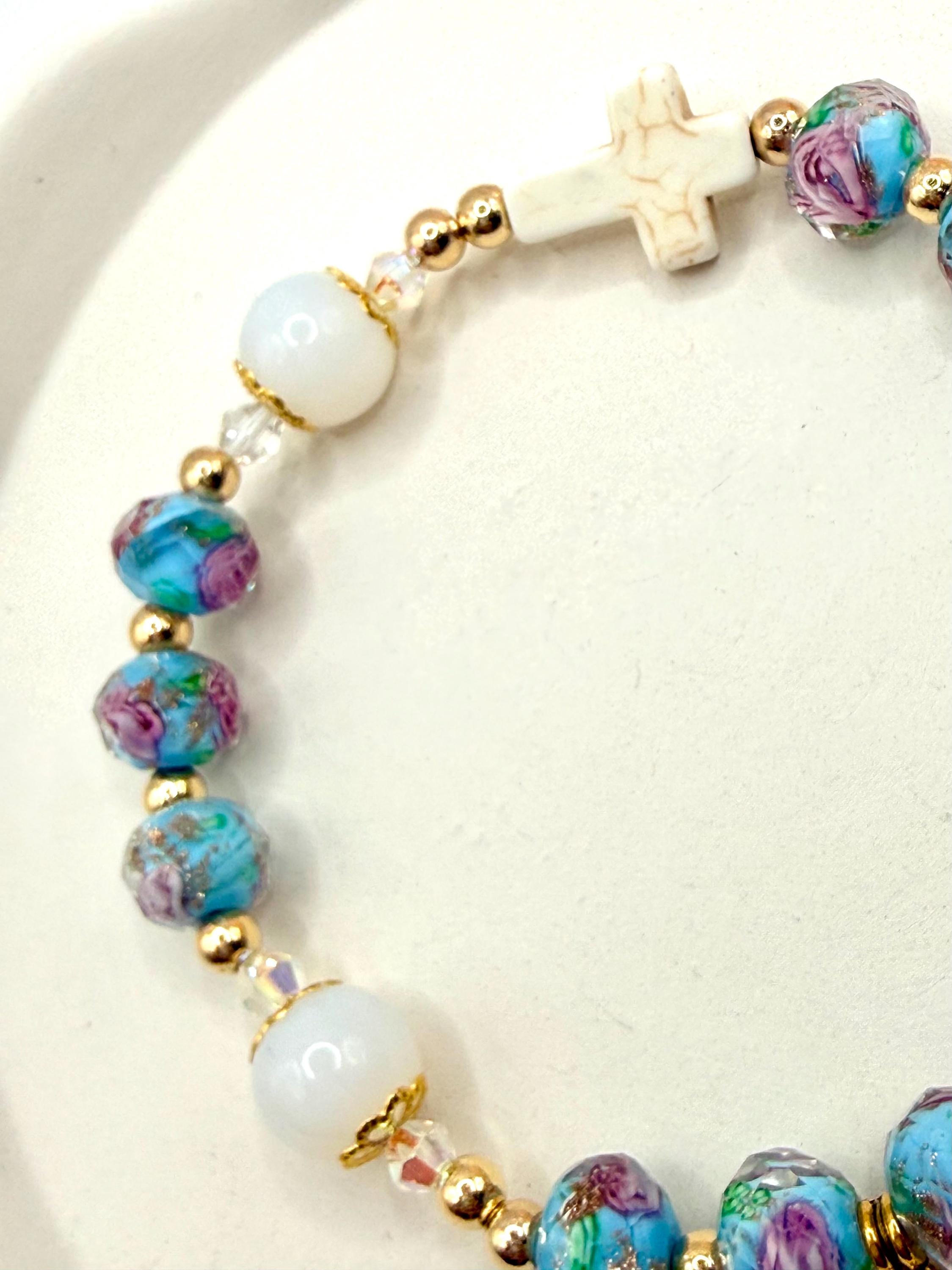 Experience the timeless elegance of this rosary bracelet, where Murano glass rosary beads and gold cross charms come together in perfect harmony. Each handmade piece features luminous lampwork beads that shimmer with every movement, paired beautifully with delicate gold accents to inspire daily devotion. Whether chosen as a First Communion gift or a cherished keepsake, this bracelet embodies faith and artistry in every detail.