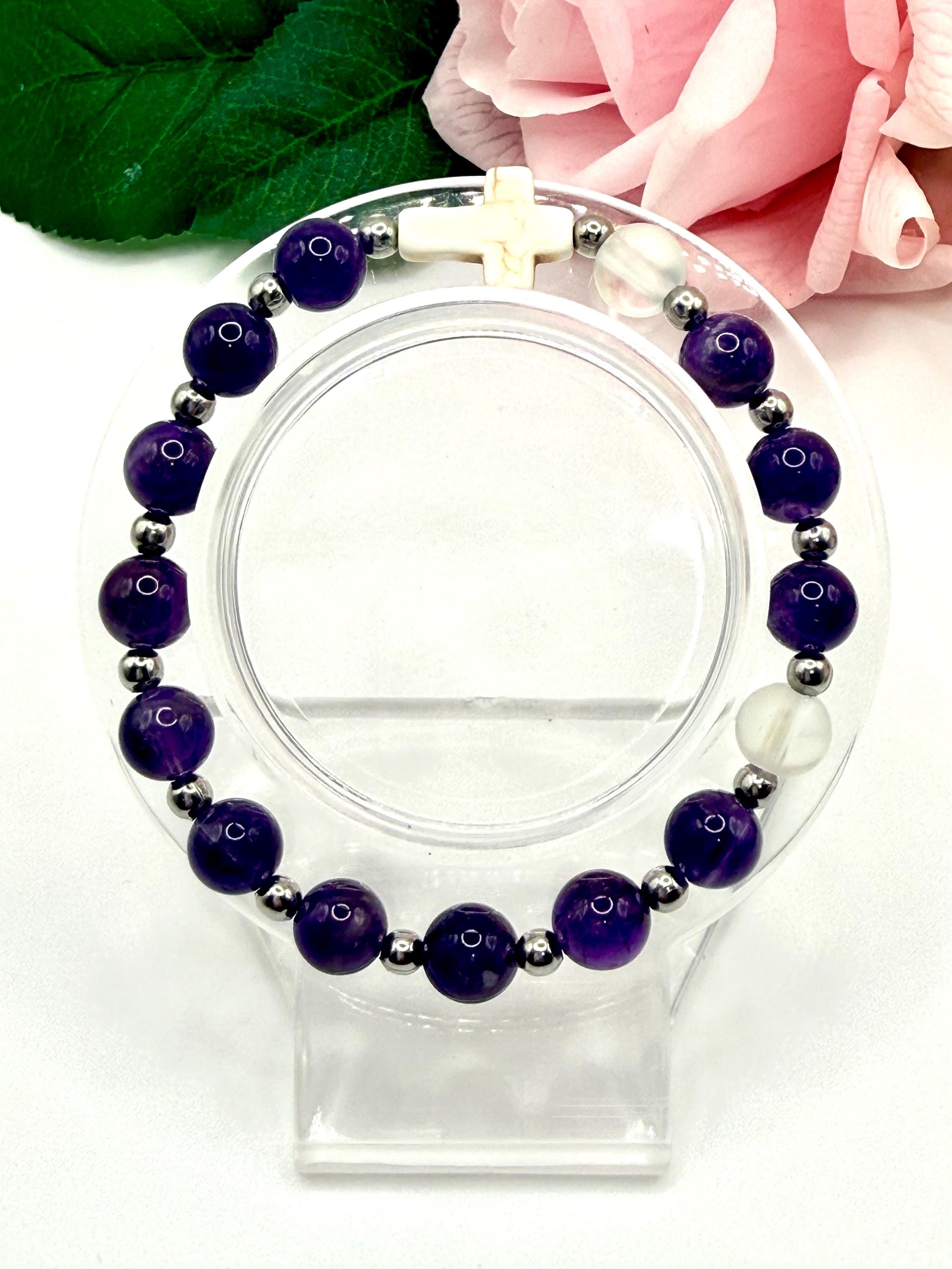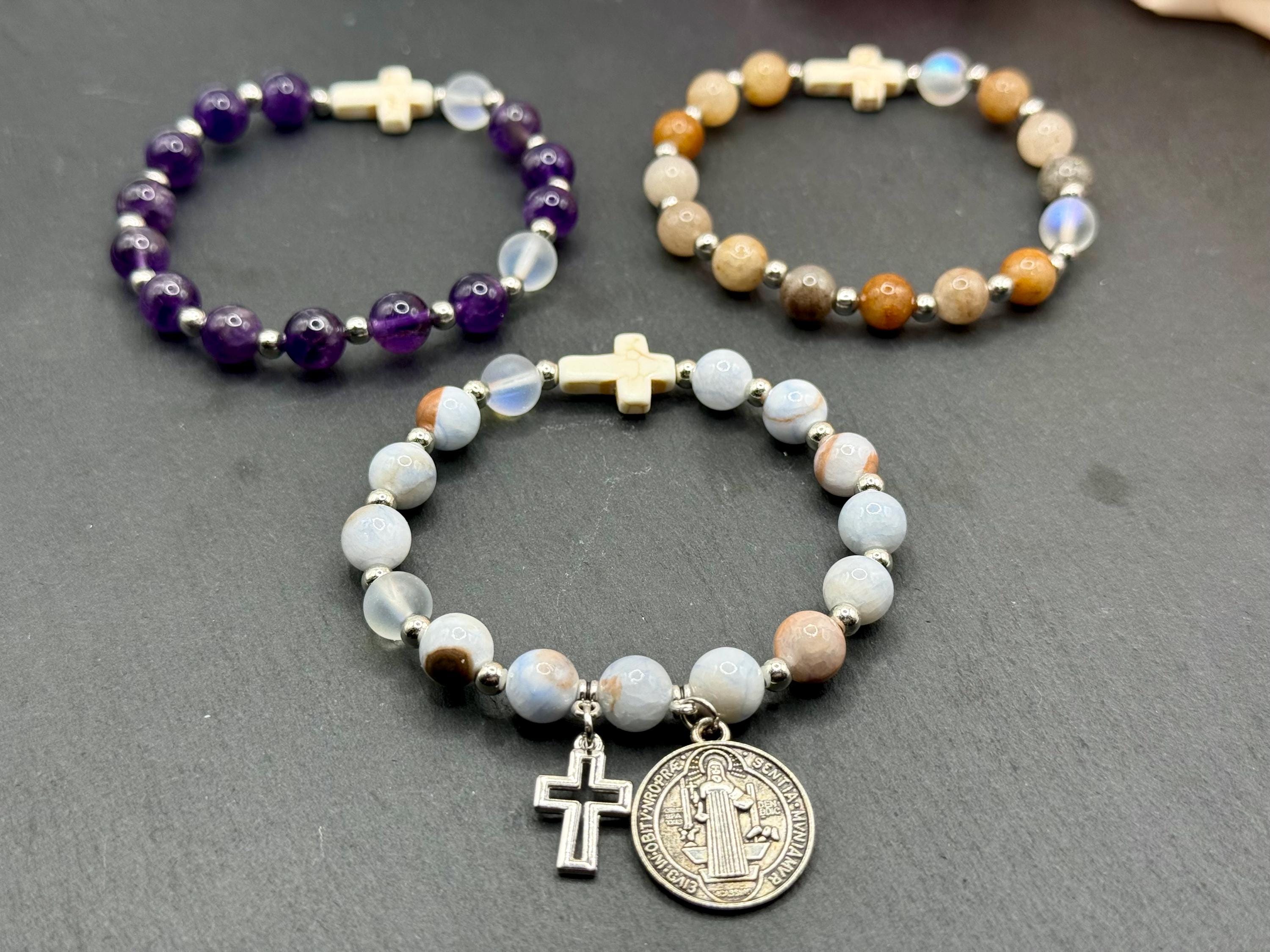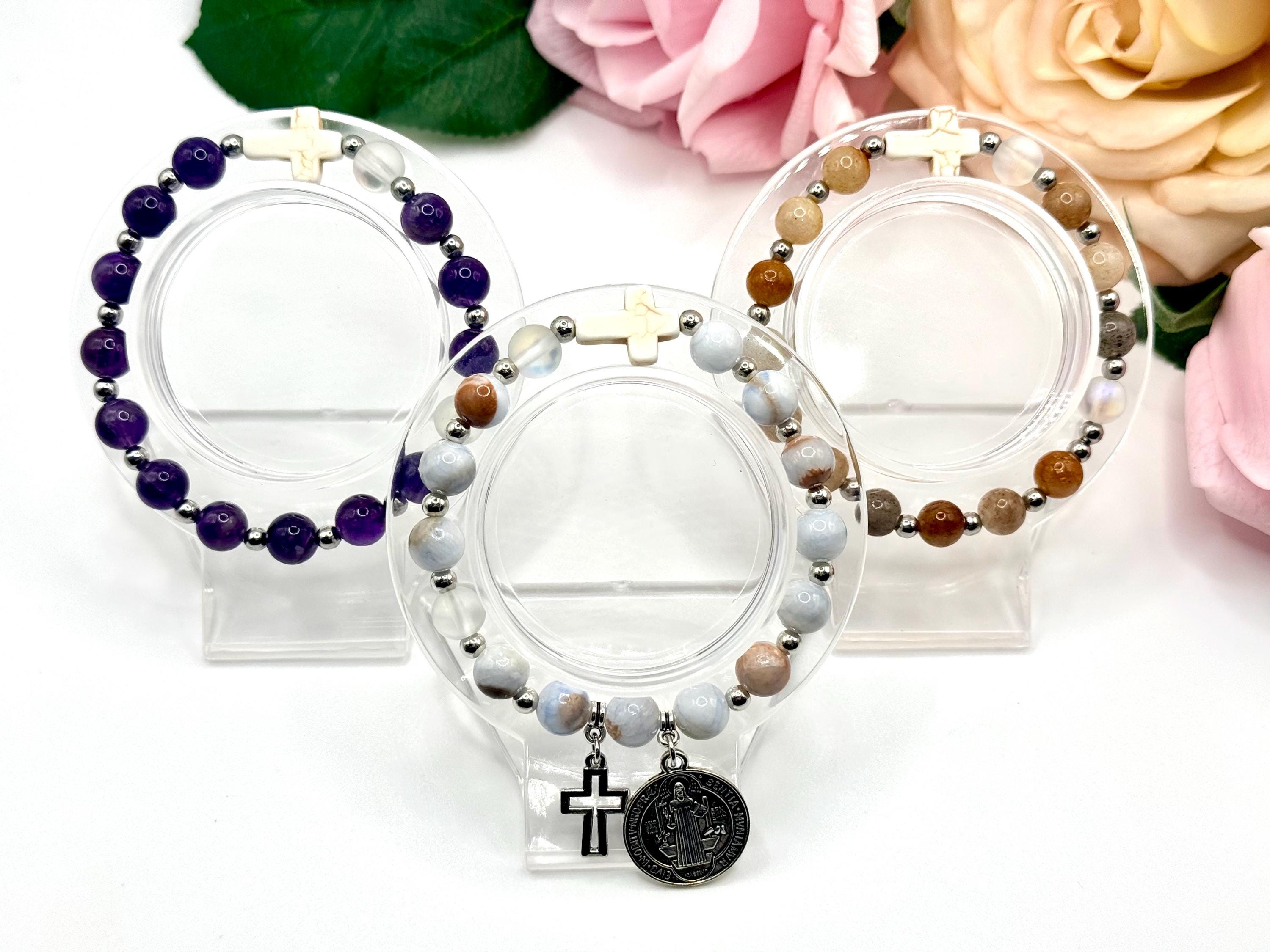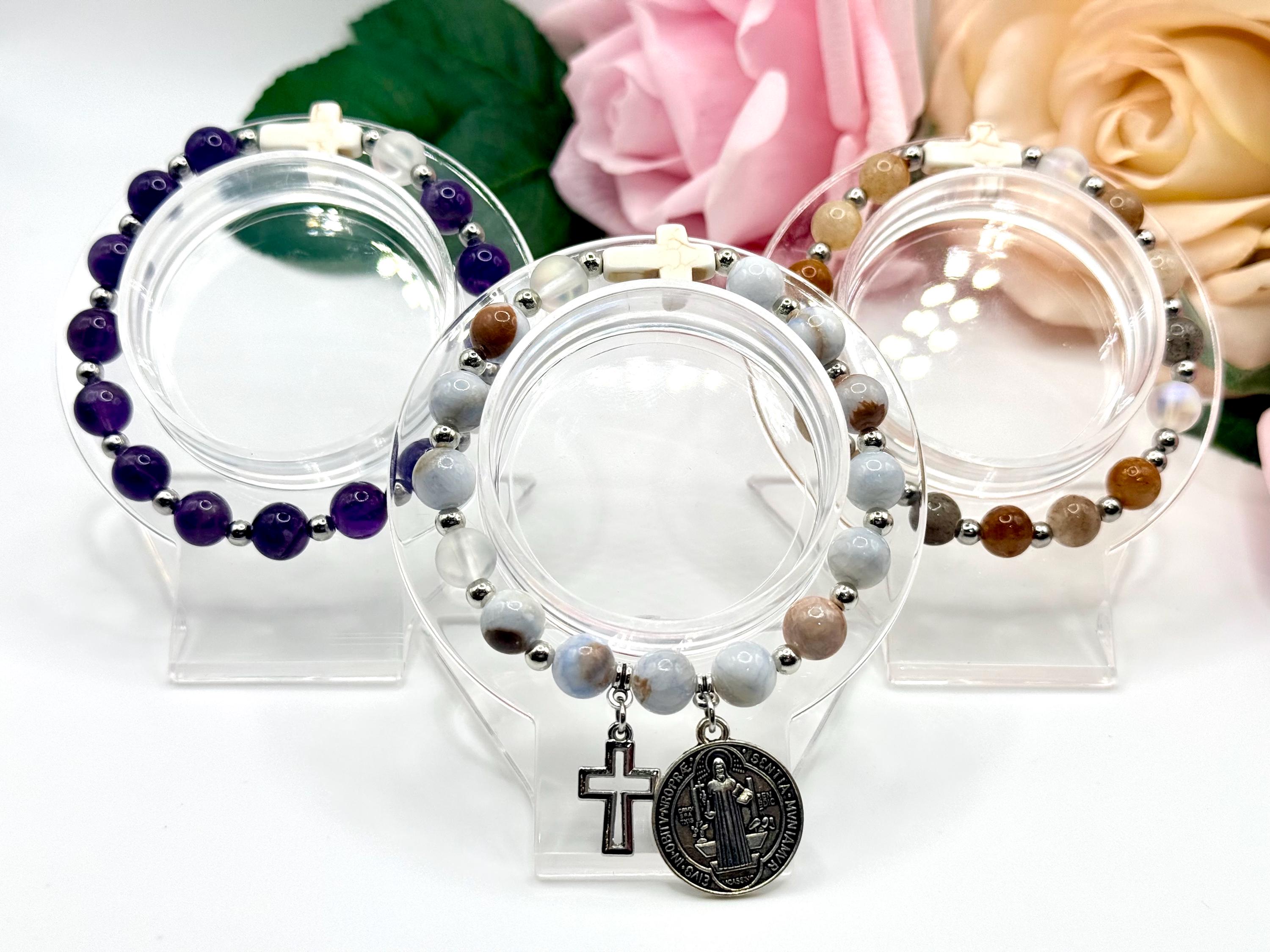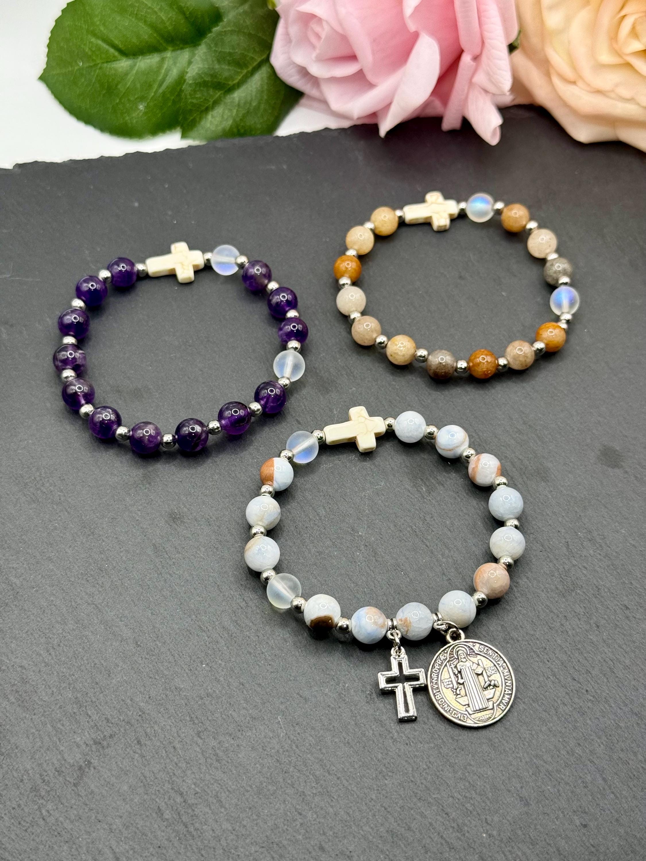 Discover the perfect blend of faith and style with our gemstone rosary bracelet, designed to inspire daily devotion and spiritual reflection. Featuring the calming amethyst purple hues, soothing azure ocean tones, and a distinctive seashell cross charm, each bracelet carries a meaningful story of protection and pilgrimage. Handmade with care, this prayer beads jewelry offers a unique way to keep your faith close, whether for yourself or as a thoughtful gift for a faith lover.
