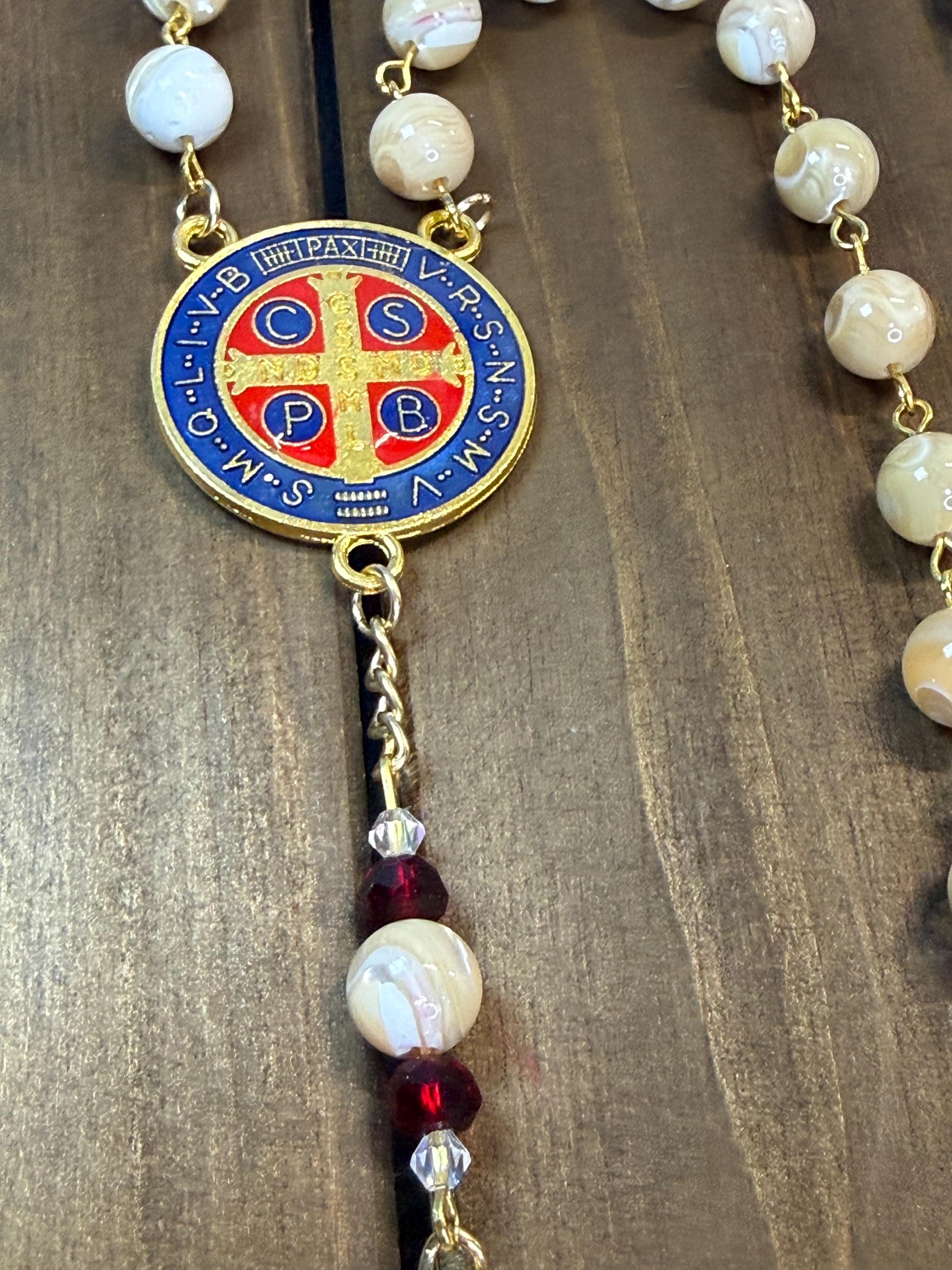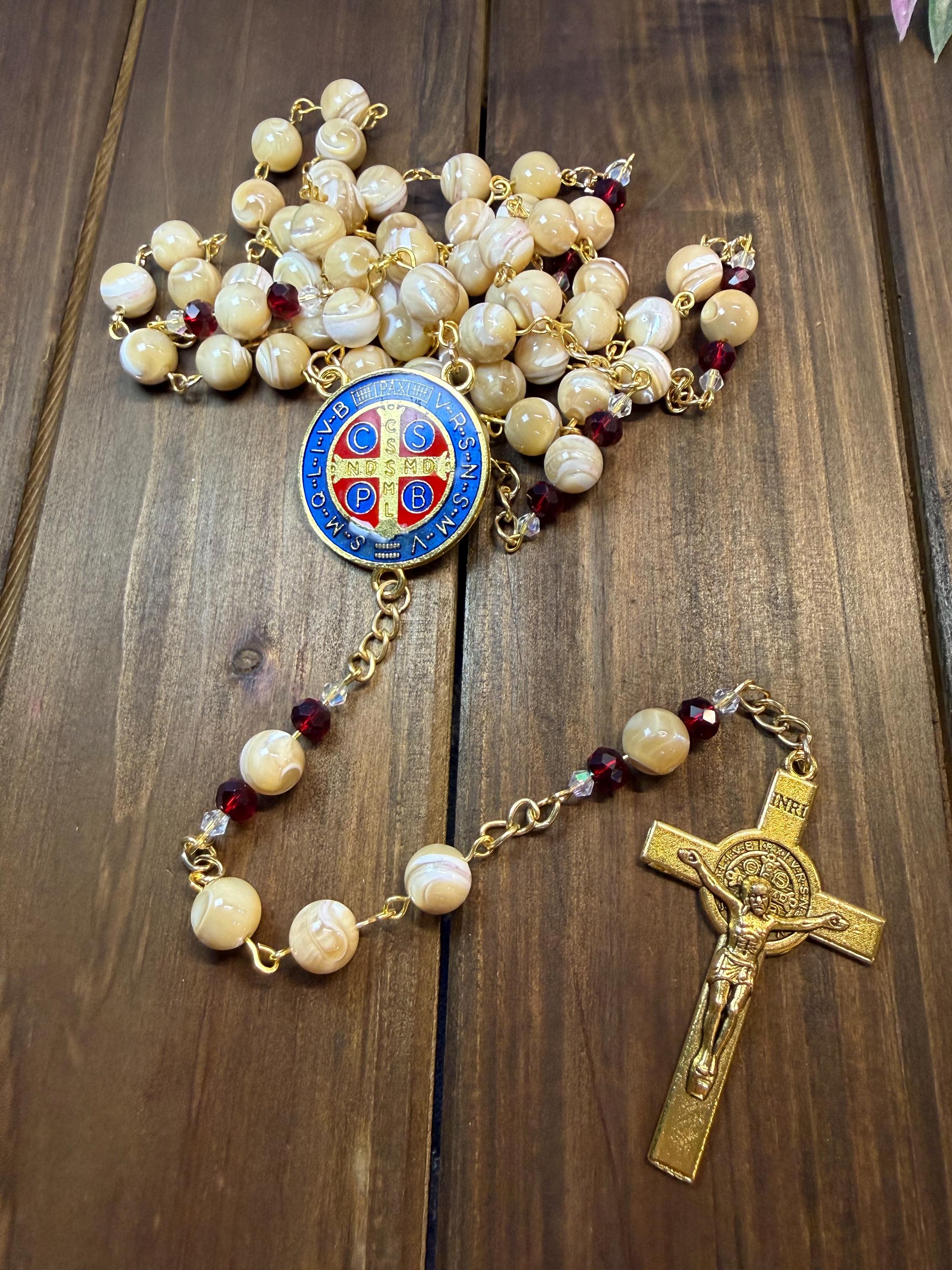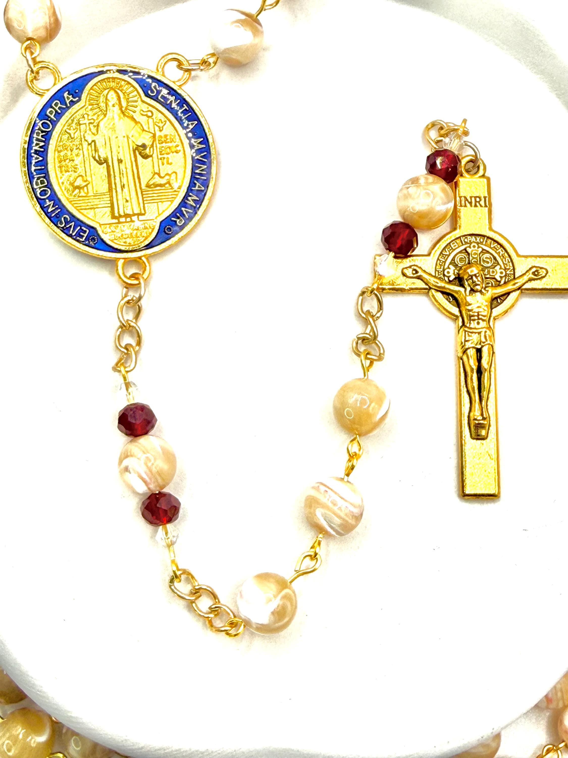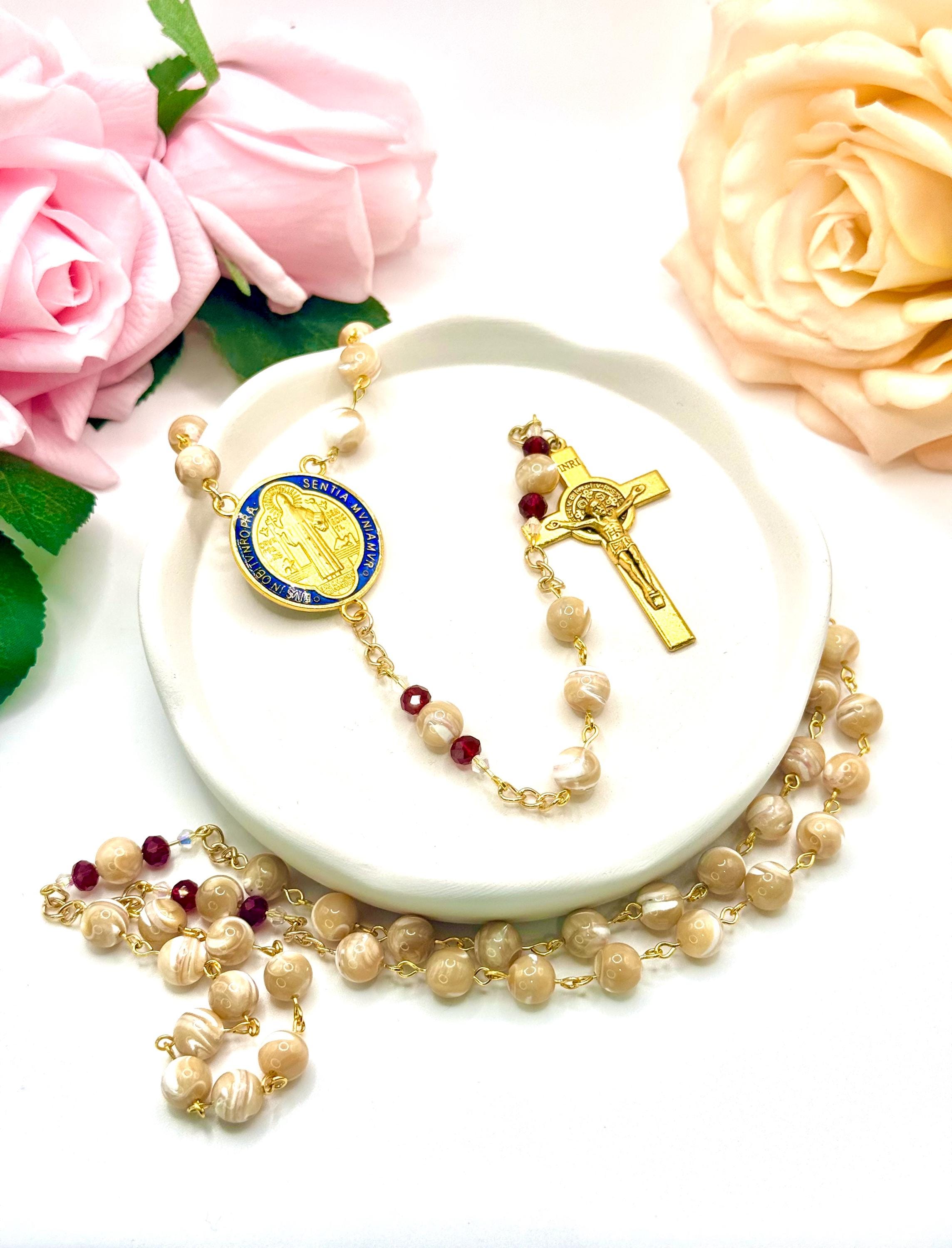 Discover a rosary crafted with care, where luminous pearl beads meet the sacred tradition of prayer. This Mother of Pearl rosary features radiant, natural beads that shimmer softly, paired with an 18k gold plated Saint Benedict centerpiece and a matching gold tone crucifix, embodying both beauty and spiritual protection. Perfect for daily devotion or as a thoughtful religious gift, it invites peace and grace into every moment.