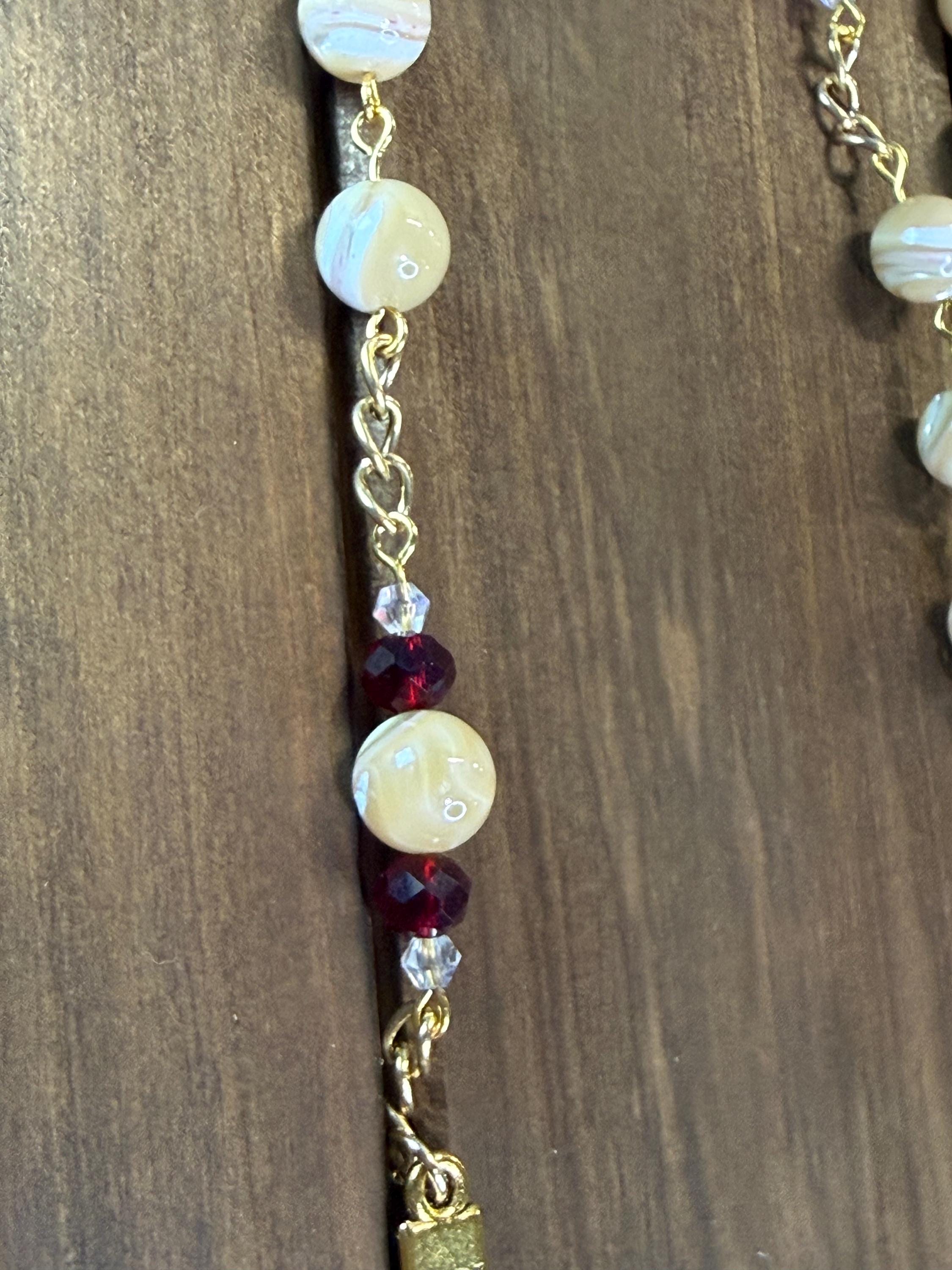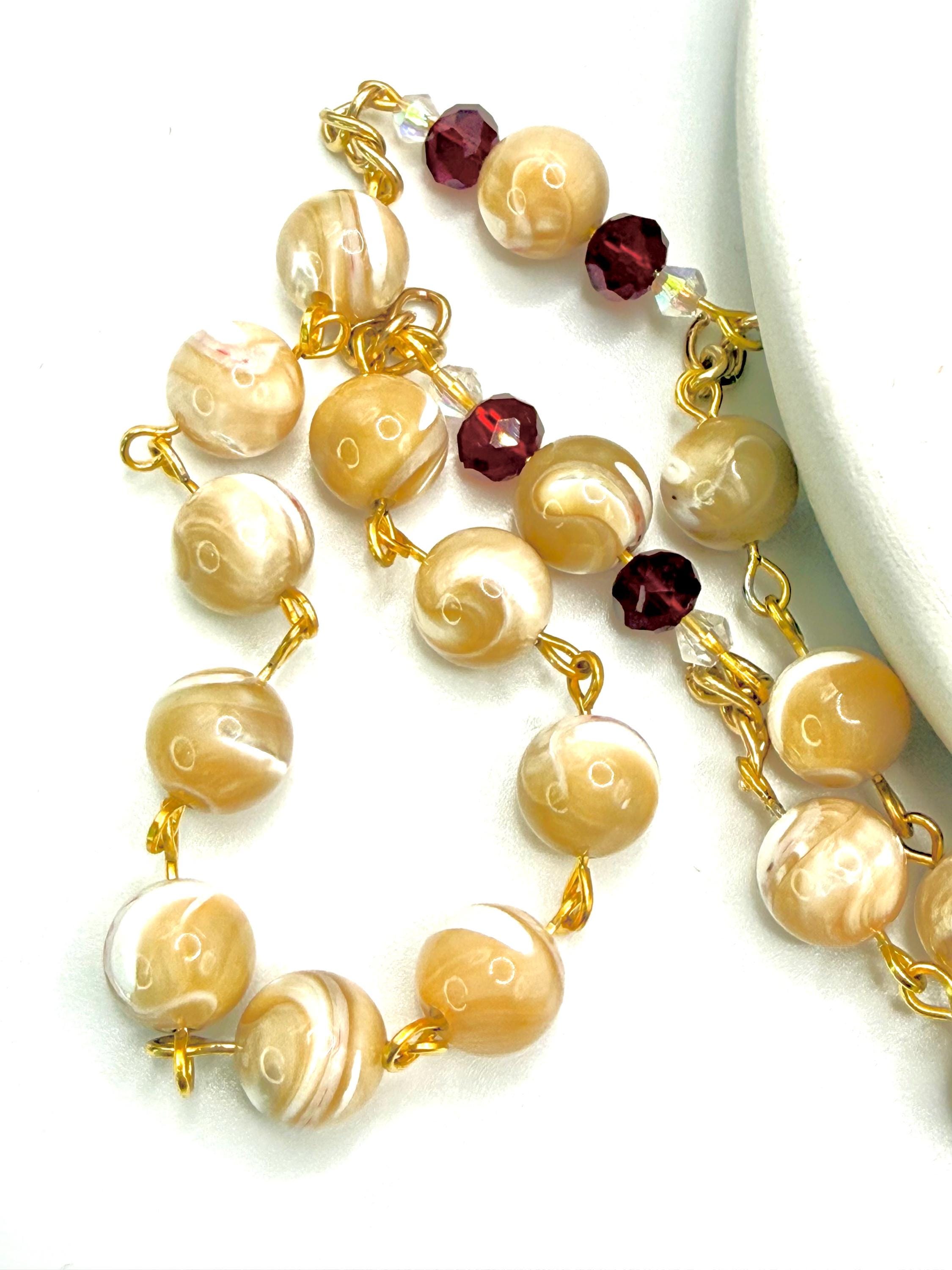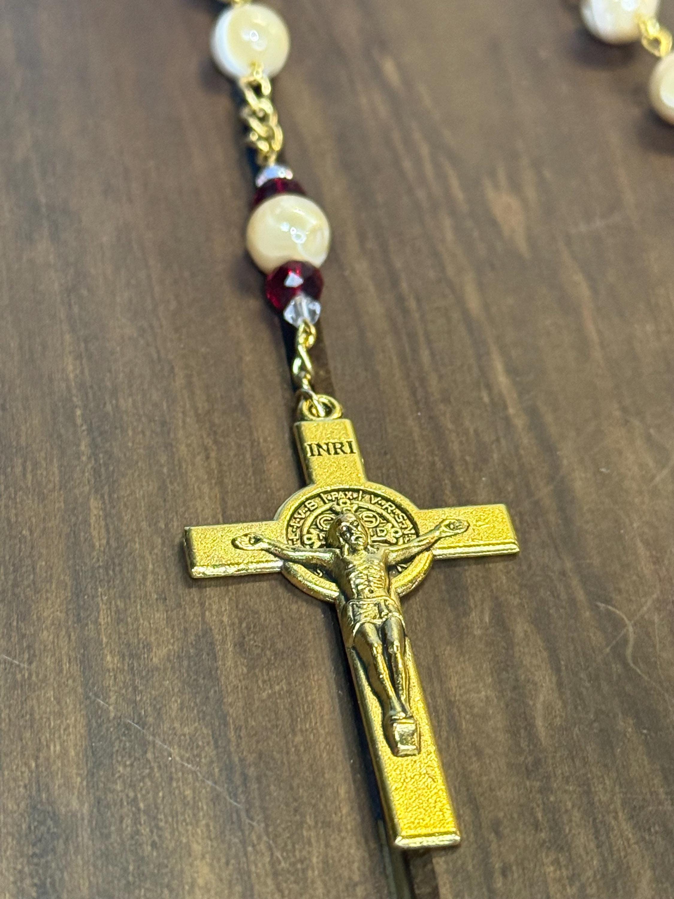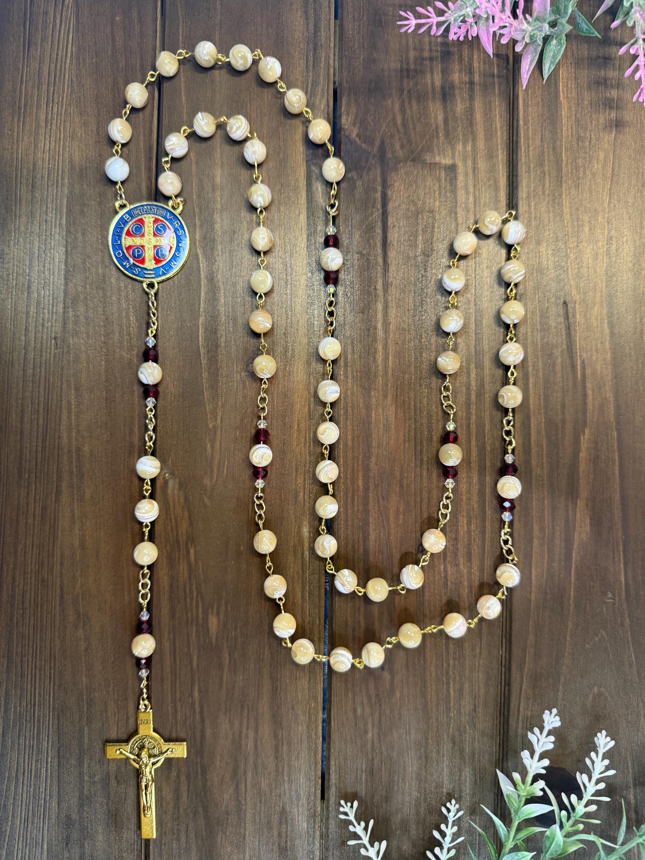 Discover a rosary crafted with care, where luminous pearl beads meet the sacred tradition of prayer. This Mother of Pearl rosary features radiant, natural beads that shimmer softly, paired with an 18k gold plated Saint Benedict centerpiece and a matching gold tone crucifix, embodying both beauty and spiritual protection. Perfect for daily devotion or as a thoughtful religious gift, it invites peace and grace into every moment.