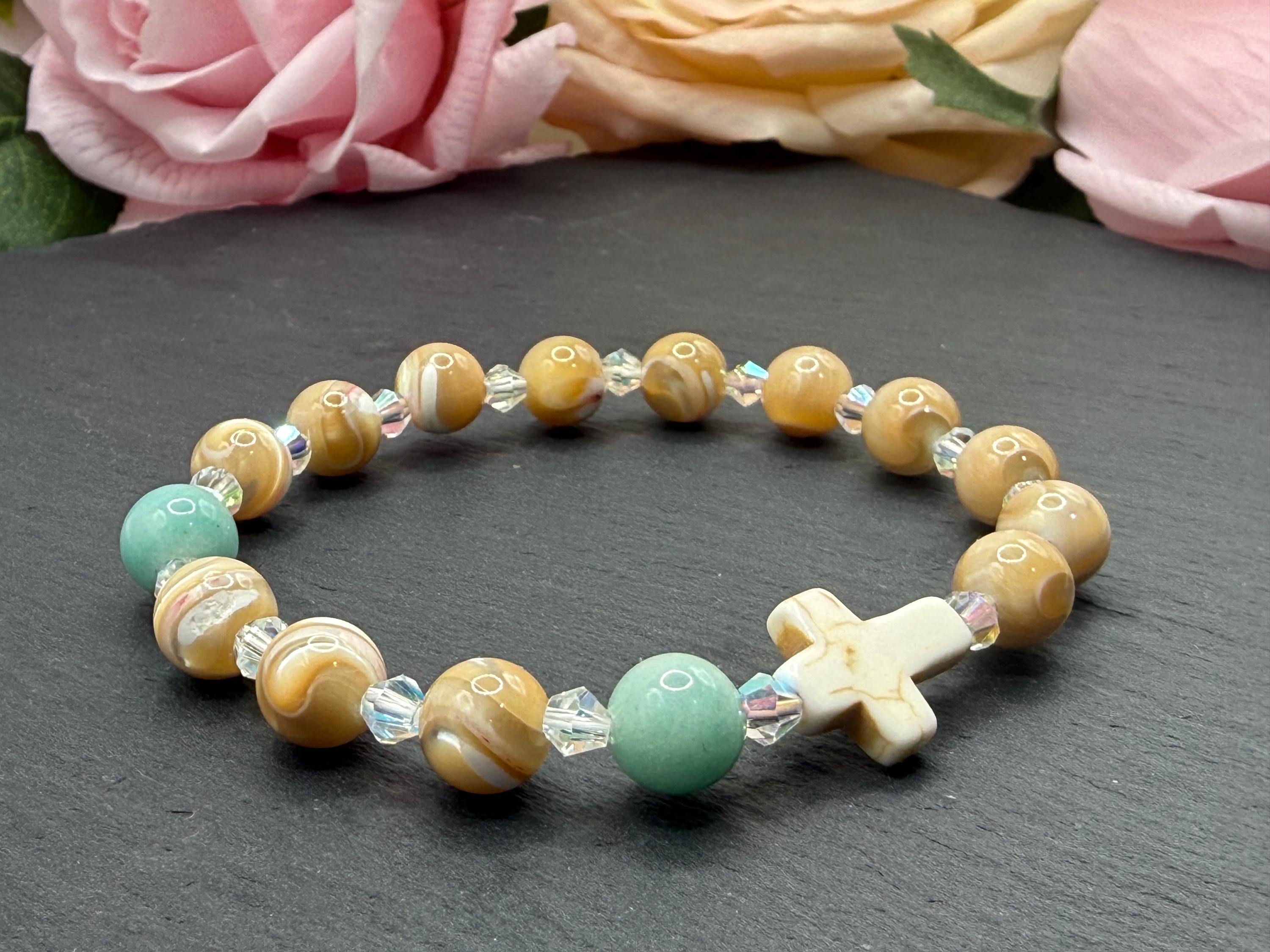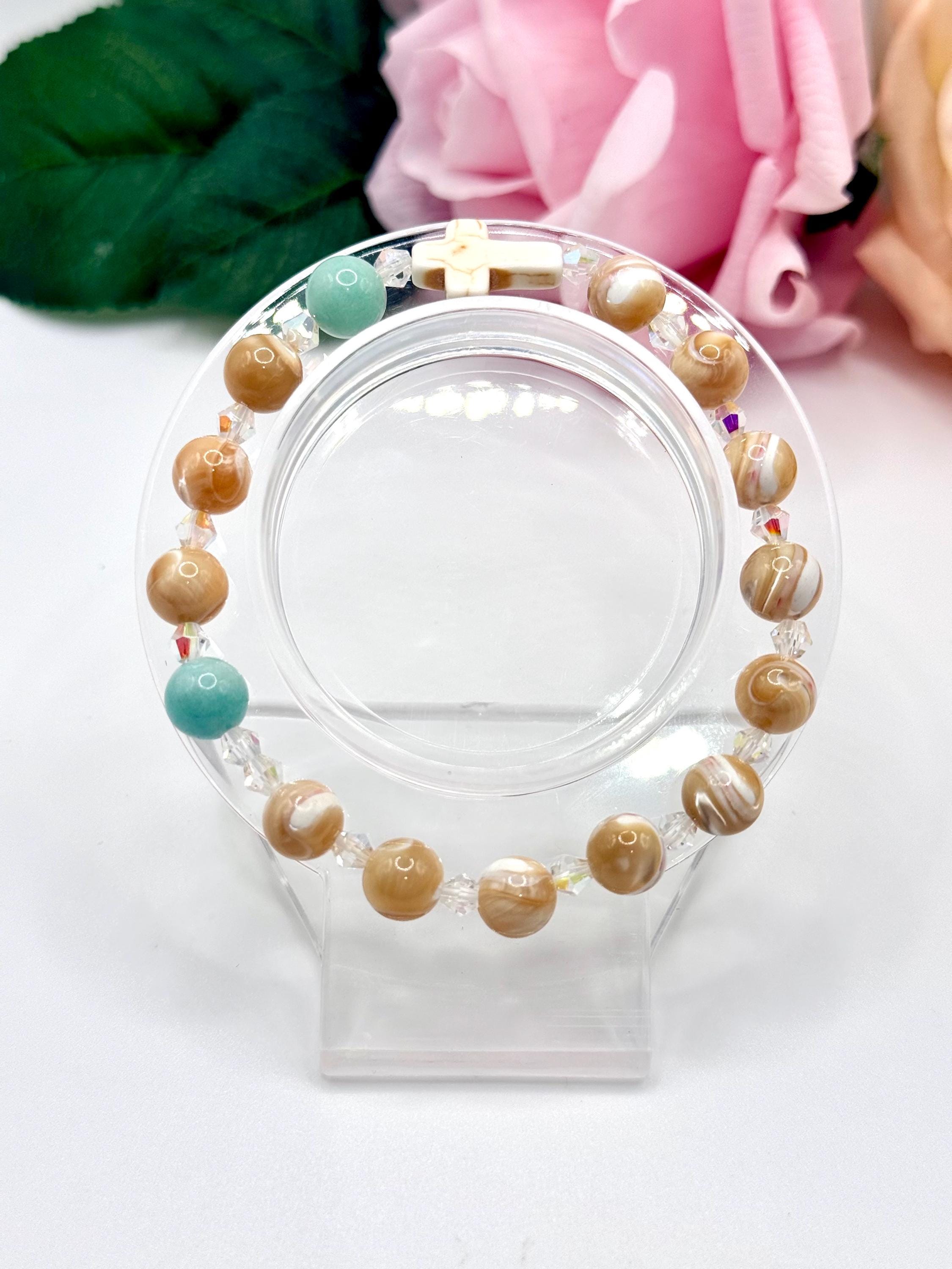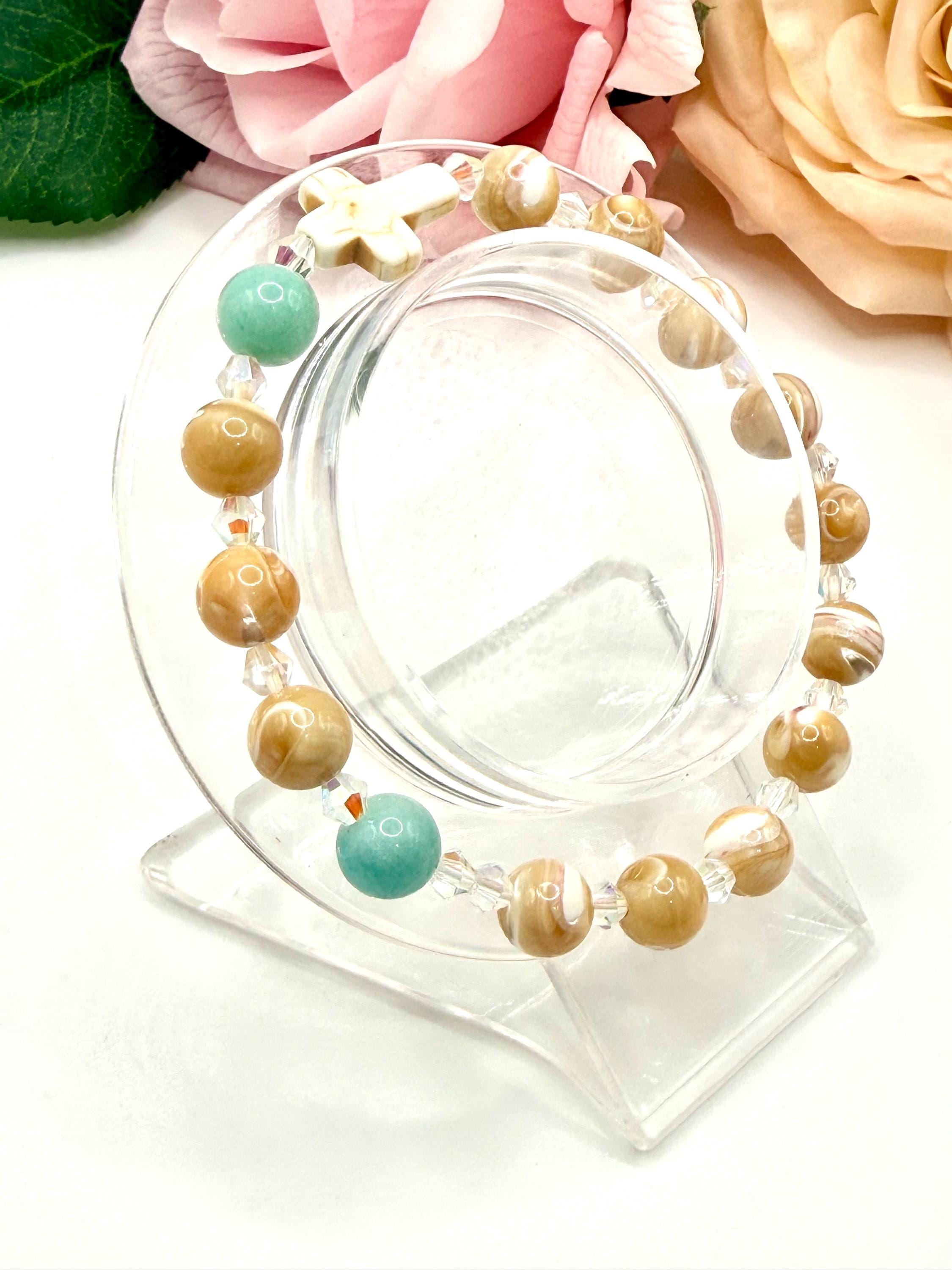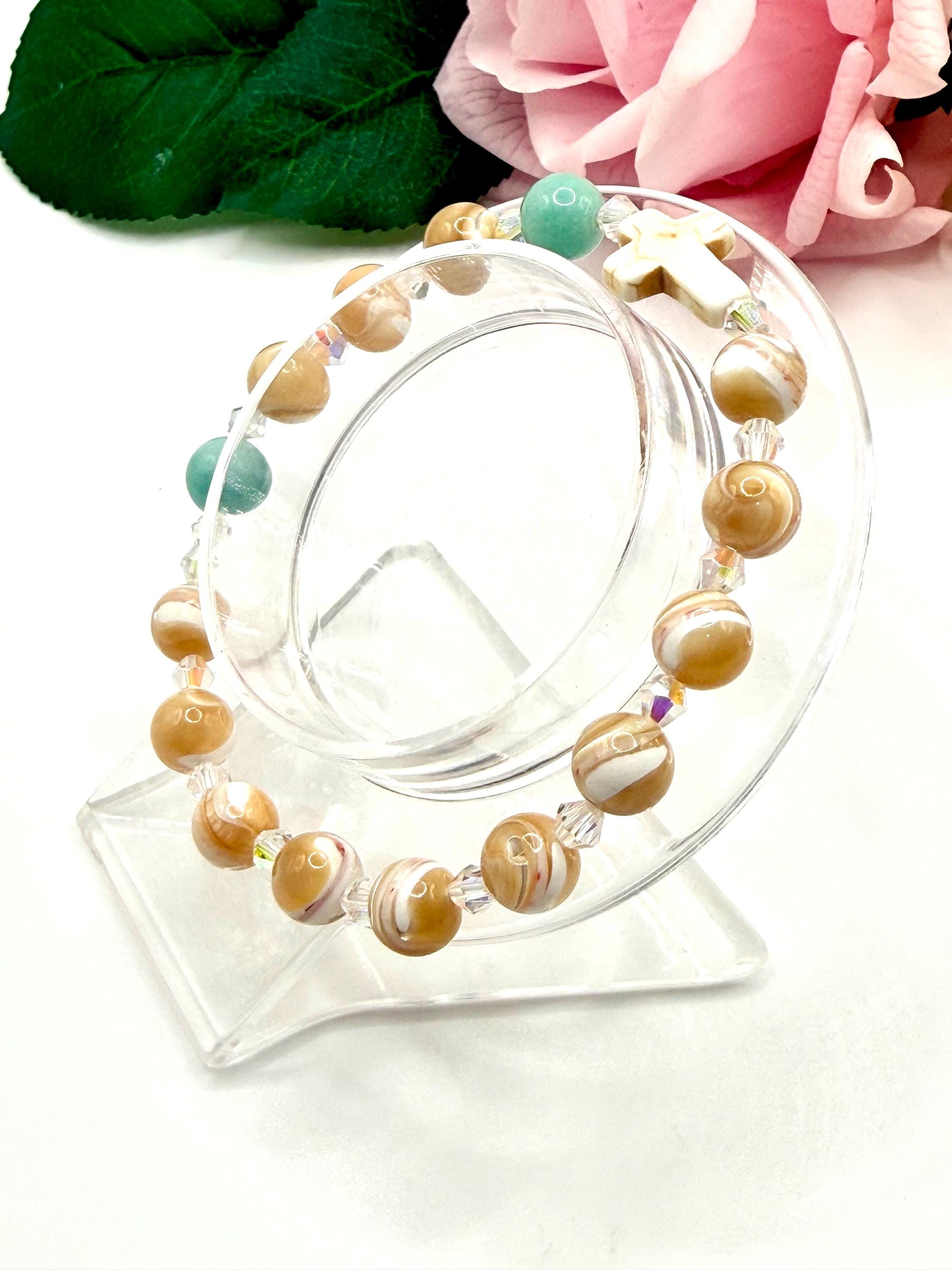 Embrace a meaningful blend of elegance and faith with this rosary bracelet, designed to inspire daily devotion and style. Crafted with genuine mother of pearl beads, amazonite gemstones, and sparkling Austrian crystals, this prayer bracelet offers a beautiful way to carry your spirituality wherever you go. Whether for personal meditation or as a thoughtful catholic gift, its handcrafted charm shines with every wear.