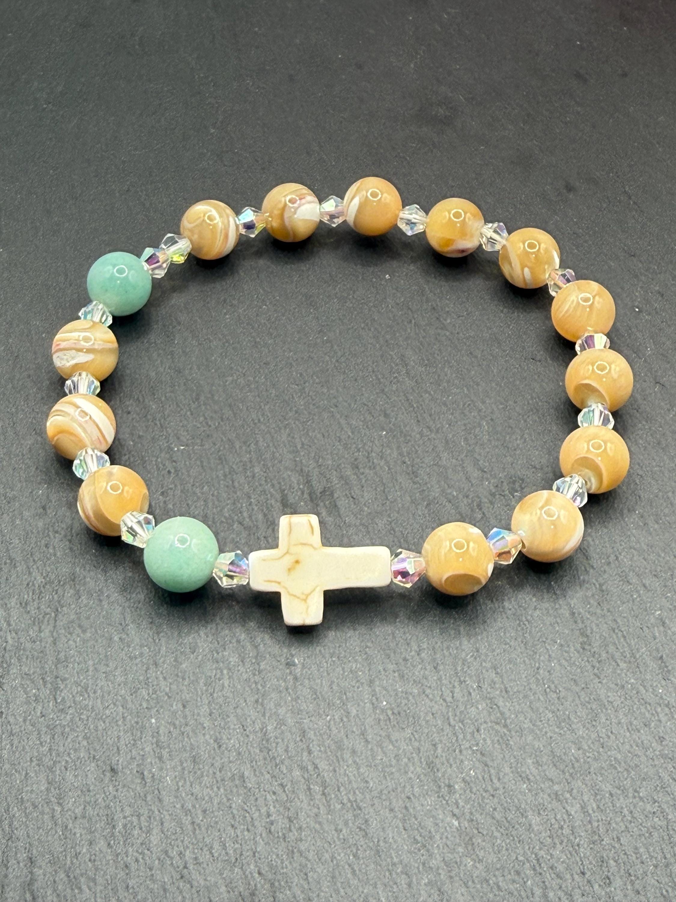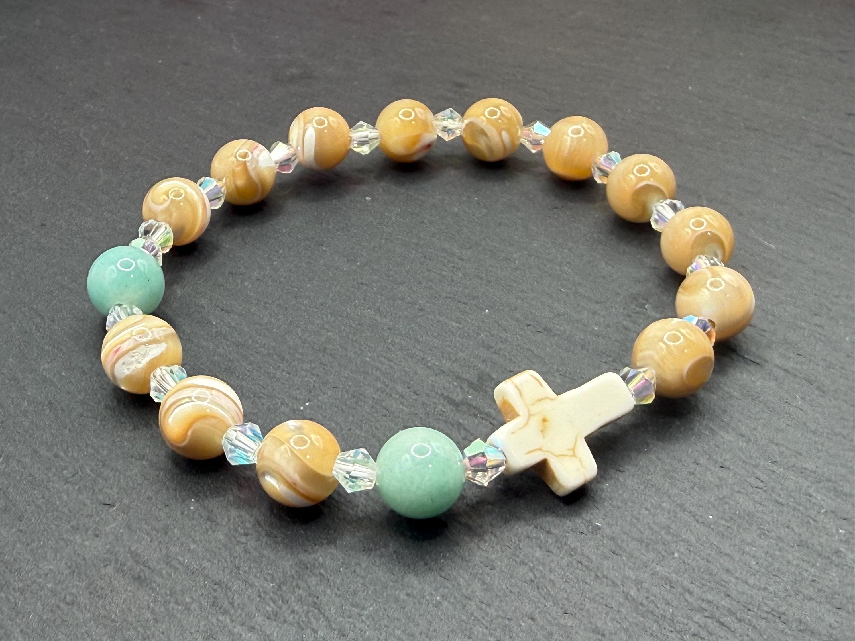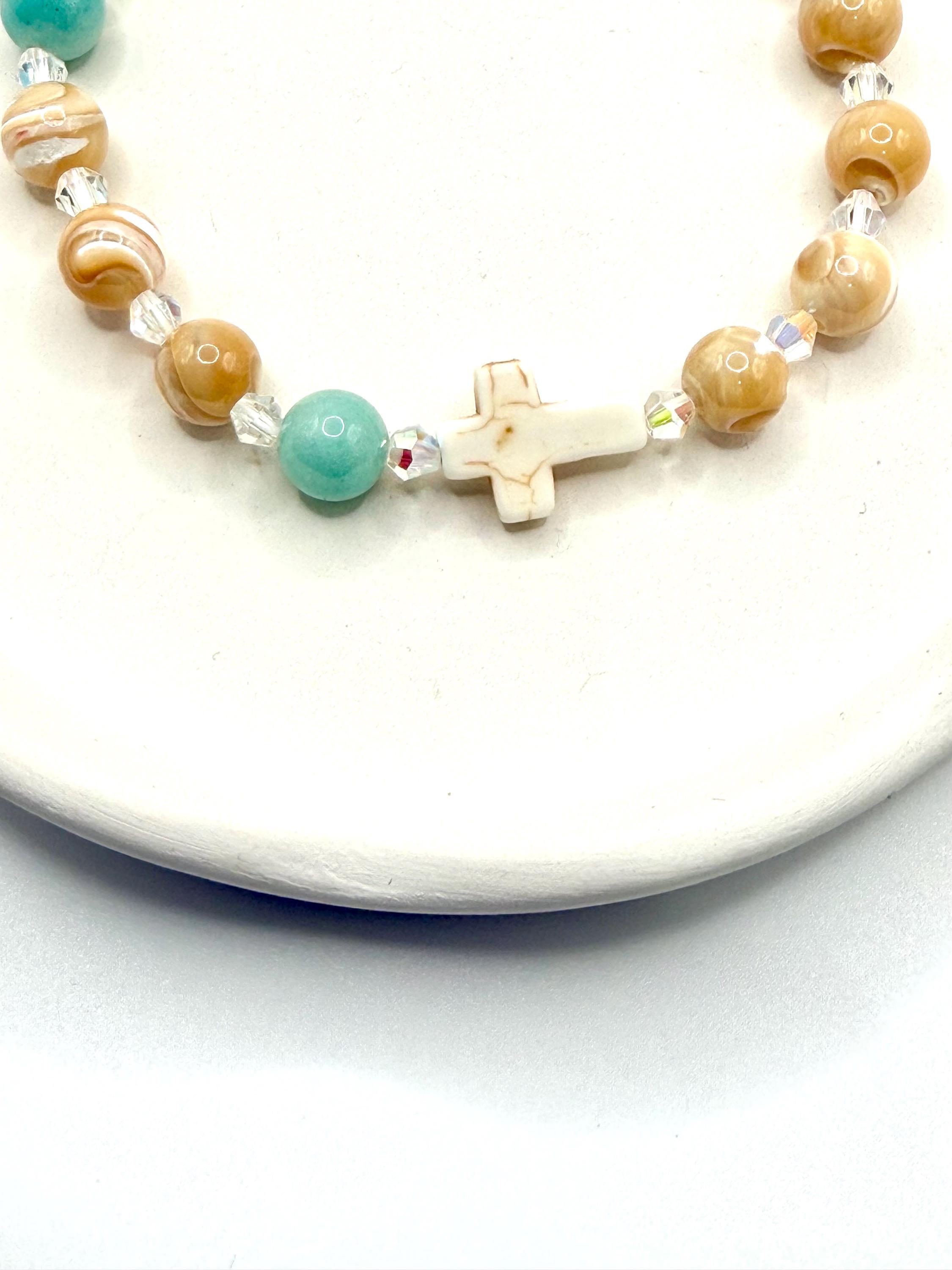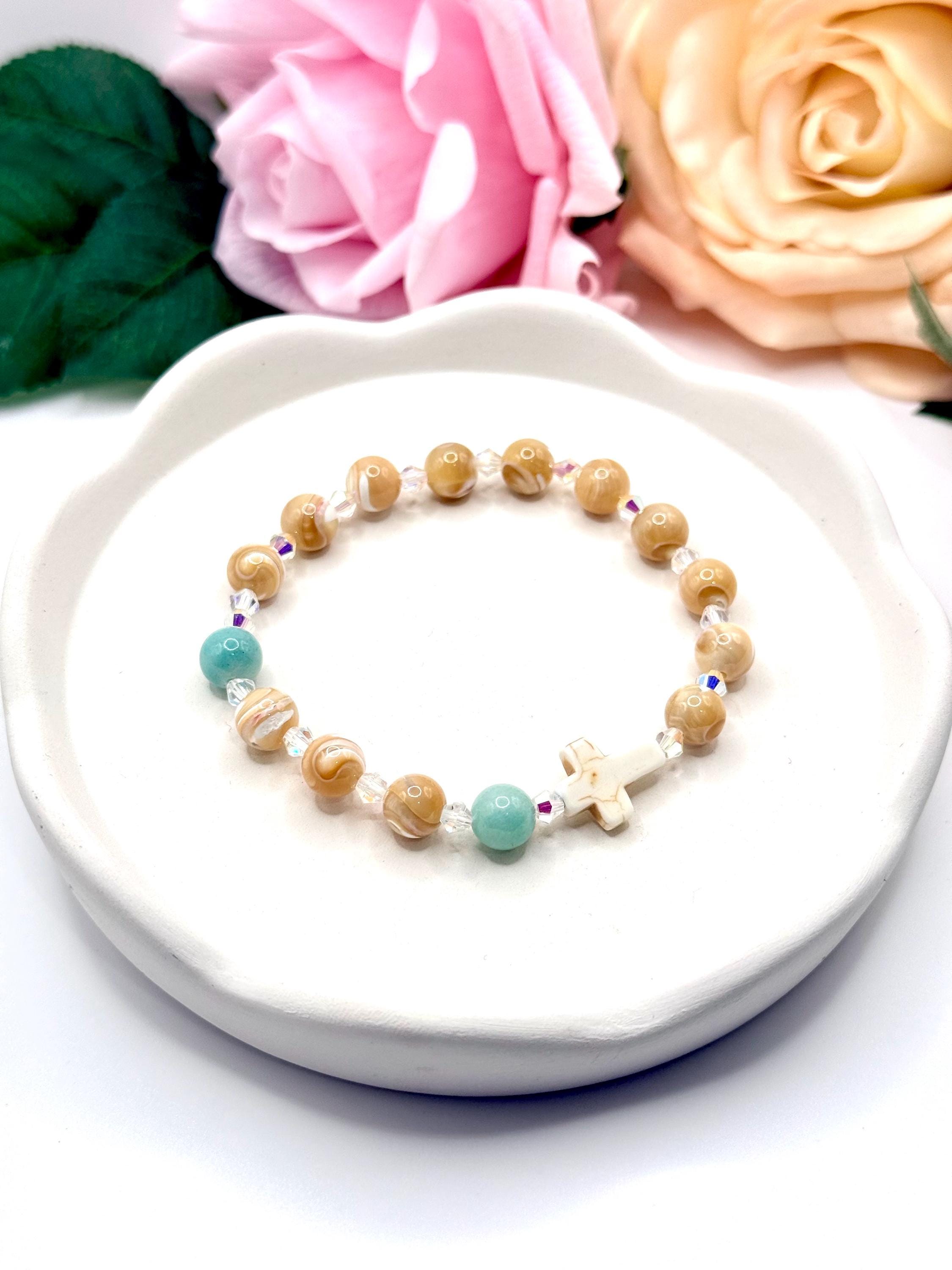 Embrace a meaningful blend of elegance and faith with this rosary bracelet, designed to inspire daily devotion and style. Crafted with genuine mother of pearl beads, amazonite gemstones, and sparkling Austrian crystals, this prayer bracelet offers a beautiful way to carry your spirituality wherever you go. Whether for personal meditation or as a thoughtful catholic gift, its handcrafted charm shines with every wear.