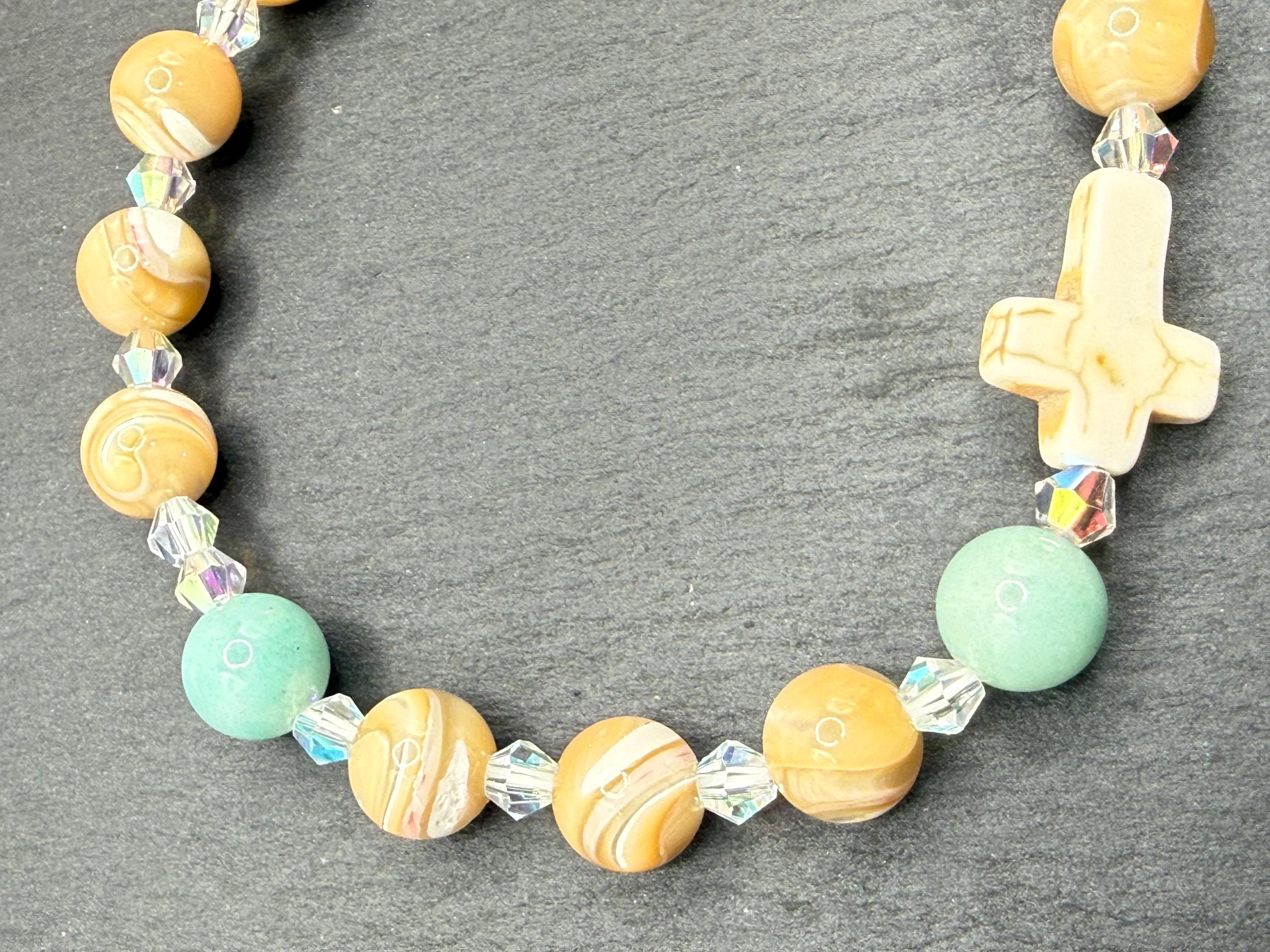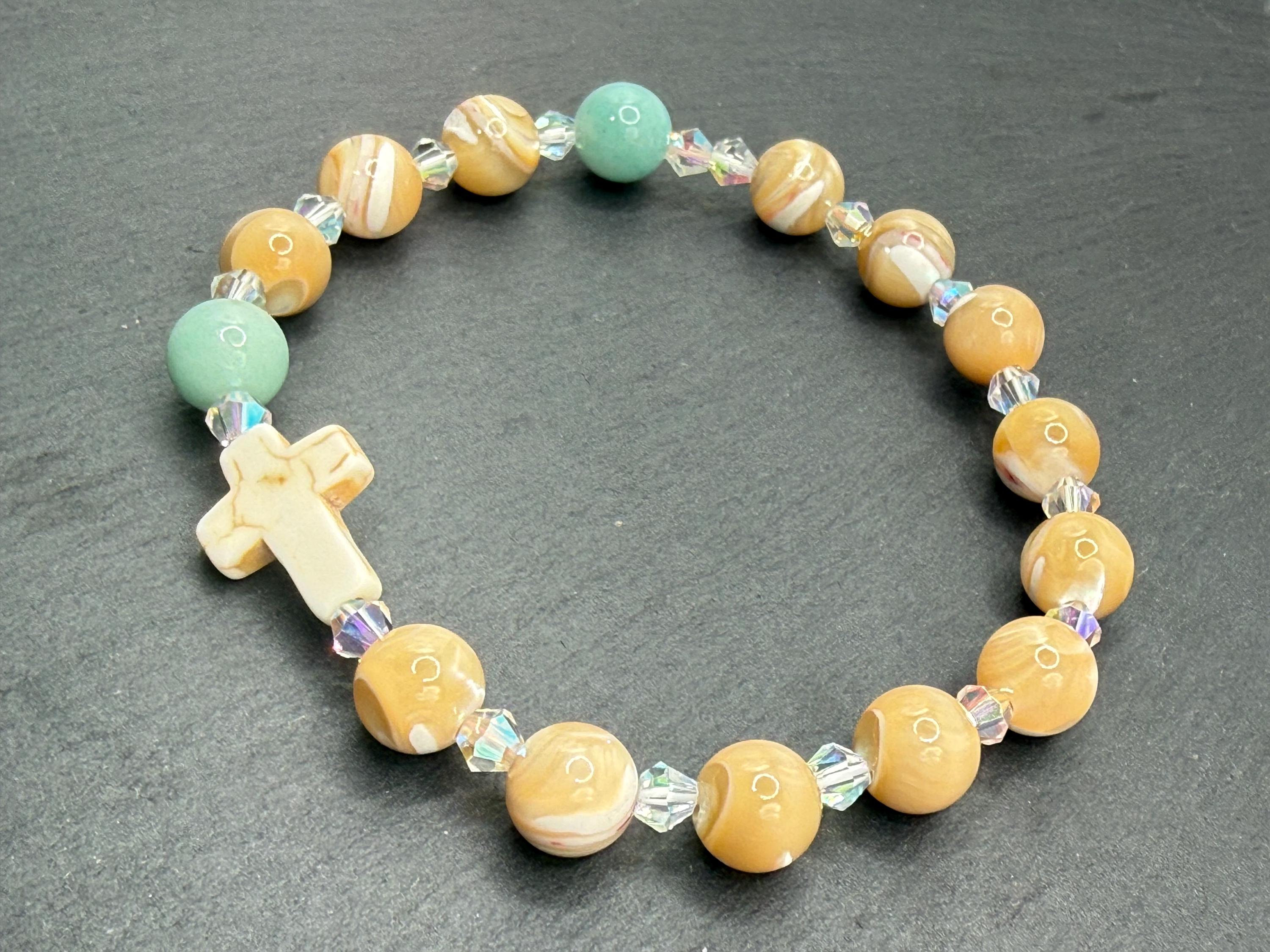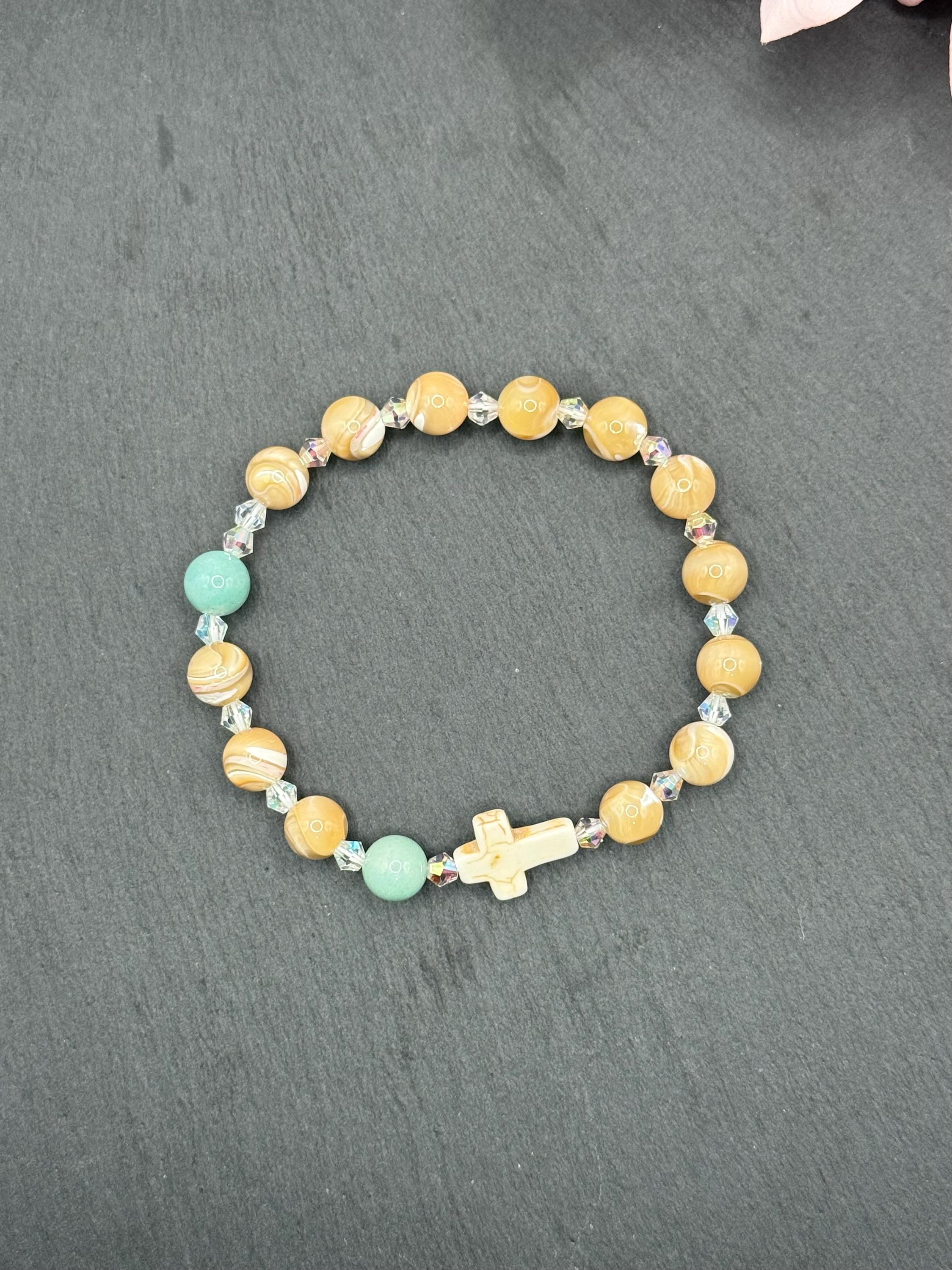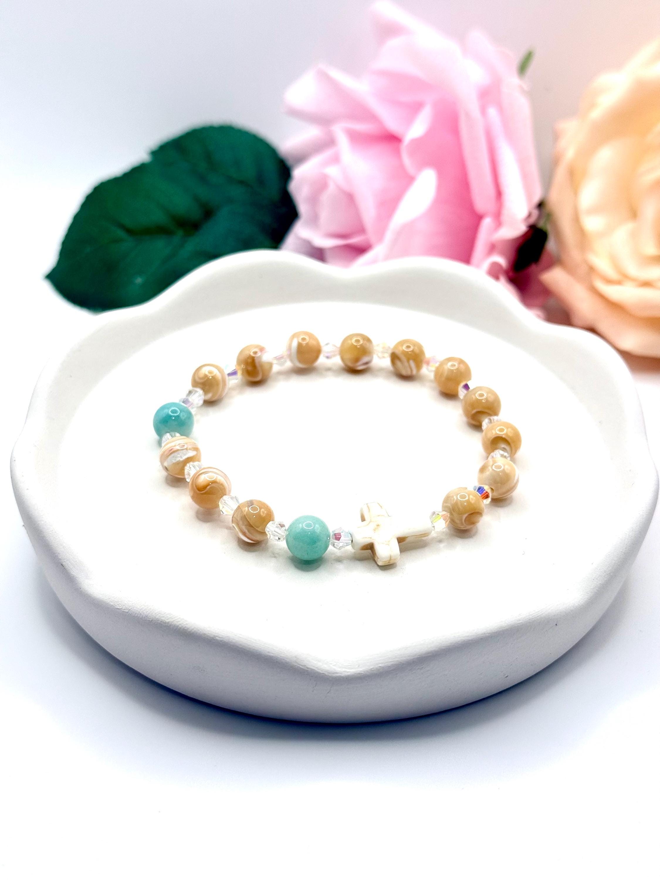 Embrace a meaningful blend of elegance and faith with this rosary bracelet, designed to inspire daily devotion and style. Crafted with genuine mother of pearl beads, amazonite gemstones, and sparkling Austrian crystals, this prayer bracelet offers a beautiful way to carry your spirituality wherever you go. Whether for personal meditation or as a thoughtful catholic gift, its handcrafted charm shines with every wear.