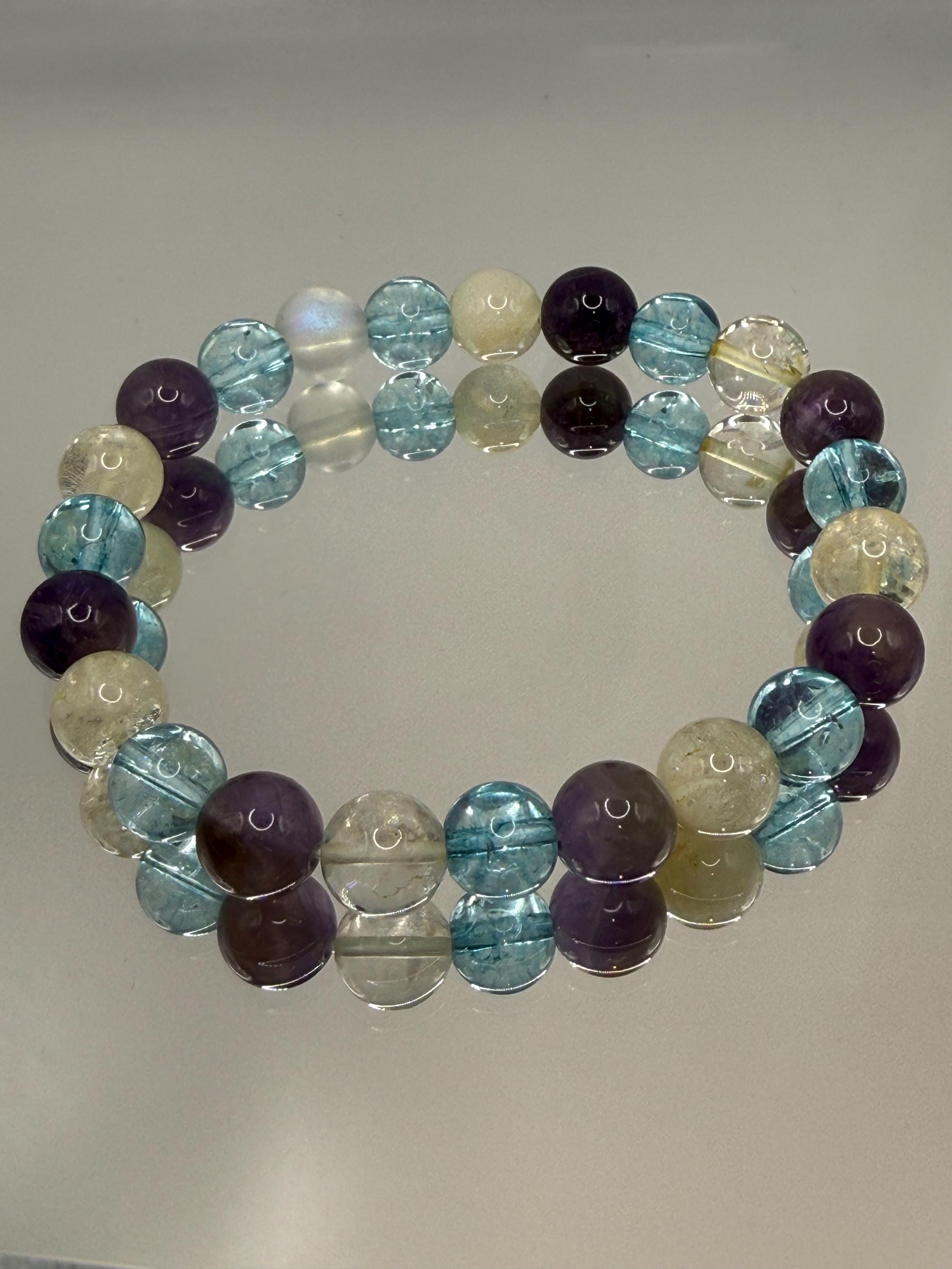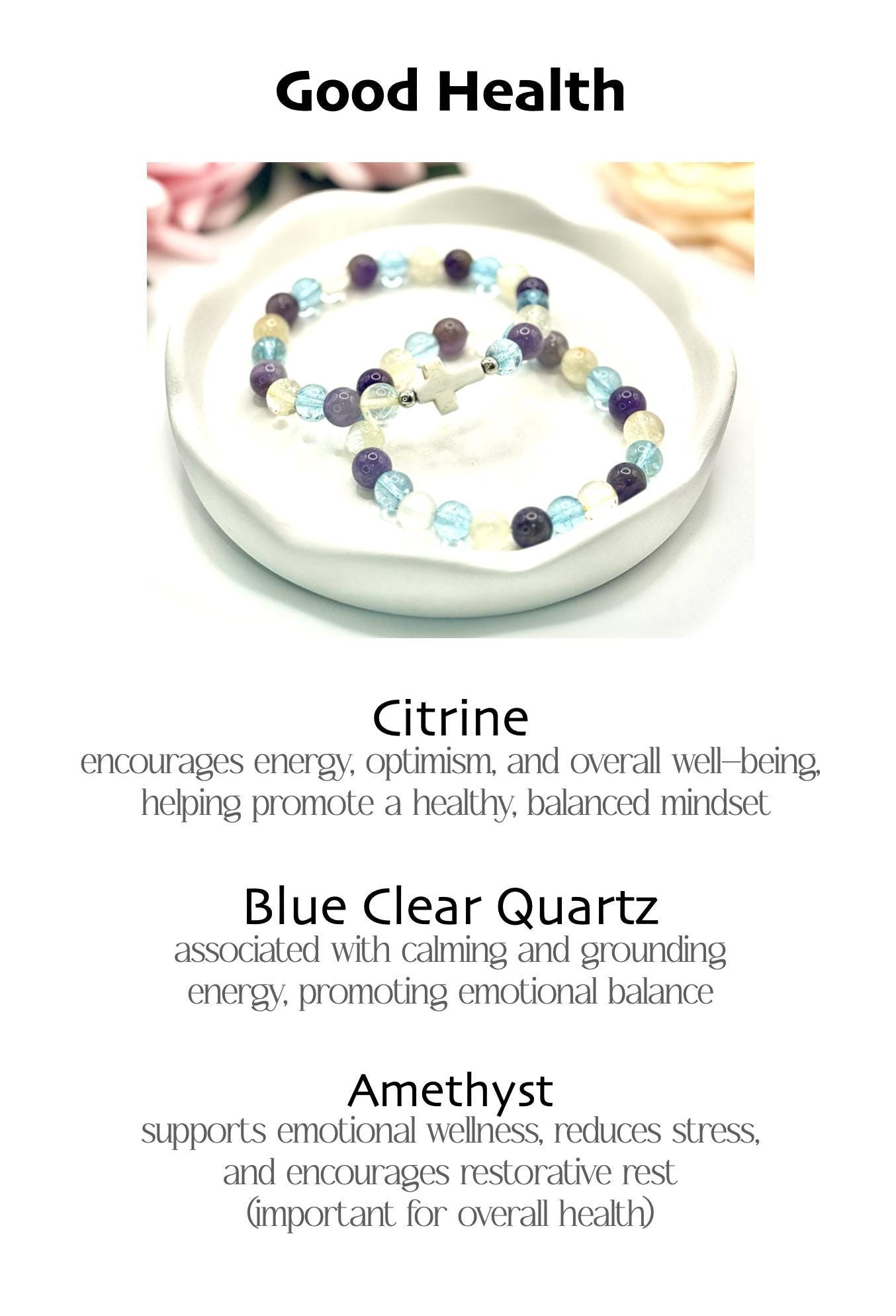 - Handmade with natural citrine, amethyst, and blue quartz beads known for vitality, calmness, and healing
