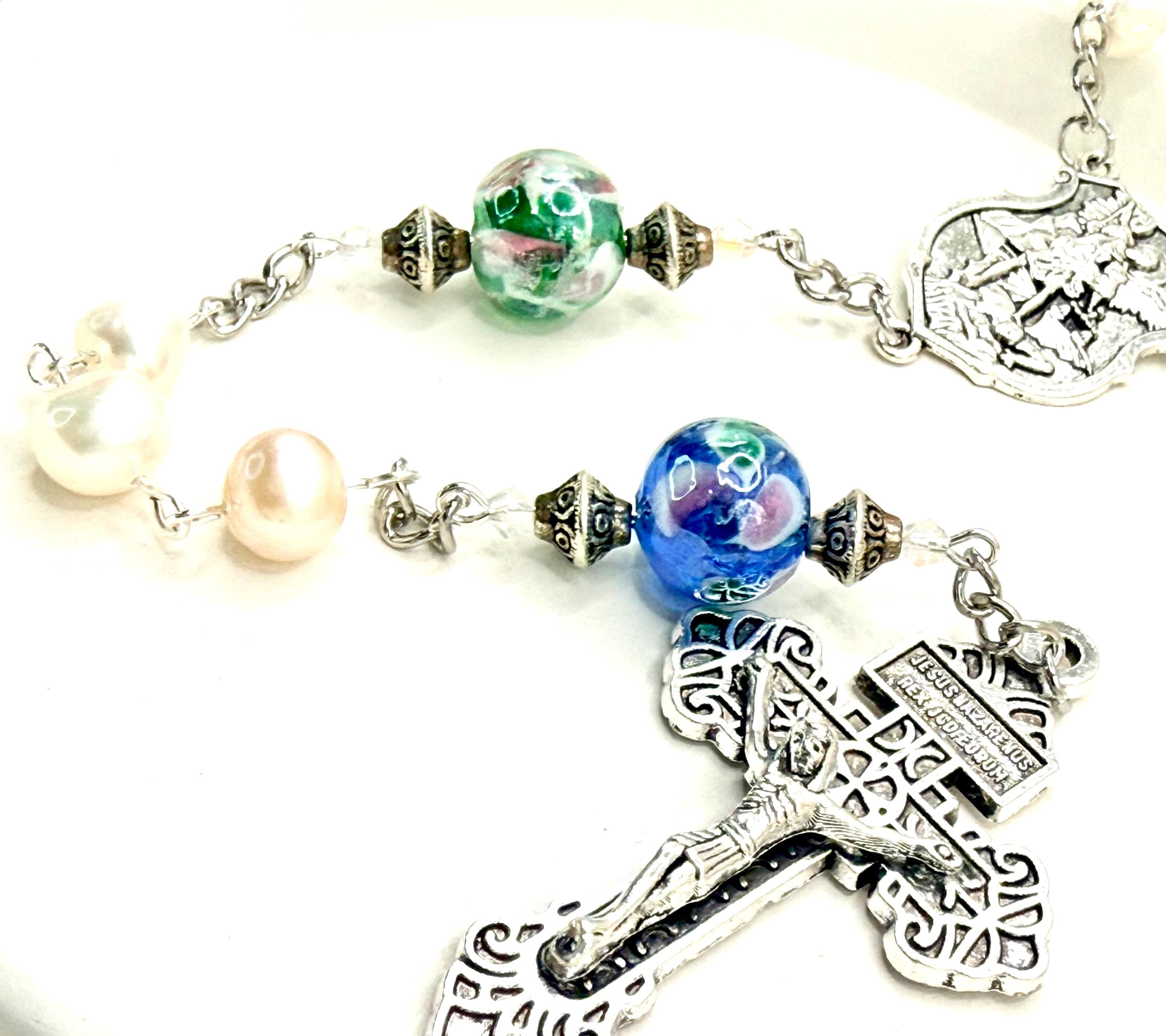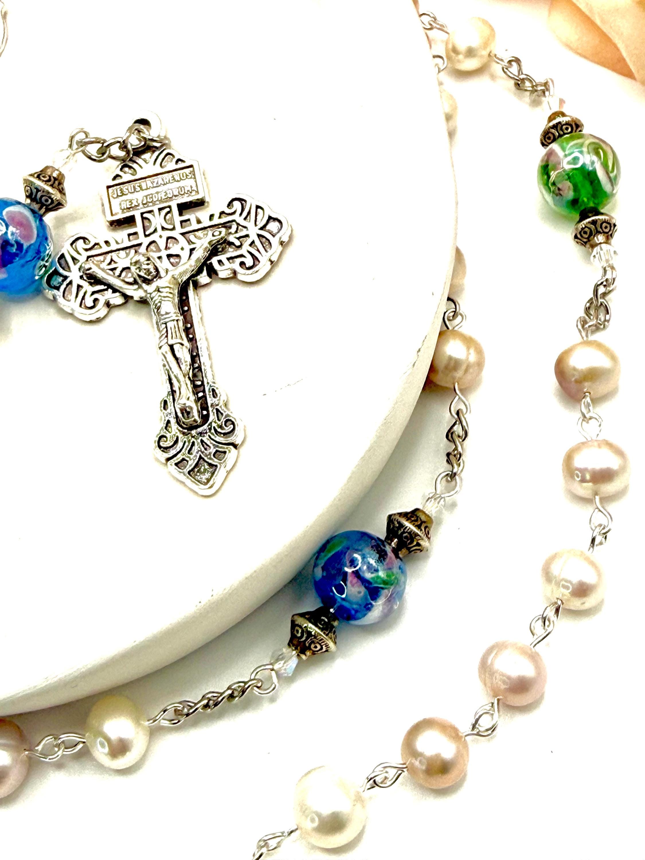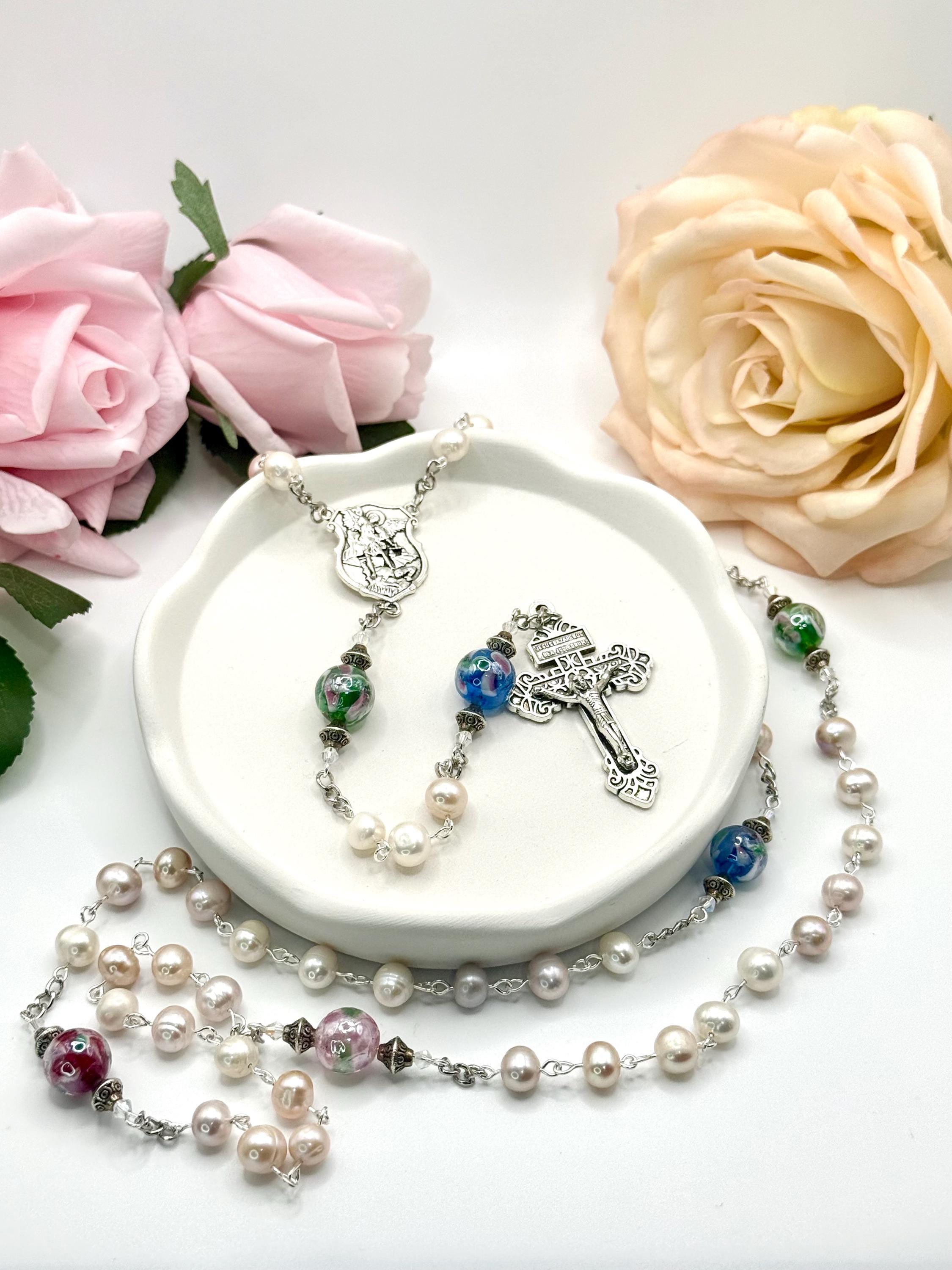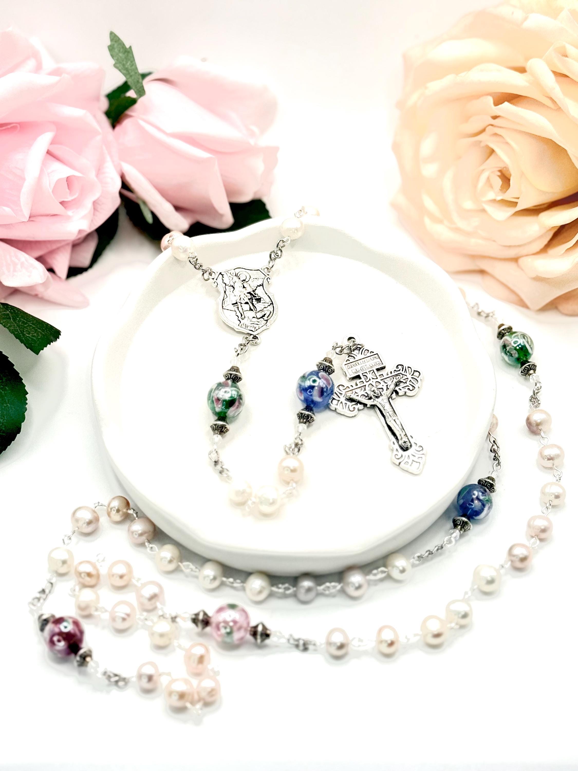 Discover a truly special piece that blends faith and artistry with this handmade rosary featuring a Saint Michael center, Lampwork glass beads, and genuine freshwater pearls. Each bead is carefully selected to create a prayer-ready rosary that embodies devotion, courage, and spiritual protection. Perfect for those seeking a meaningful Catholic prayer gift, this rosary brings elegance and sacred symbolism into every moment of reflection.