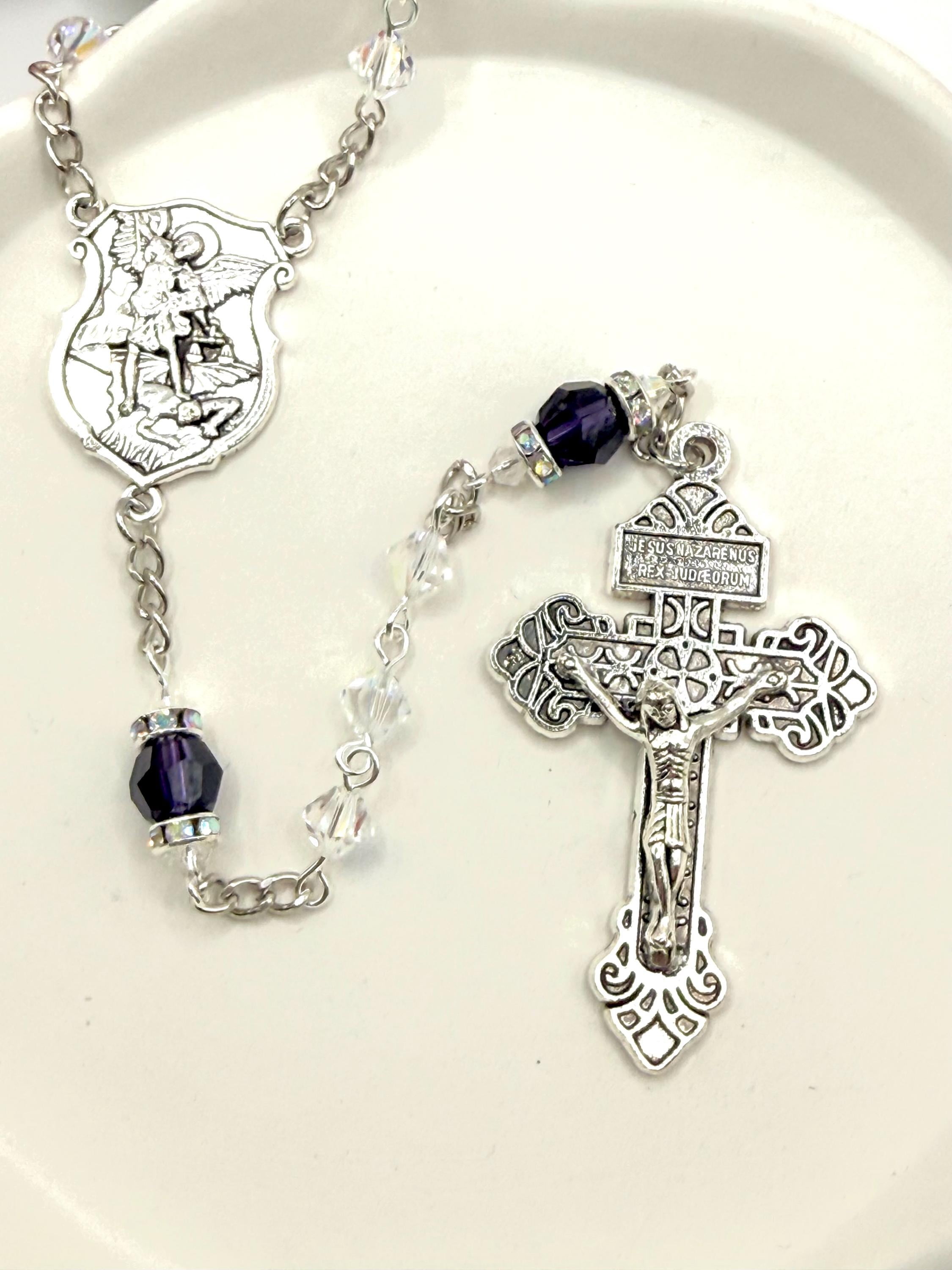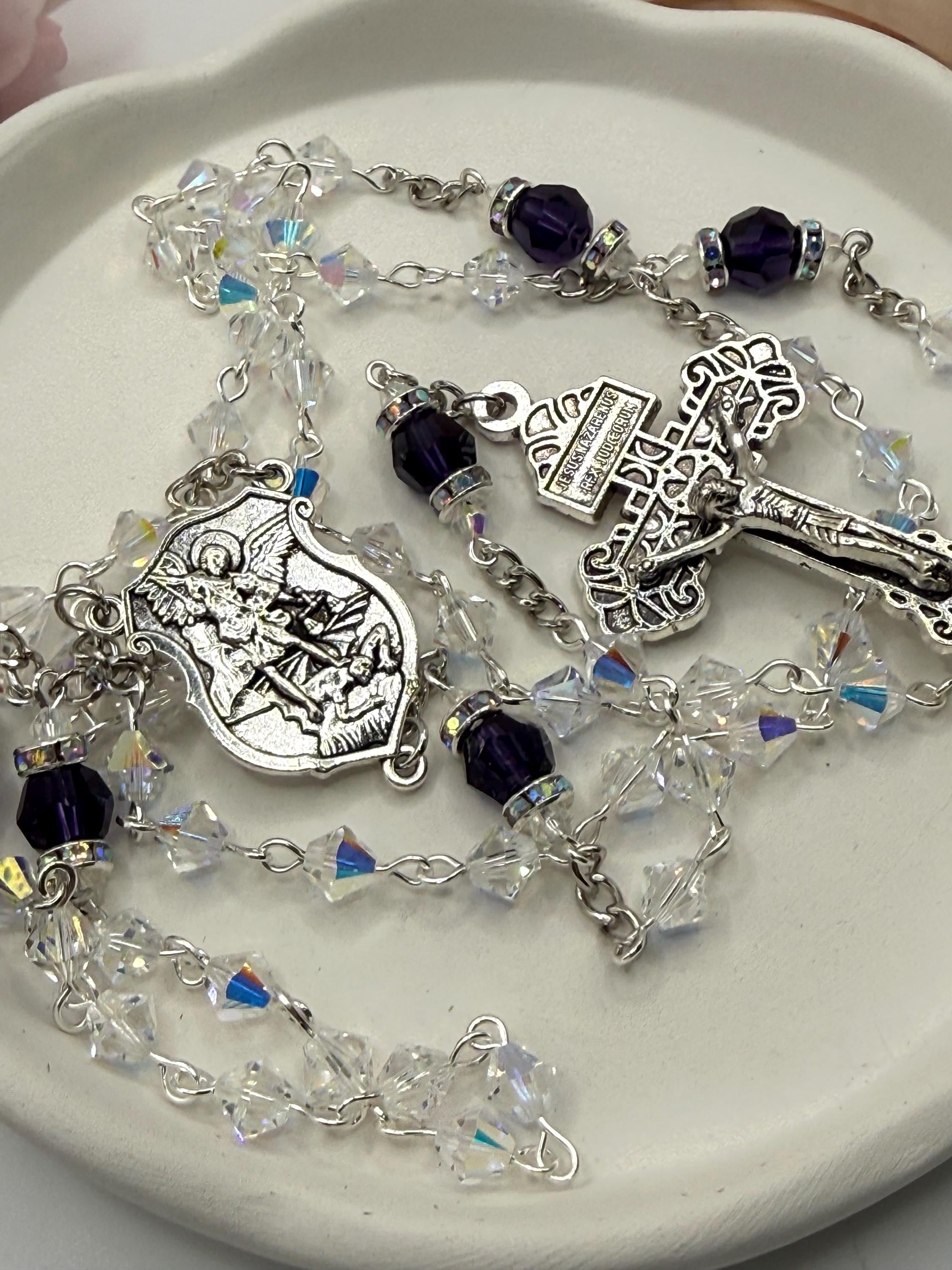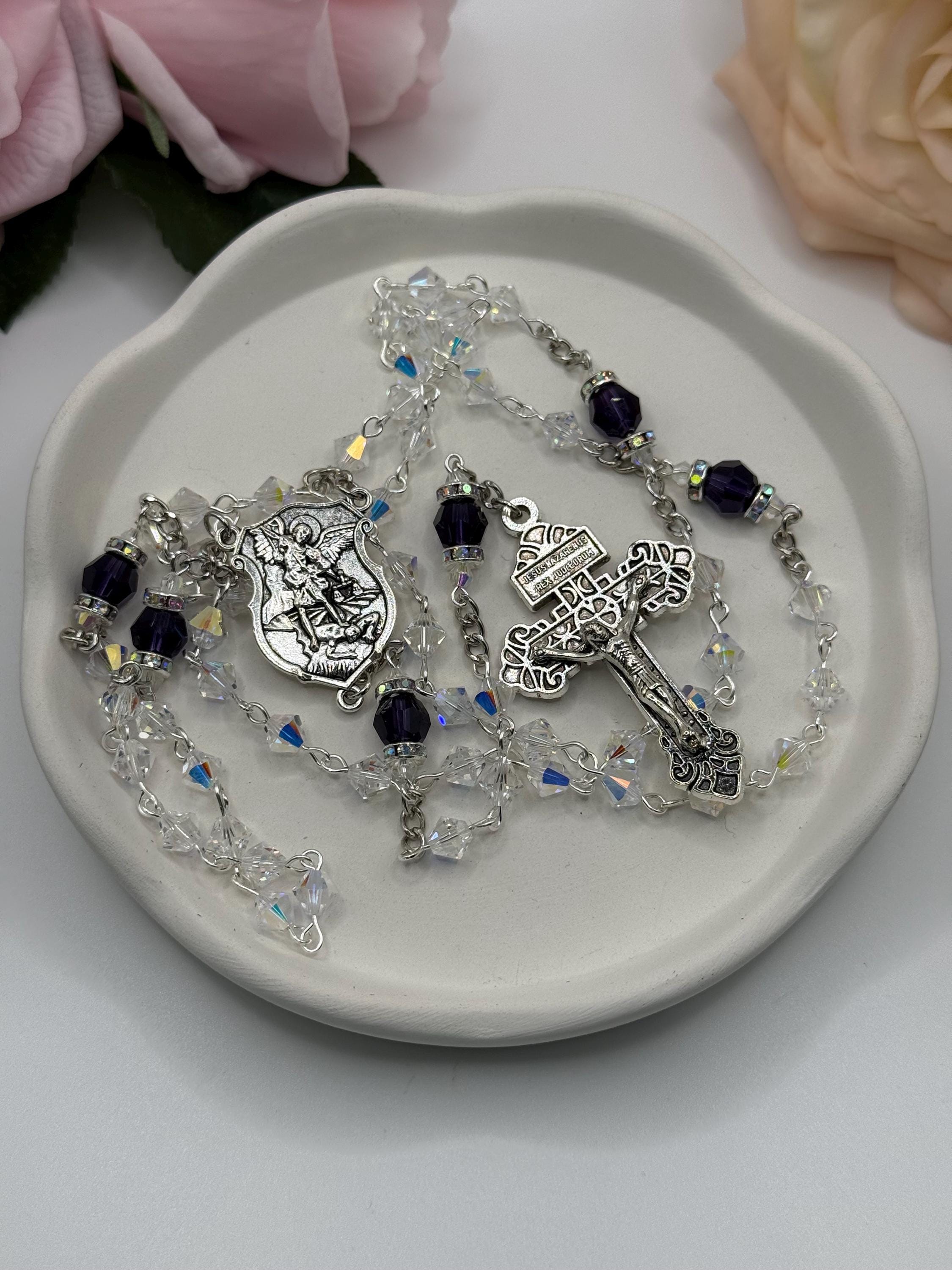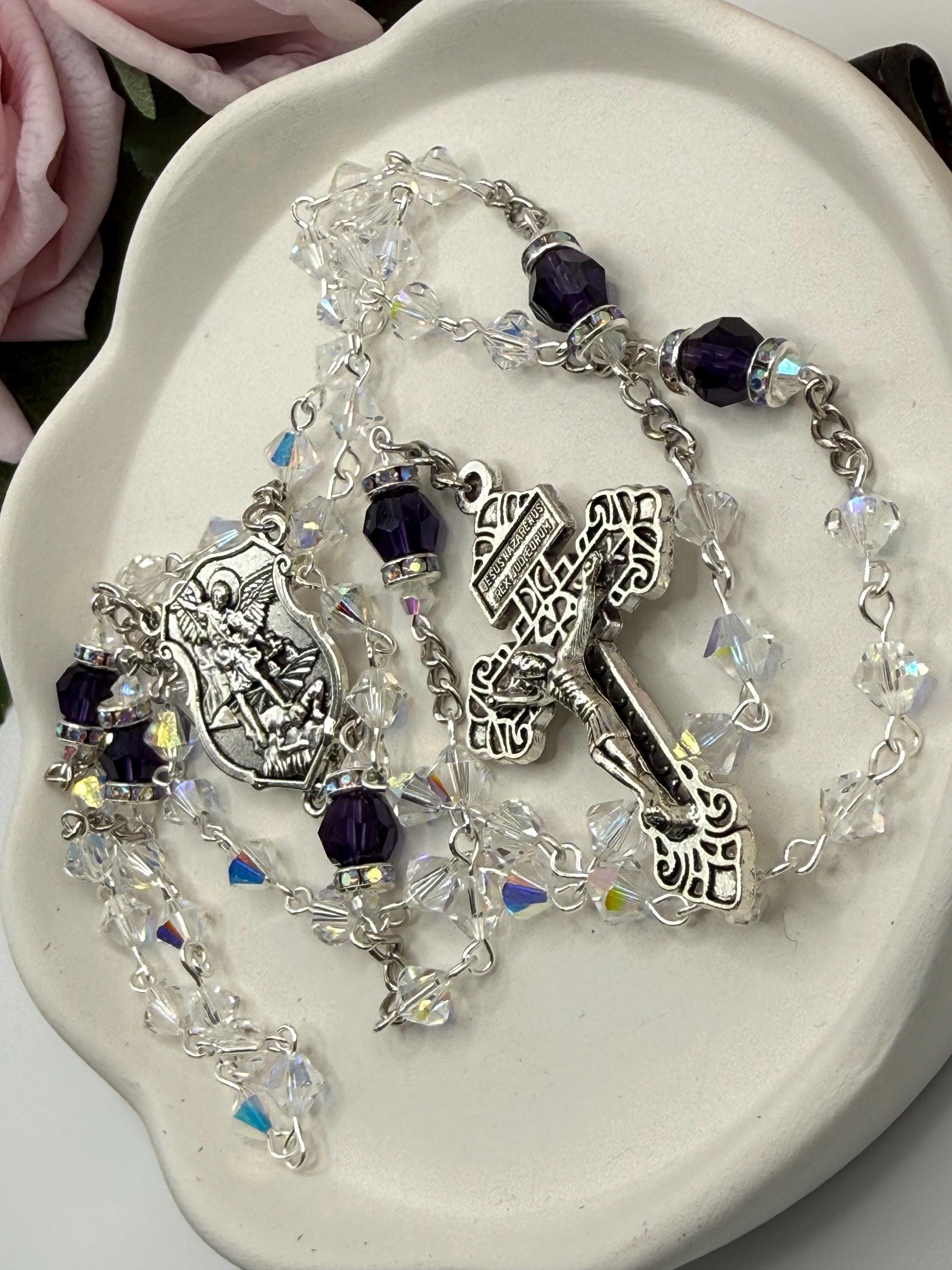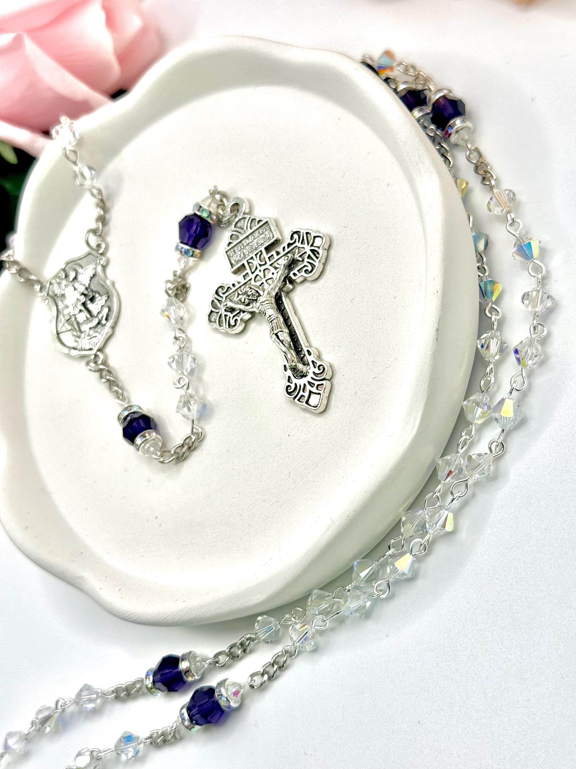 Experience a rosary that beautifully merges faith and artistry, crafted with radiant purple crystal beads that shimmer in every light. This meaningful Catholic prayer gift features a Saint Michael medal, symbolizing protection and strength, making it perfect for daily prayer or as a First Communion gift. Designed with devotion and lasting beauty in mind, it invites moments of reflection and spiritual connection.