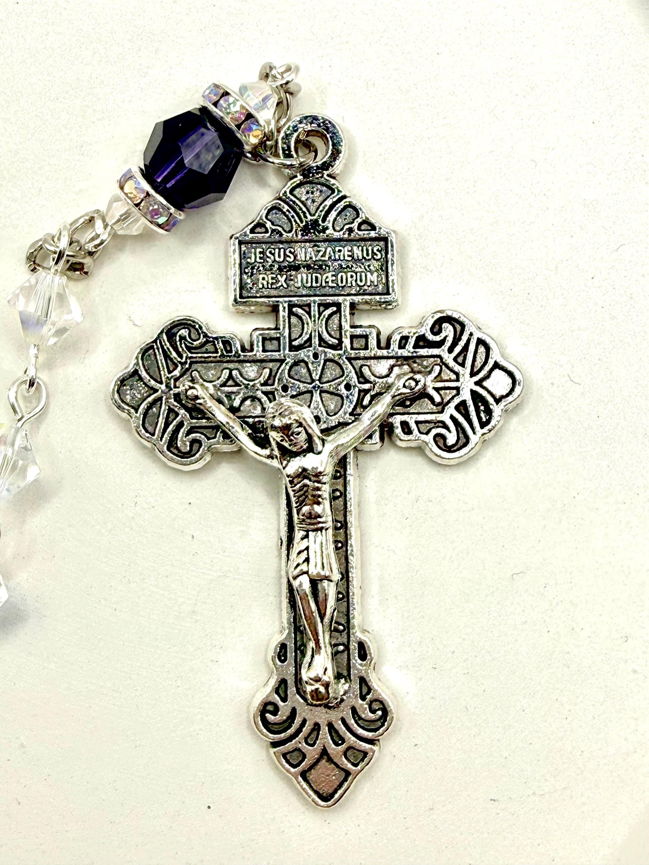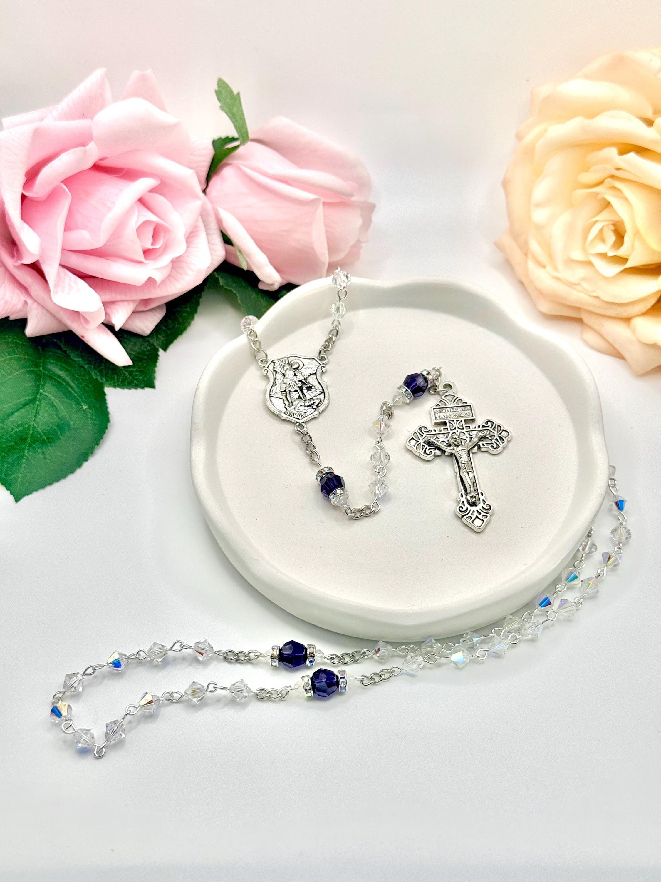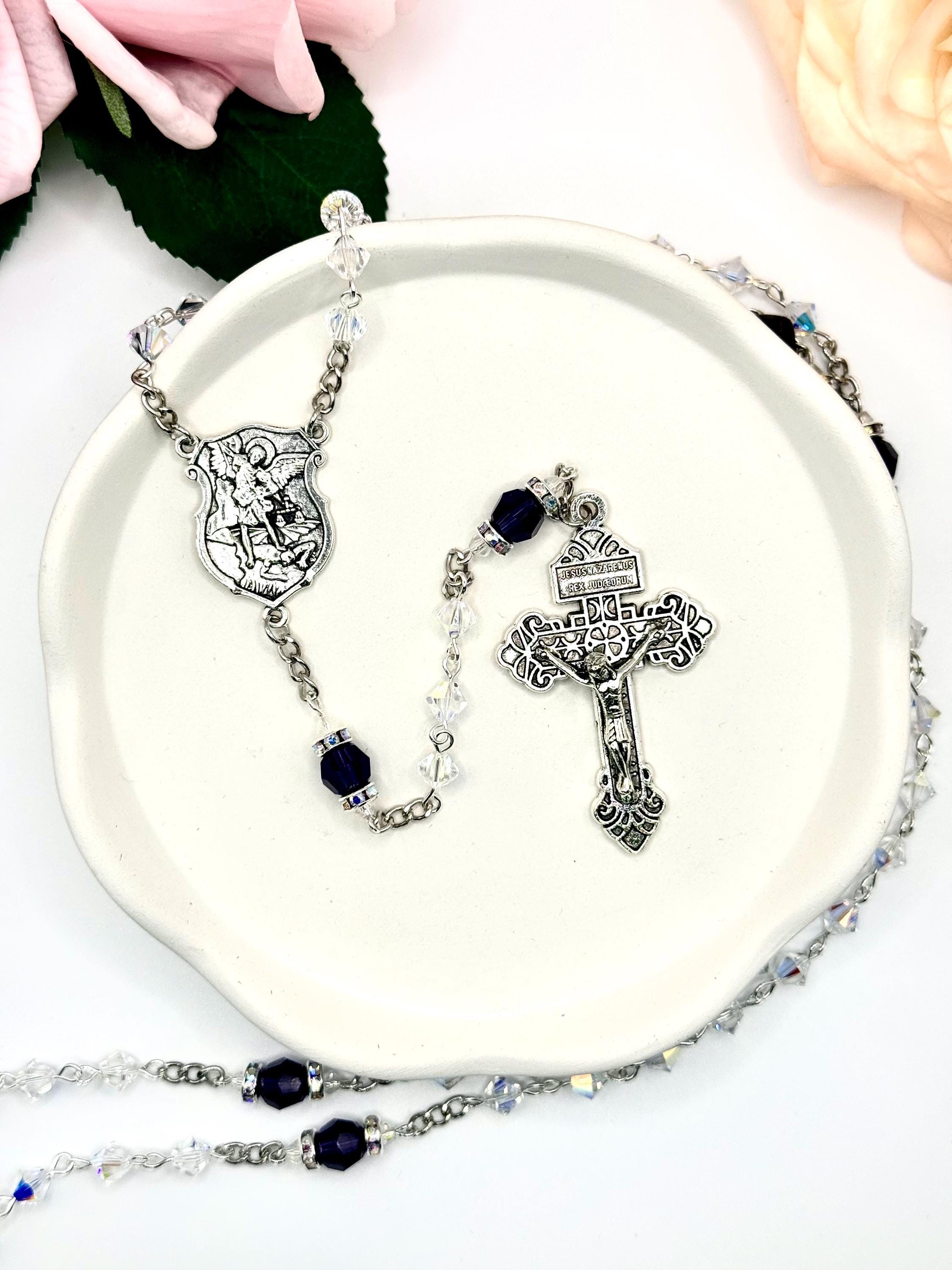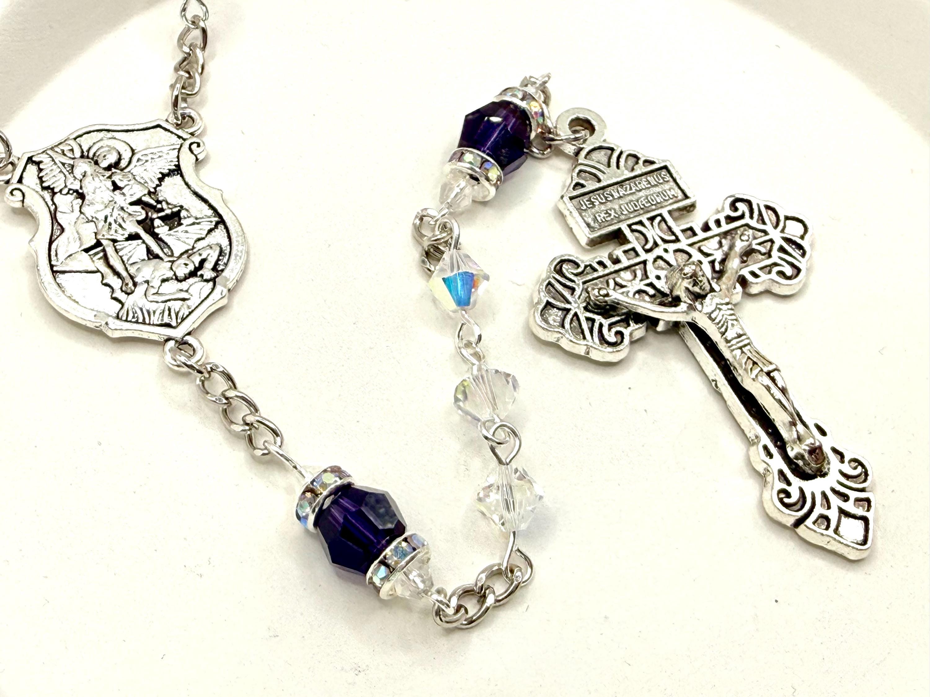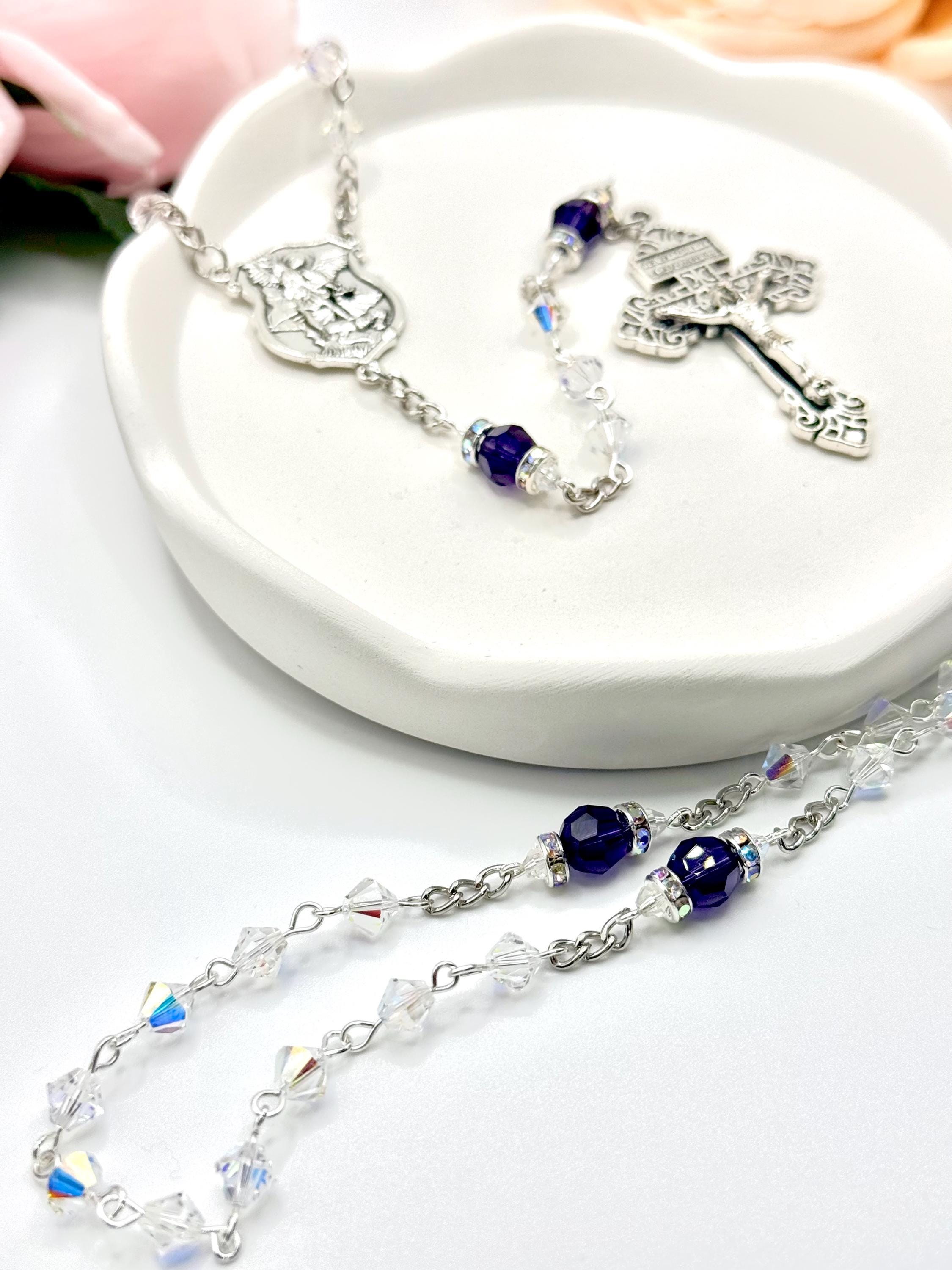 Experience a rosary that beautifully merges faith and artistry, crafted with radiant purple crystal beads that shimmer in every light. This meaningful Catholic prayer gift features a Saint Michael medal, symbolizing protection and strength, making it perfect for daily prayer or as a First Communion gift. Designed with devotion and lasting beauty in mind, it invites moments of reflection and spiritual connection.