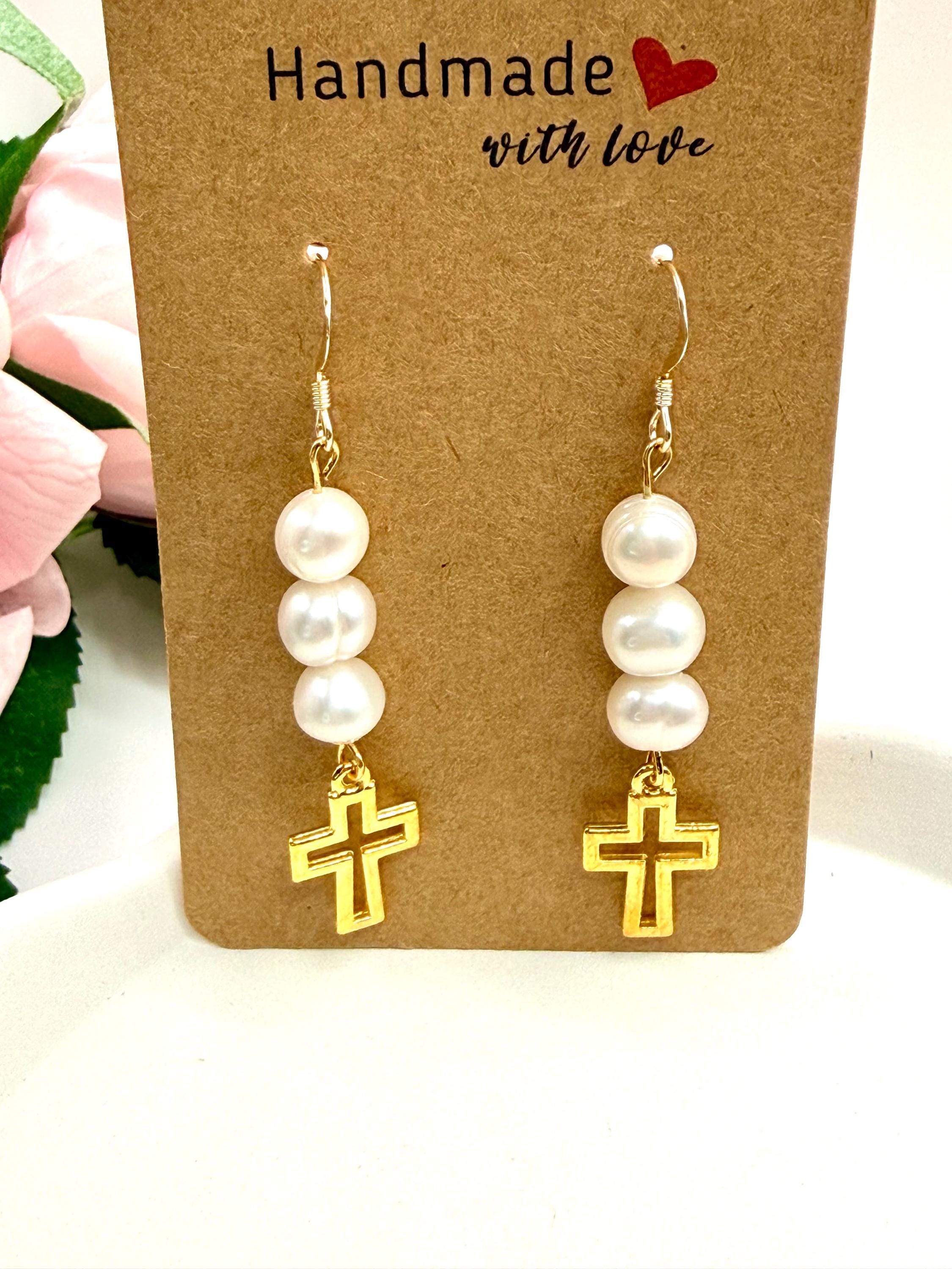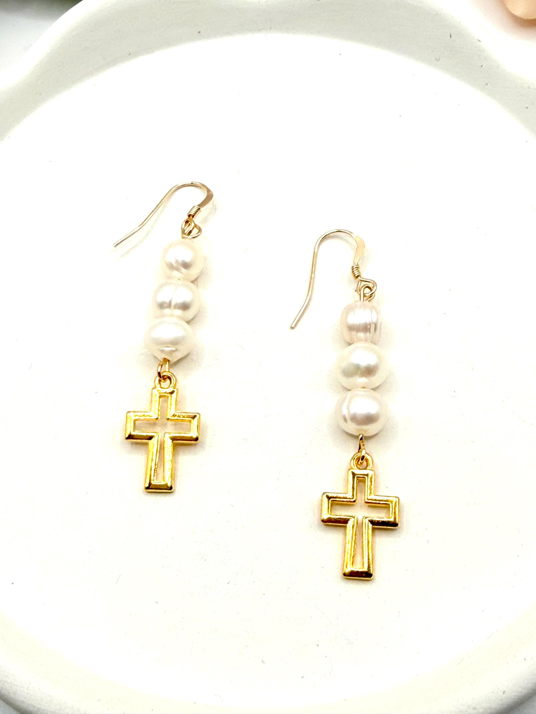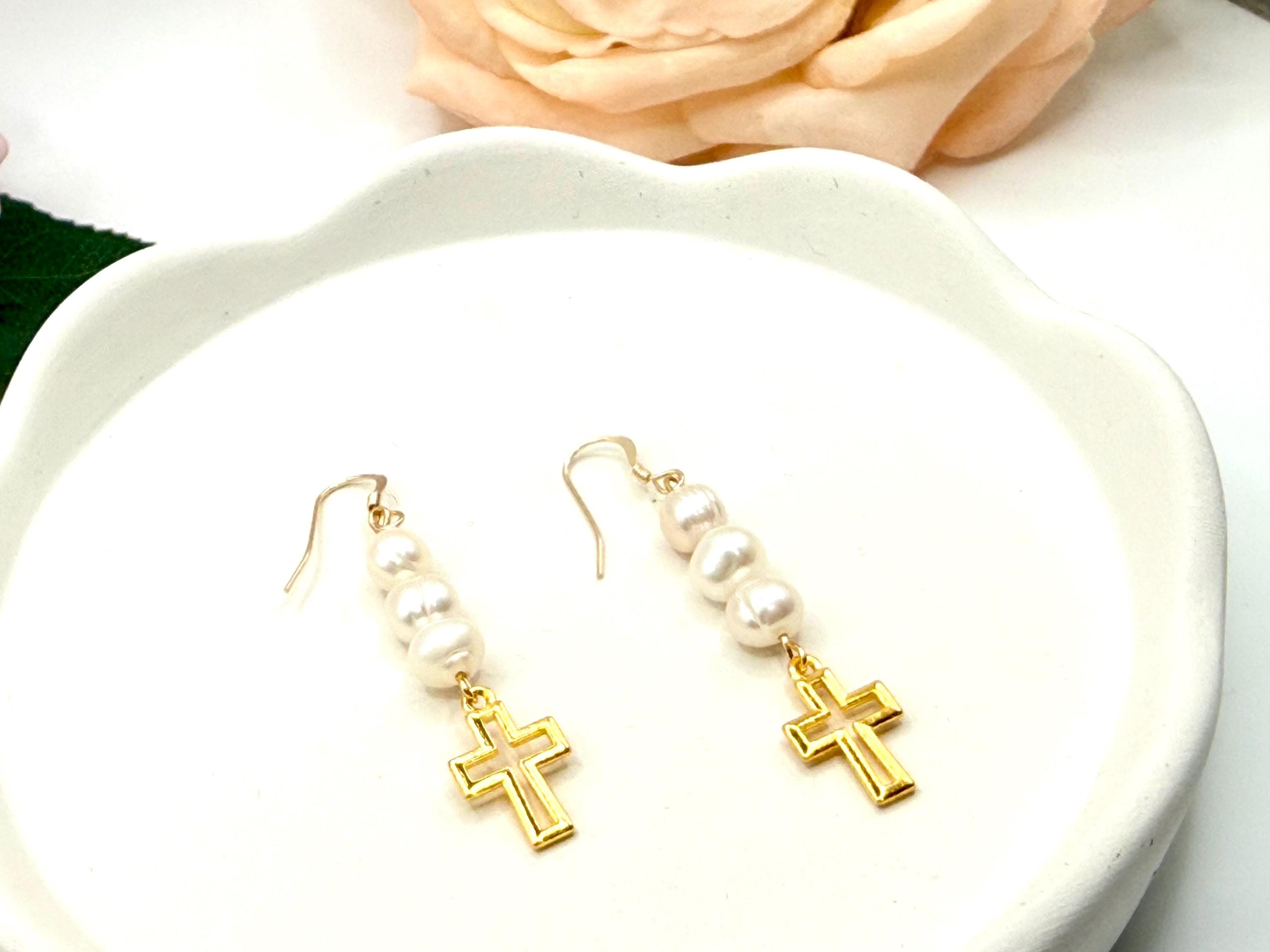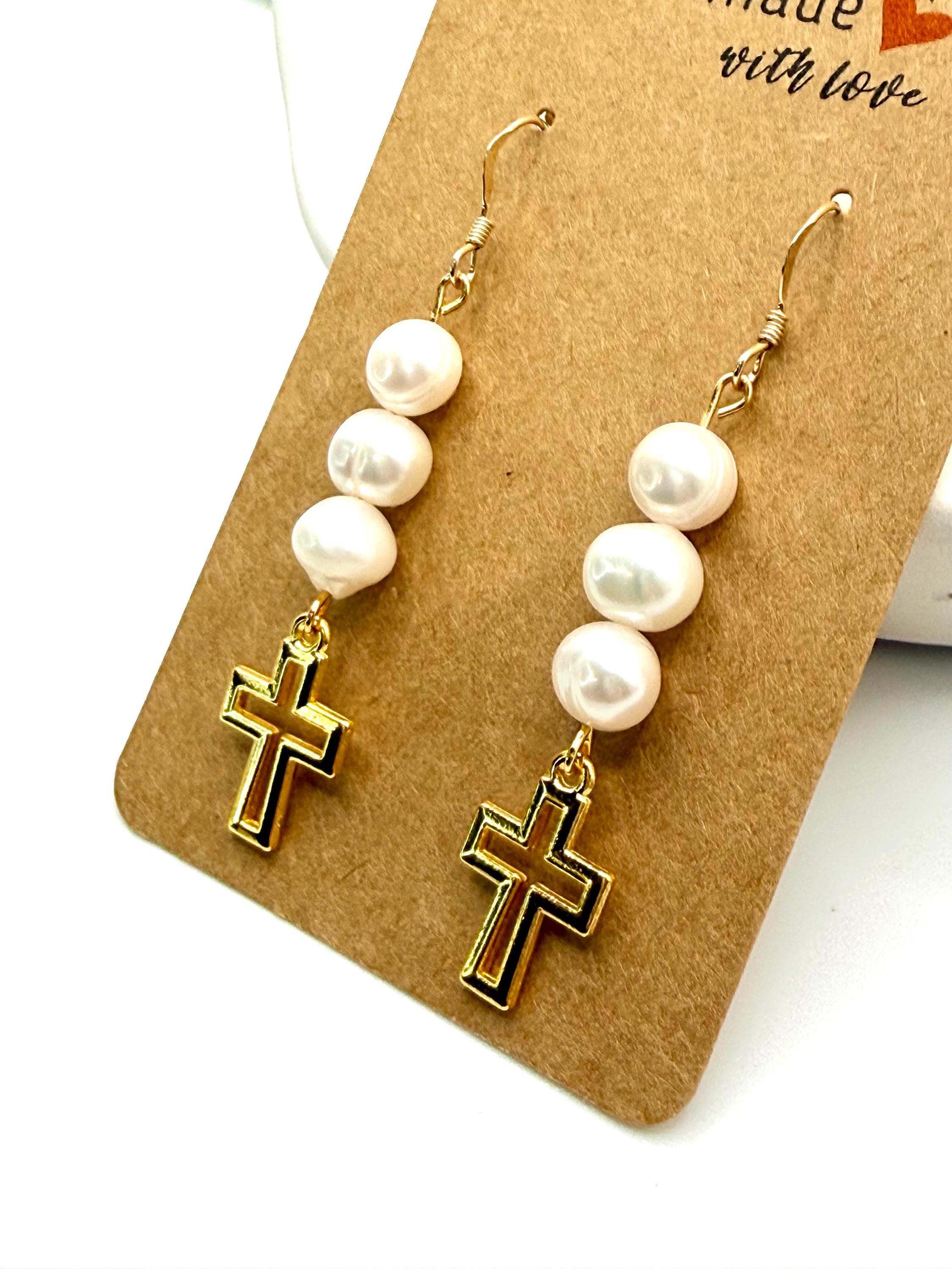 These gold filled hypoallergenic earrings feature authentic freshwater pearls paired with a delicate religious cross charm, creating a timeless design that beautifully blends faith, elegance, and everyday wearability.