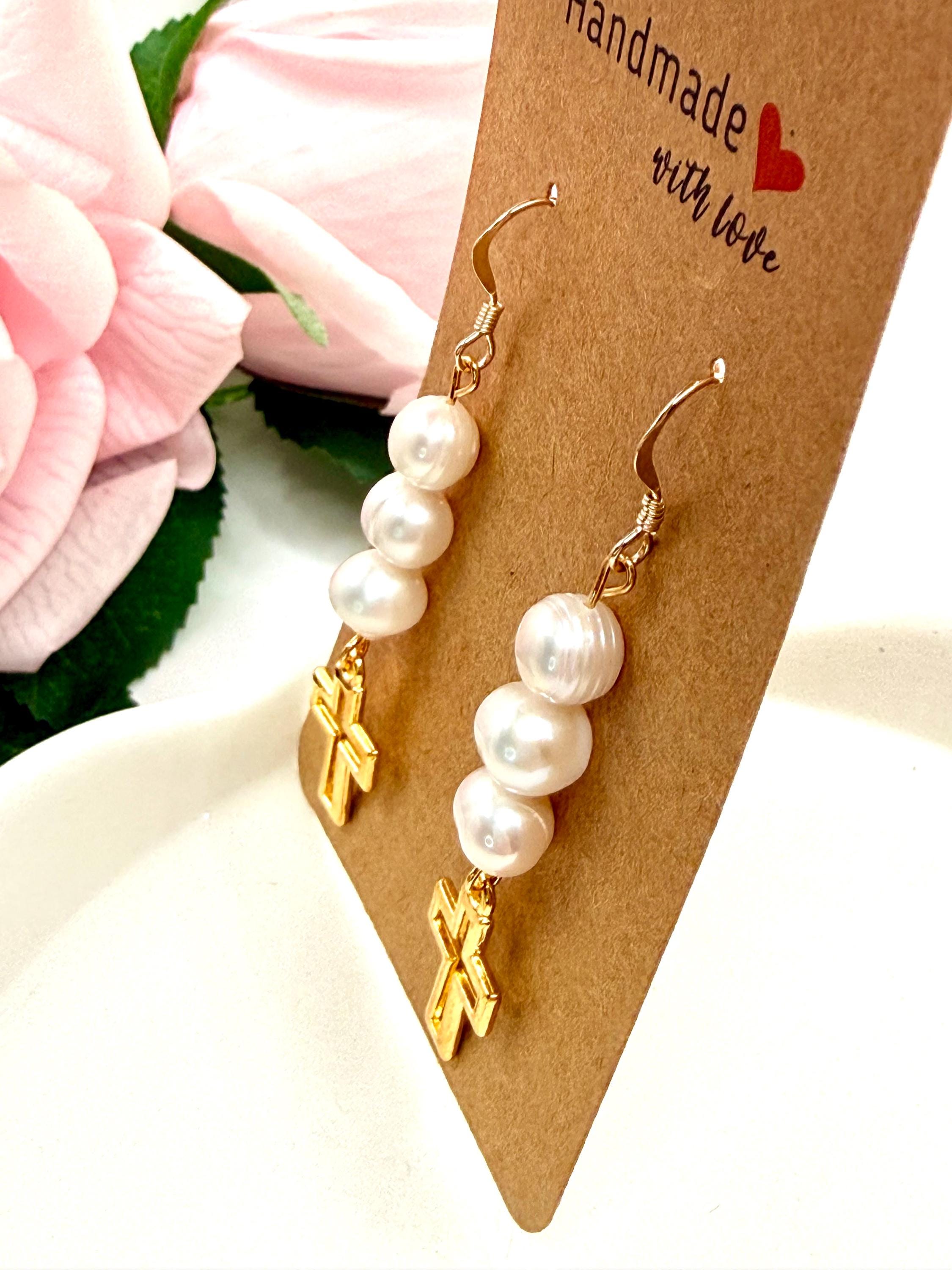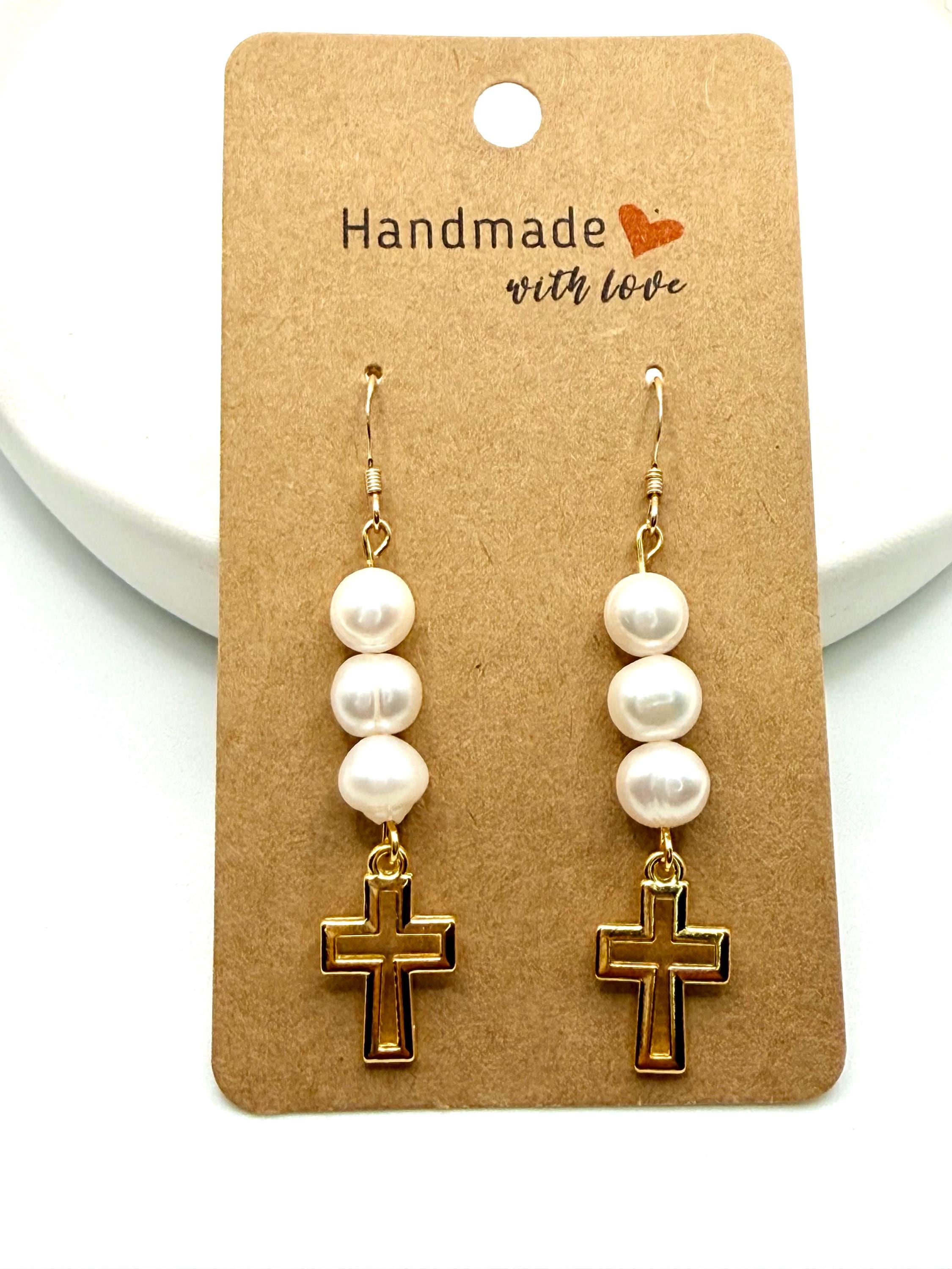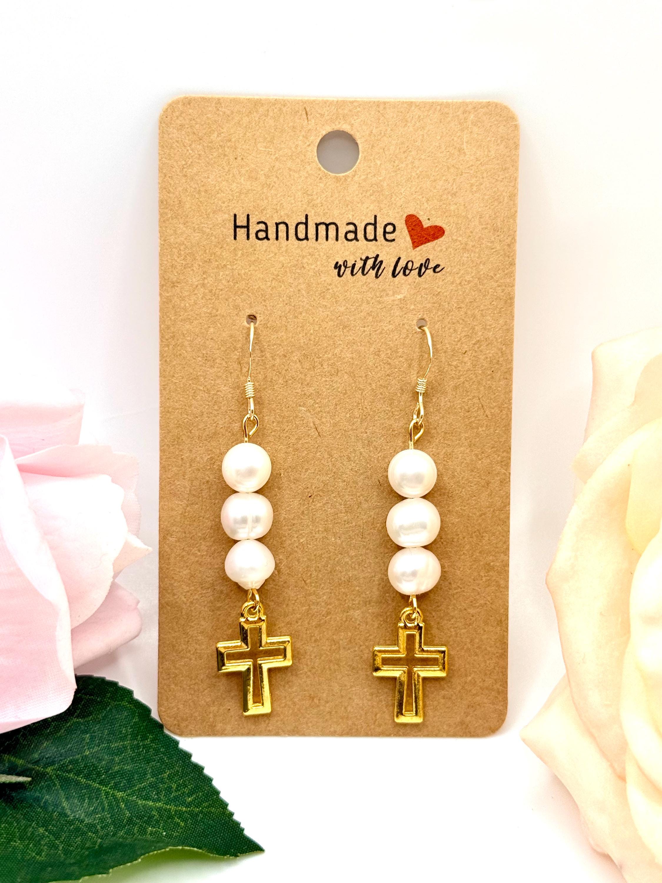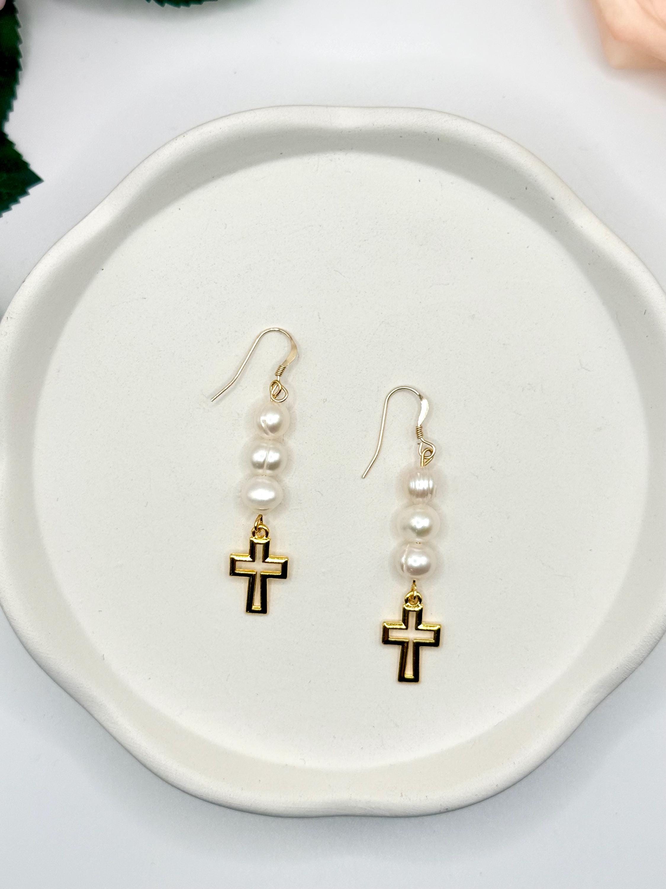 These gold filled hypoallergenic earrings feature authentic freshwater pearls paired with a delicate religious cross charm, creating a timeless design that beautifully blends faith, elegance, and everyday wearability.