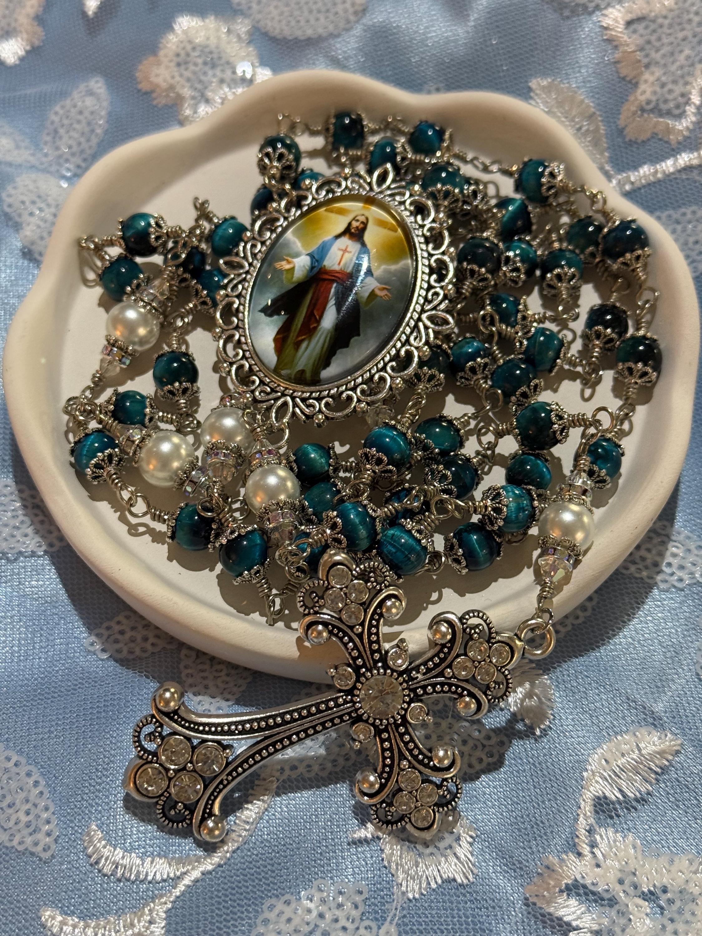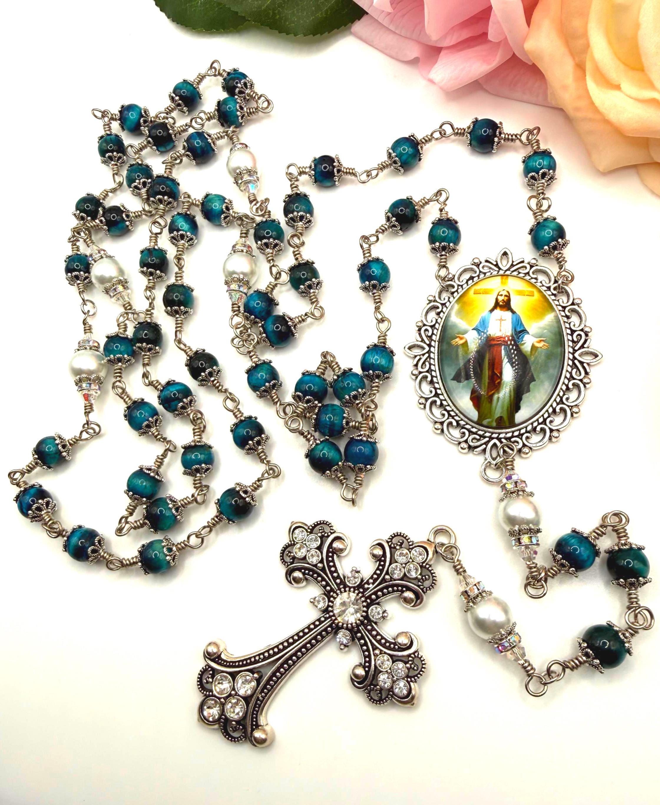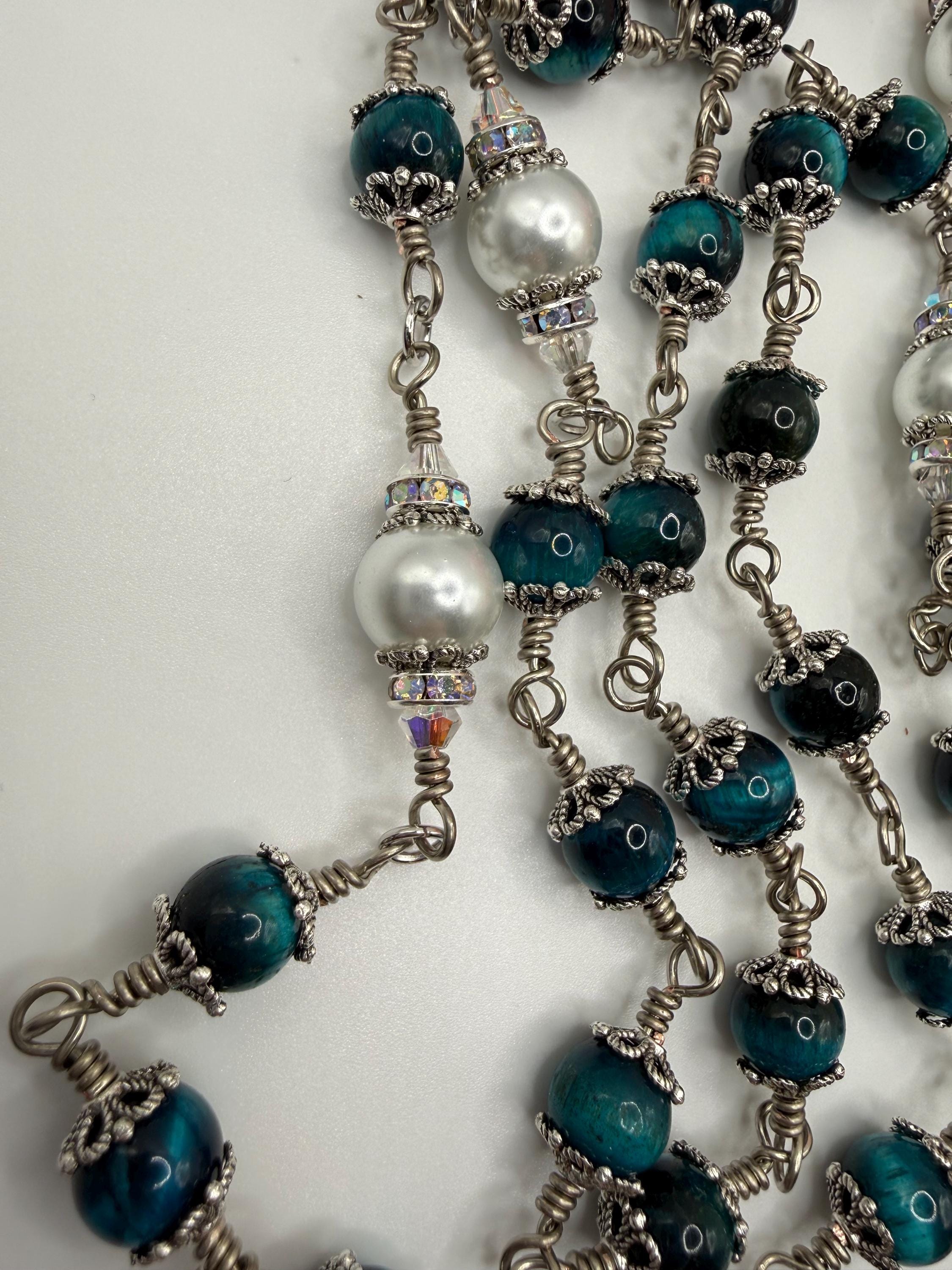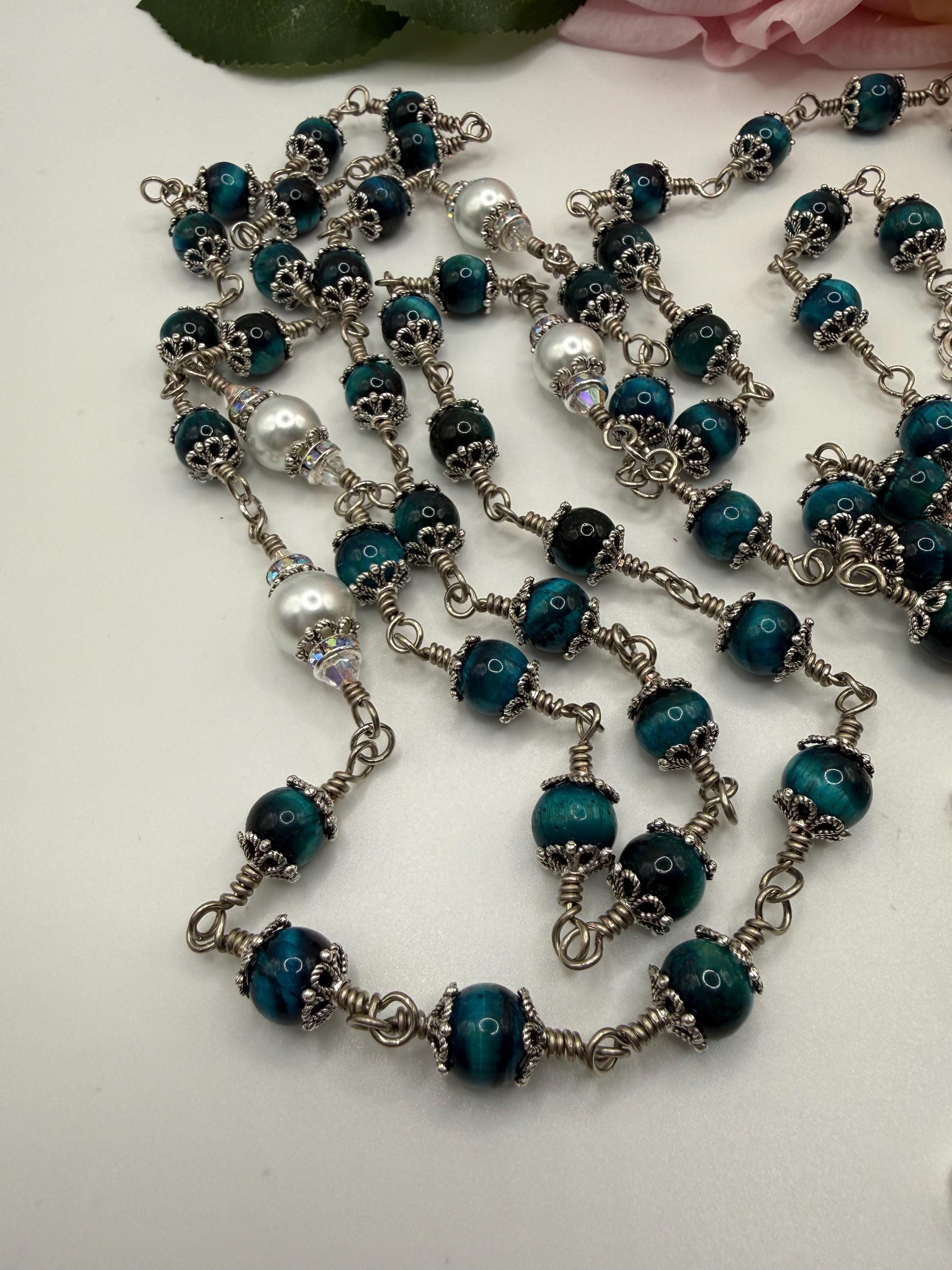 Discover the serene beauty of this elegant rosary, where each hand wrapped bead tells a story of devotion and craftsmanship. Featuring natural blue tiger’s eye stones with a mesmerizing blue sheen, this piece is designed as a meaningful Catholic prayer gift that resonates deeply with faith. The durable wire wrapped beads and antique silver accents create a timeless keepsake perfect for prayer or meditation.