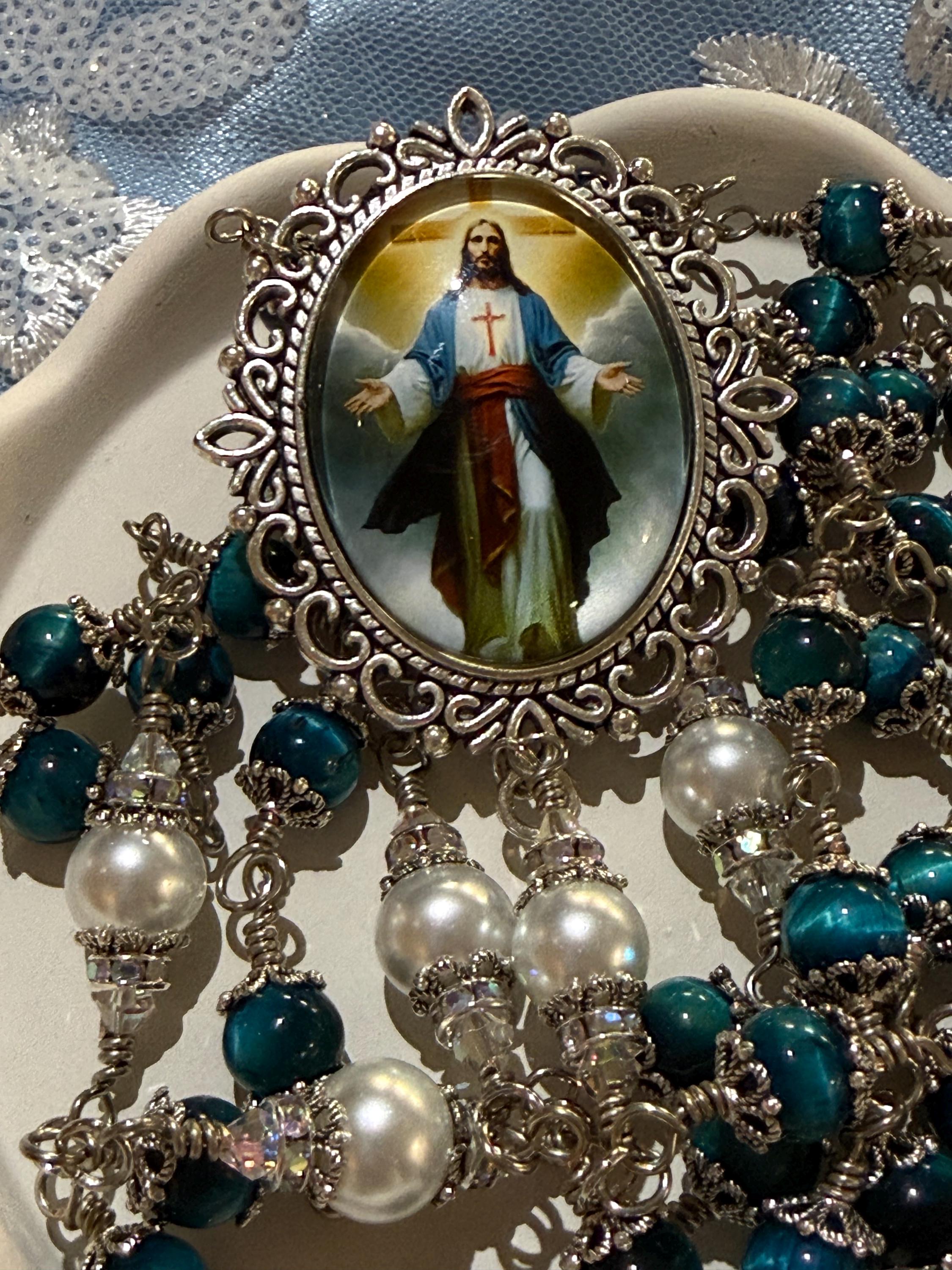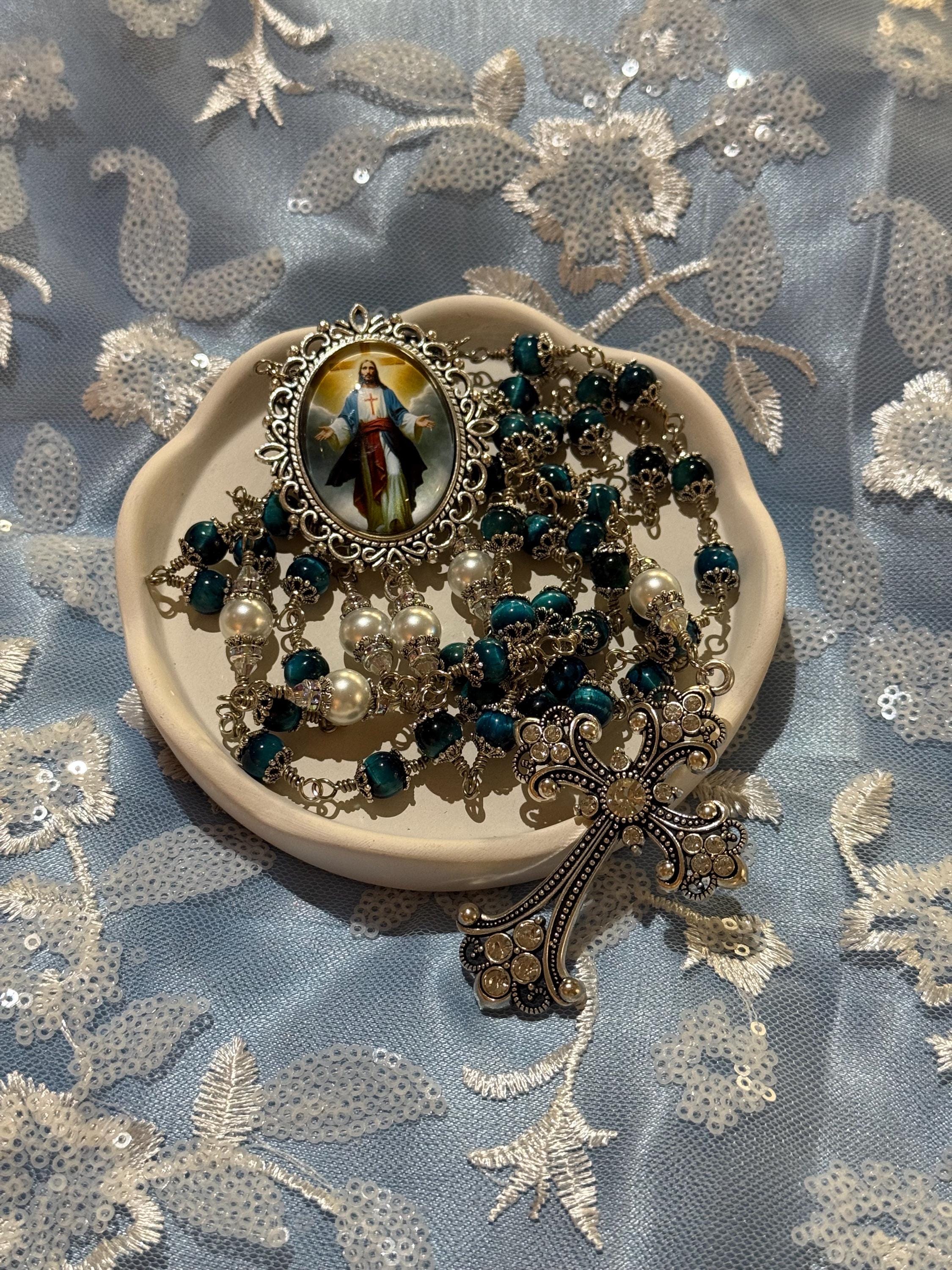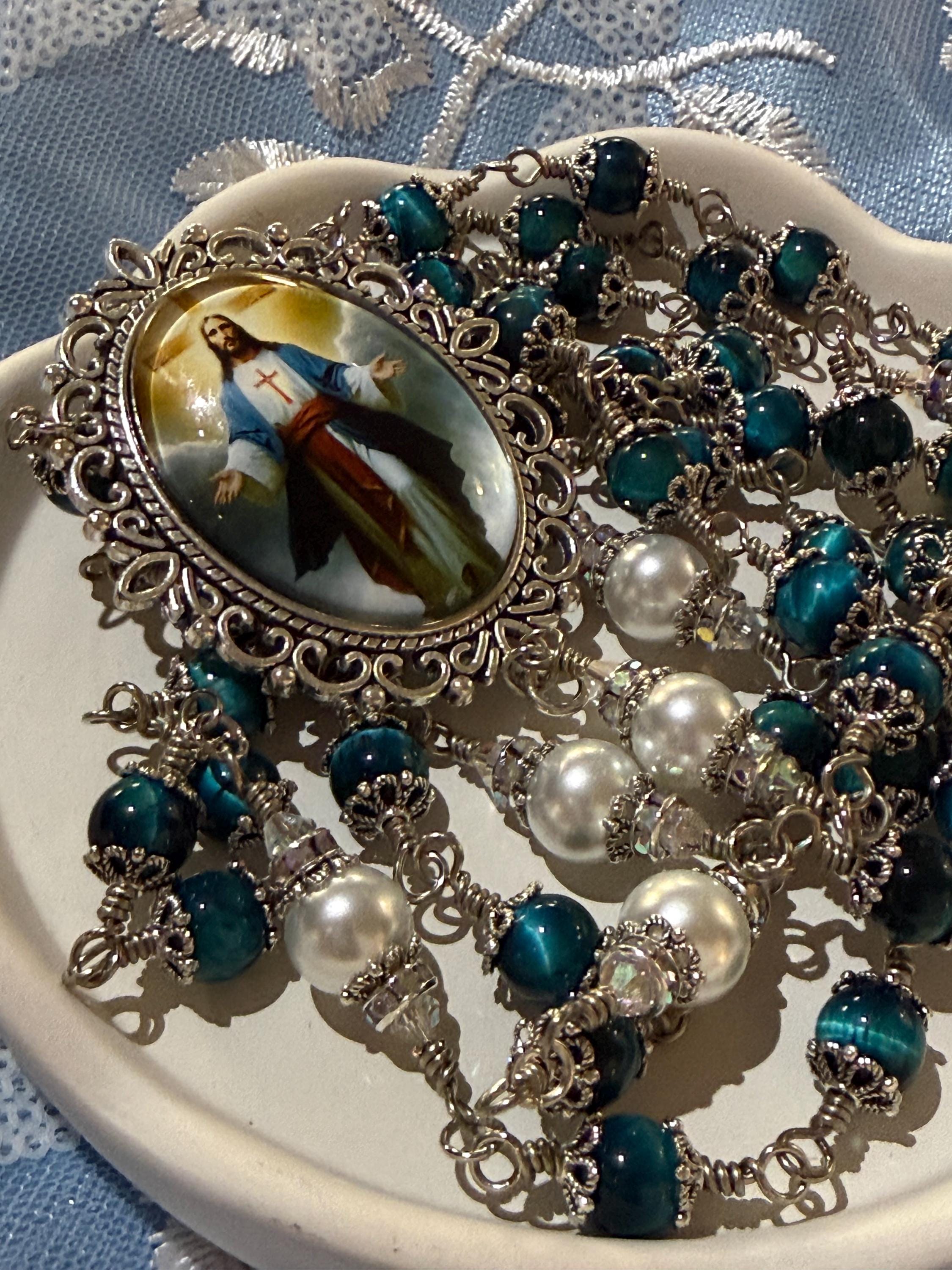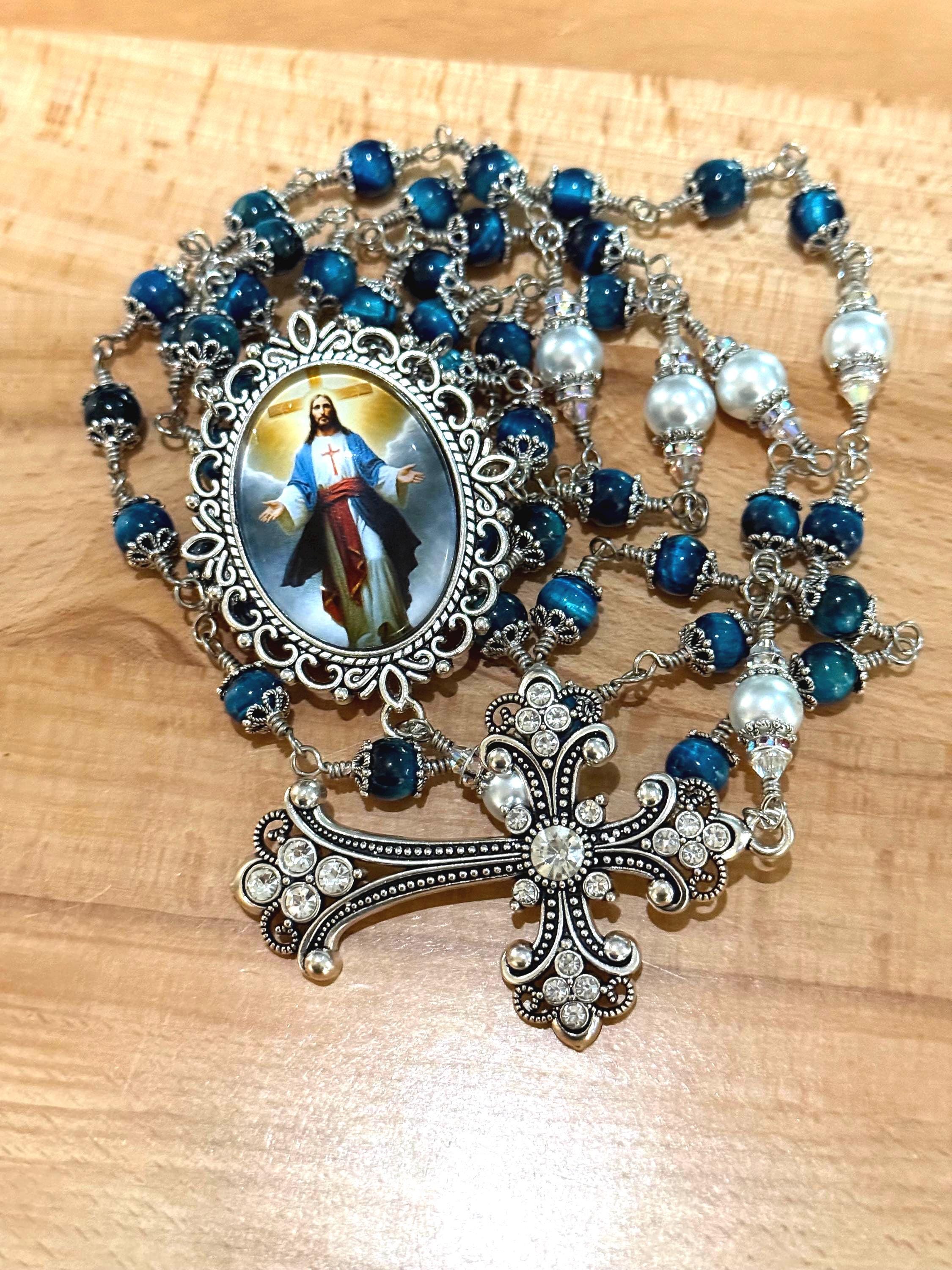 Discover the serene beauty of this elegant rosary, where each hand wrapped bead tells a story of devotion and craftsmanship. Featuring natural blue tiger’s eye stones with a mesmerizing blue sheen, this piece is designed as a meaningful Catholic prayer gift that resonates deeply with faith. The durable wire wrapped beads and antique silver accents create a timeless keepsake perfect for prayer or meditation.