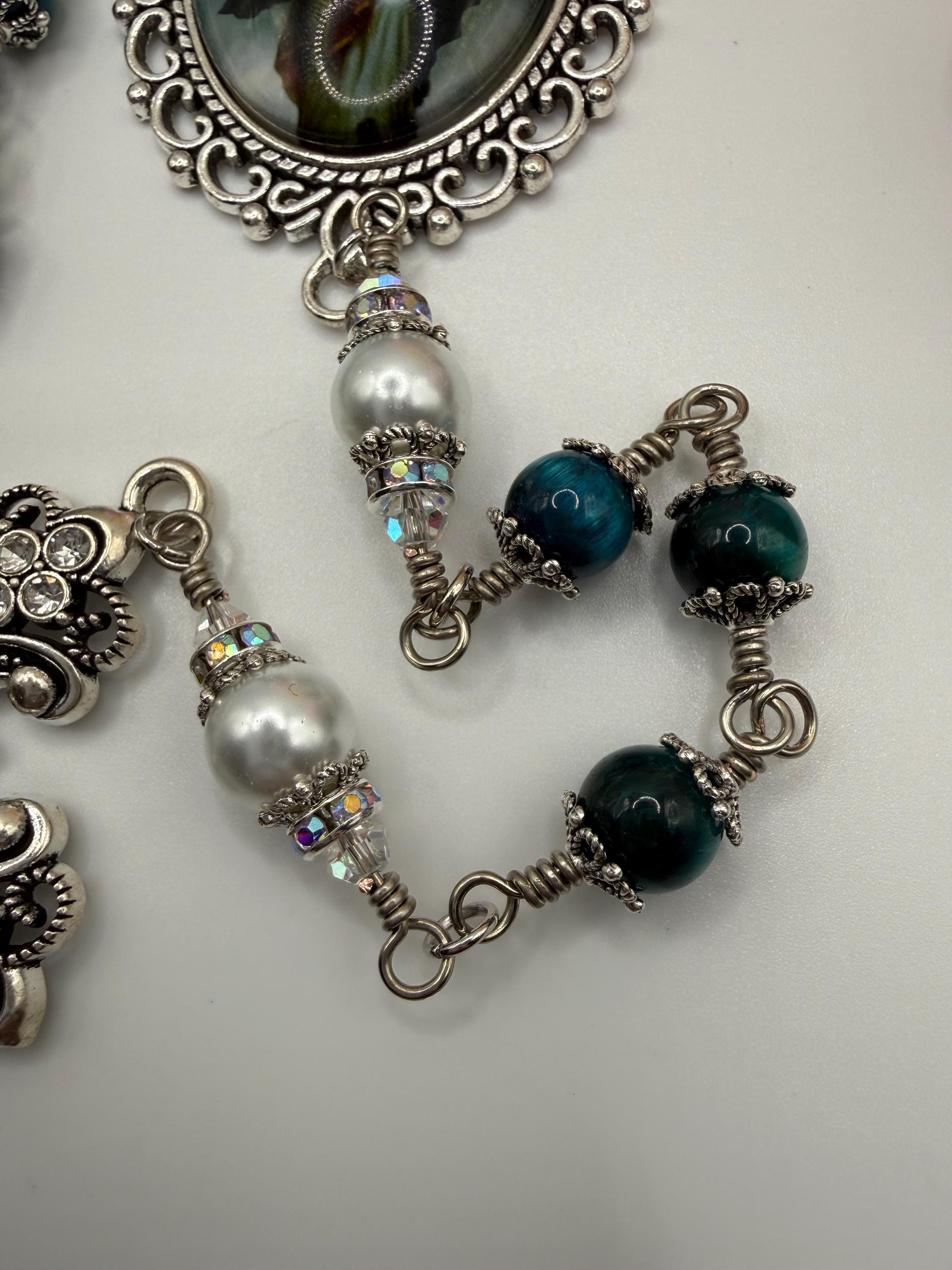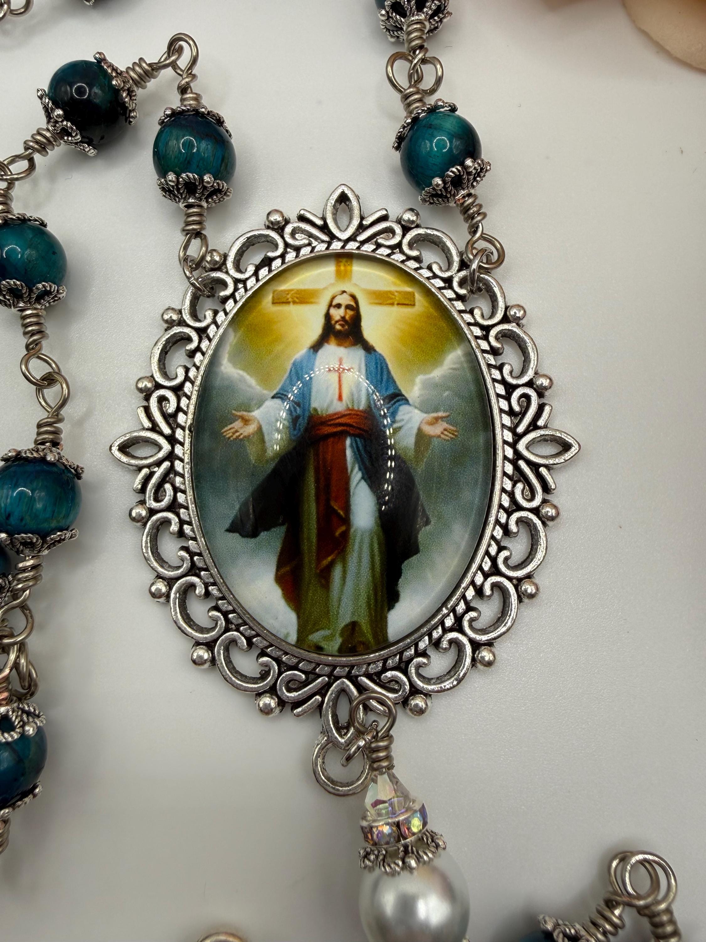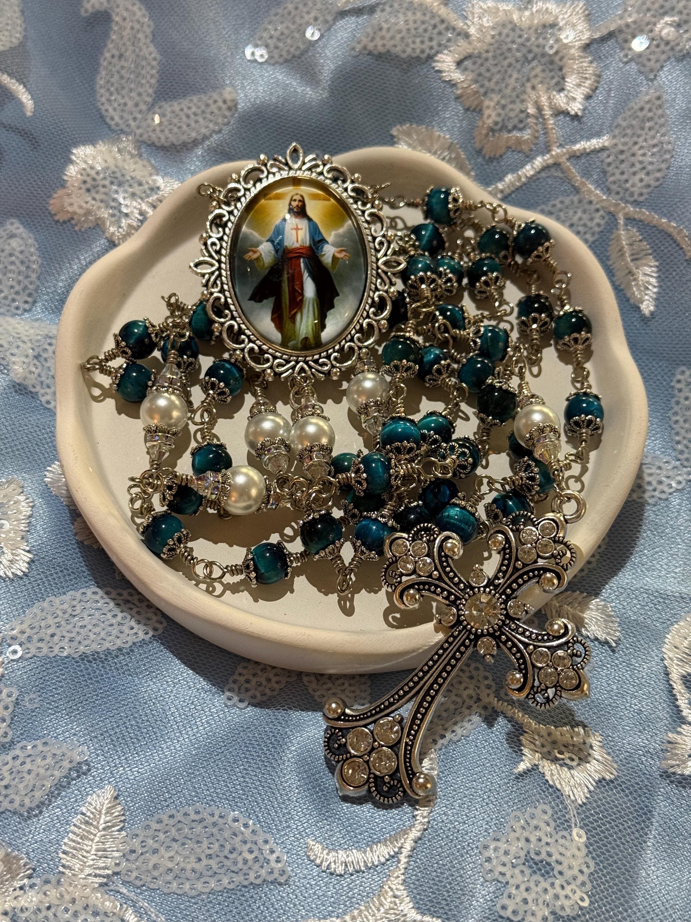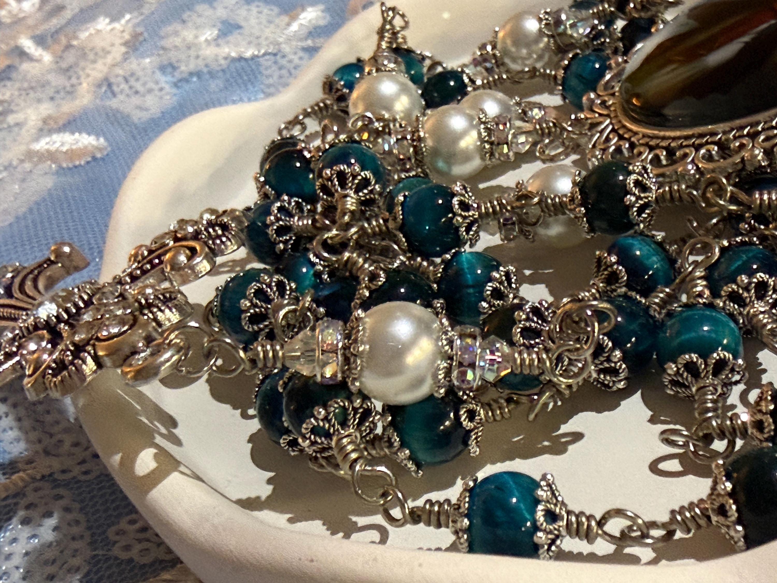 Discover the serene beauty of this elegant rosary, where each hand wrapped bead tells a story of devotion and craftsmanship. Featuring natural blue tiger’s eye stones with a mesmerizing blue sheen, this piece is designed as a meaningful Catholic prayer gift that resonates deeply with faith. The durable wire wrapped beads and antique silver accents create a timeless keepsake perfect for prayer or meditation.