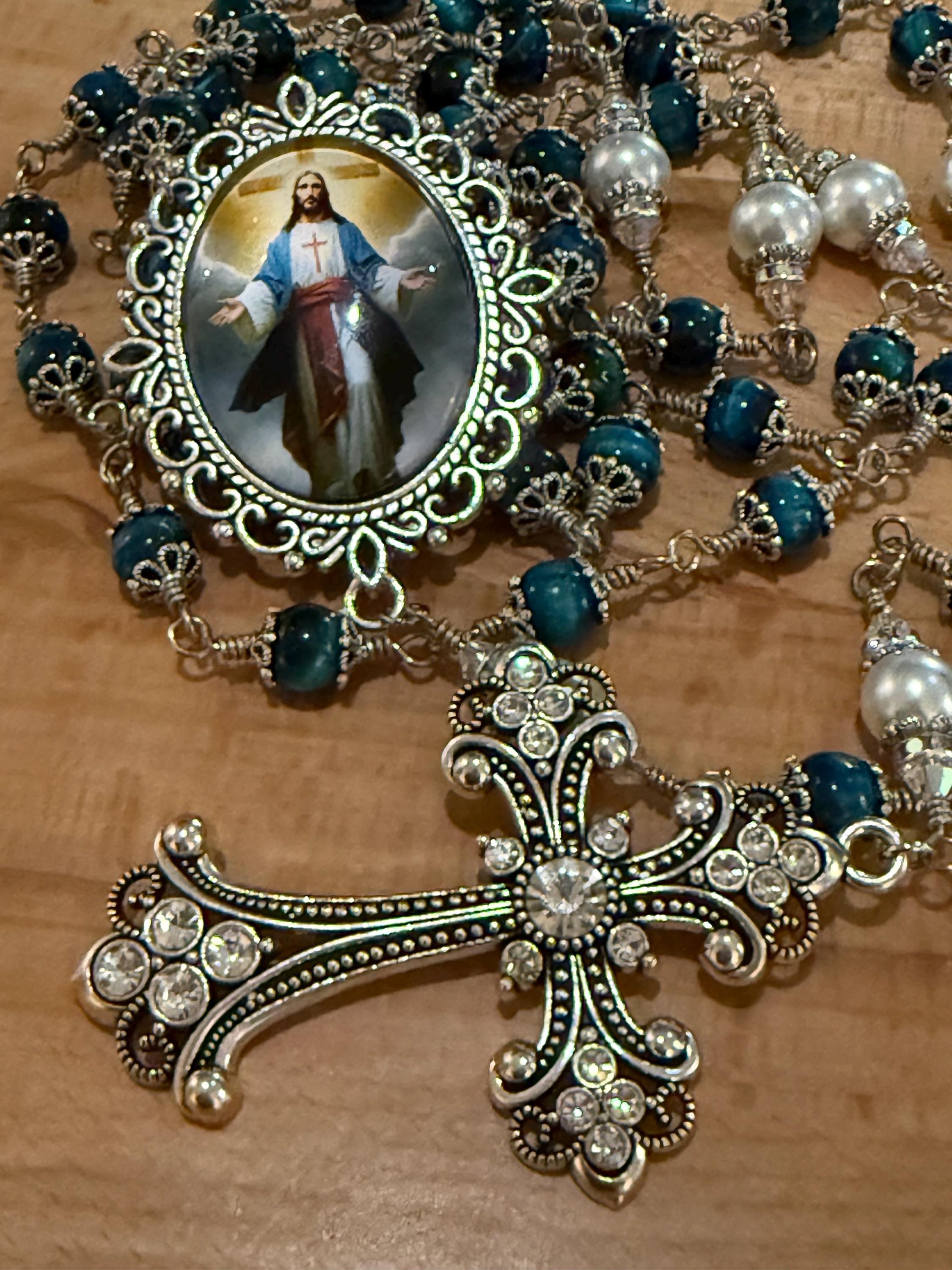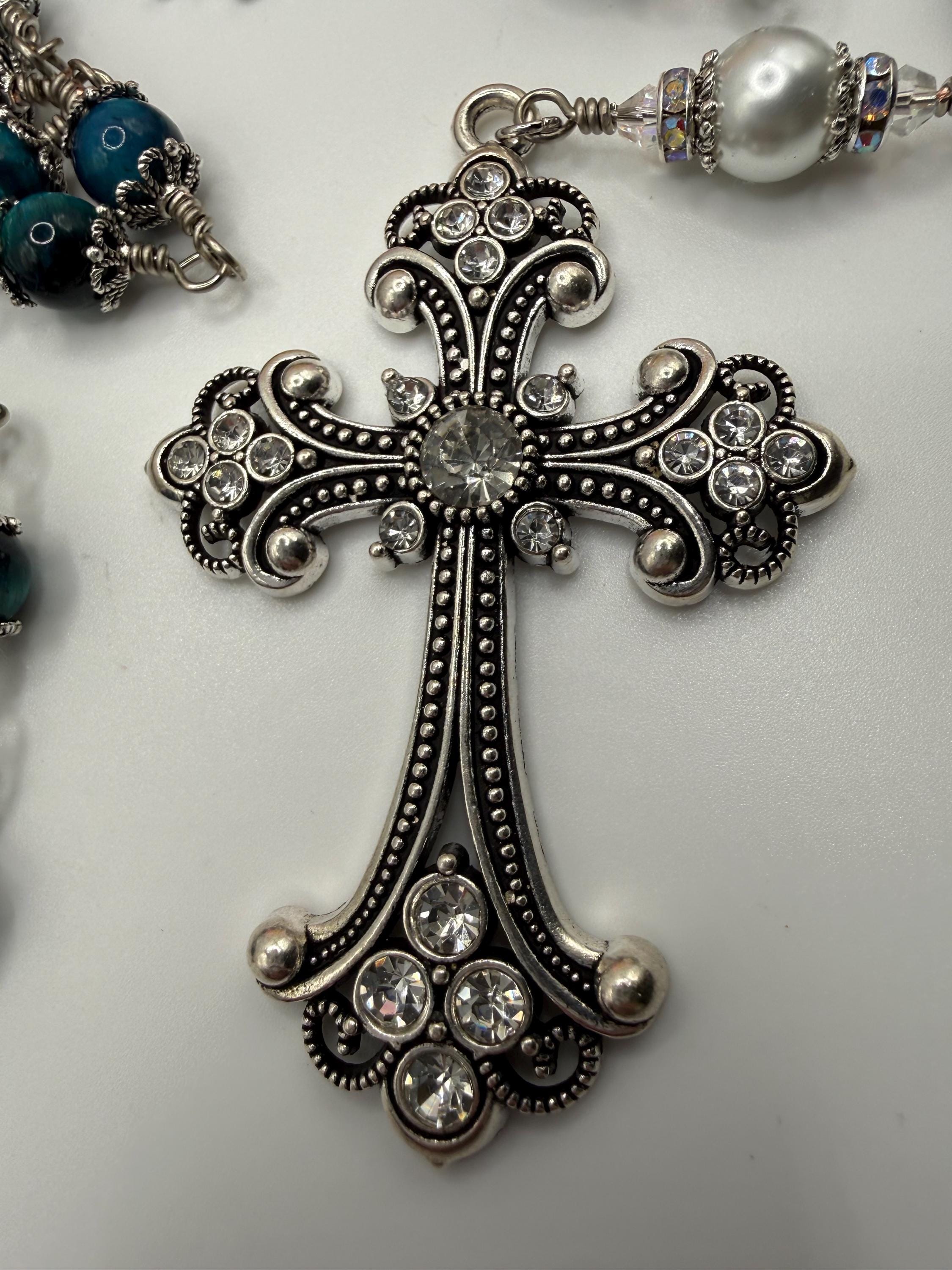 - Large rhinestone crucifix paired with a glass Jesus center as a reverent focal point