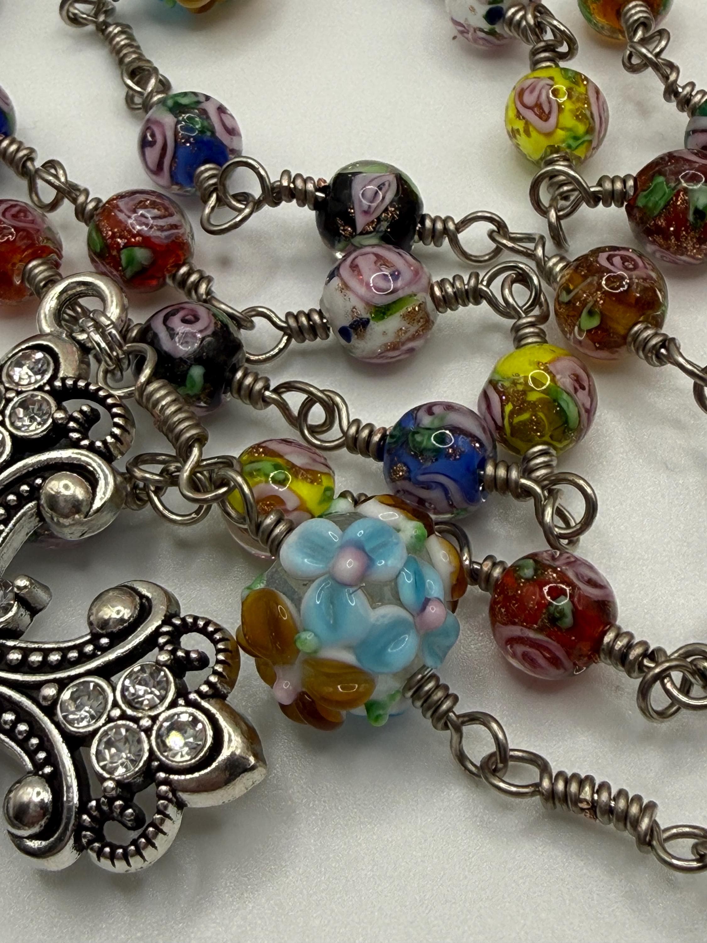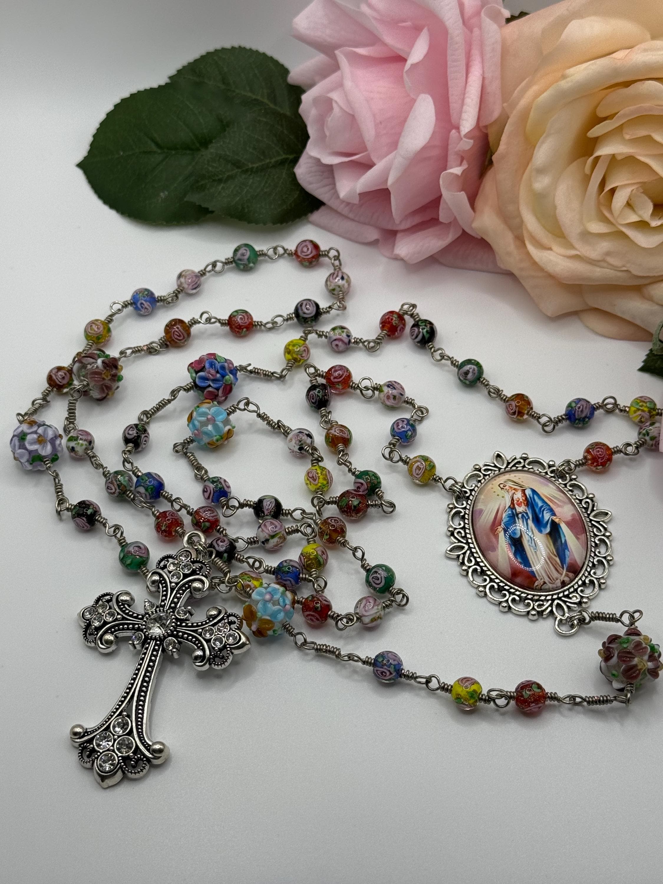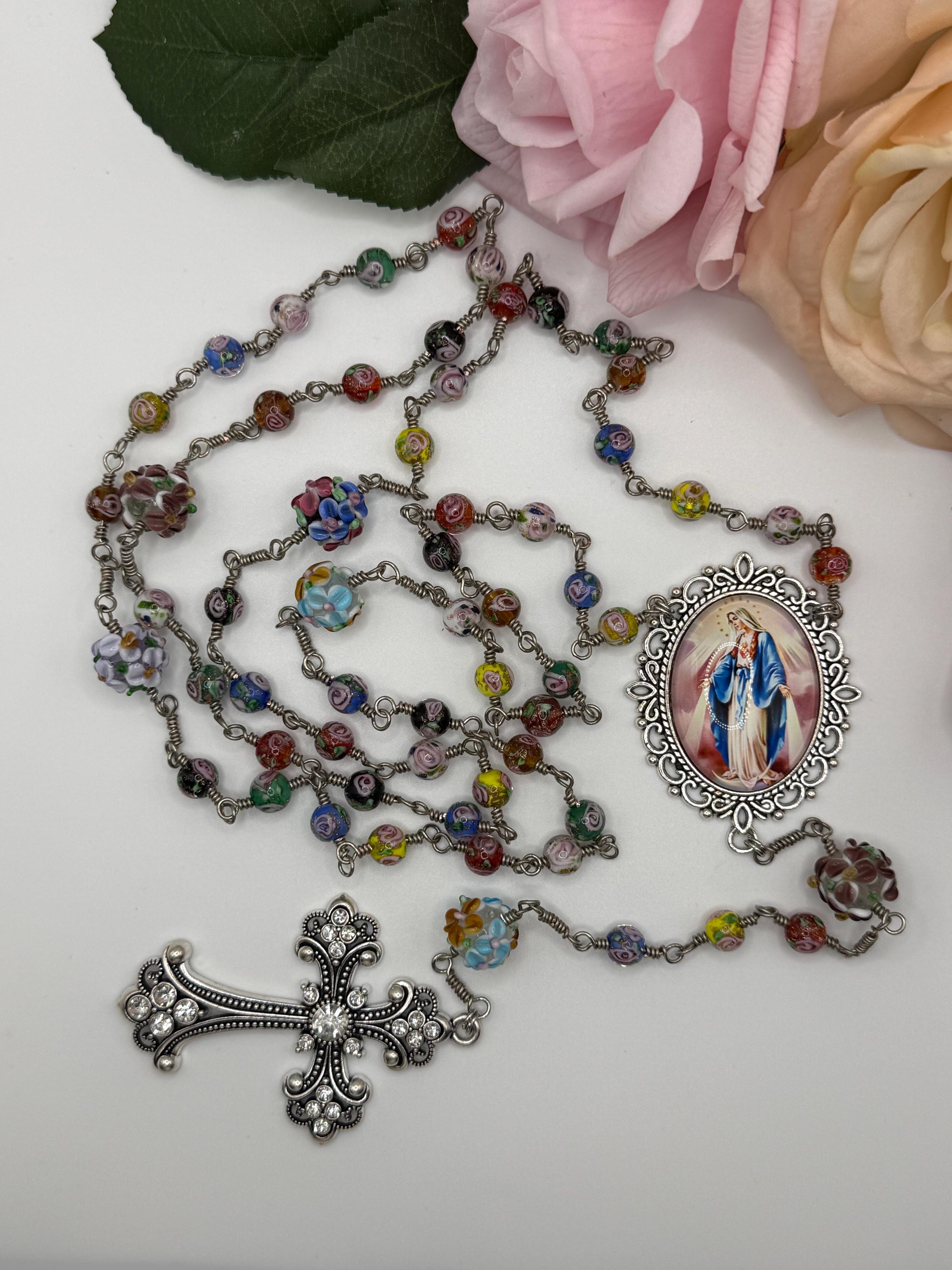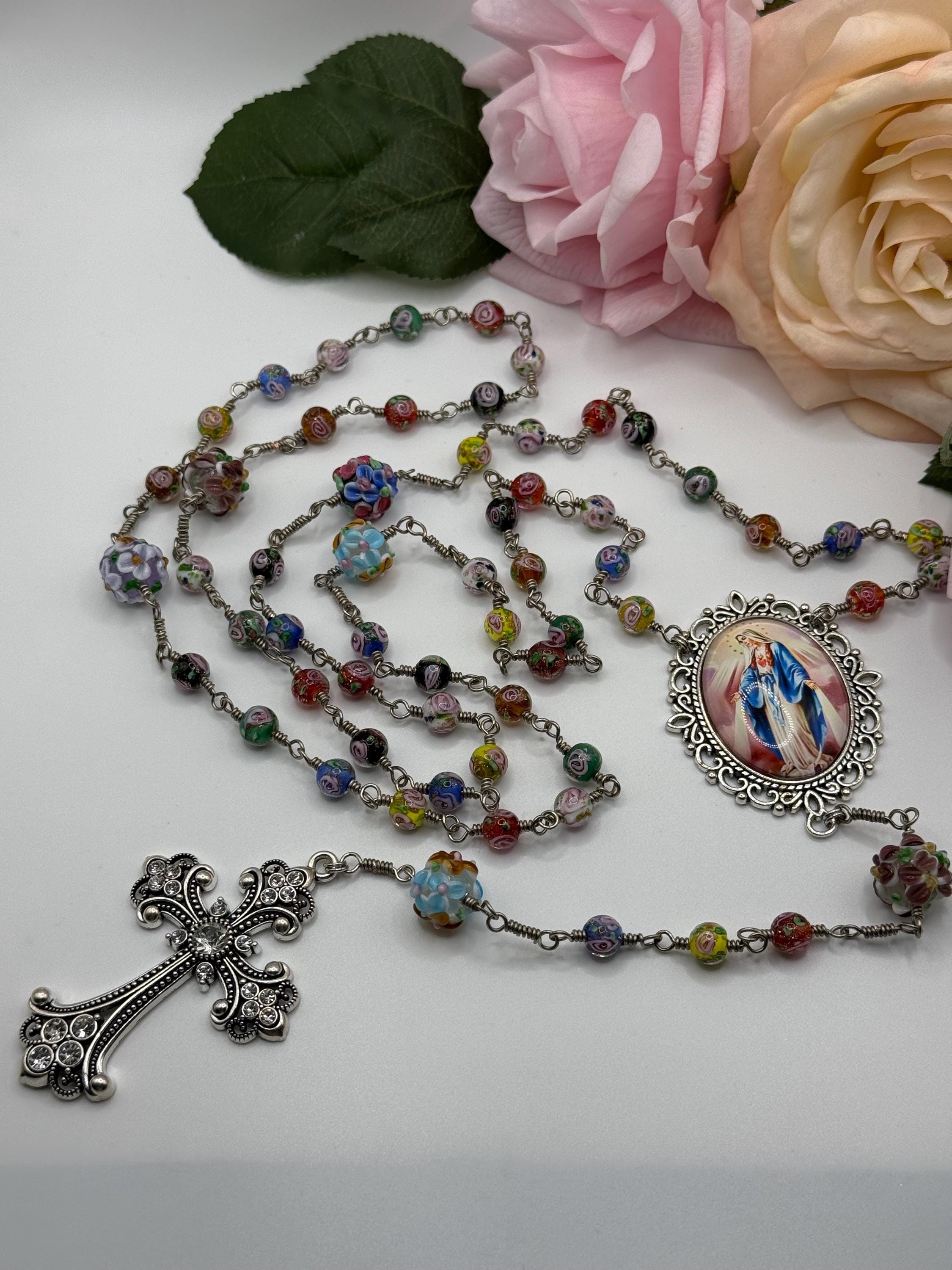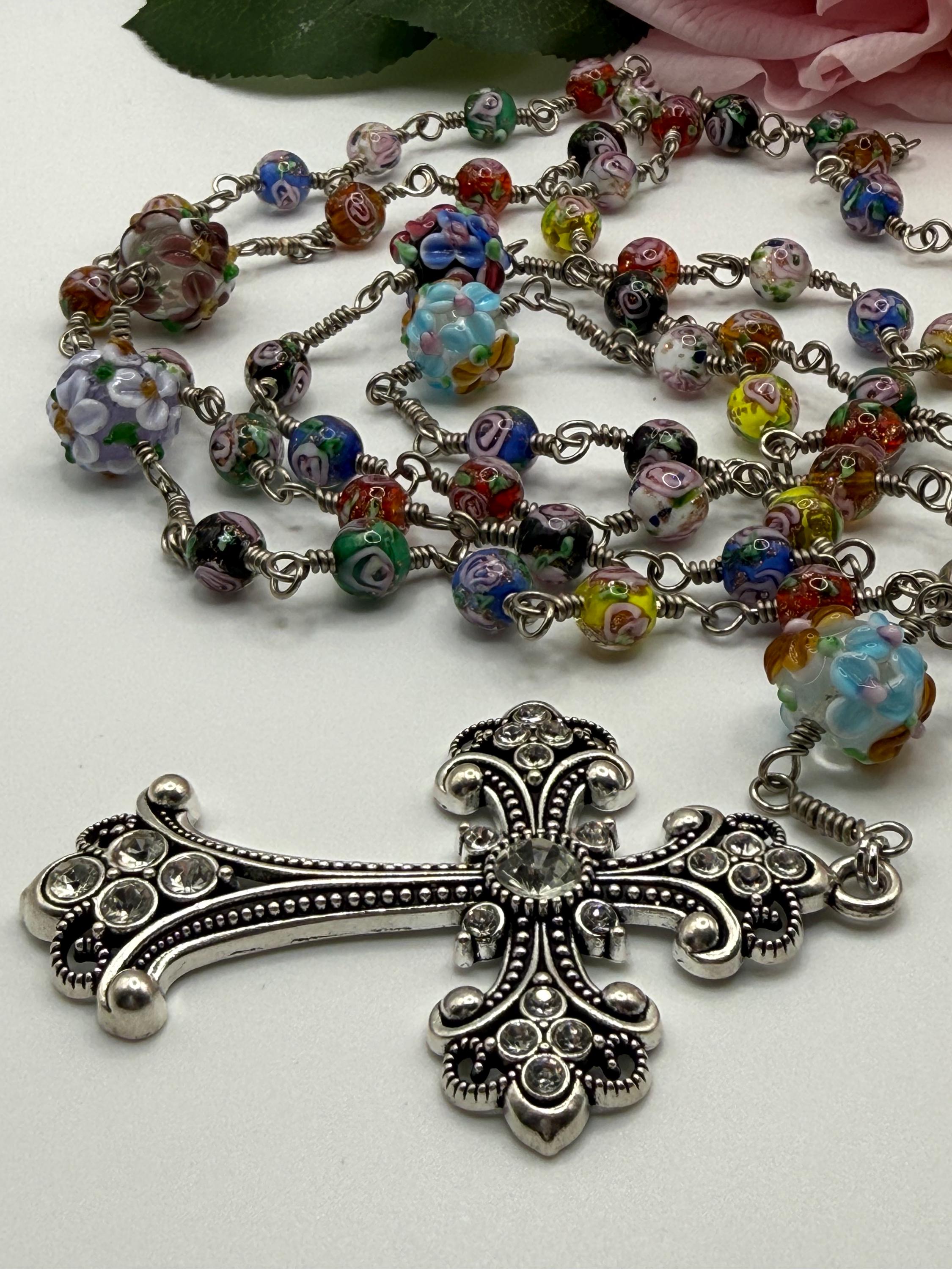 Experience the vibrant artistry of this wire wrapped rosary, meticulously crafted with artisan Murano beads that bring a burst of color and tradition to your prayer time. Each large floral bead is hand-wrapped in antique silver wire, creating a bold Catholic rosary that stands out with elegance and devotion. The sparkling rhinestone cross adds a radiant touch, making this rosary a meaningful gift for First Communion or personal reflection.