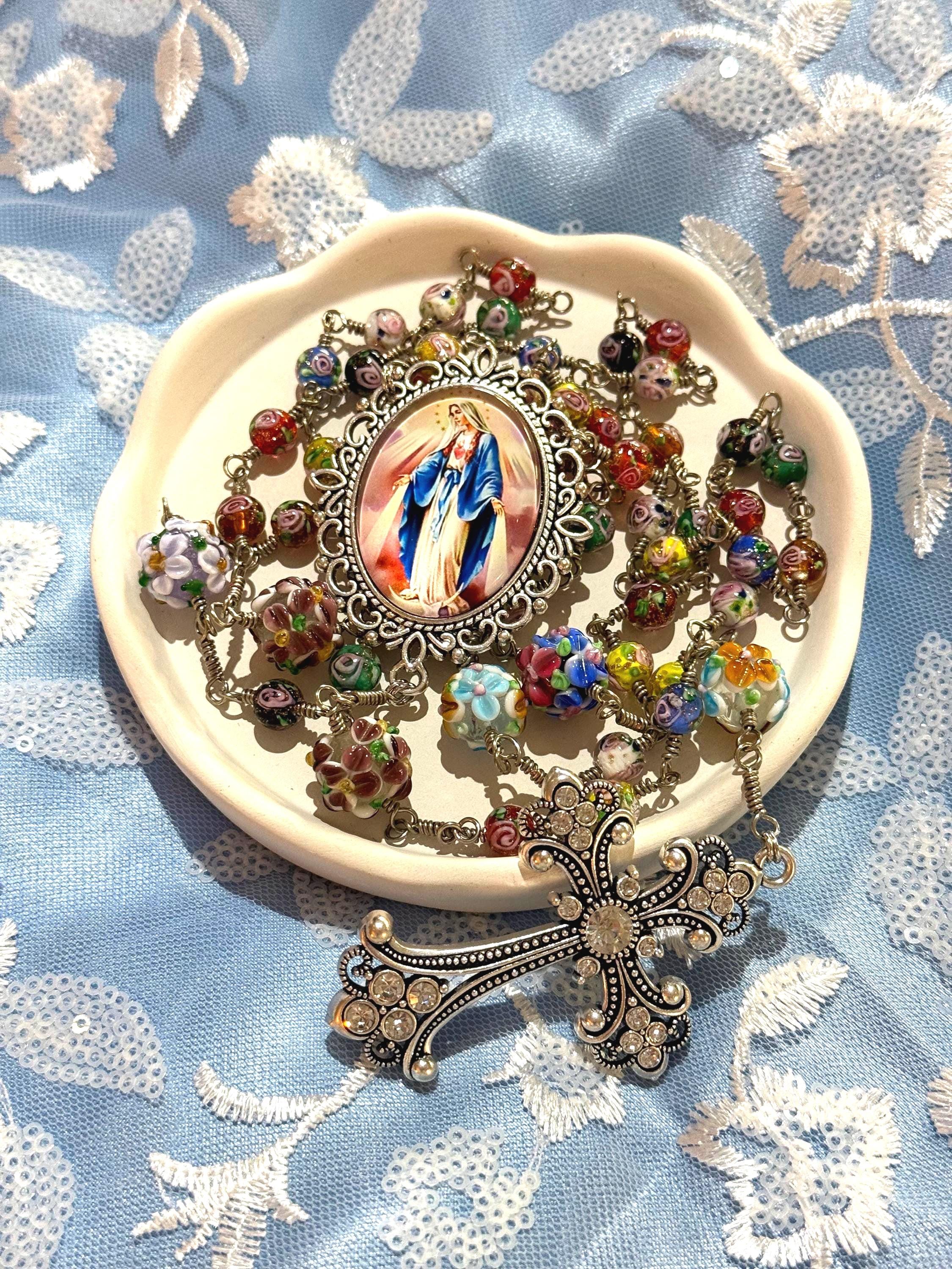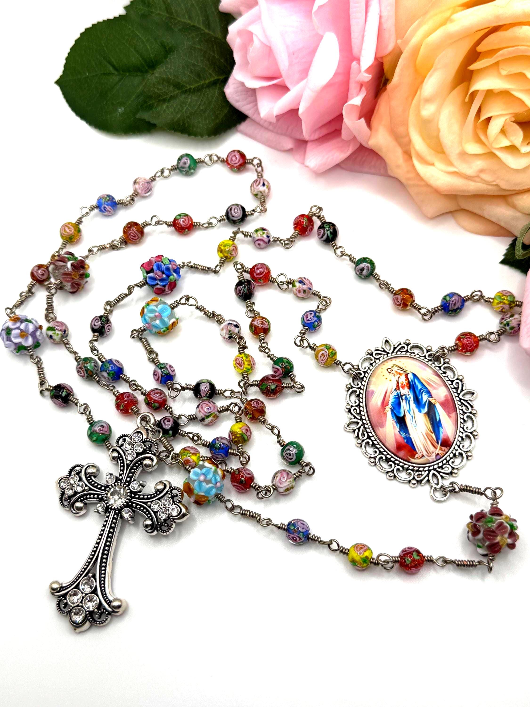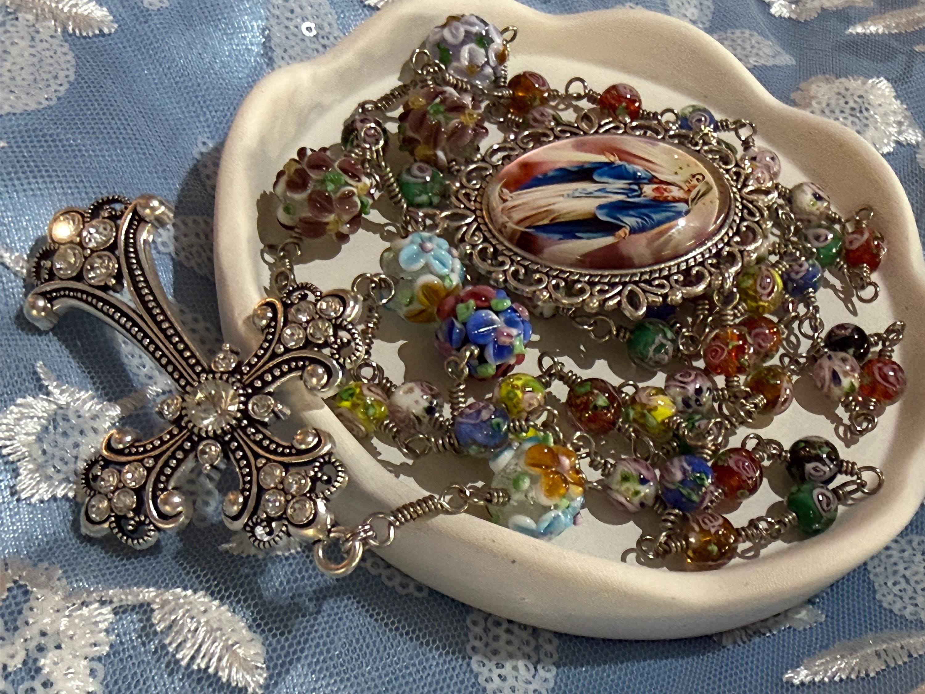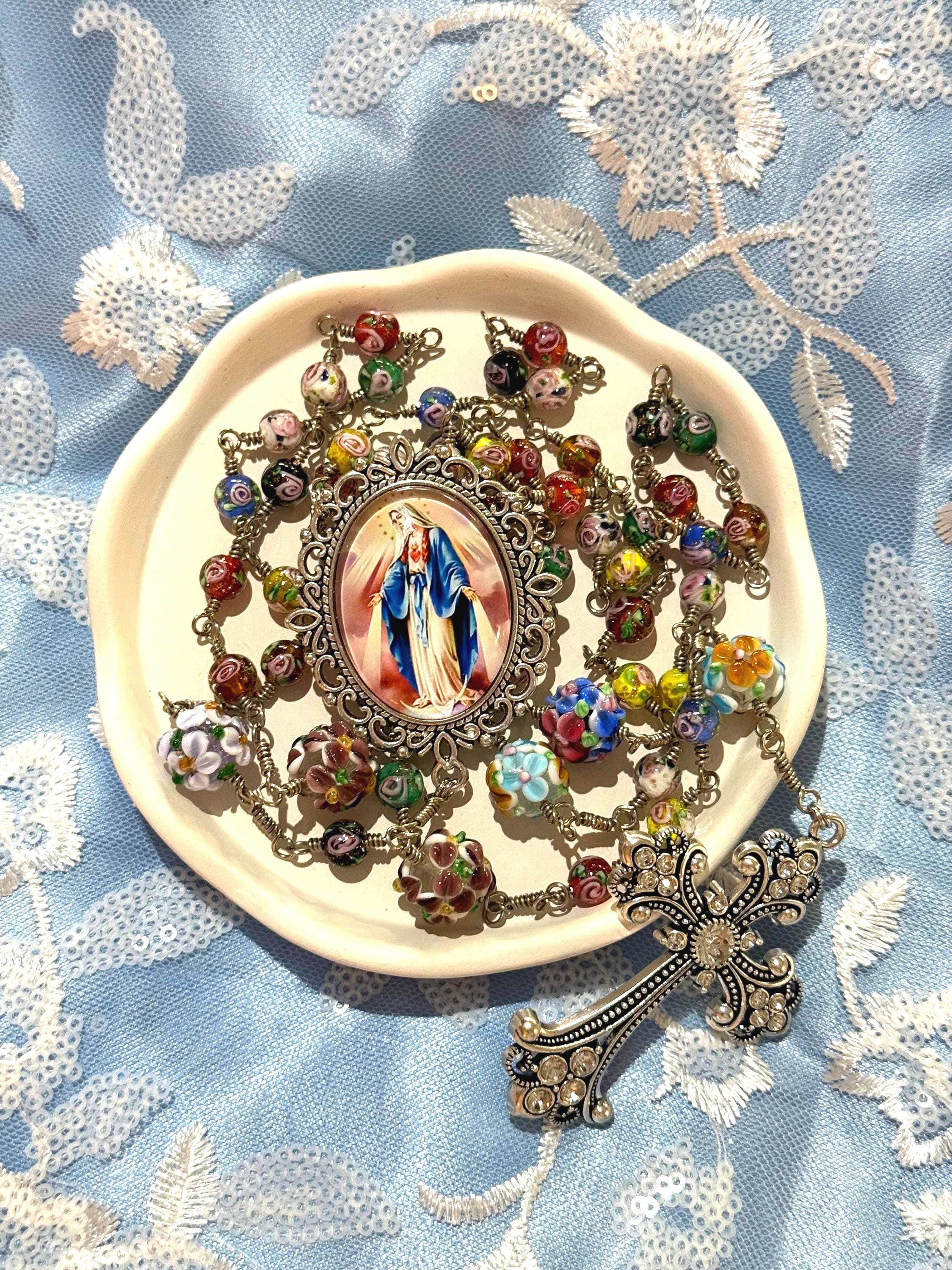 Experience the vibrant artistry of this wire wrapped rosary, meticulously crafted with artisan Murano beads that bring a burst of color and tradition to your prayer time. Each large floral bead is hand-wrapped in antique silver wire, creating a bold Catholic rosary that stands out with elegance and devotion. The sparkling rhinestone cross adds a radiant touch, making this rosary a meaningful gift for First Communion or personal reflection.