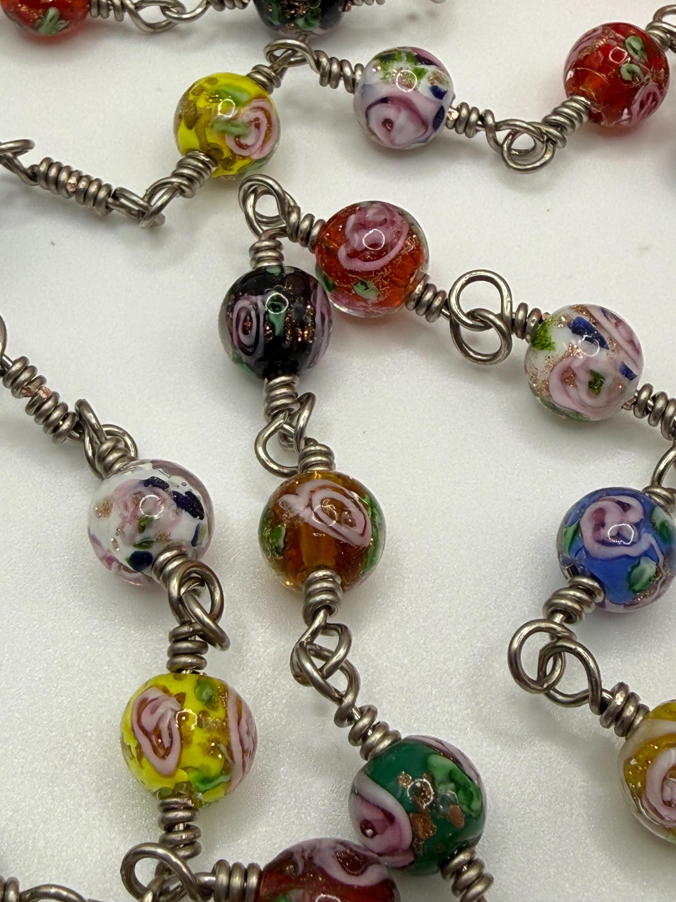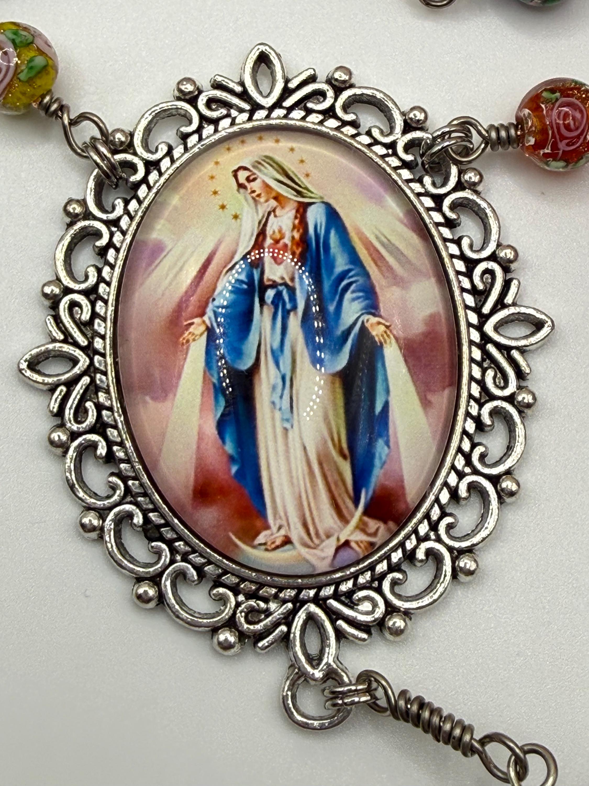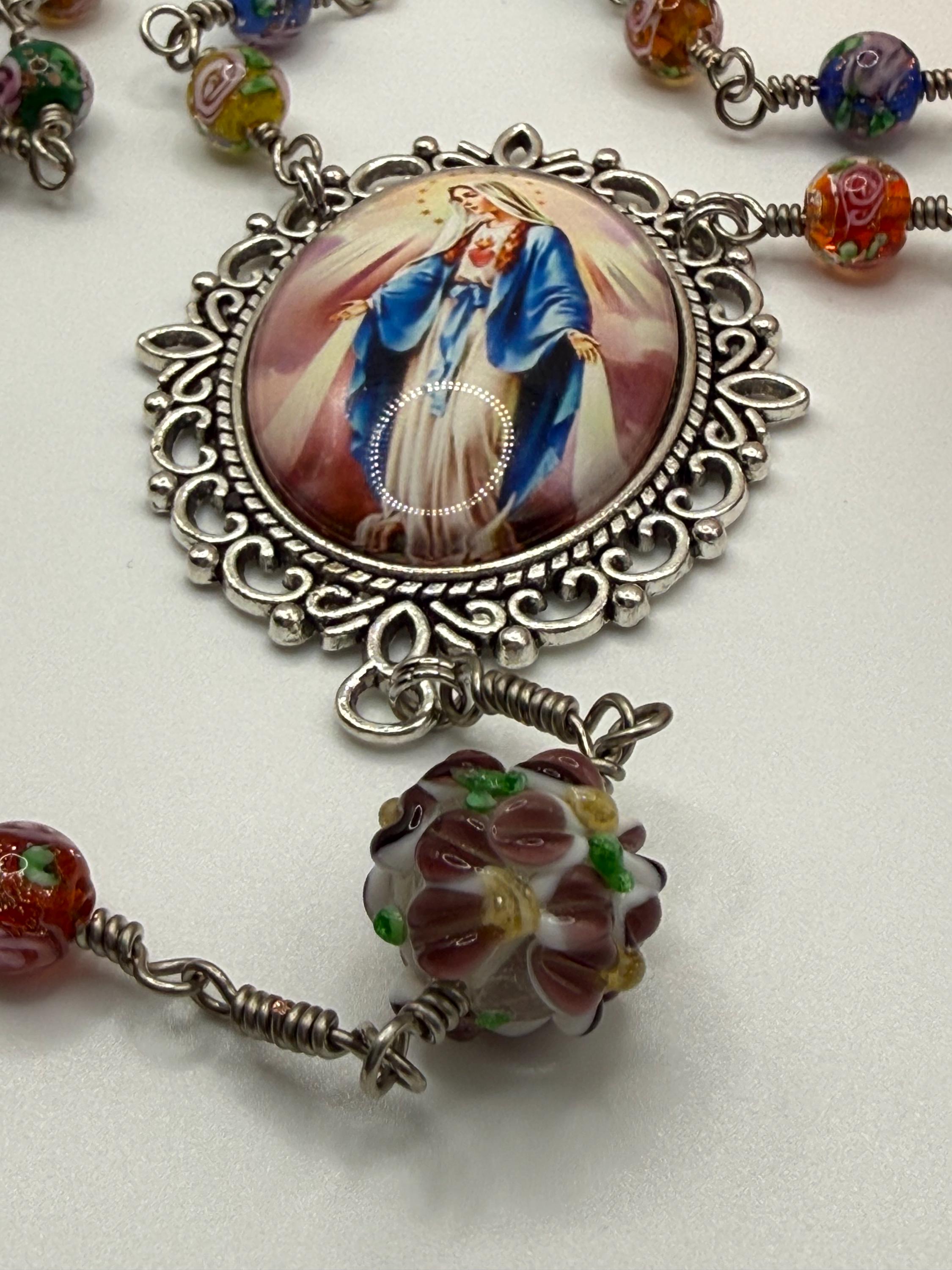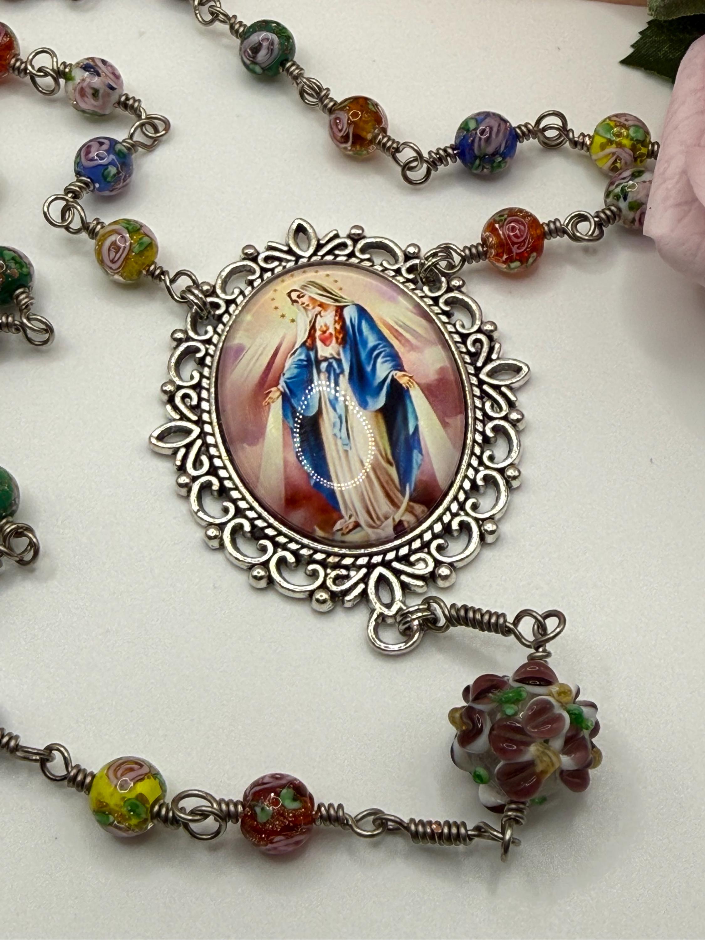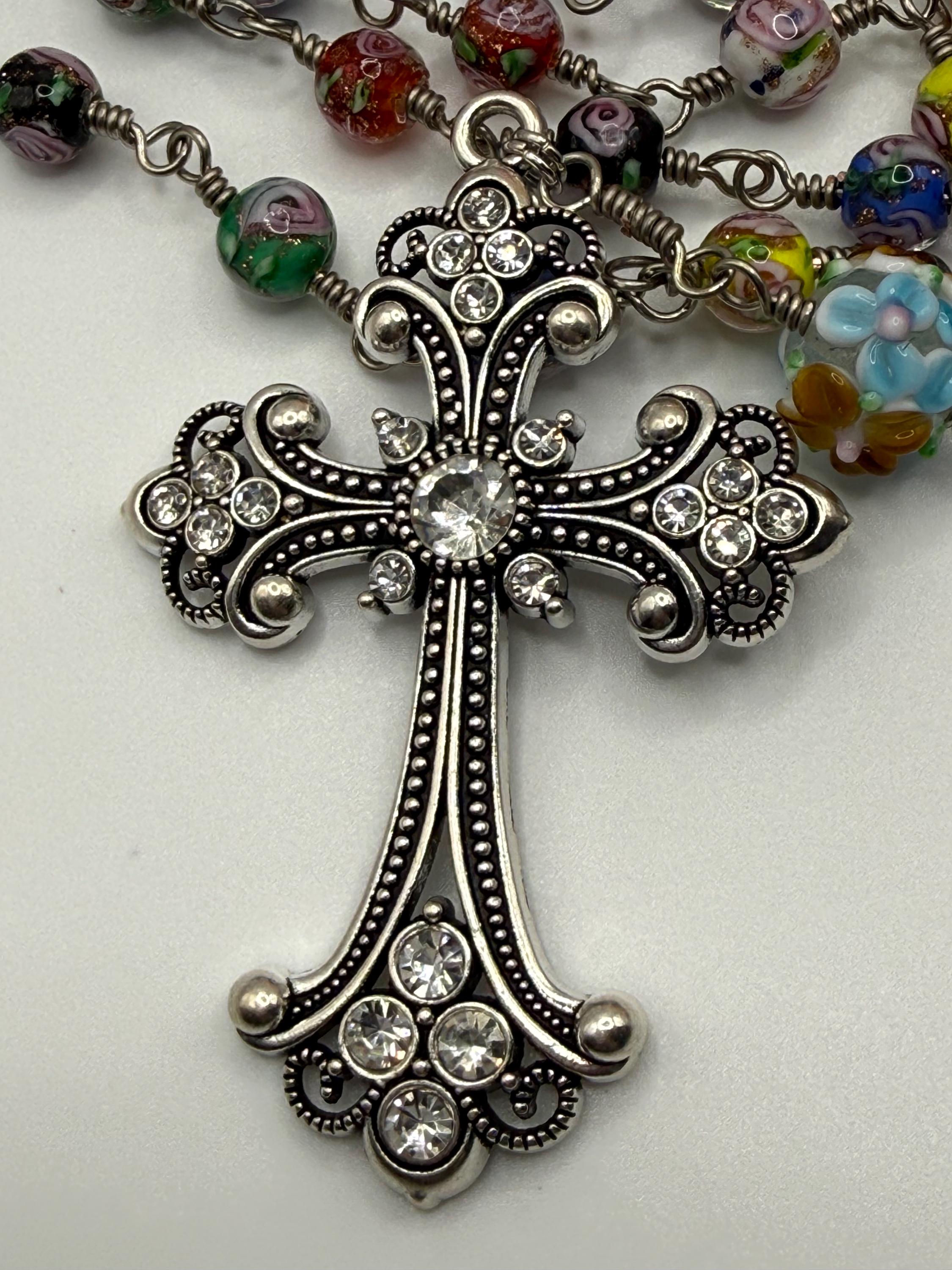 Experience the vibrant artistry of this wire wrapped rosary, meticulously crafted with artisan Murano beads that bring a burst of color and tradition to your prayer time. Each large floral bead is hand-wrapped in antique silver wire, creating a bold Catholic rosary that stands out with elegance and devotion. The sparkling rhinestone cross adds a radiant touch, making this rosary a meaningful gift for First Communion or personal reflection.