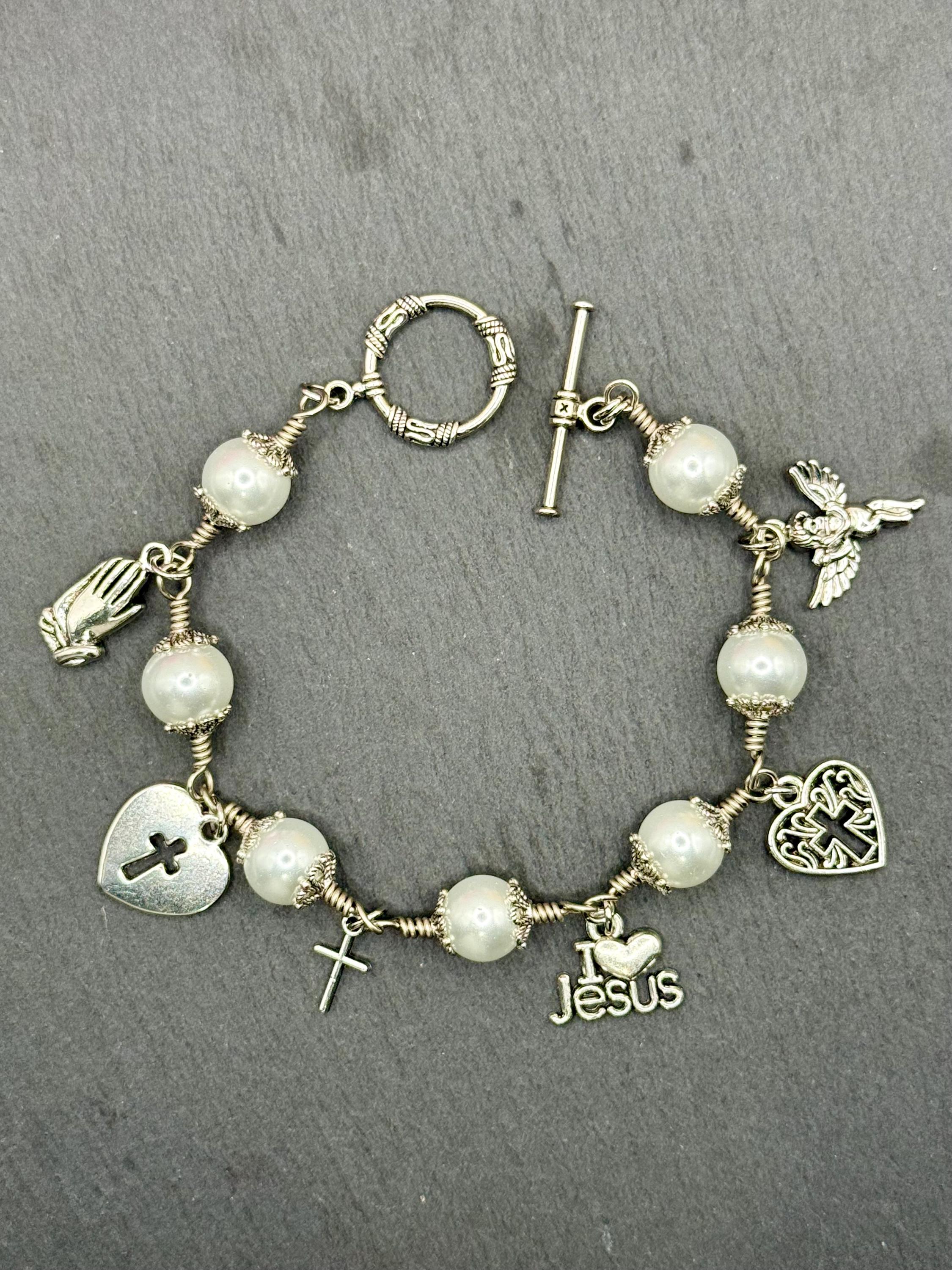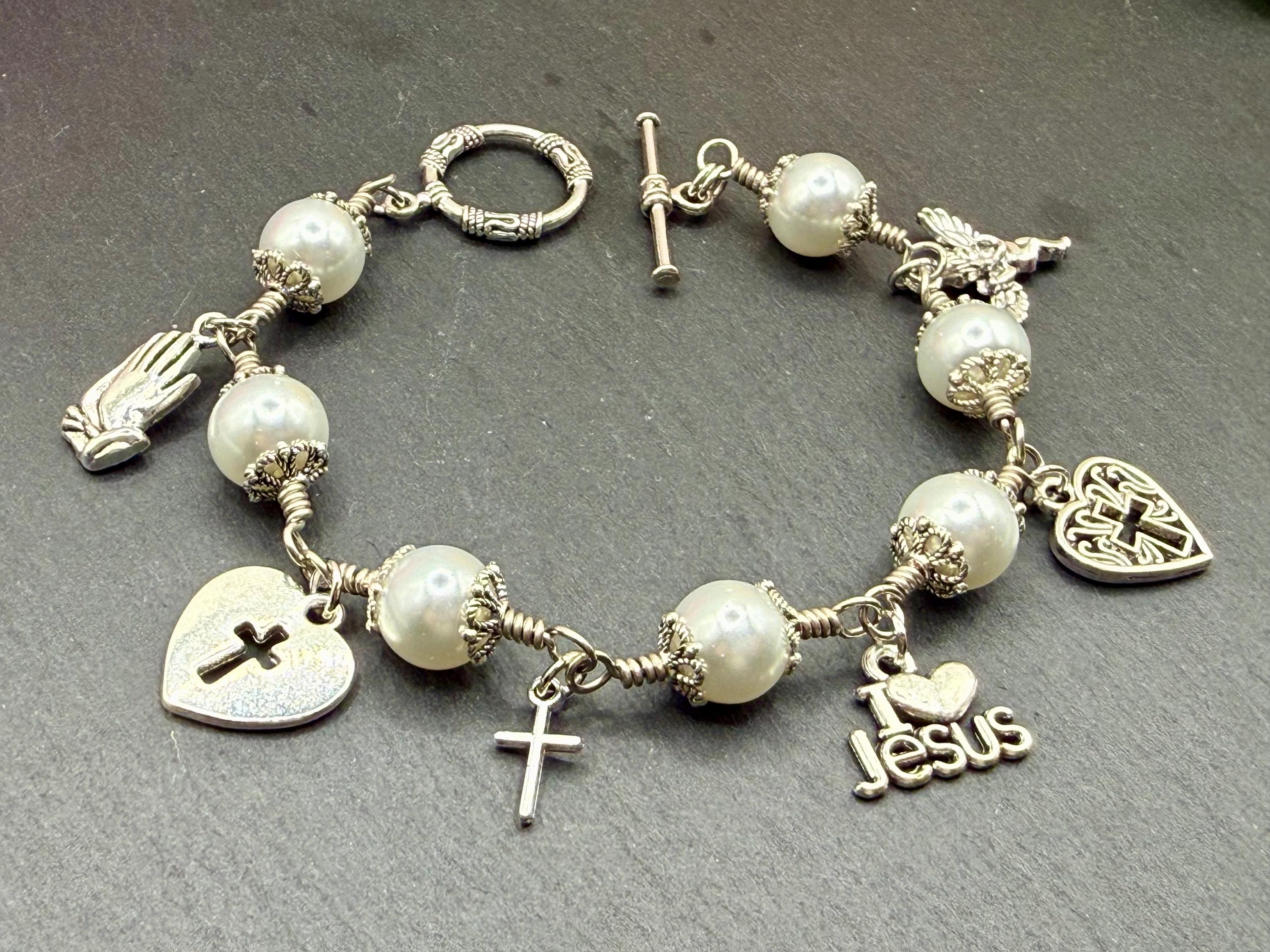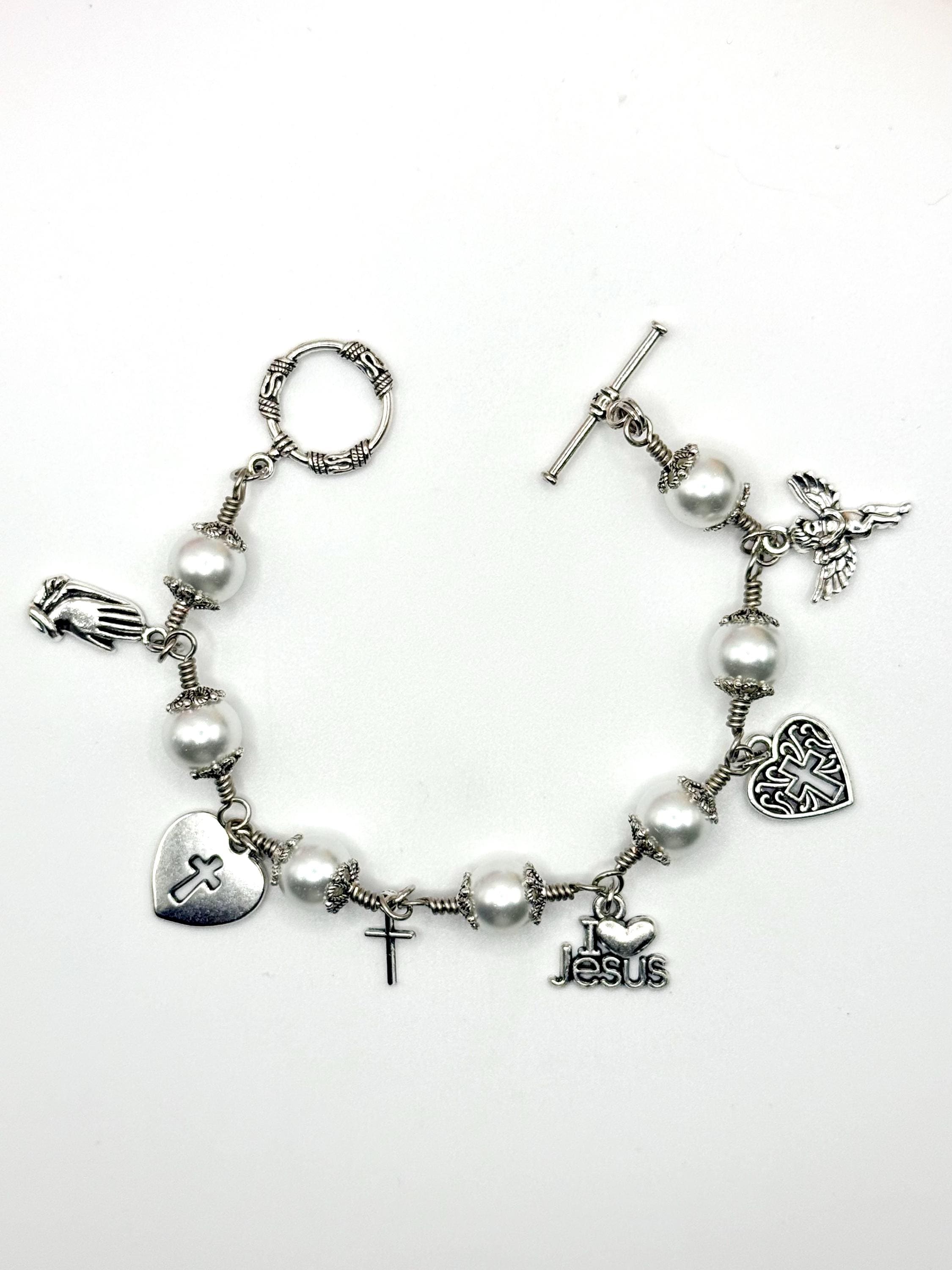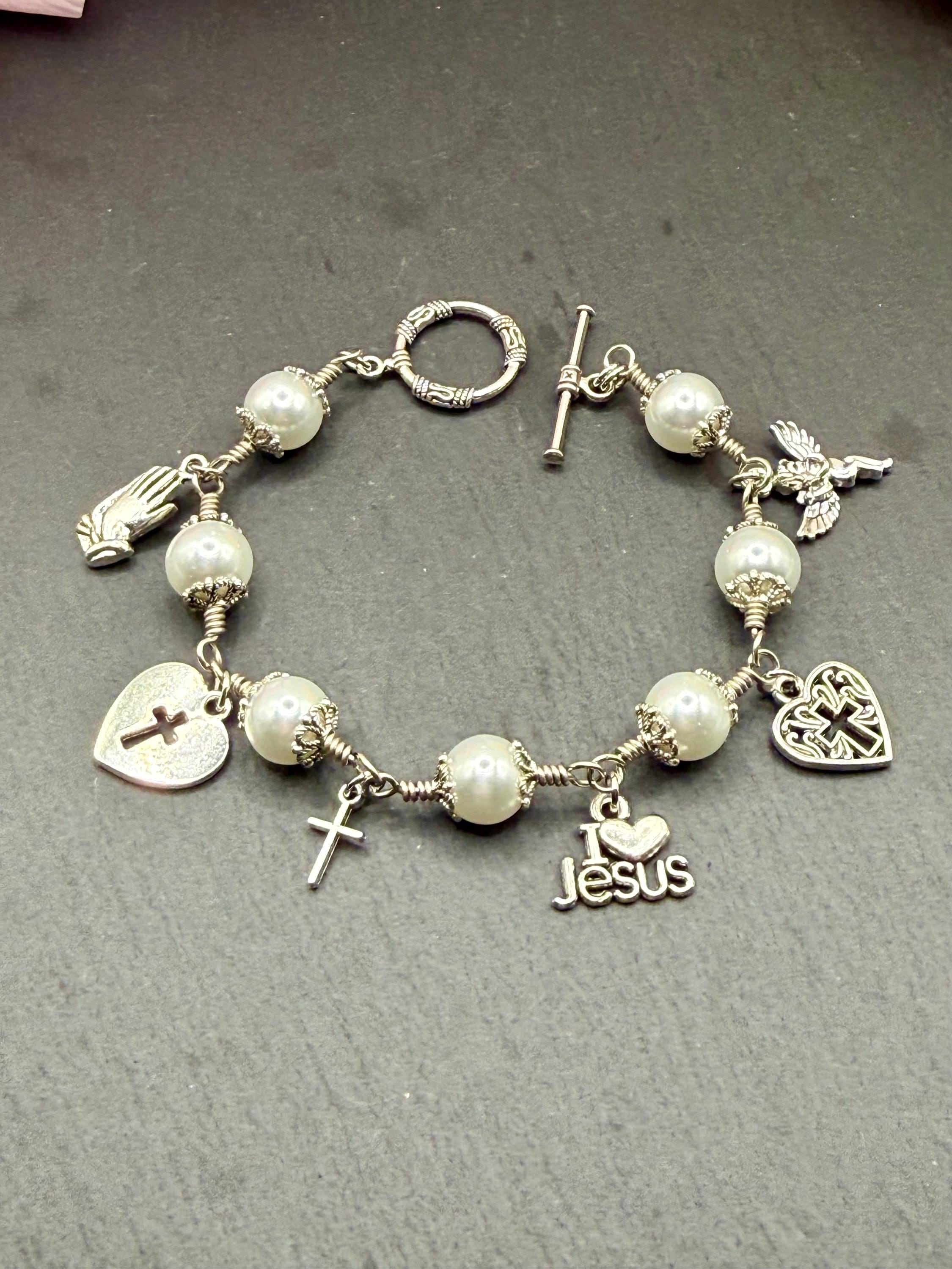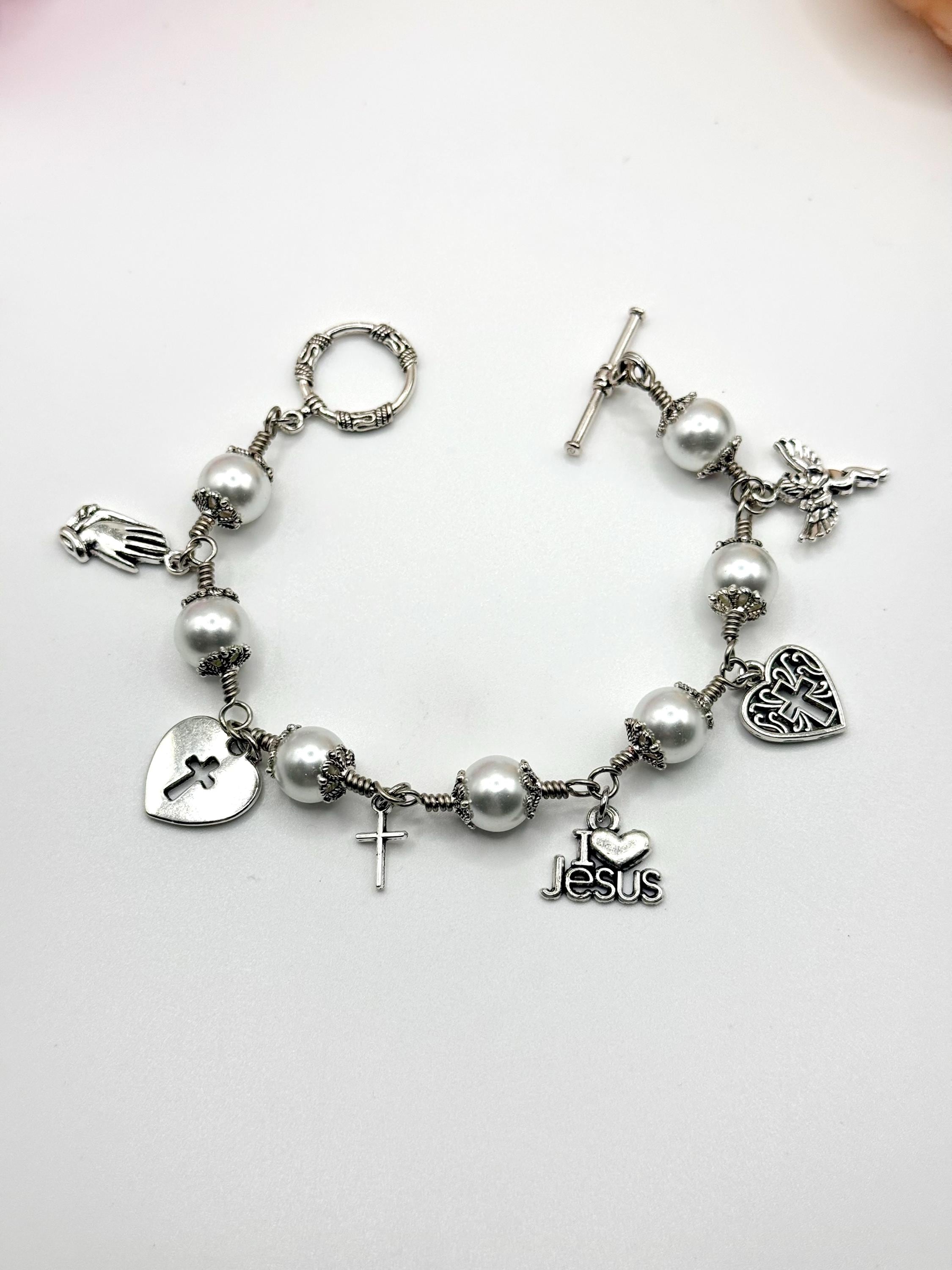 Experience the delicate beauty of faith with this artisan wire jewelry, featuring luminous glass pearl beads that shimmer softly with every movement. Each charm bracelet is thoughtfully crafted by hand, combining the elegance of pearl wire wrapped design with meaningful religious charm gifts that inspire hope and devotion. Whether worn daily or gifted for a special occasion, this bracelet is a graceful symbol of spiritual strength and love.