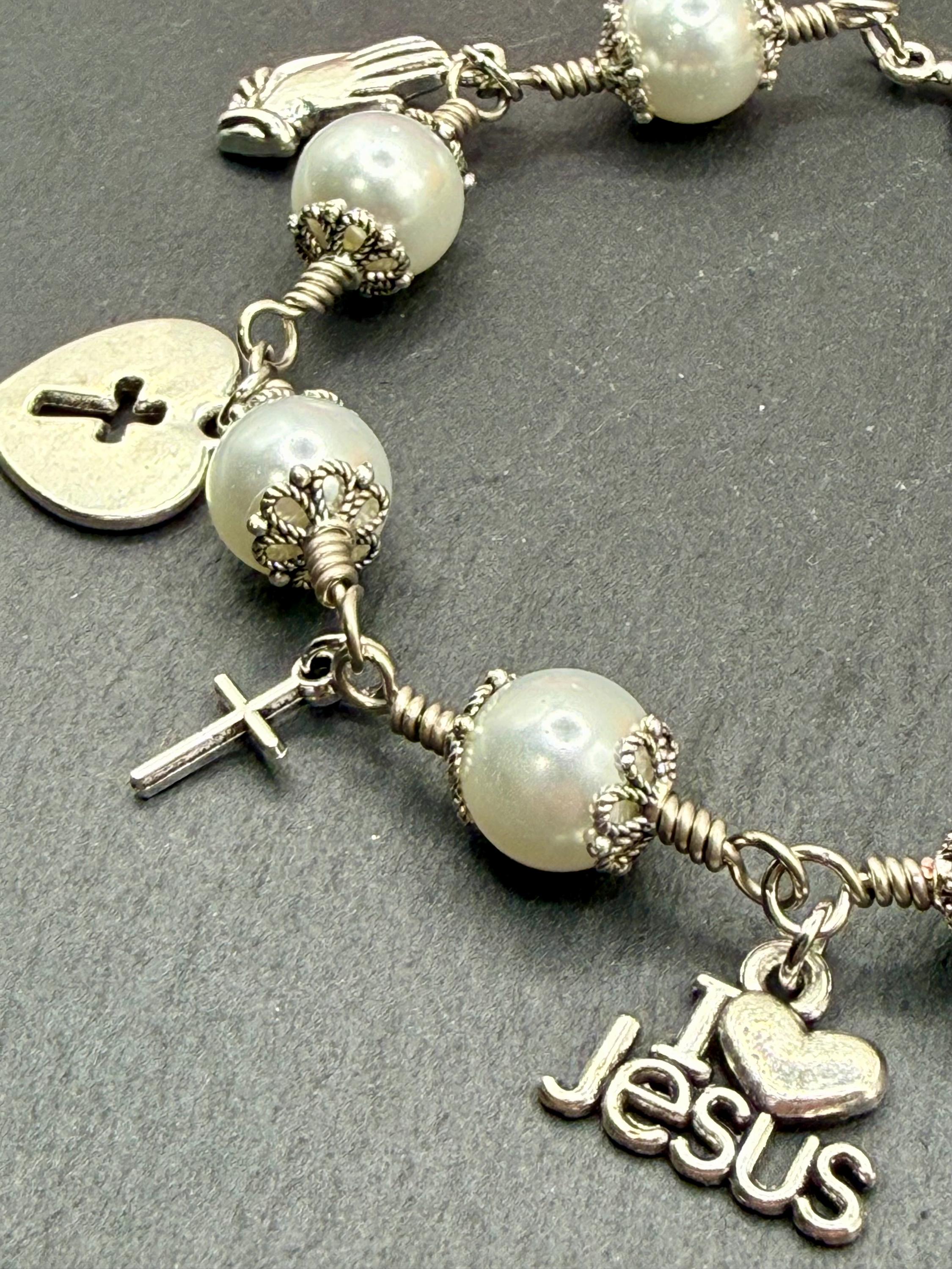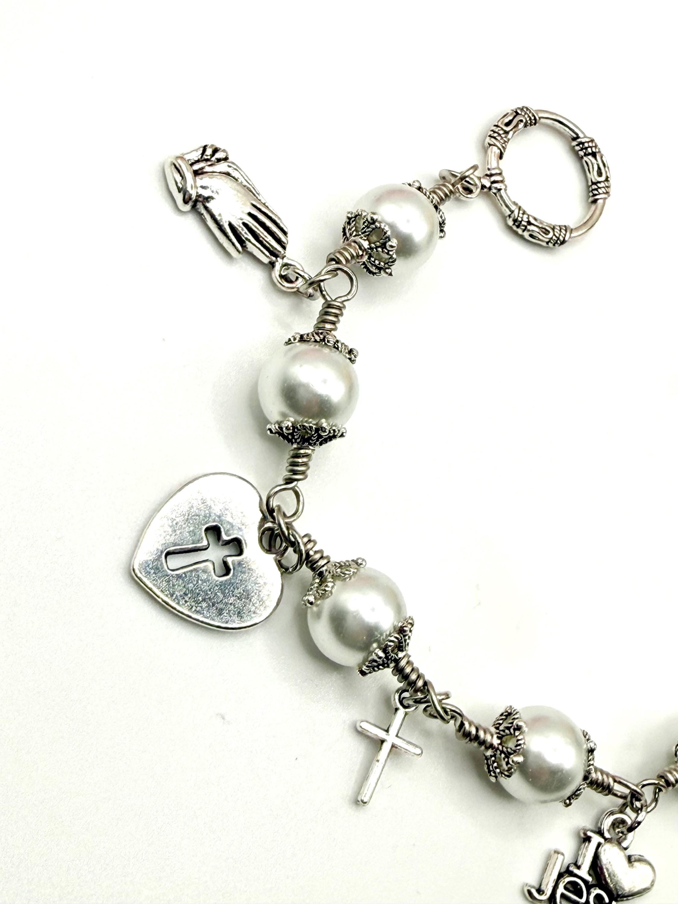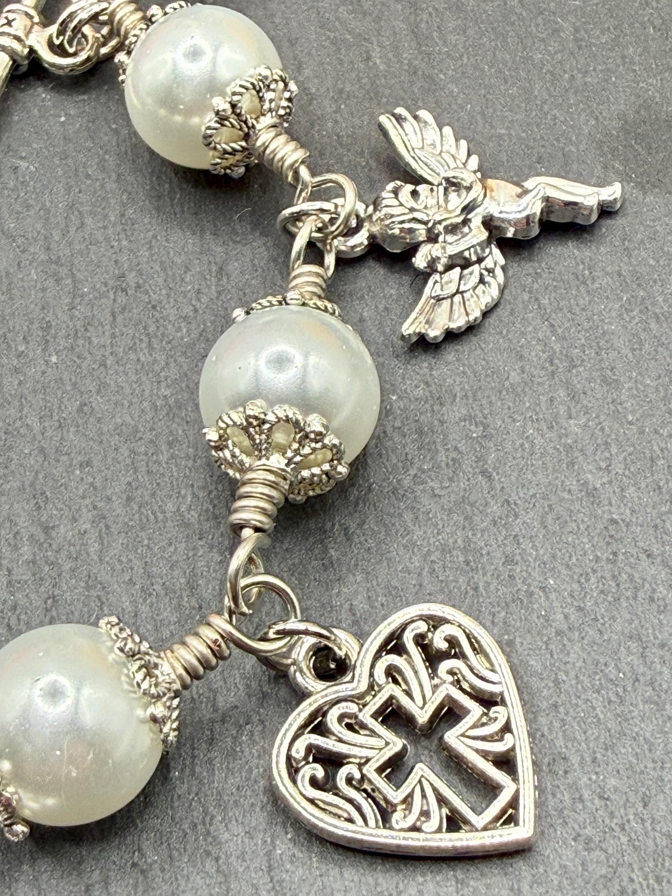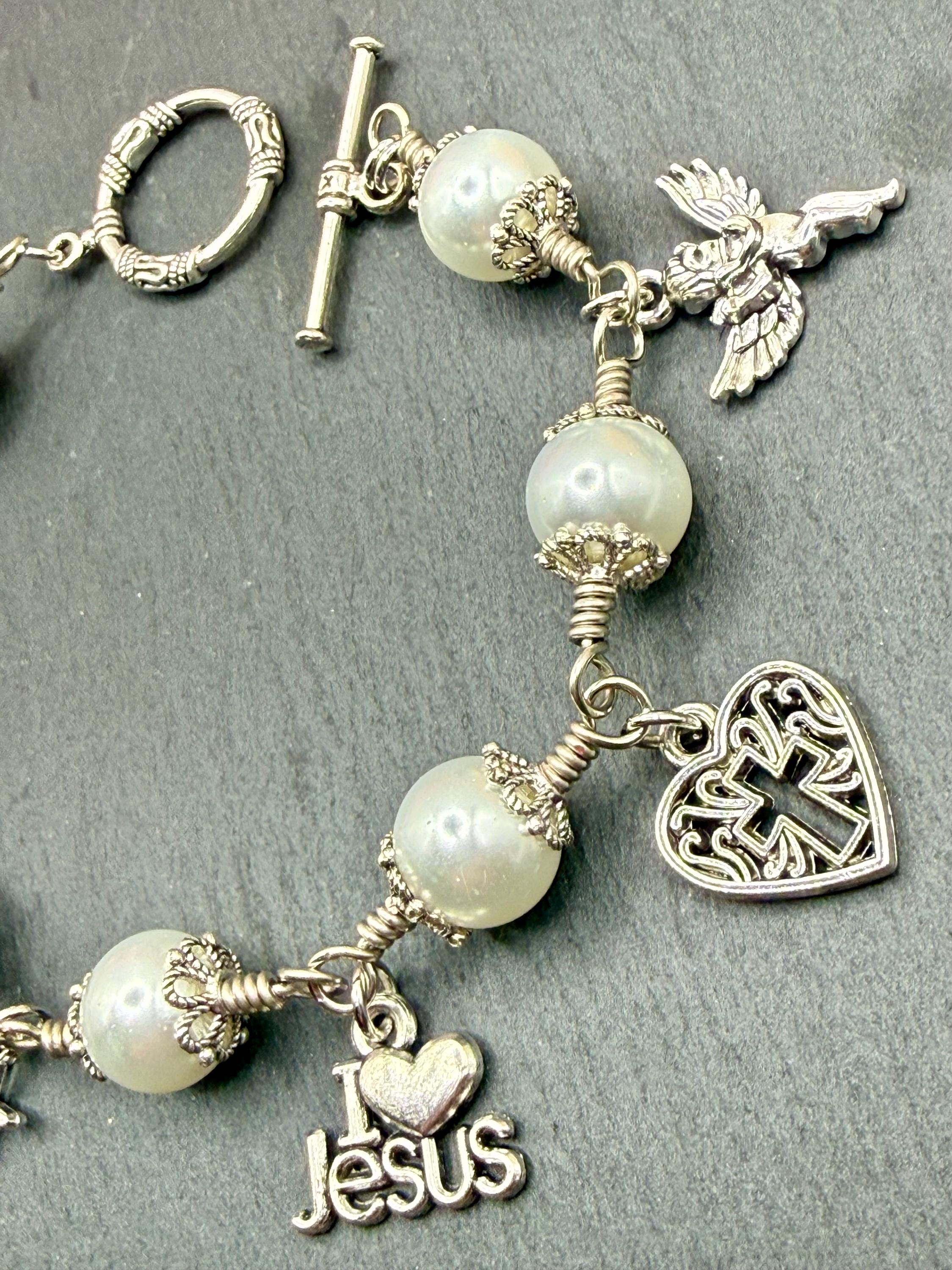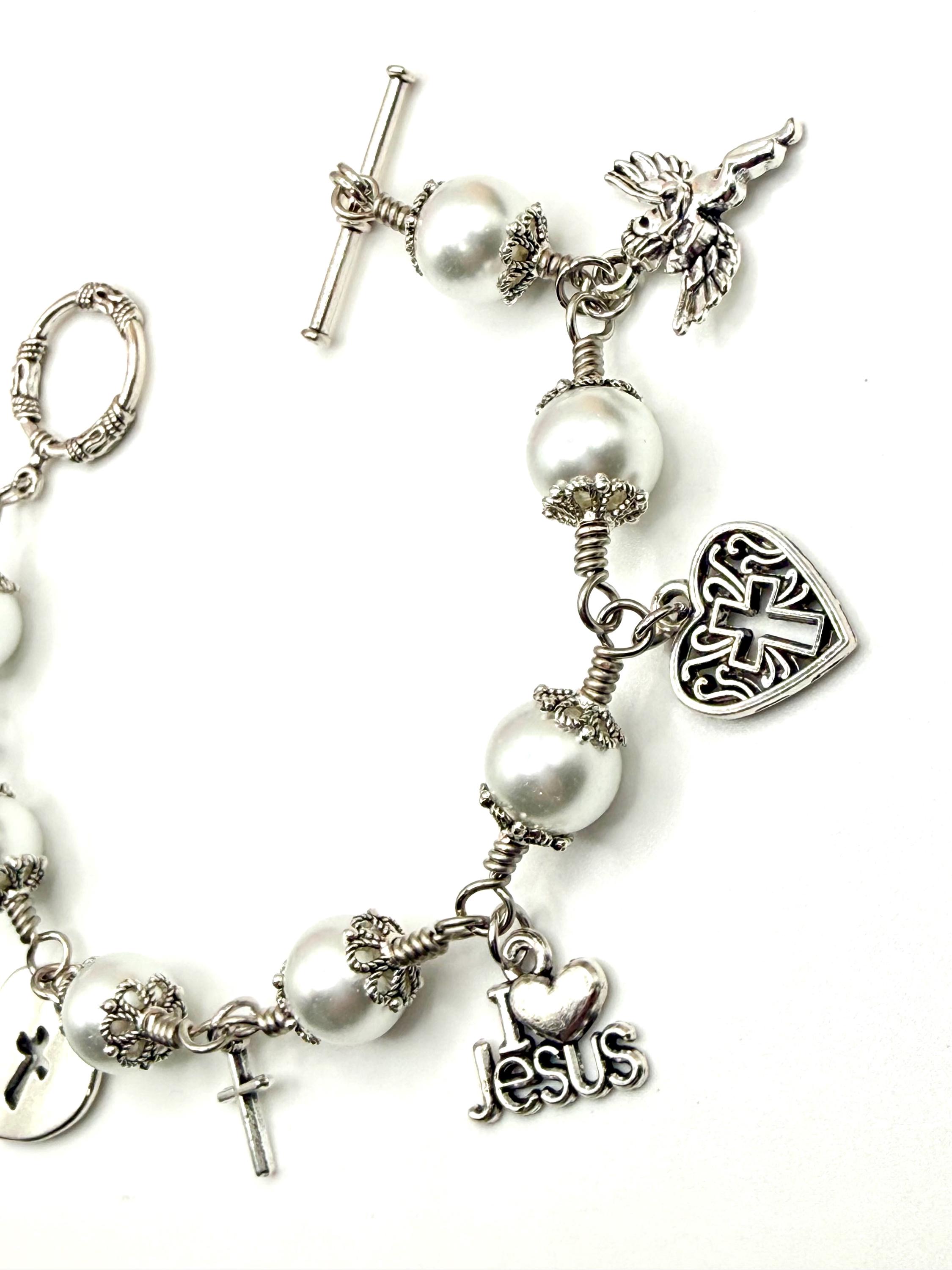 Experience the delicate beauty of faith with this artisan wire jewelry, featuring luminous glass pearl beads that shimmer softly with every movement. Each charm bracelet is thoughtfully crafted by hand, combining the elegance of pearl wire wrapped design with meaningful religious charm gifts that inspire hope and devotion. Whether worn daily or gifted for a special occasion, this bracelet is a graceful symbol of spiritual strength and love.