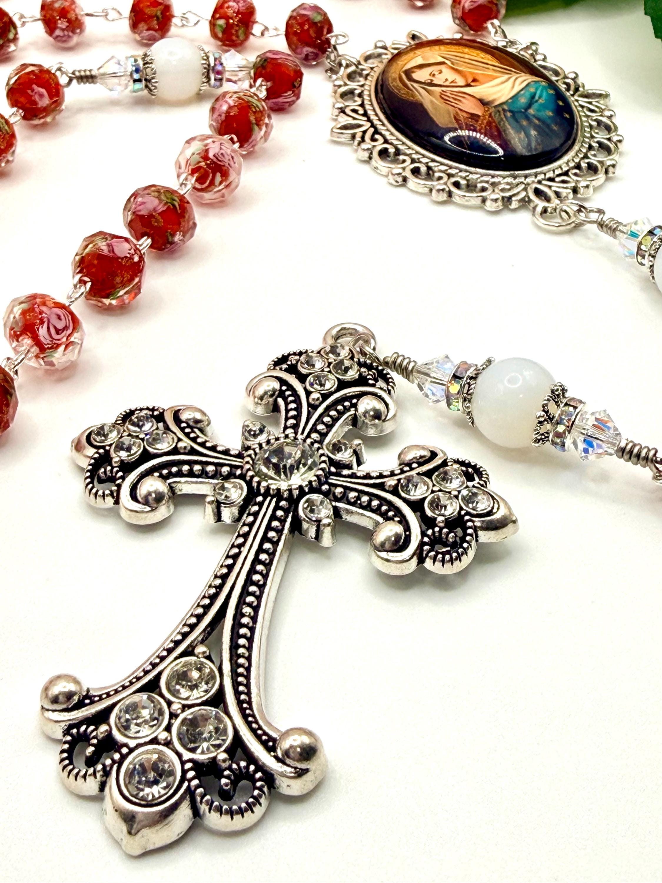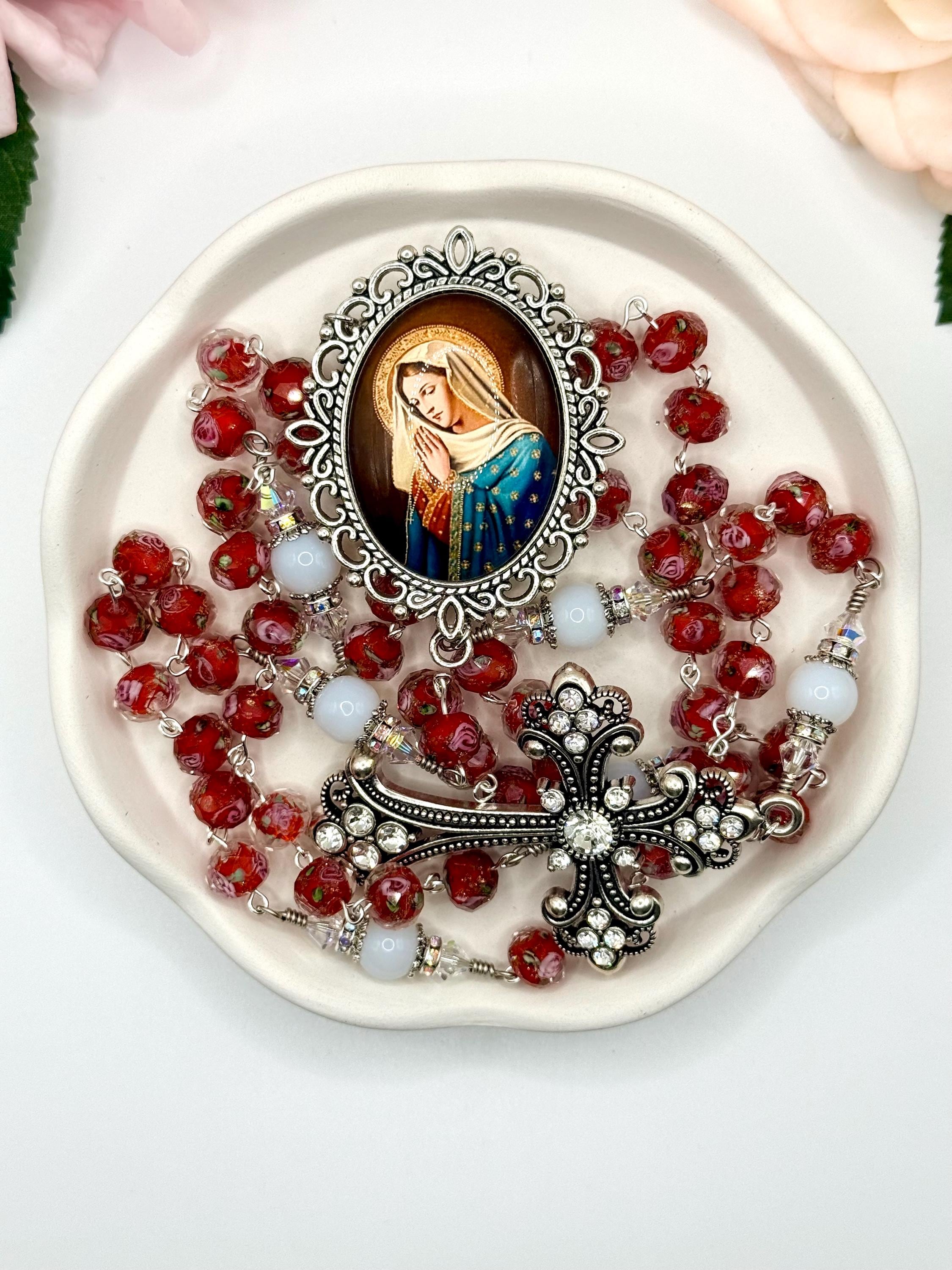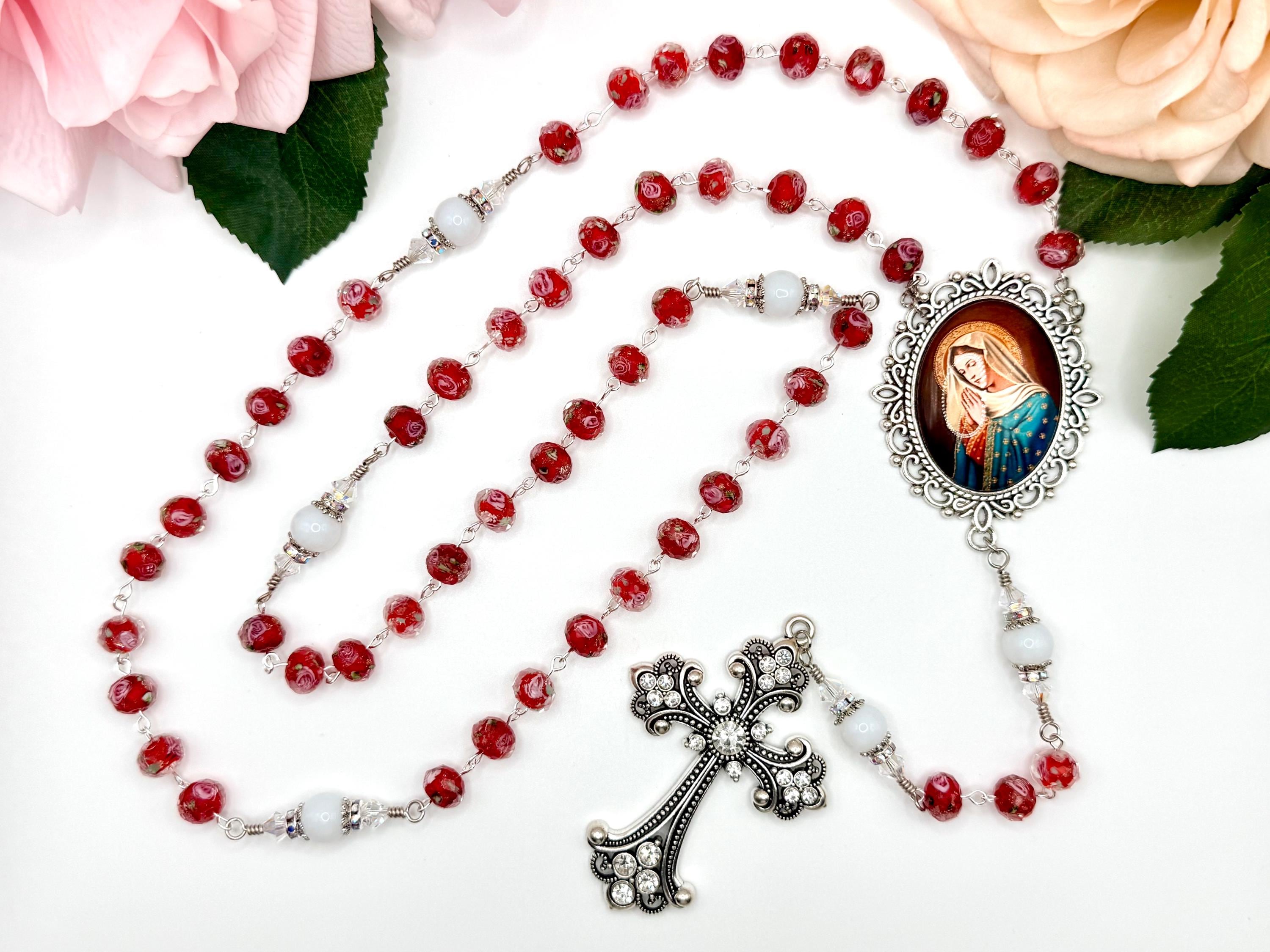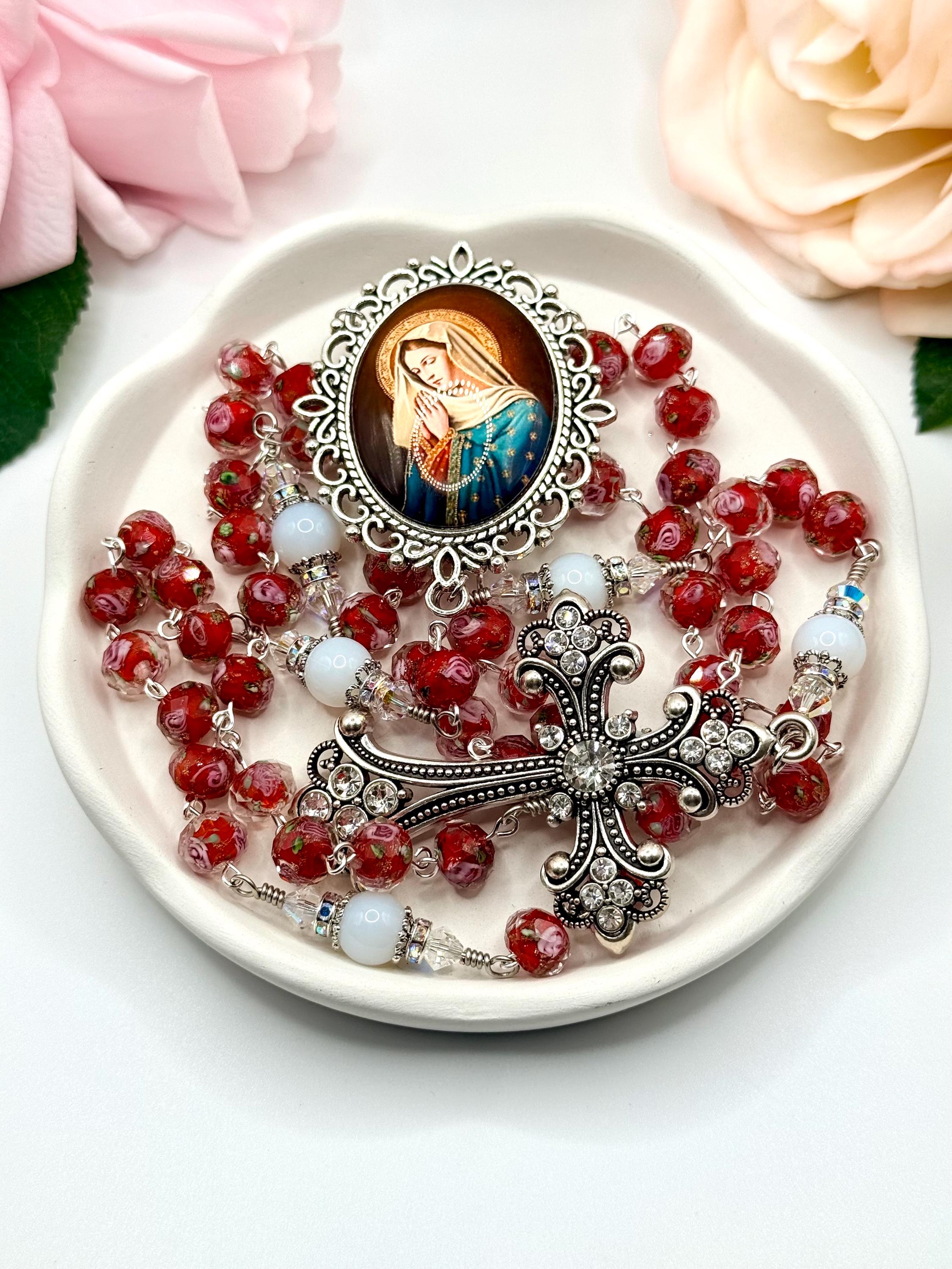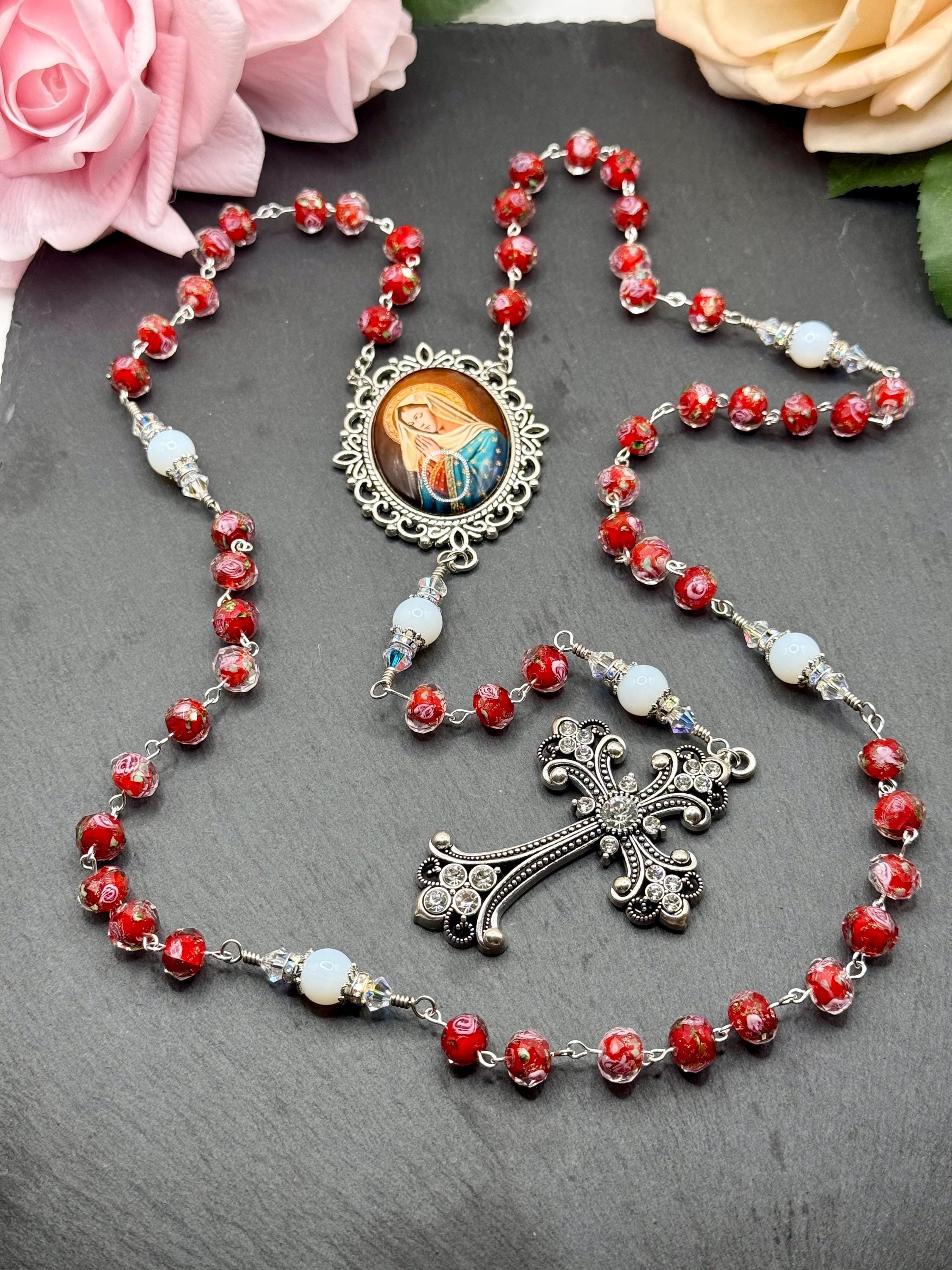 Experience the profound beauty of prayer with this vintage style rosary, crafted to inspire devotion through its exquisite blend of red lampwork beads and shimmering Swarovski crystals. Each bead is carefully faceted to catch the light, creating a radiant symbol of faith that resonates deeply with those seeking a meaningful religious gift idea. This rosary’s classic style and artisanal craftsmanship make it a cherished keepsake for moments of reflection and spiritual connection.