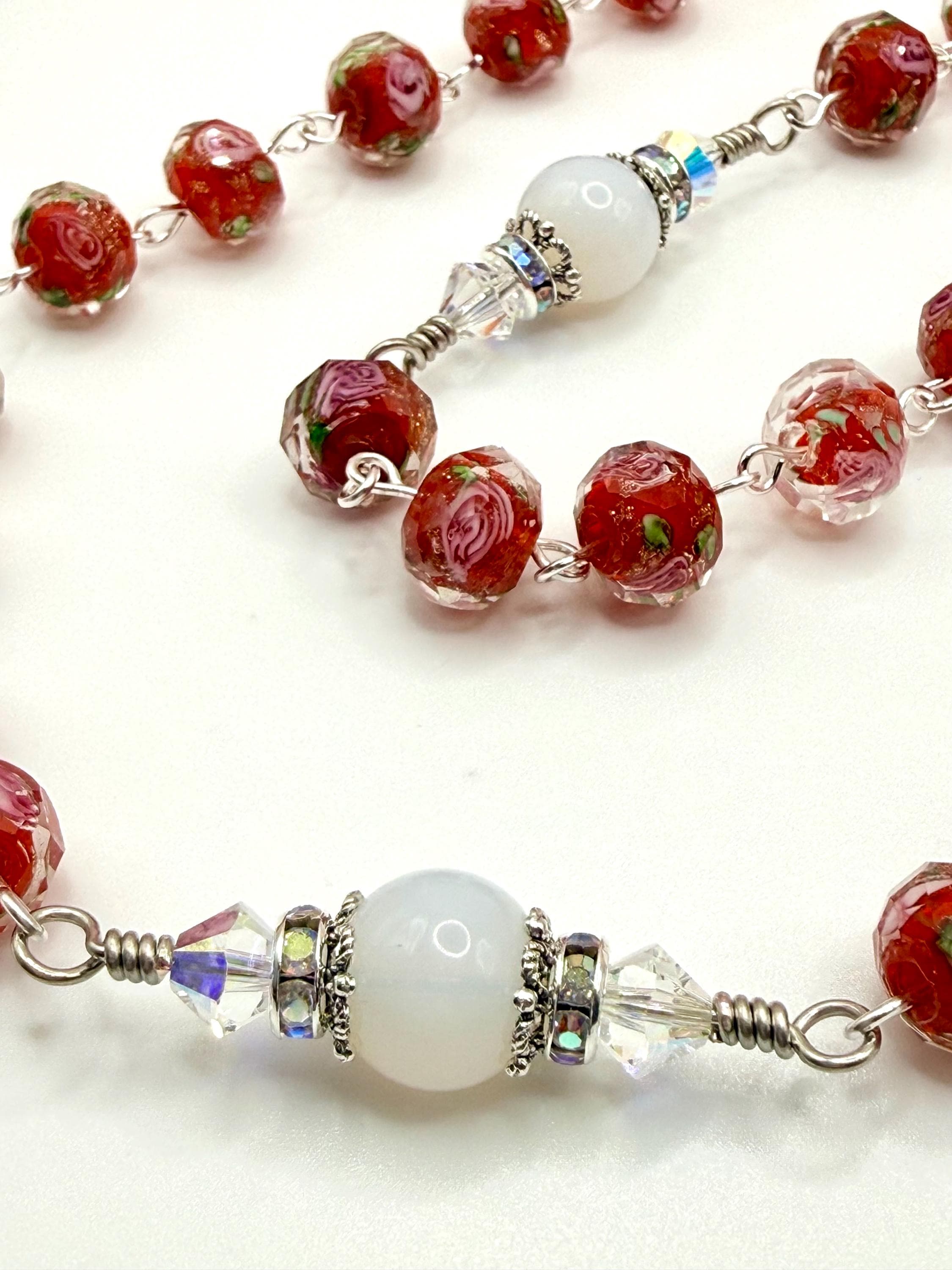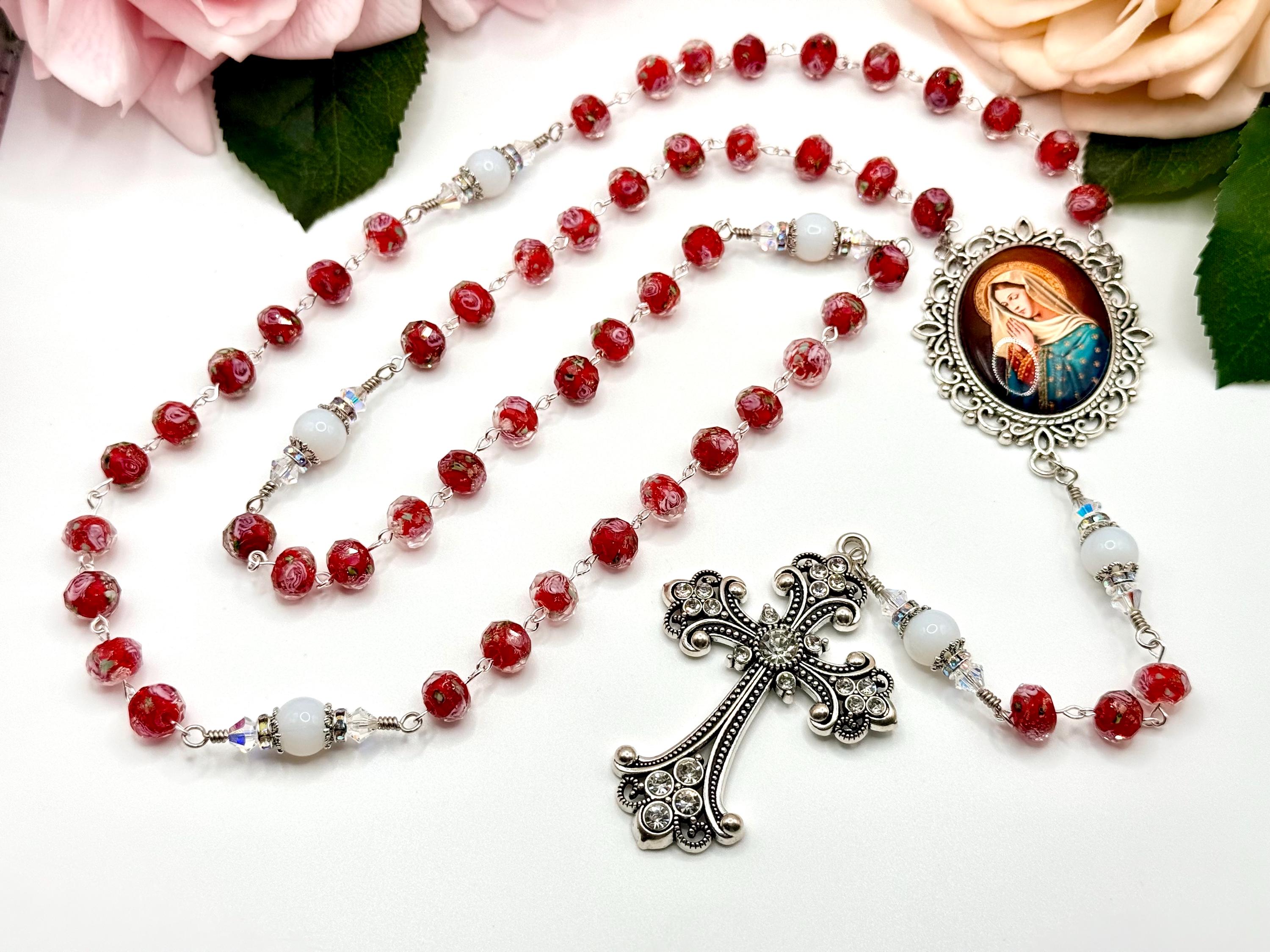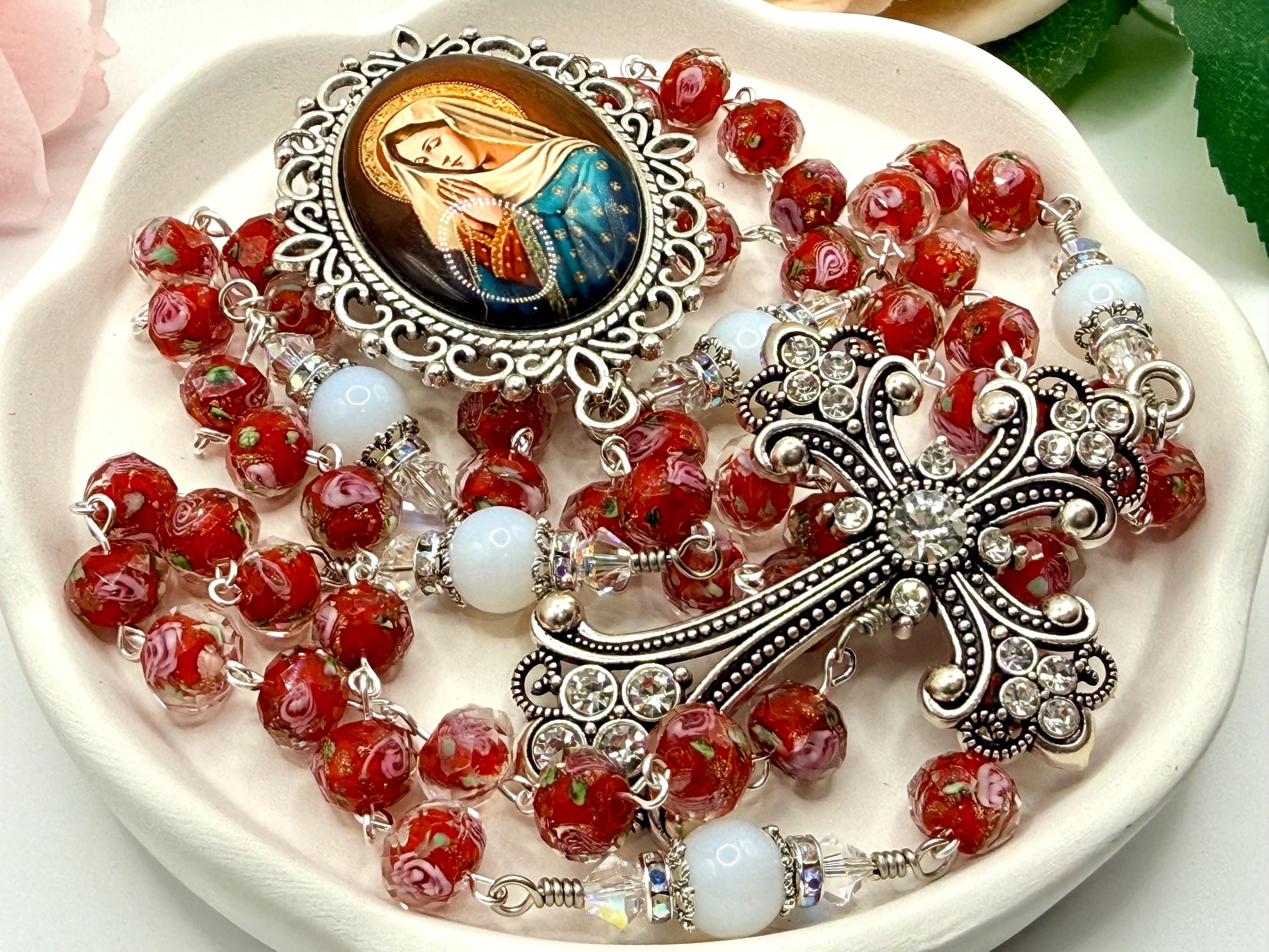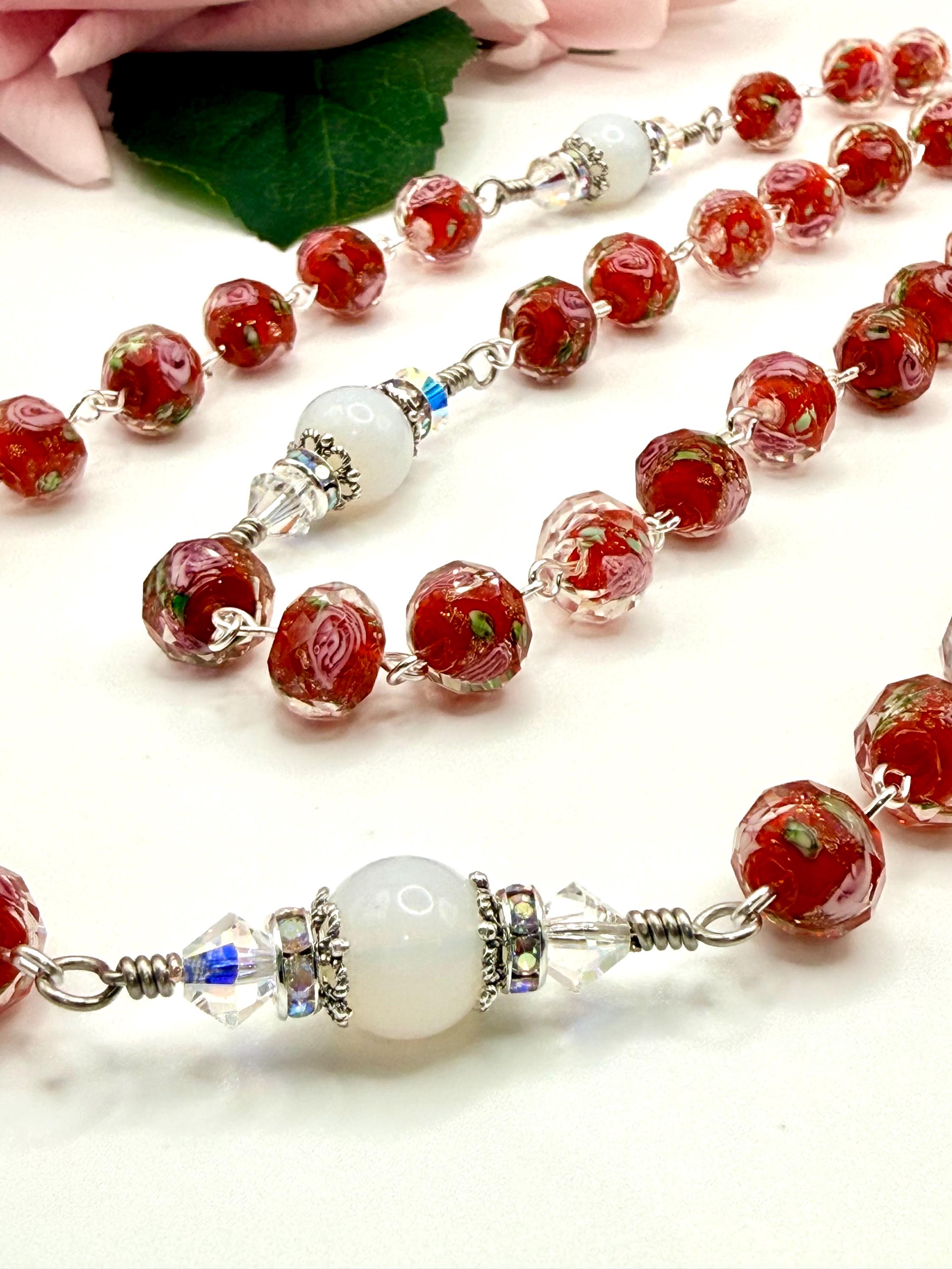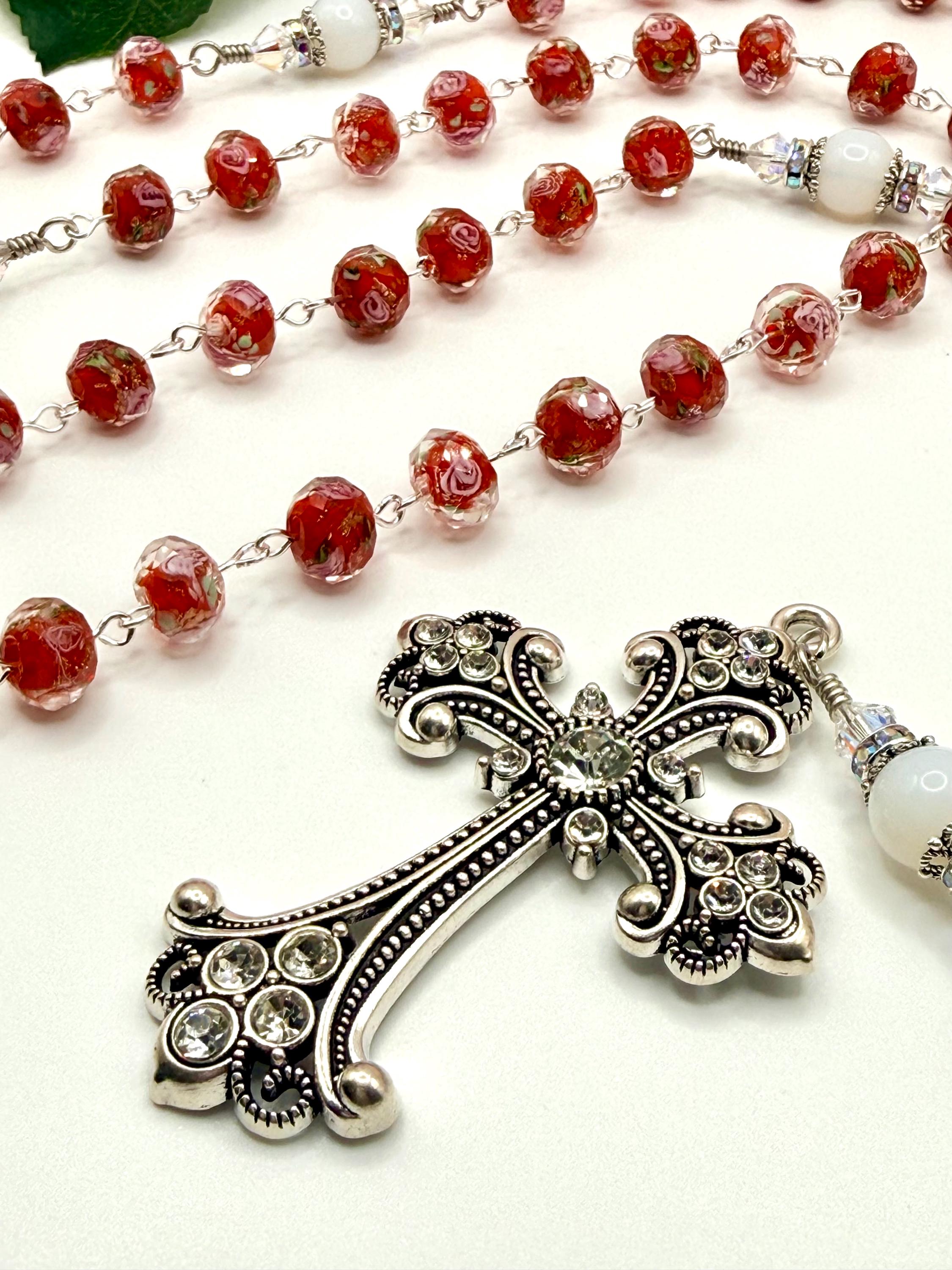 Experience the profound beauty of prayer with this vintage style rosary, crafted to inspire devotion through its exquisite blend of red lampwork beads and shimmering Swarovski crystals. Each bead is carefully faceted to catch the light, creating a radiant symbol of faith that resonates deeply with those seeking a meaningful religious gift idea. This rosary’s classic style and artisanal craftsmanship make it a cherished keepsake for moments of reflection and spiritual connection.