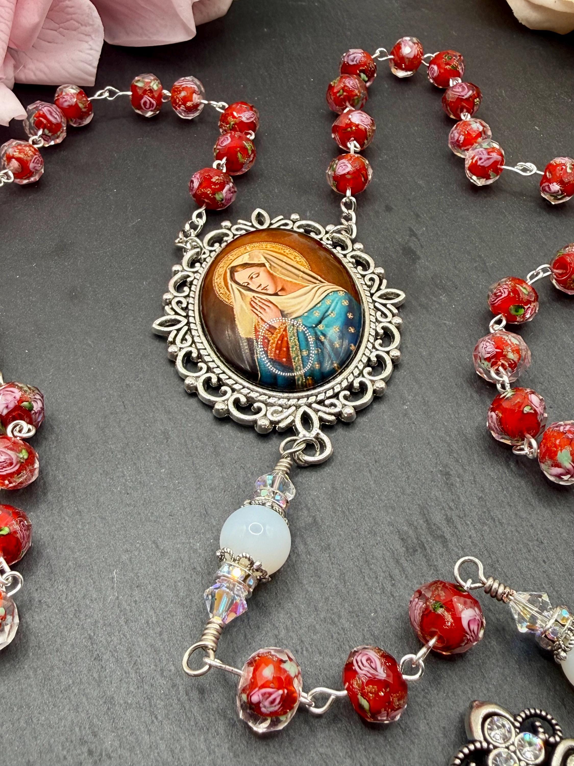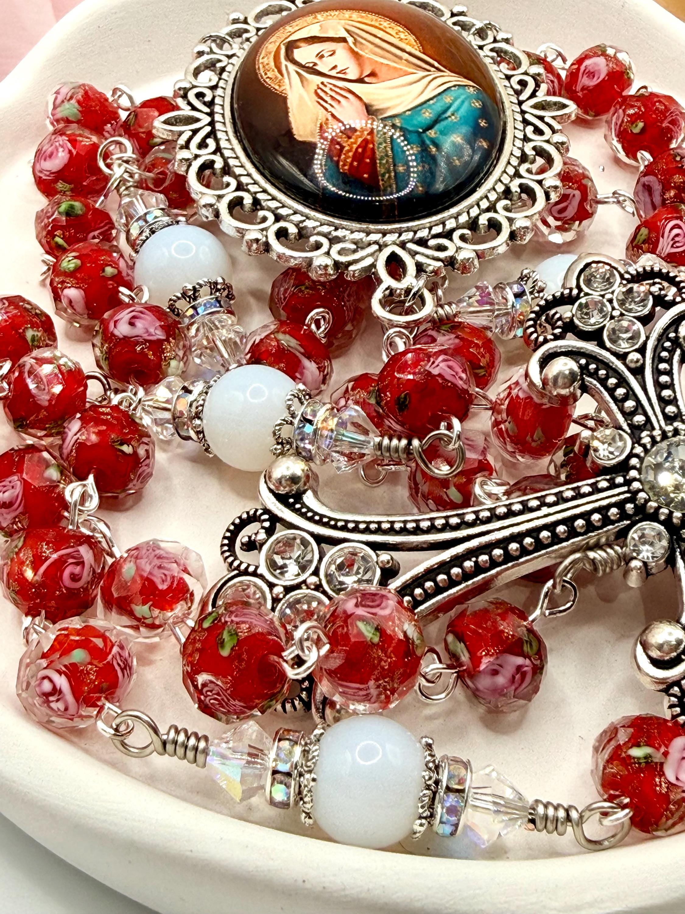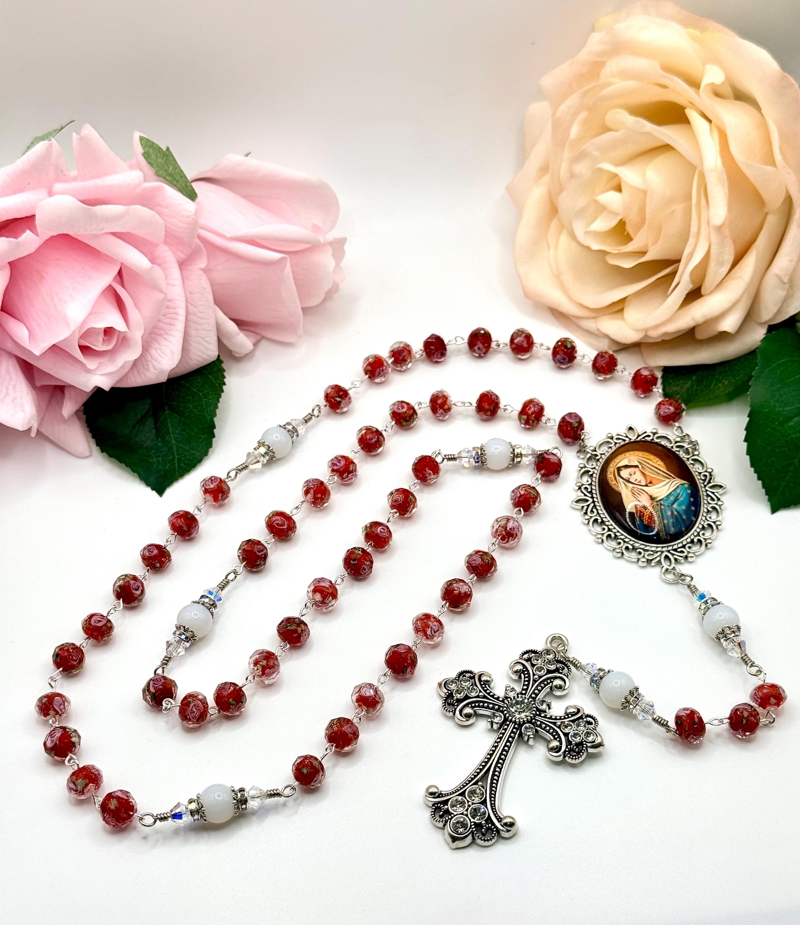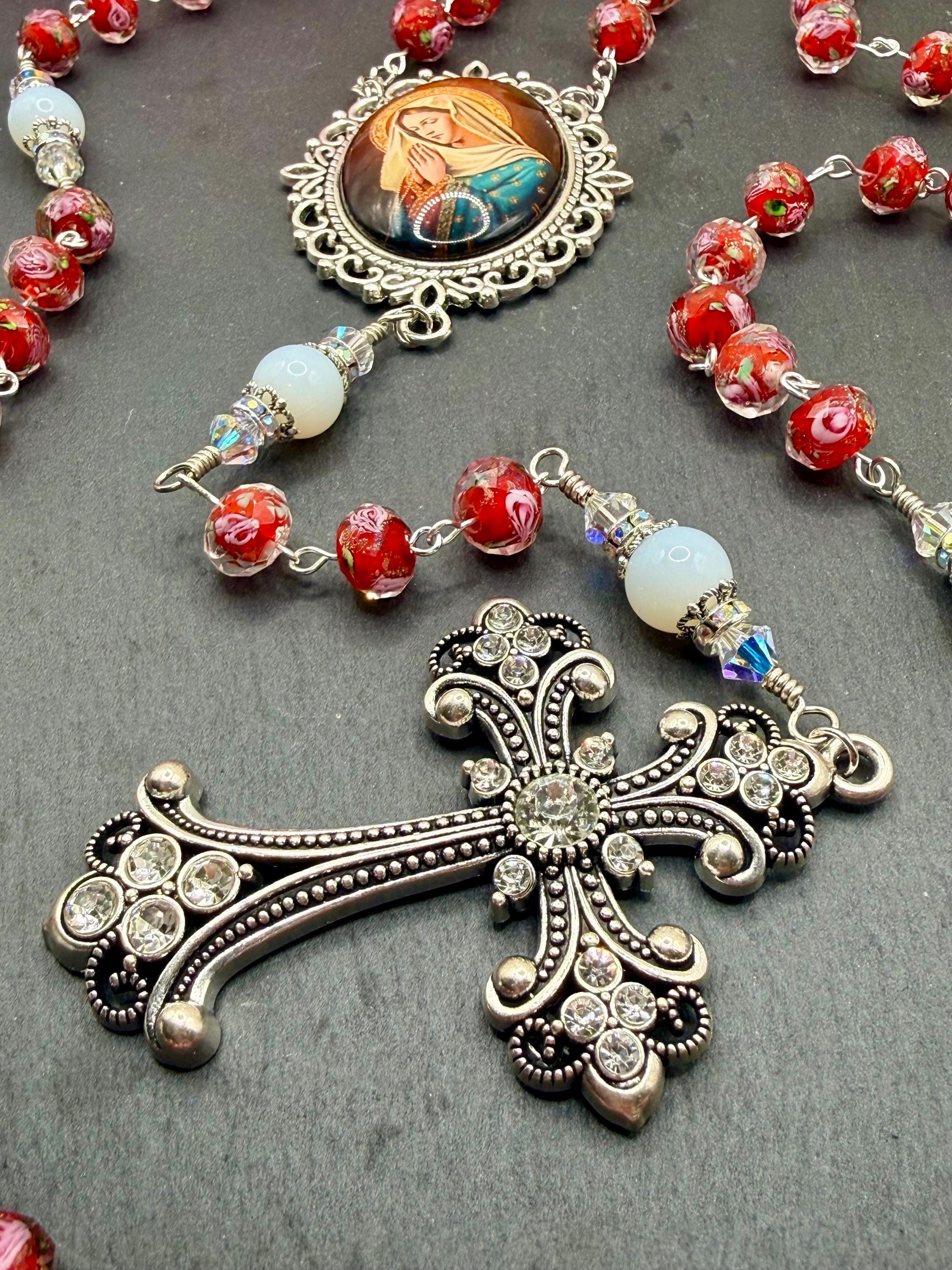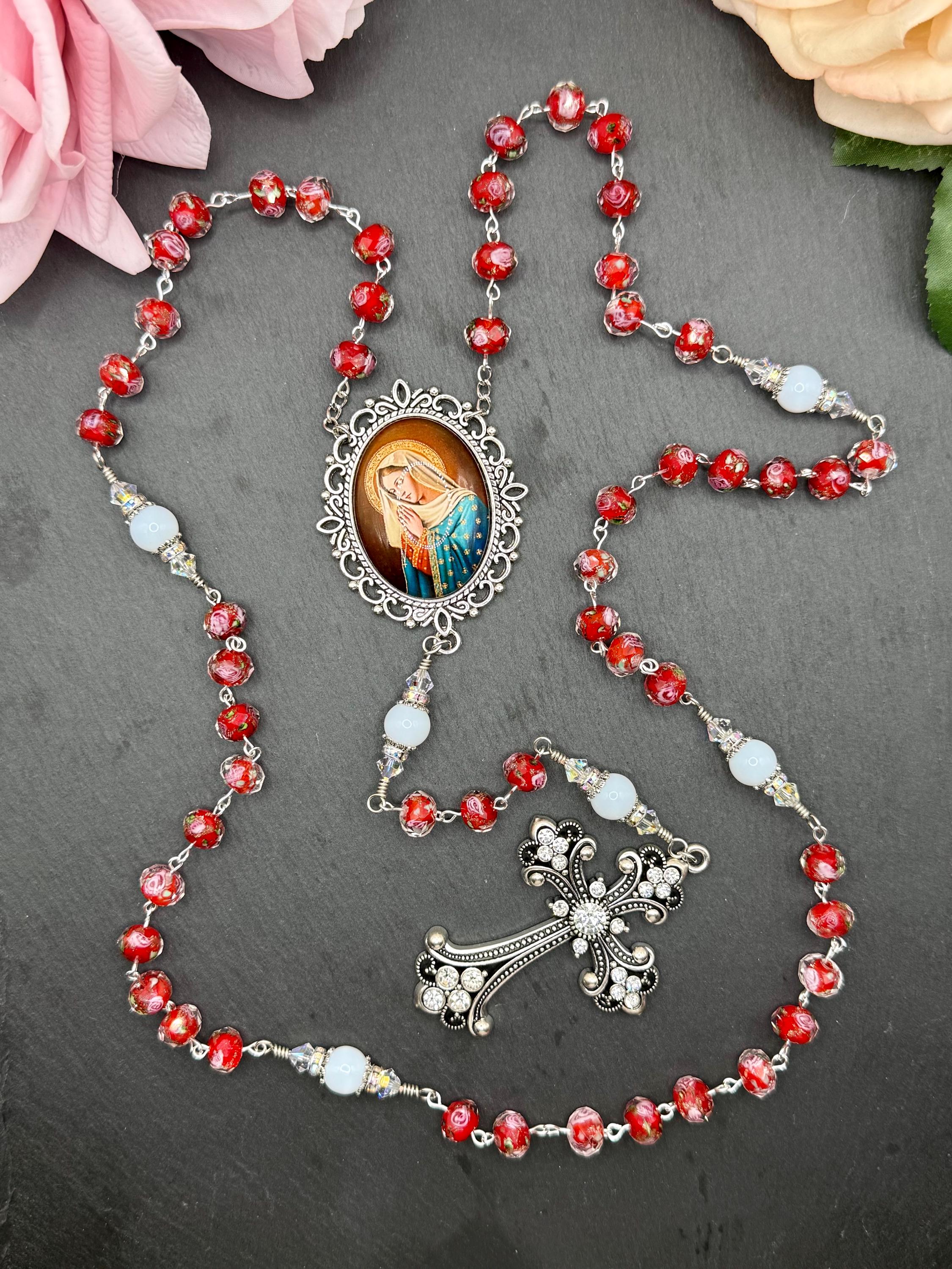 Experience the profound beauty of prayer with this vintage style rosary, crafted to inspire devotion through its exquisite blend of red lampwork beads and shimmering Swarovski crystals. Each bead is carefully faceted to catch the light, creating a radiant symbol of faith that resonates deeply with those seeking a meaningful religious gift idea. This rosary’s classic style and artisanal craftsmanship make it a cherished keepsake for moments of reflection and spiritual connection.