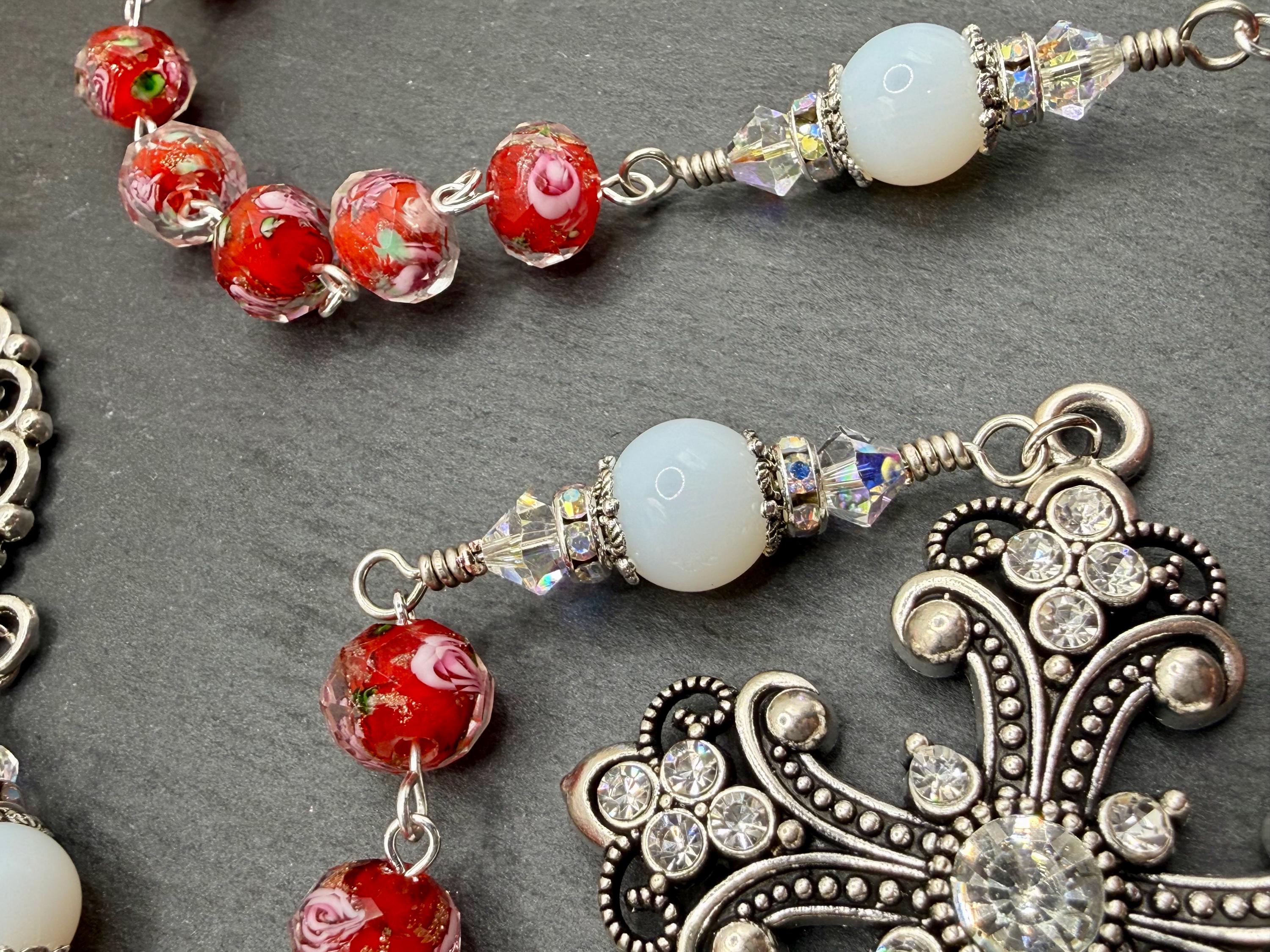 - Faceted red lampwork glass beads paired with sparkling Swarovski crystal accents