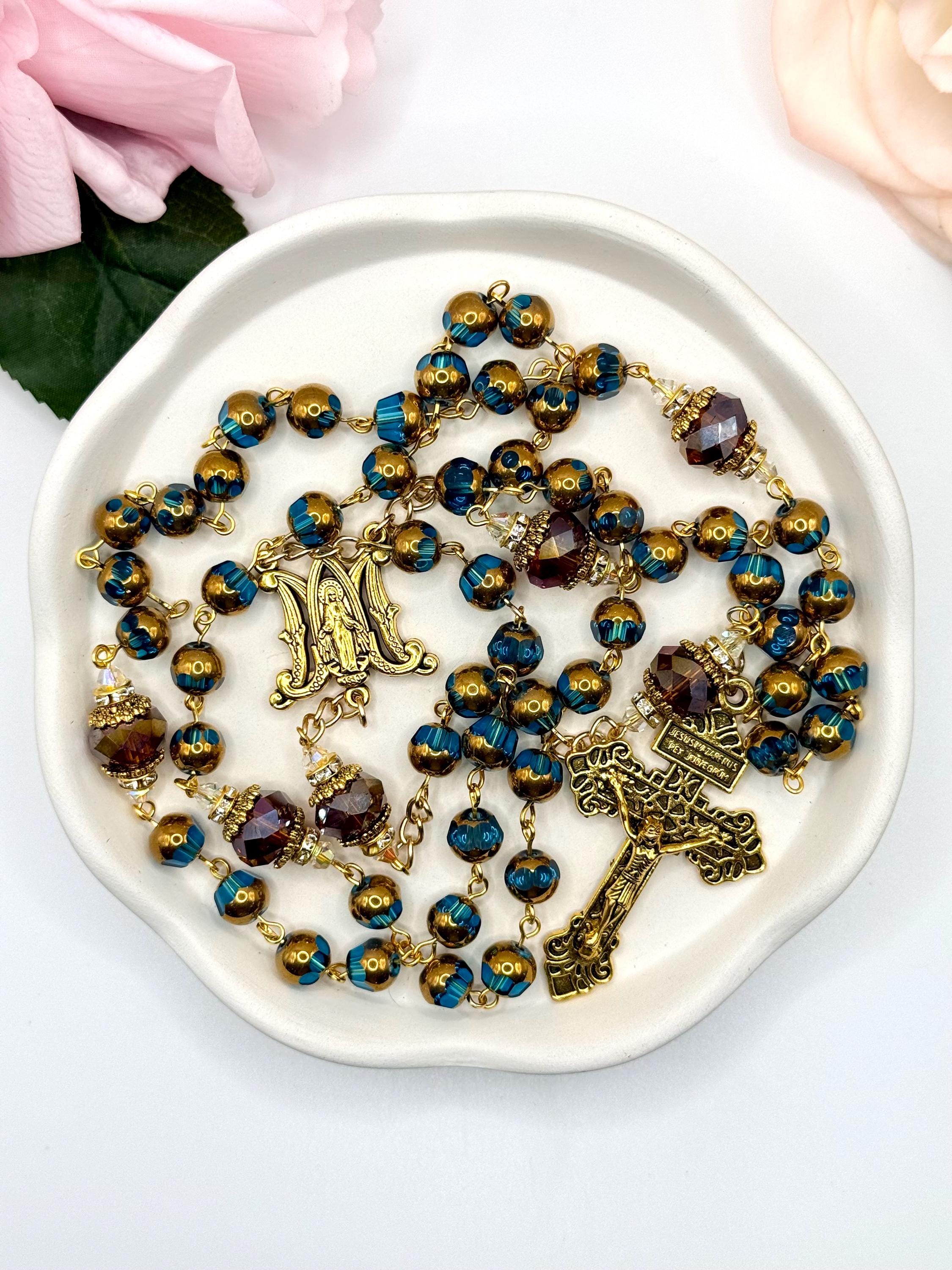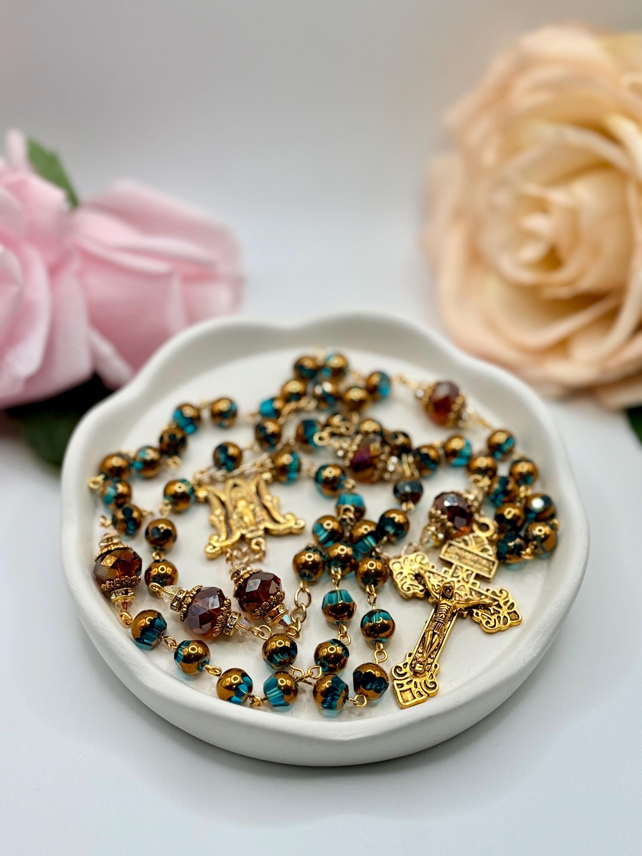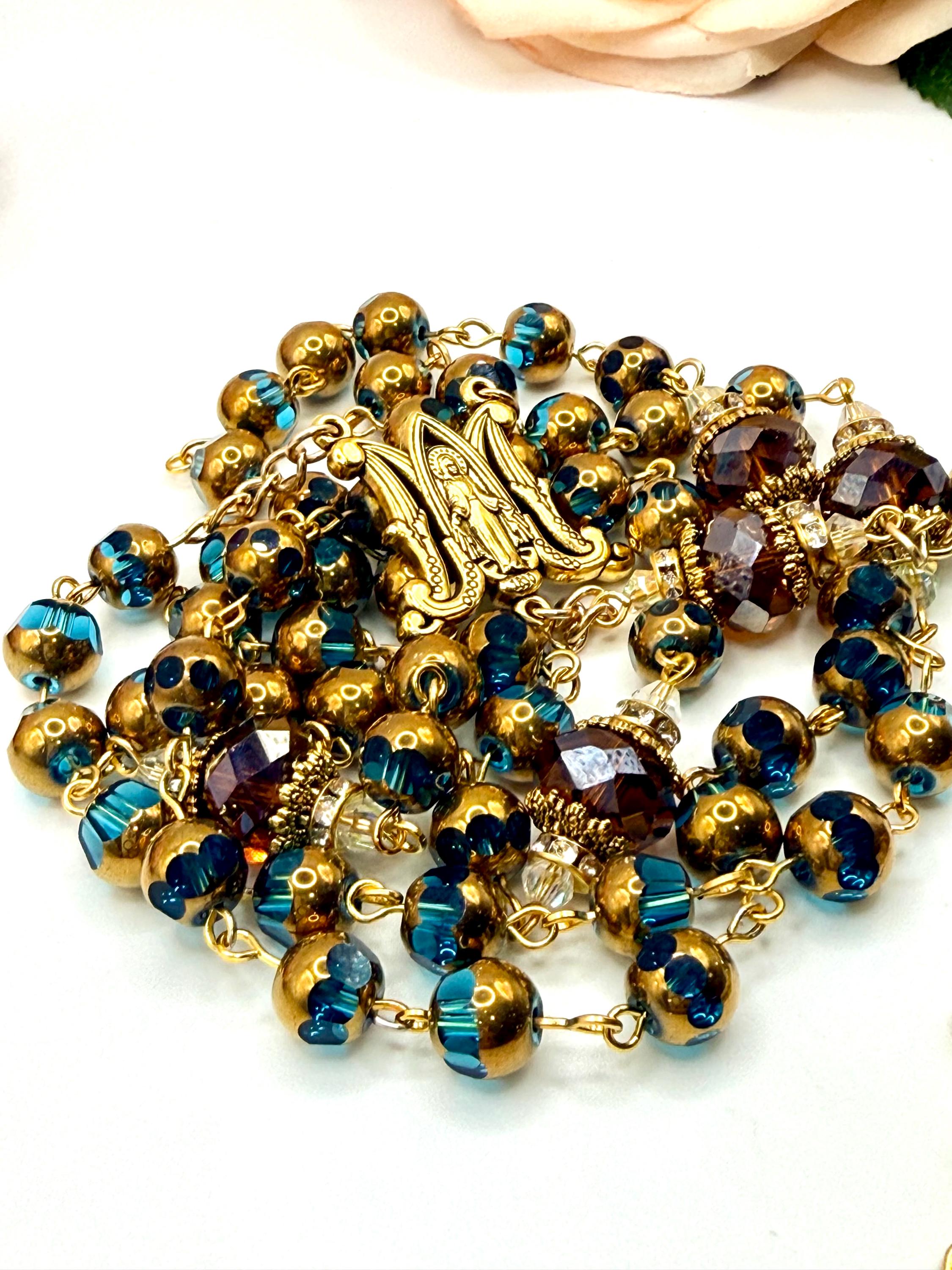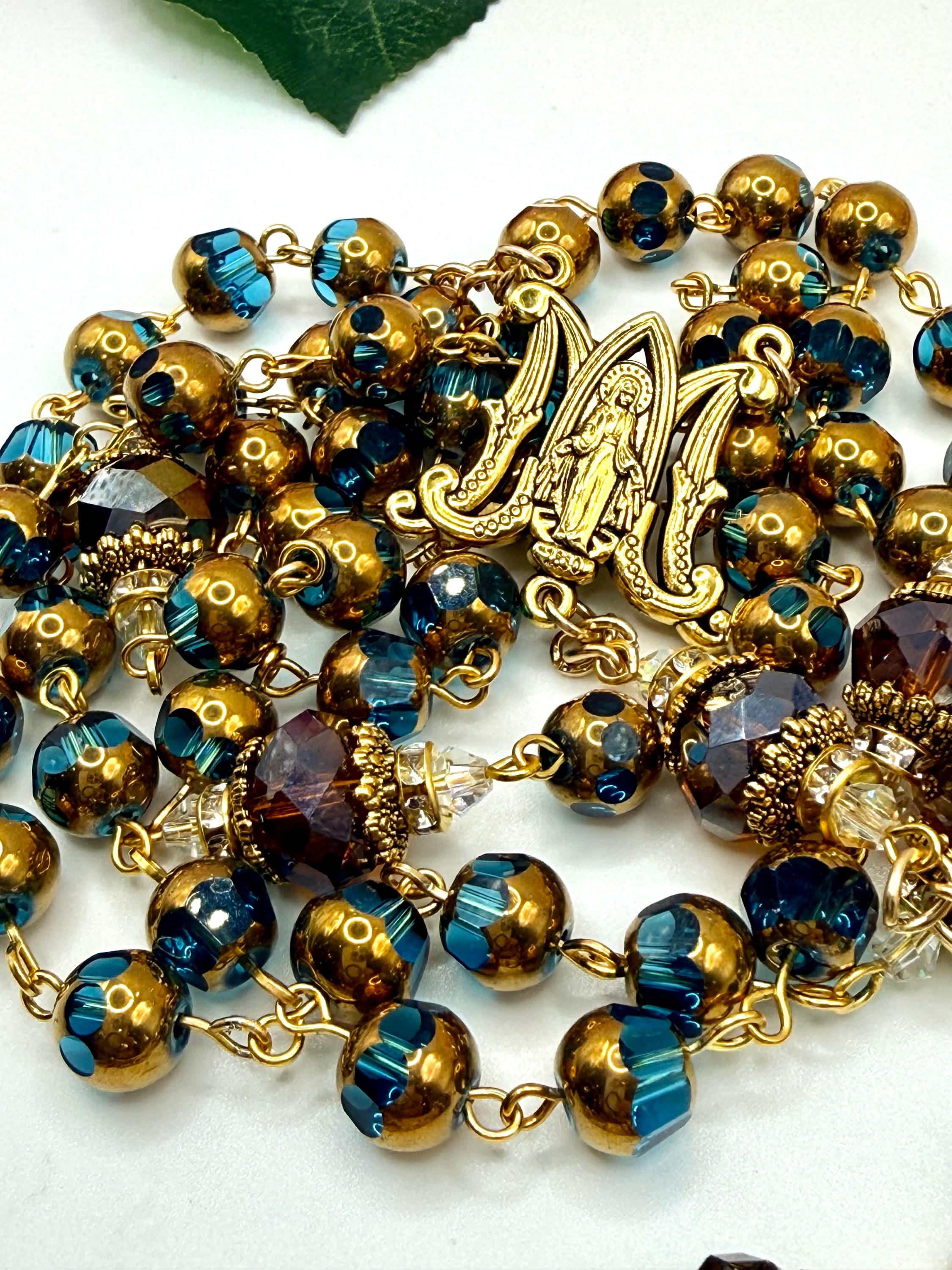 Discover the peaceful elegance of this handmade rosary, thoughtfully crafted with gold finish rosary beads, vivid blue glass prayer accents, and warm copper details that inspire deep reflection. Each bead is carefully selected to create a meaningful Catholic faith gift that resonates with devotion and tradition. Adorned with a Virgin Mary medal, this rosary serves as a beautiful companion for prayer and spiritual connection.