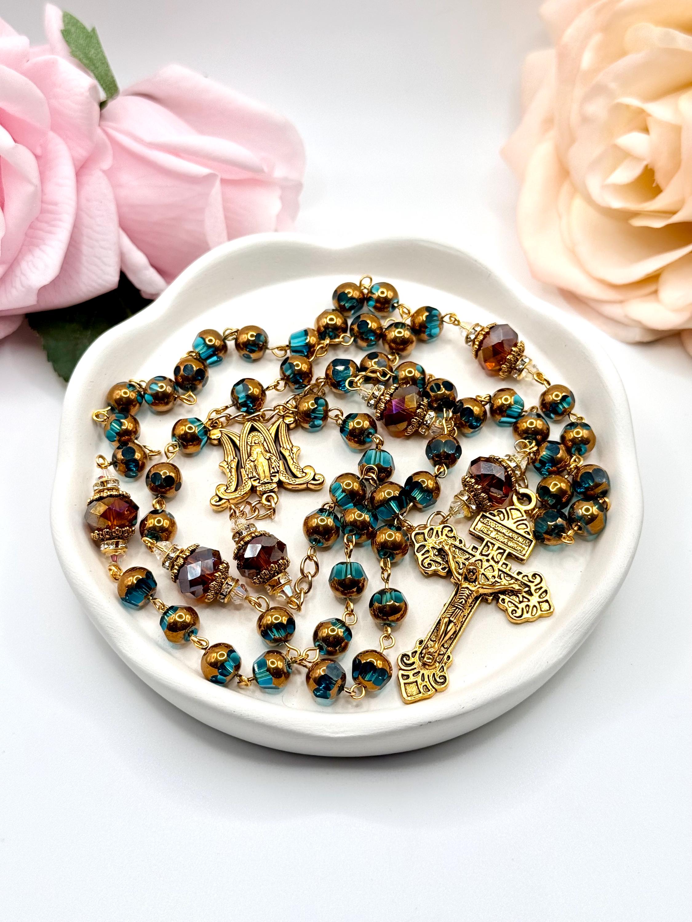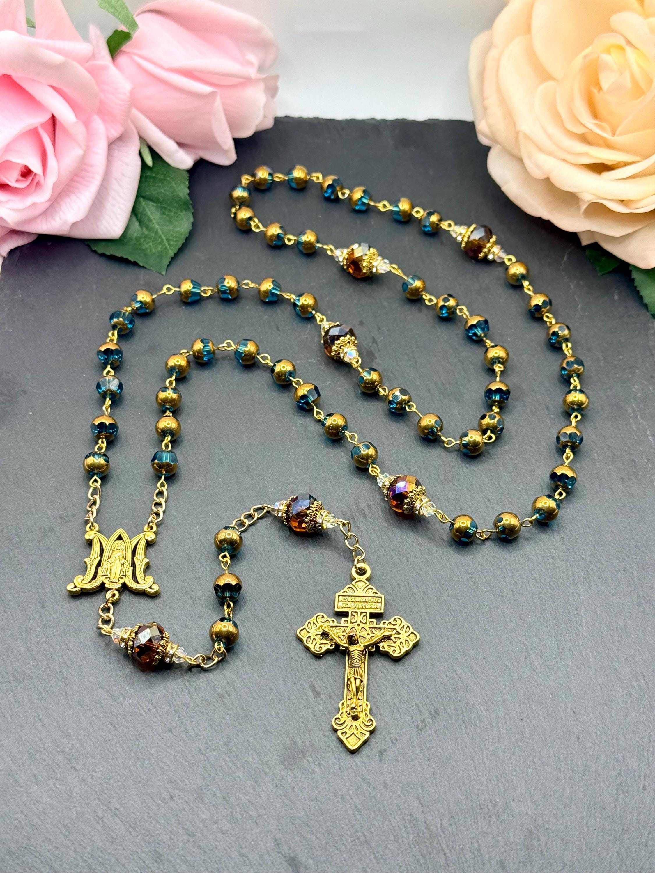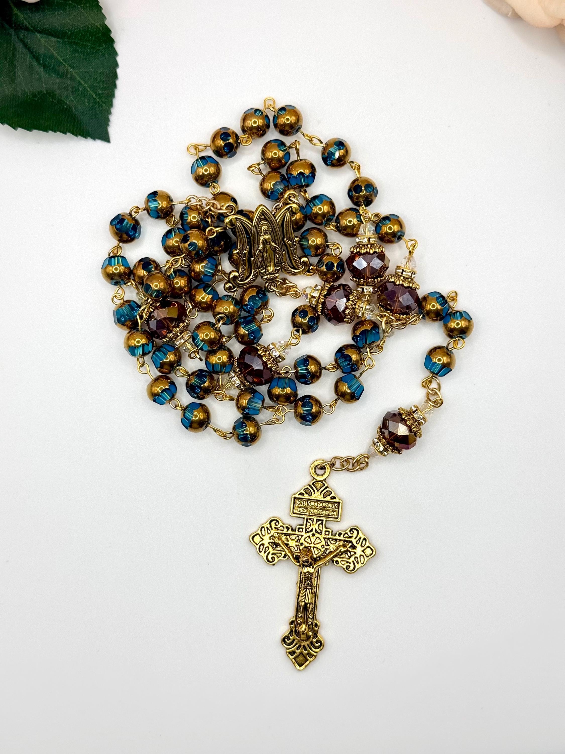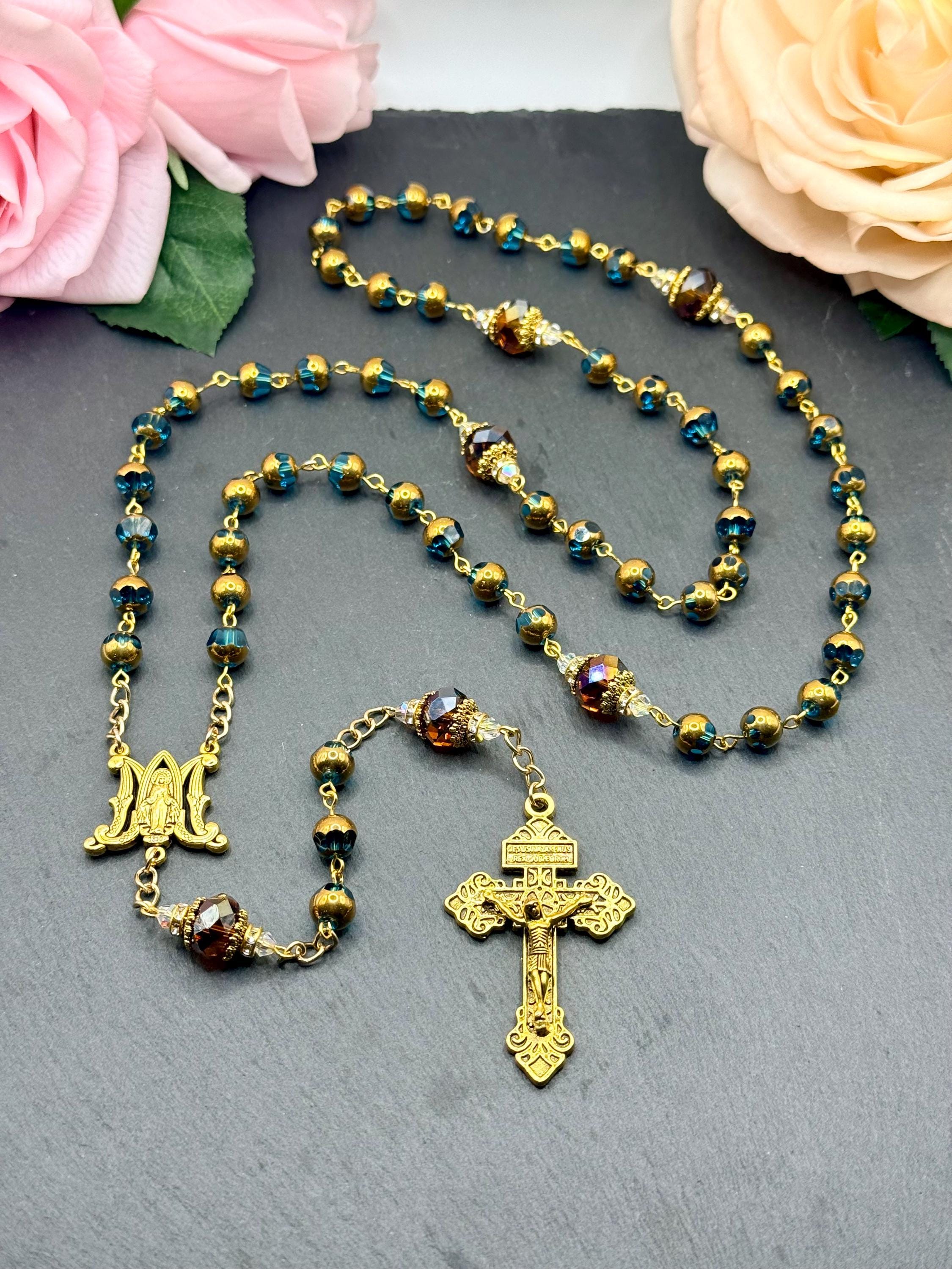Discover the peaceful elegance of this handmade rosary, thoughtfully crafted with gold finish rosary beads, vivid blue glass prayer accents, and warm copper details that inspire deep reflection. Each bead is carefully selected to create a meaningful Catholic faith gift that resonates with devotion and tradition. Adorned with a Virgin Mary medal, this rosary serves as a beautiful companion for prayer and spiritual connection.