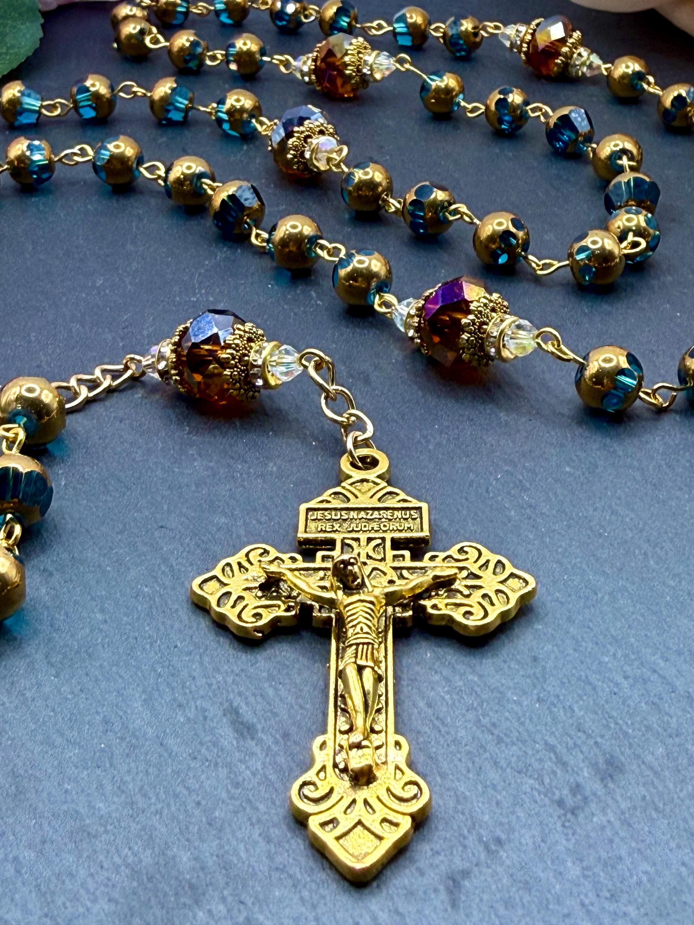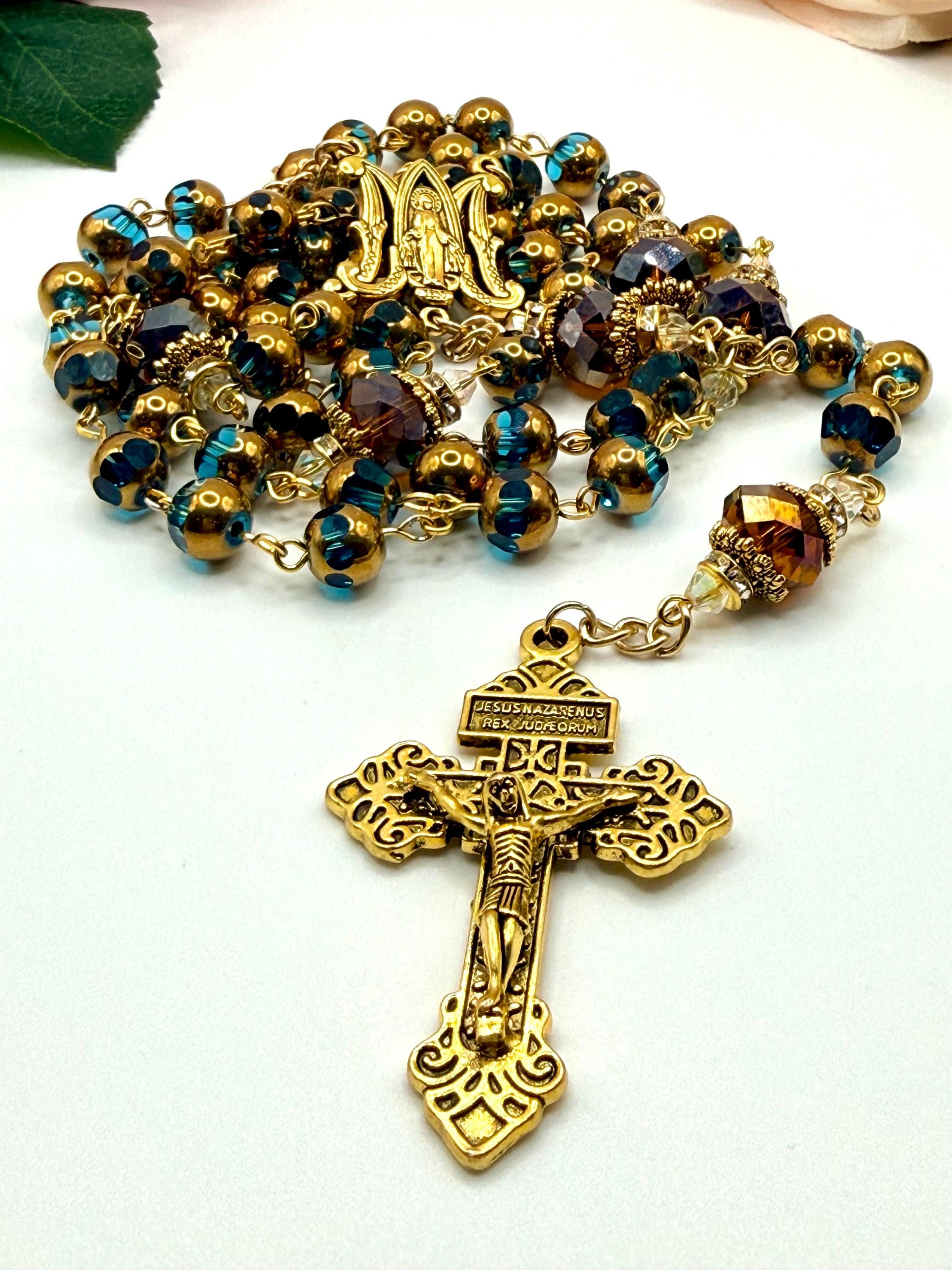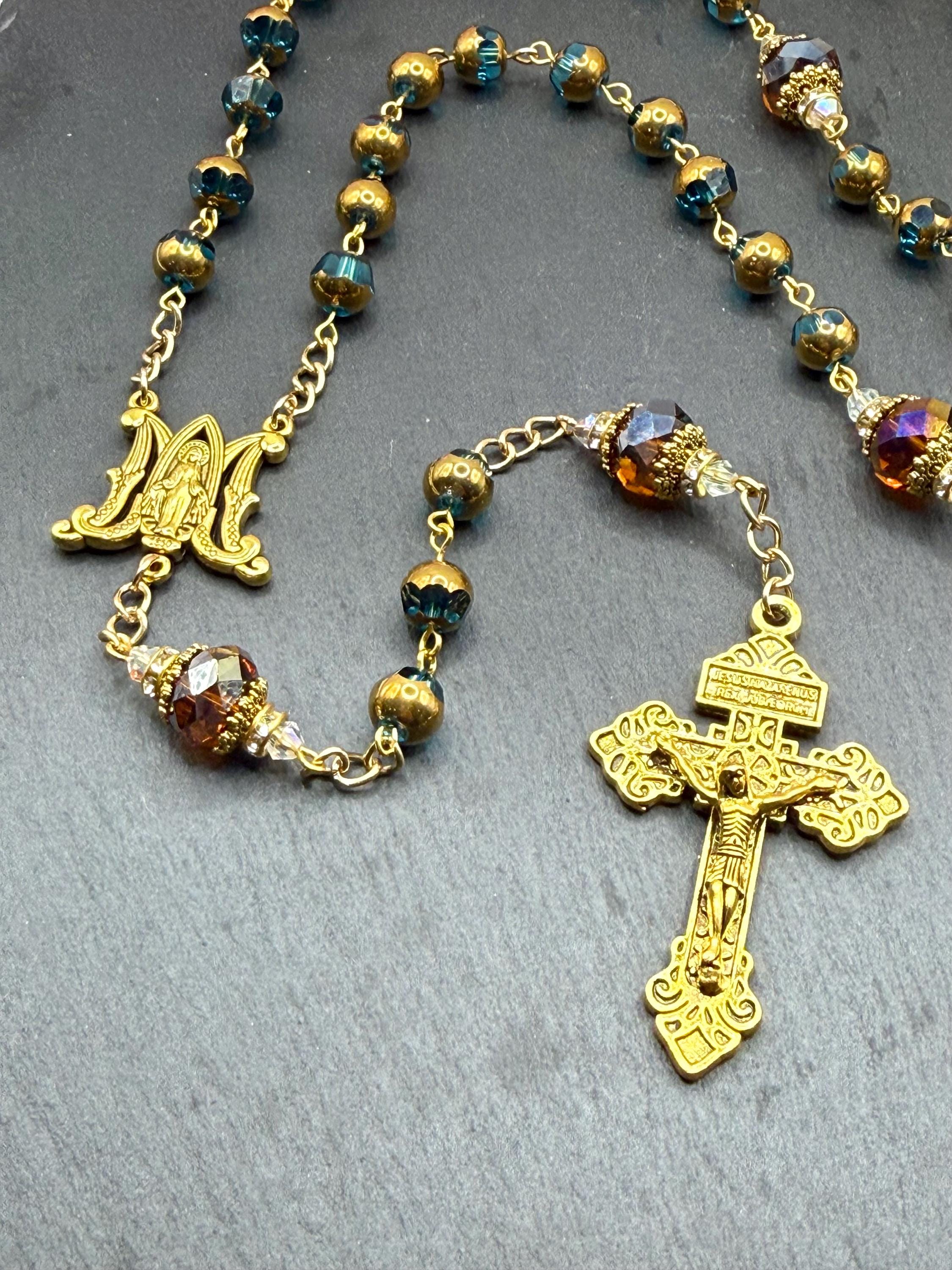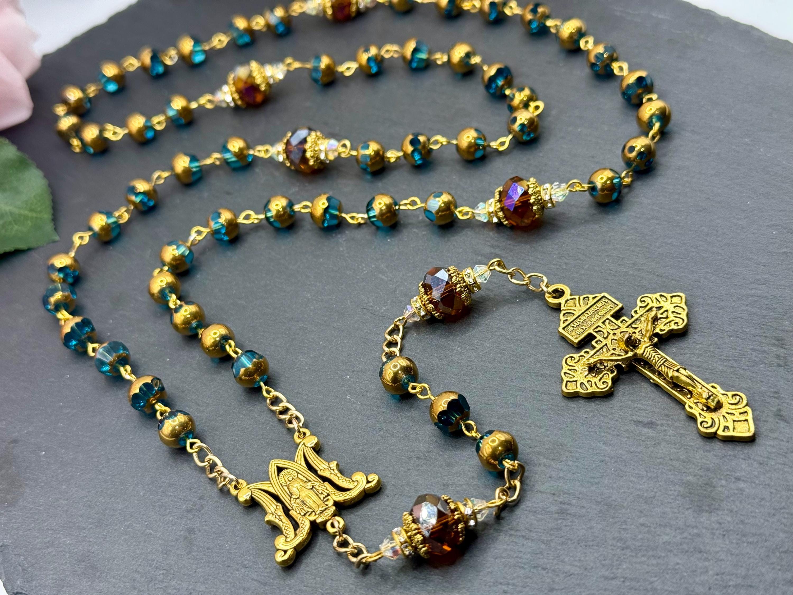 Discover the peaceful elegance of this handmade rosary, thoughtfully crafted with gold finish rosary beads, vivid blue glass prayer accents, and warm copper details that inspire deep reflection. Each bead is carefully selected to create a meaningful Catholic faith gift that resonates with devotion and tradition. Adorned with a Virgin Mary medal, this rosary serves as a beautiful companion for prayer and spiritual connection.