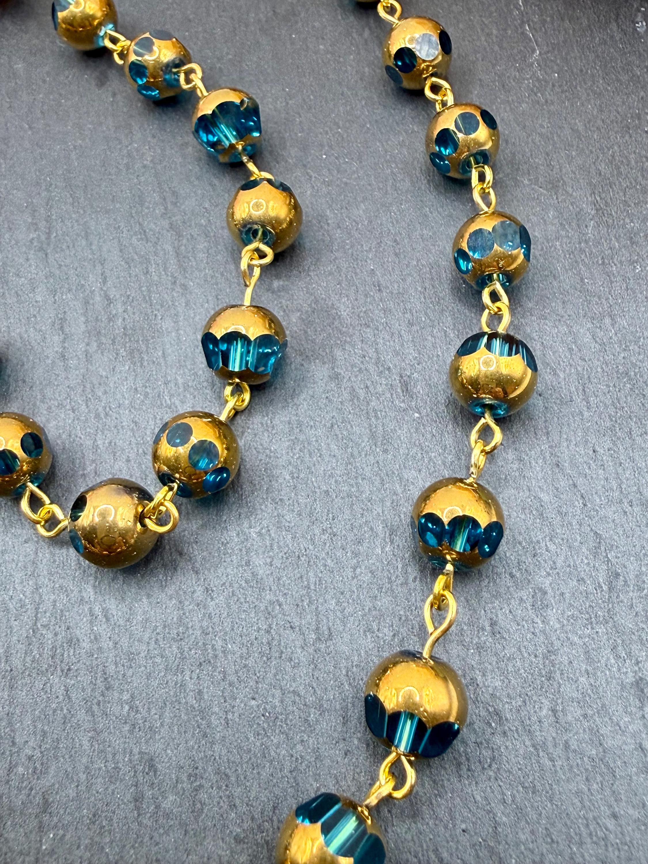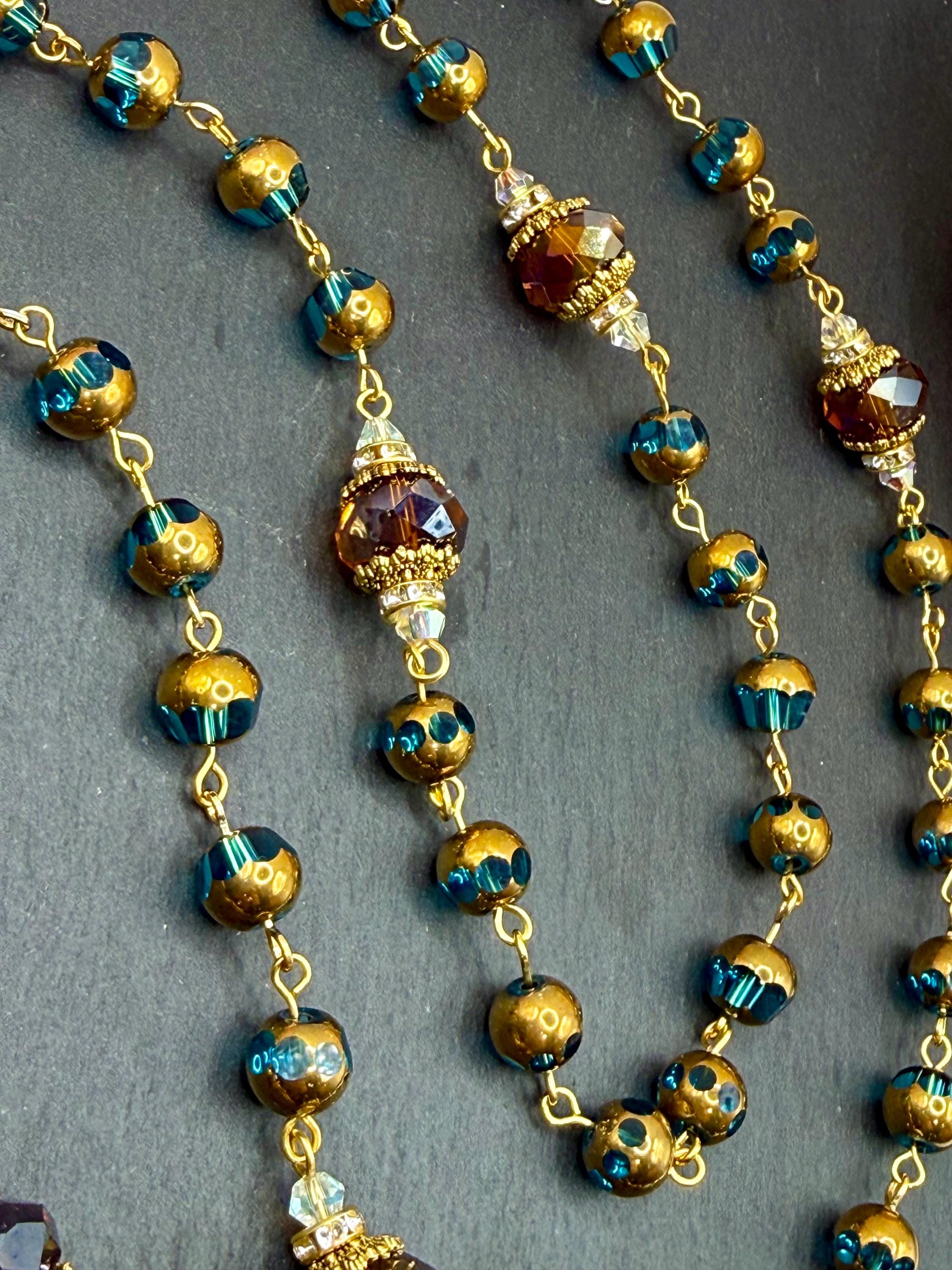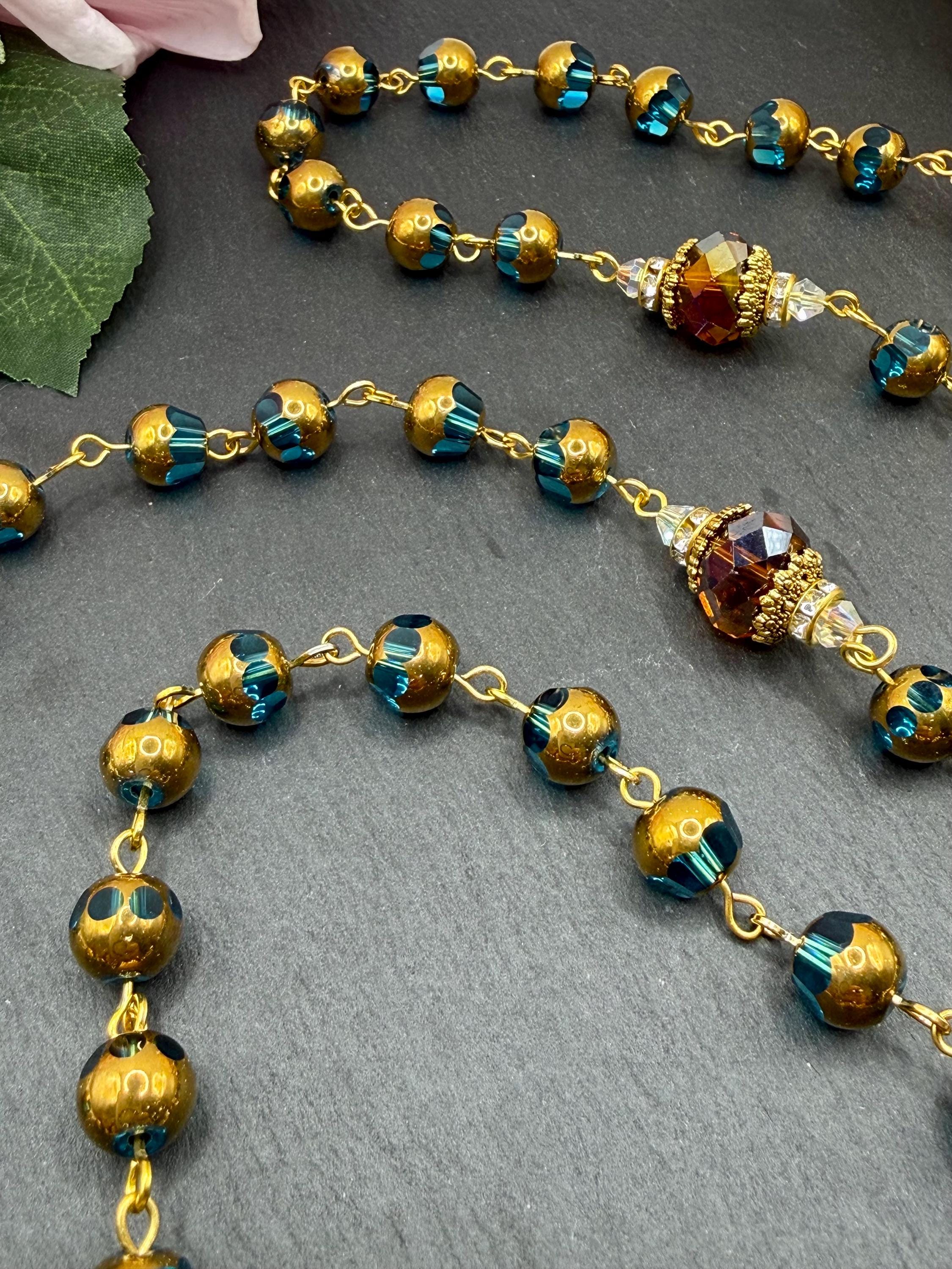 - Handmade gold-colored rosary with blue and copper glass beads