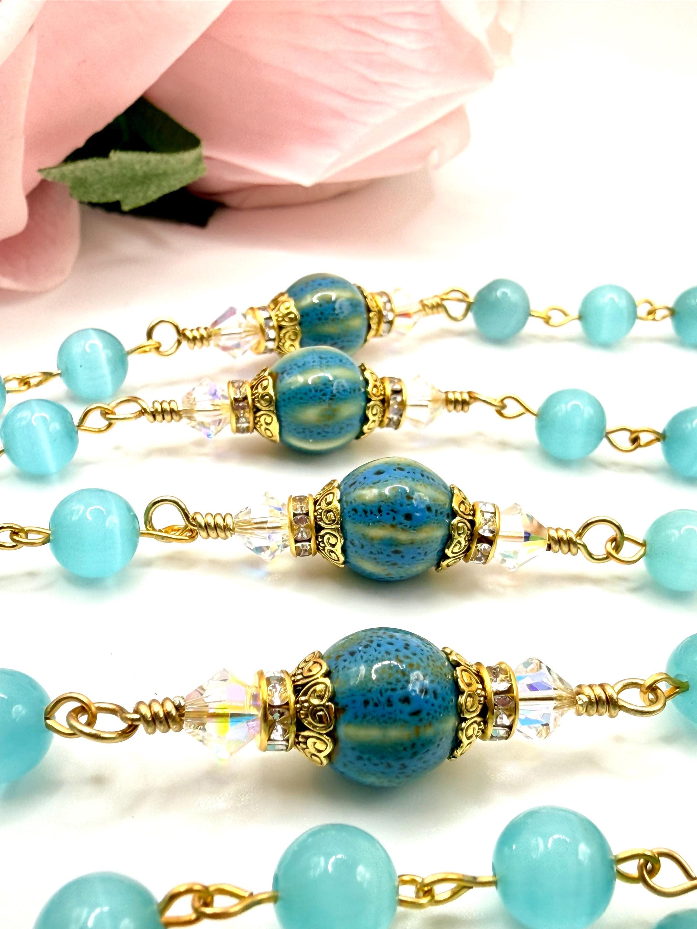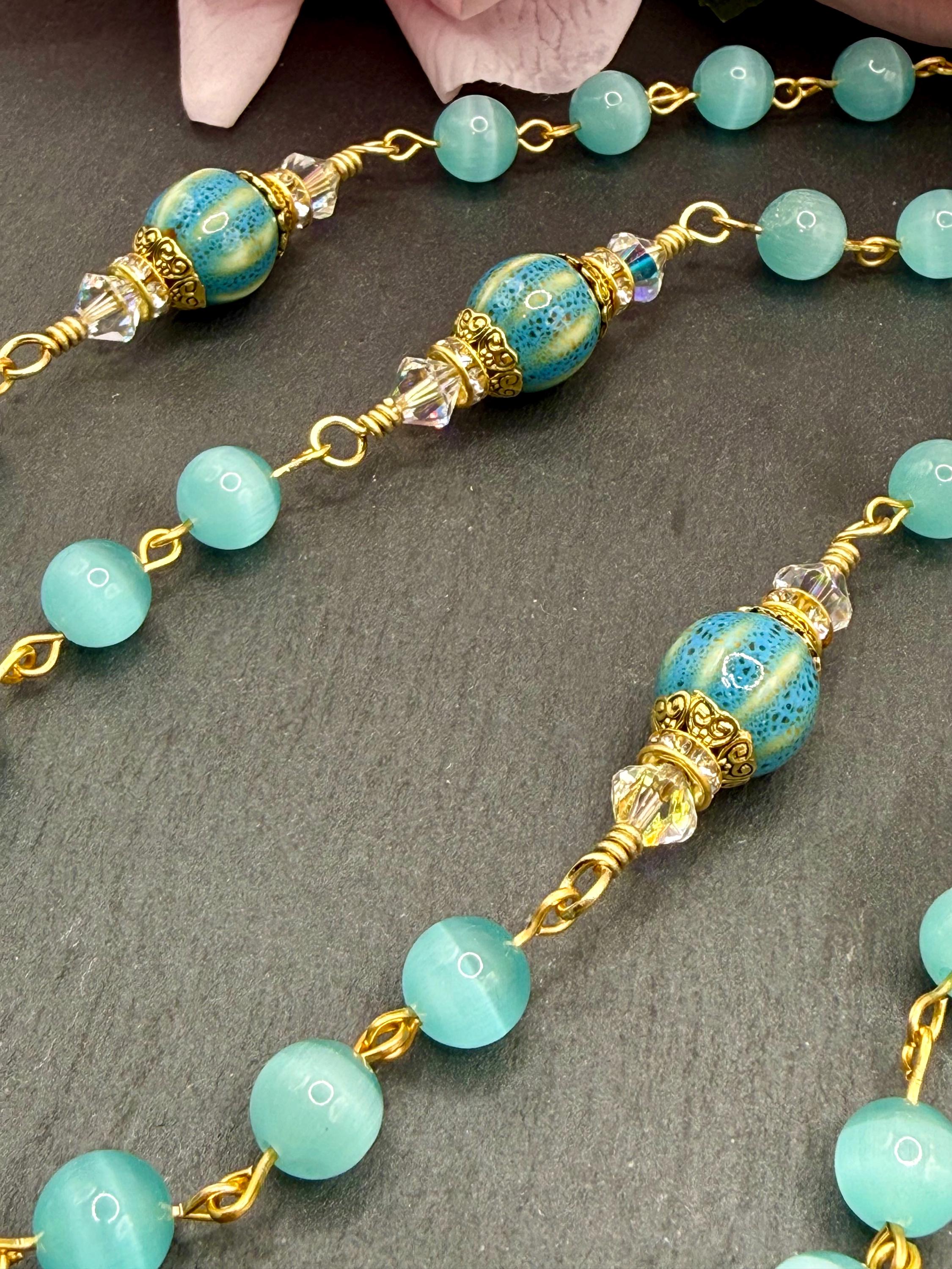- Genuine lake blue cat’s eye gemstone beads known for their clarity and protective qualities