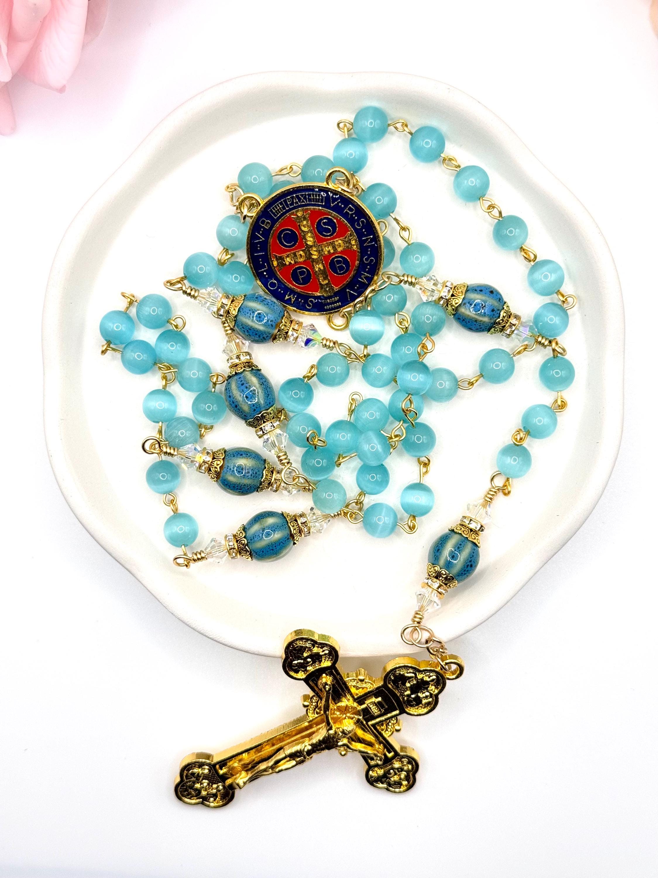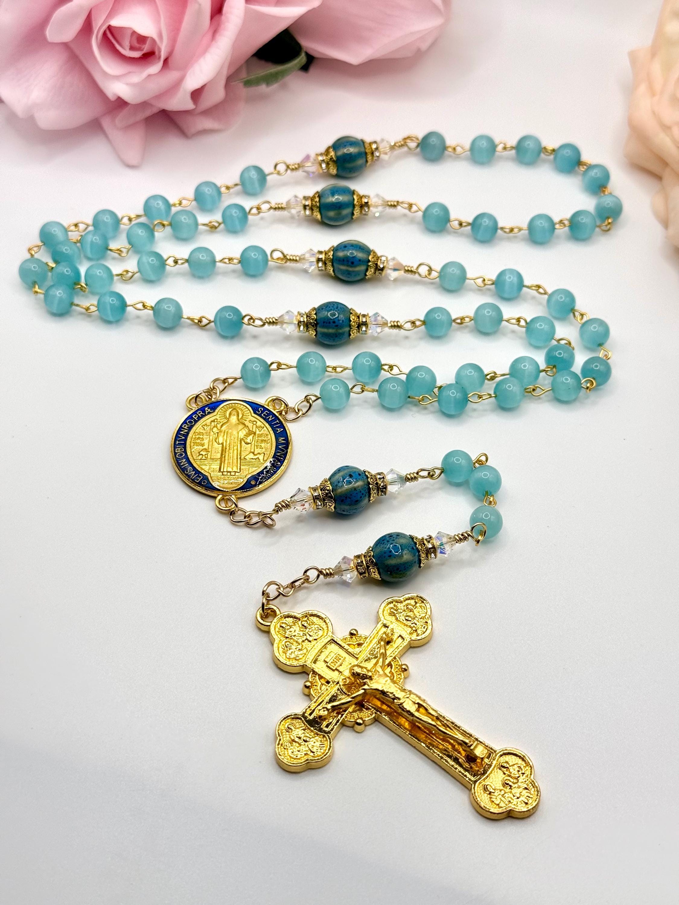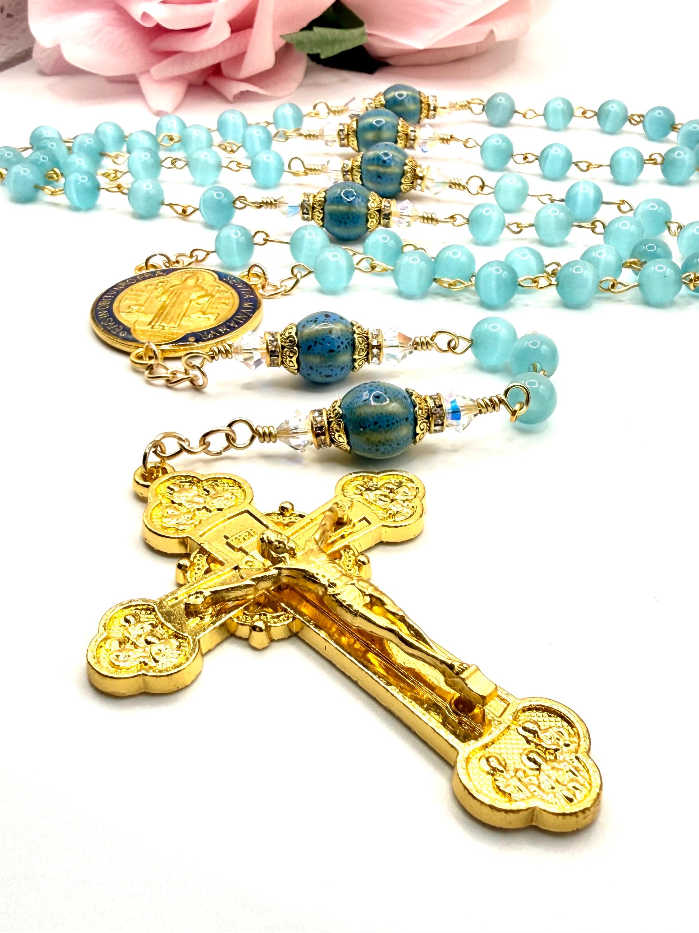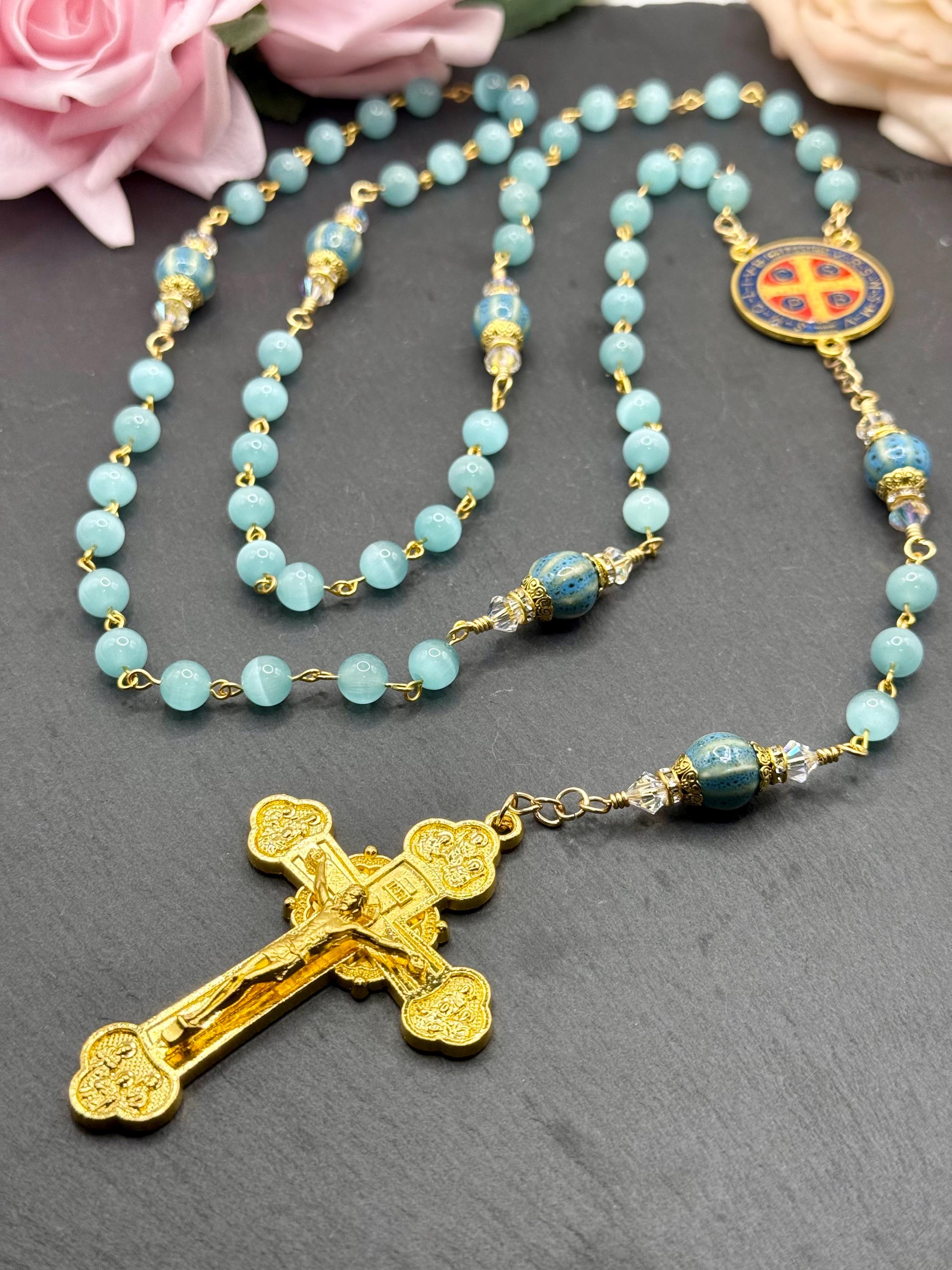 Immerse yourself in a serene moment of prayer with this exquisite rosary, featuring luminous lake blue cats eye beads that inspire calm and spiritual clarity. Crafted with devotion, the design incorporates a radiant 18K gold Saint Benedict Medal and a finely detailed 12 Apostles Crucifix, making it a meaningful symbol of faith and protection. Whether gifted for a special religious occasion or cherished for personal devotion, this rosary beautifully blends artistry and sacred tradition.