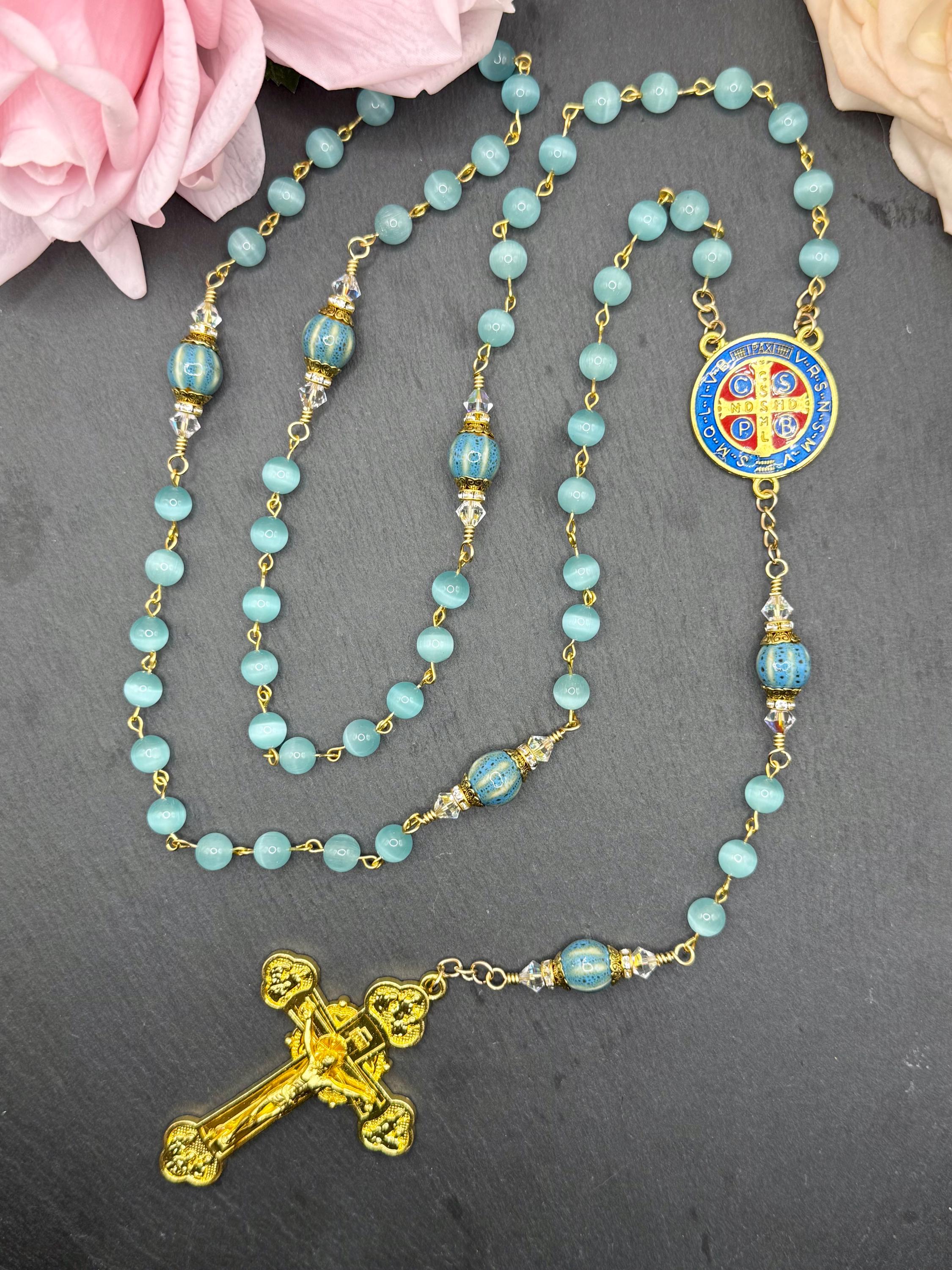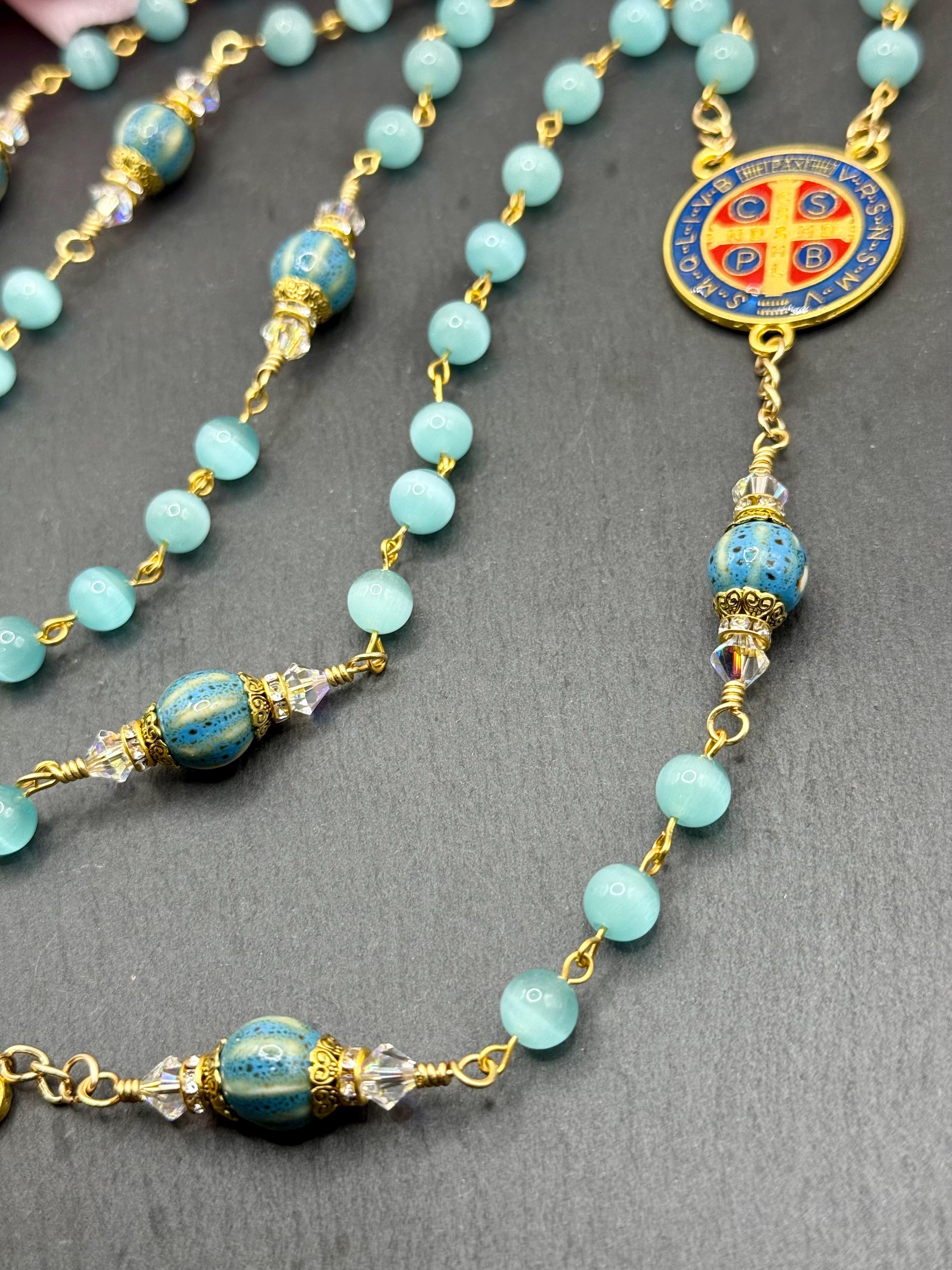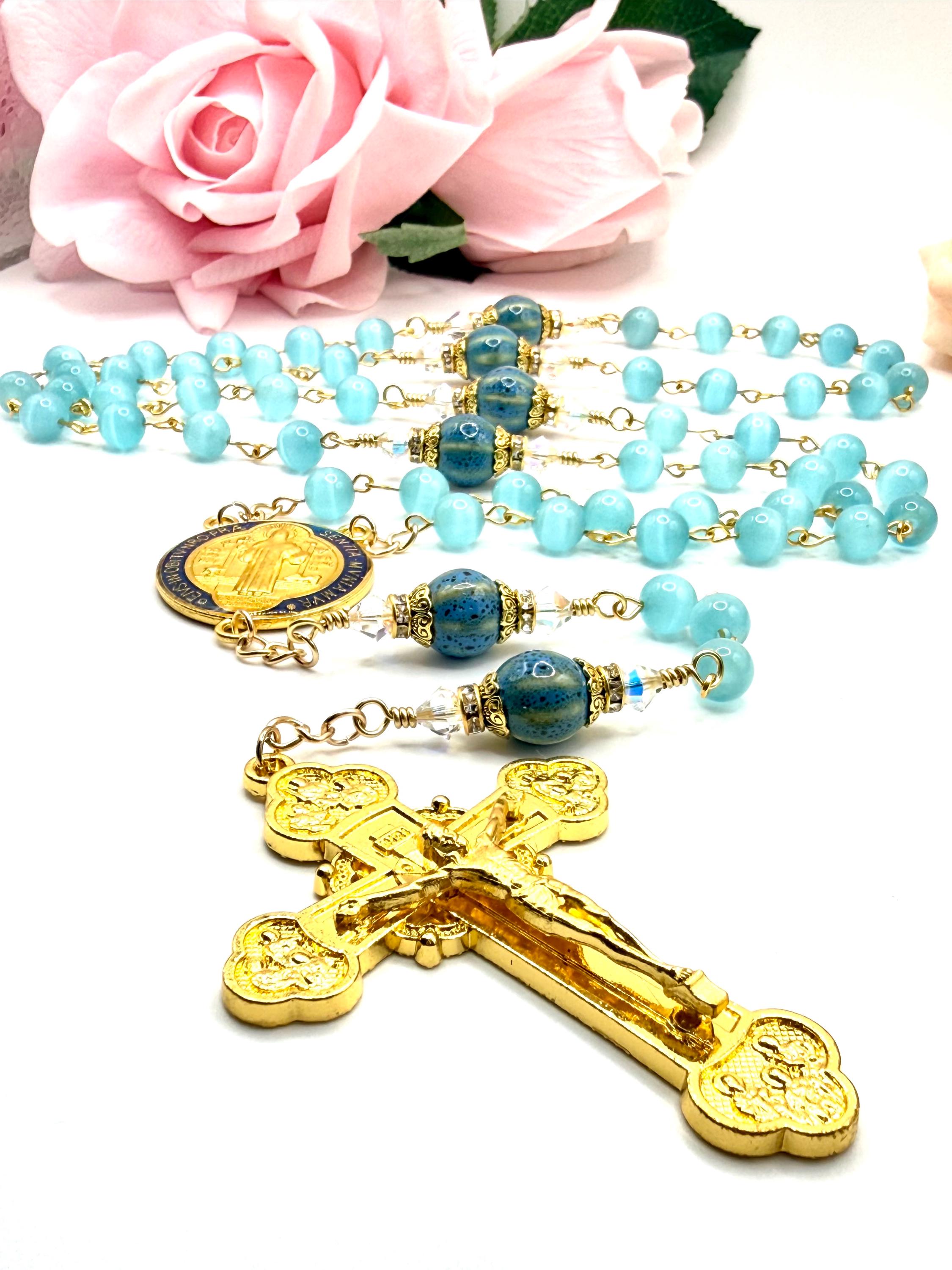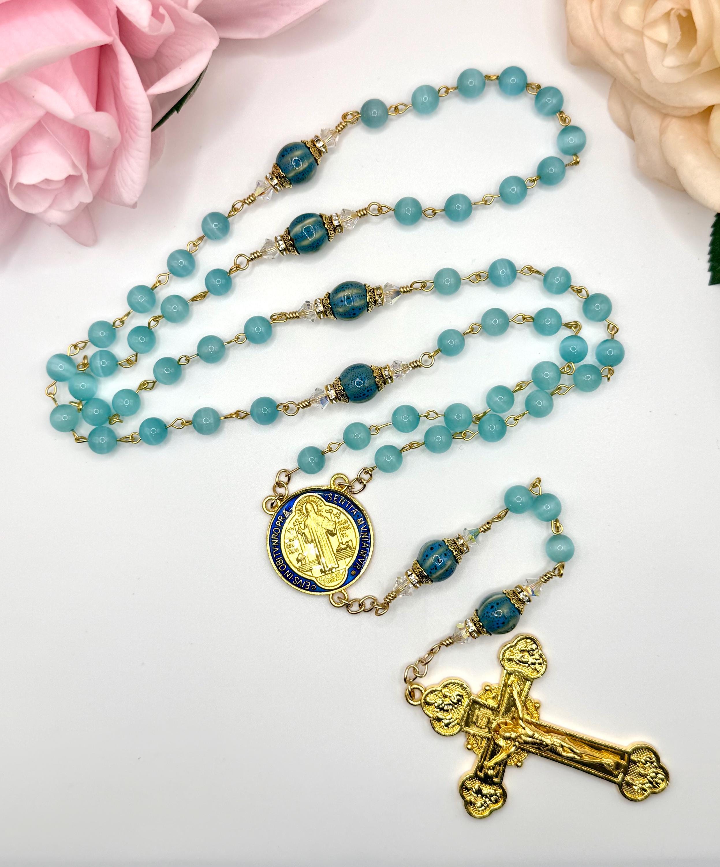 Immerse yourself in a serene moment of prayer with this exquisite rosary, featuring luminous lake blue cats eye beads that inspire calm and spiritual clarity. Crafted with devotion, the design incorporates a radiant 18K gold Saint Benedict Medal and a finely detailed 12 Apostles Crucifix, making it a meaningful symbol of faith and protection. Whether gifted for a special religious occasion or cherished for personal devotion, this rosary beautifully blends artistry and sacred tradition.