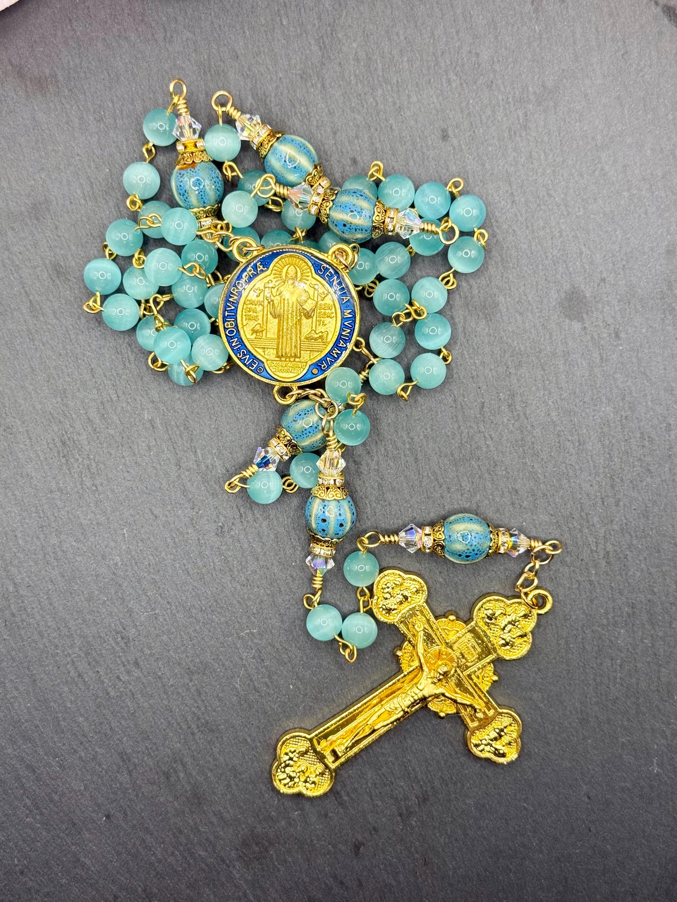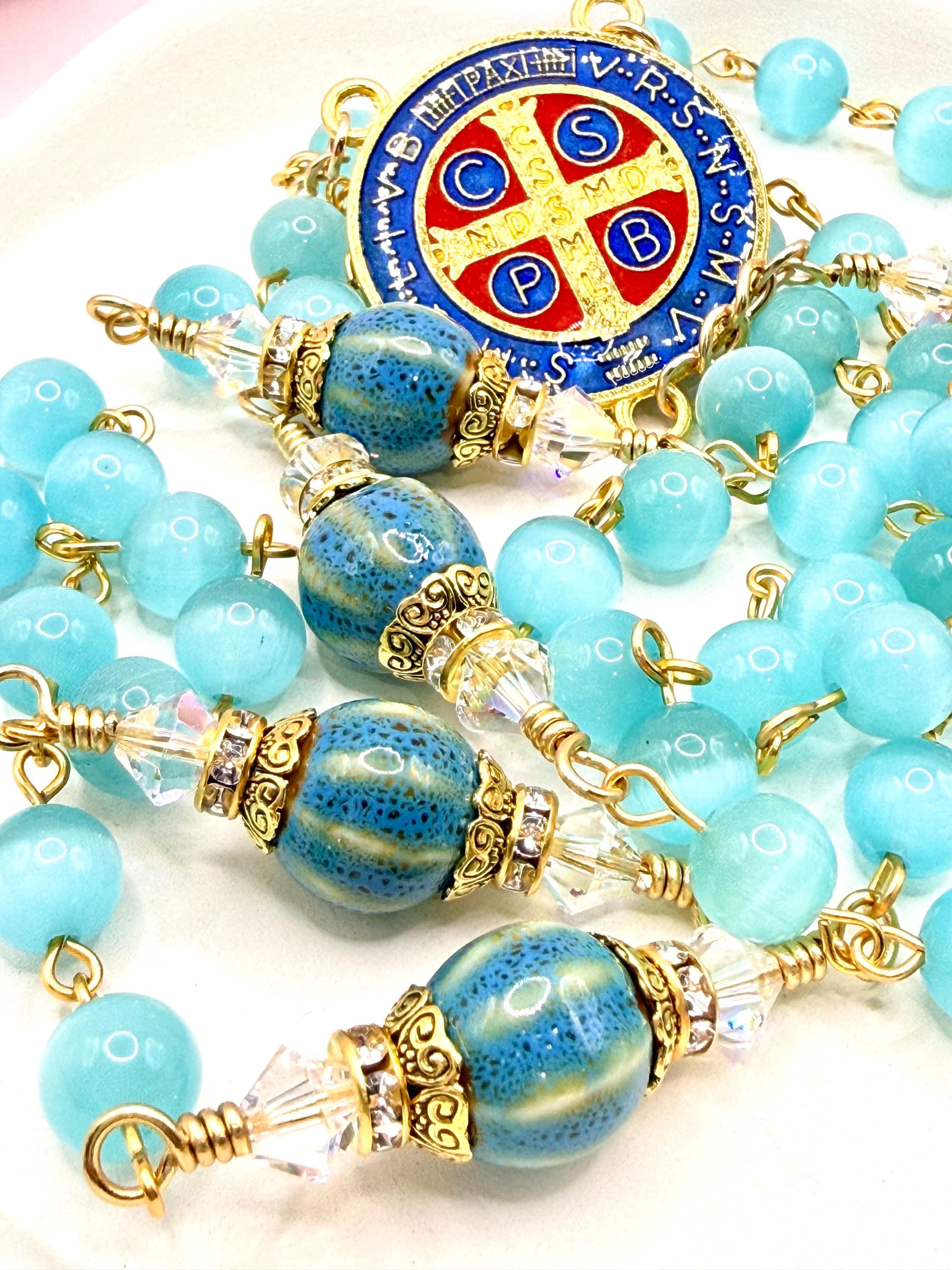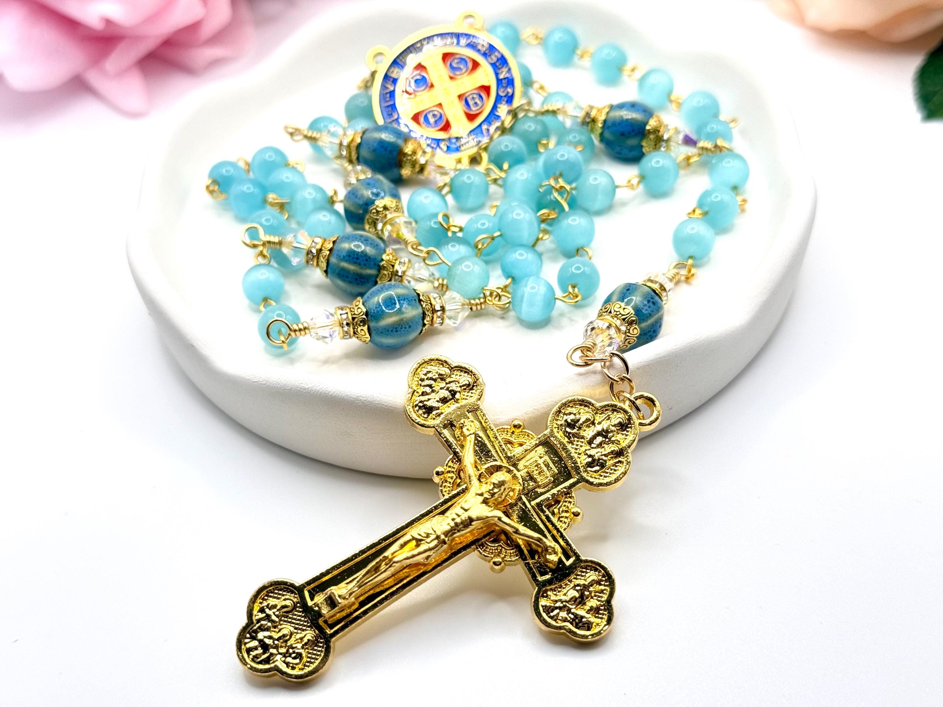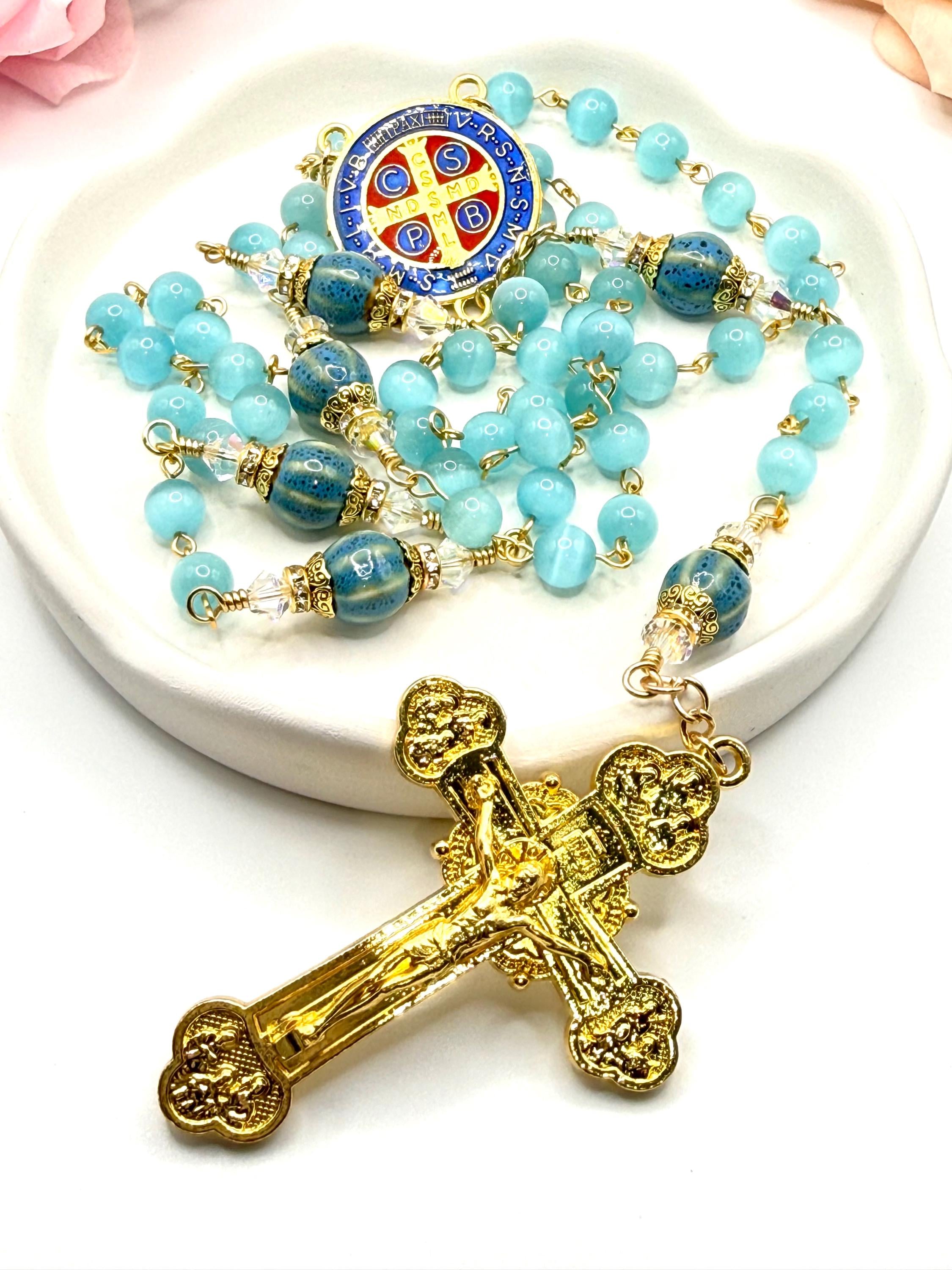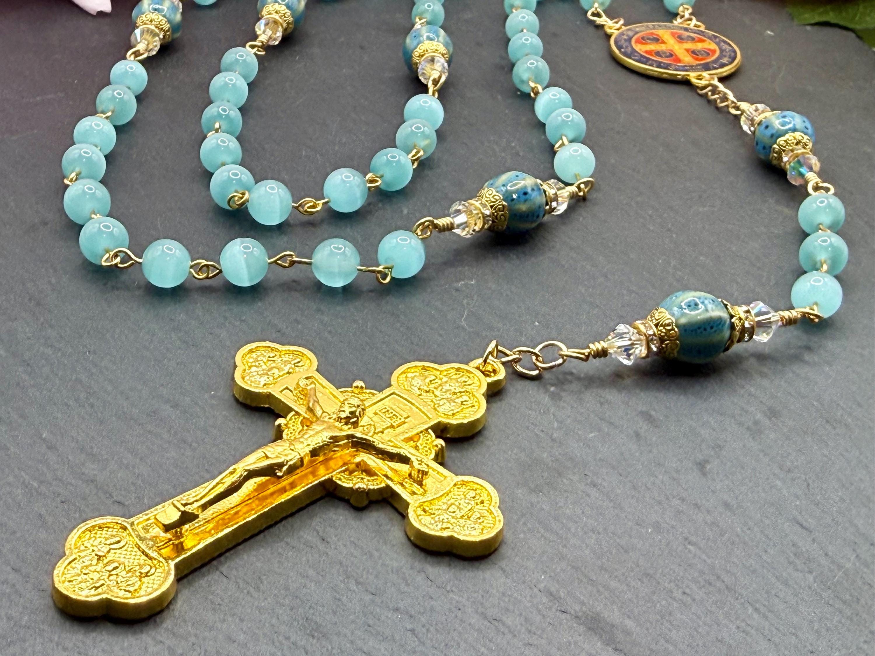 Immerse yourself in a serene moment of prayer with this exquisite rosary, featuring luminous lake blue cats eye beads that inspire calm and spiritual clarity. Crafted with devotion, the design incorporates a radiant 18K gold Saint Benedict Medal and a finely detailed 12 Apostles Crucifix, making it a meaningful symbol of faith and protection. Whether gifted for a special religious occasion or cherished for personal devotion, this rosary beautifully blends artistry and sacred tradition.