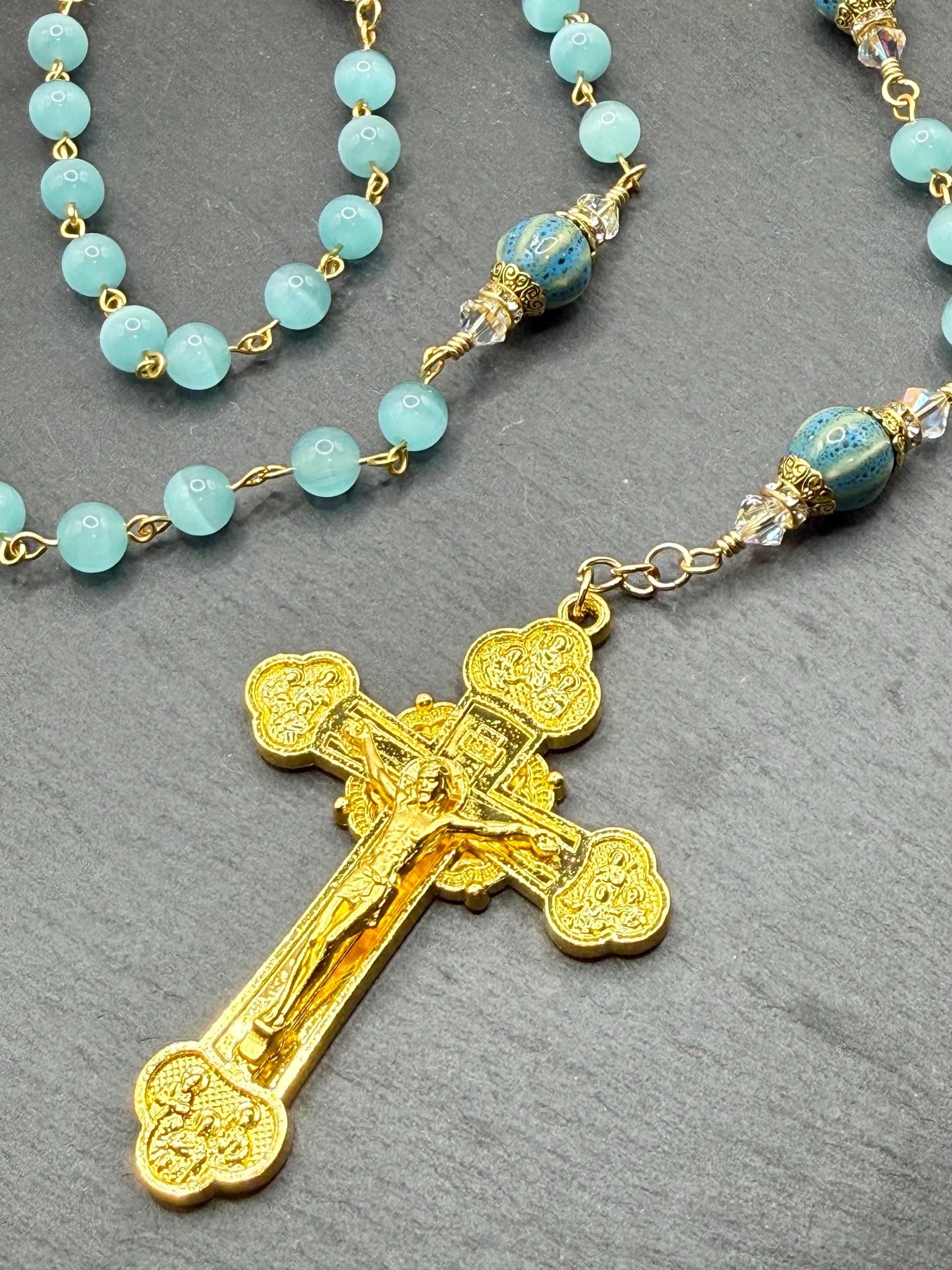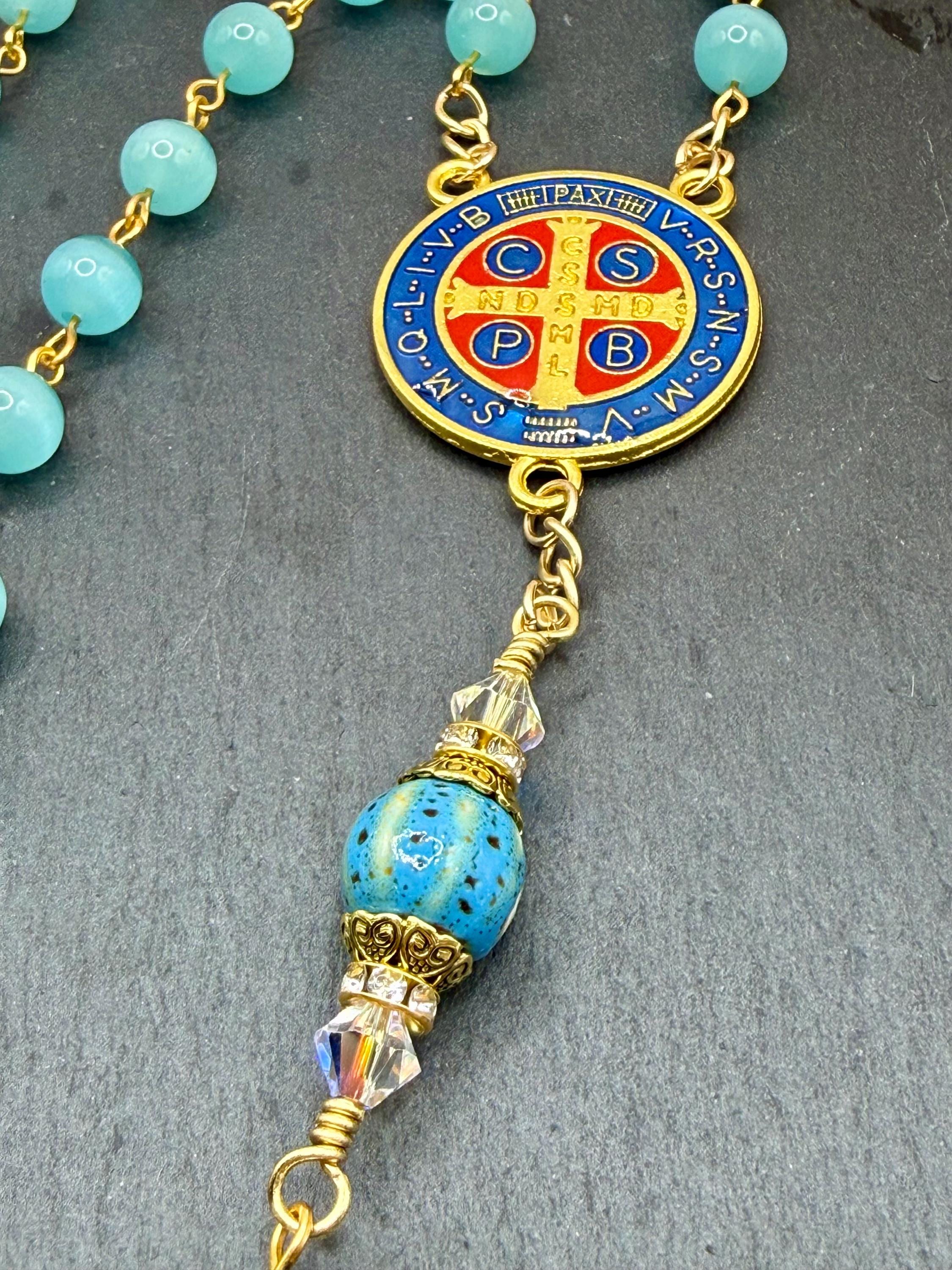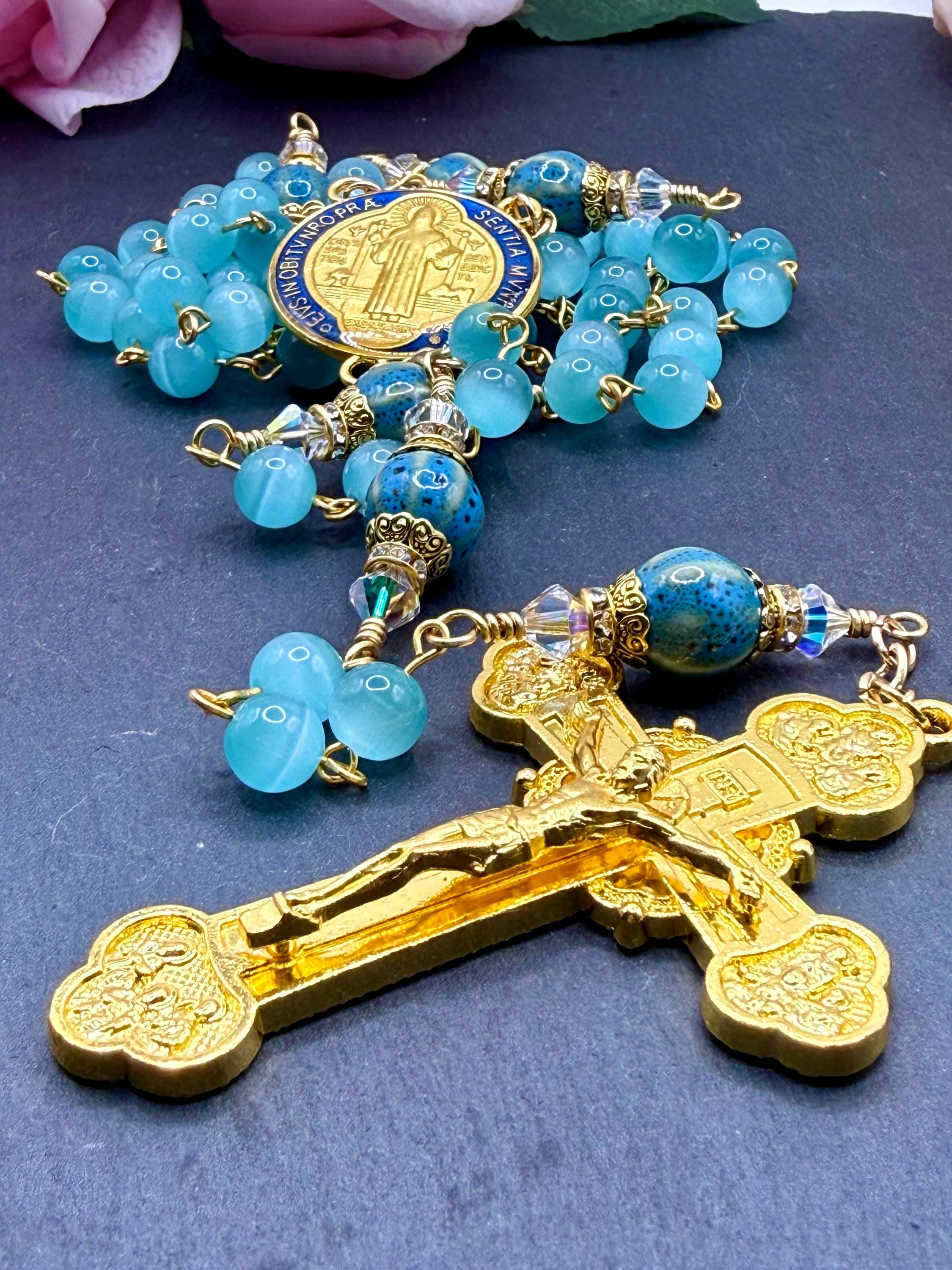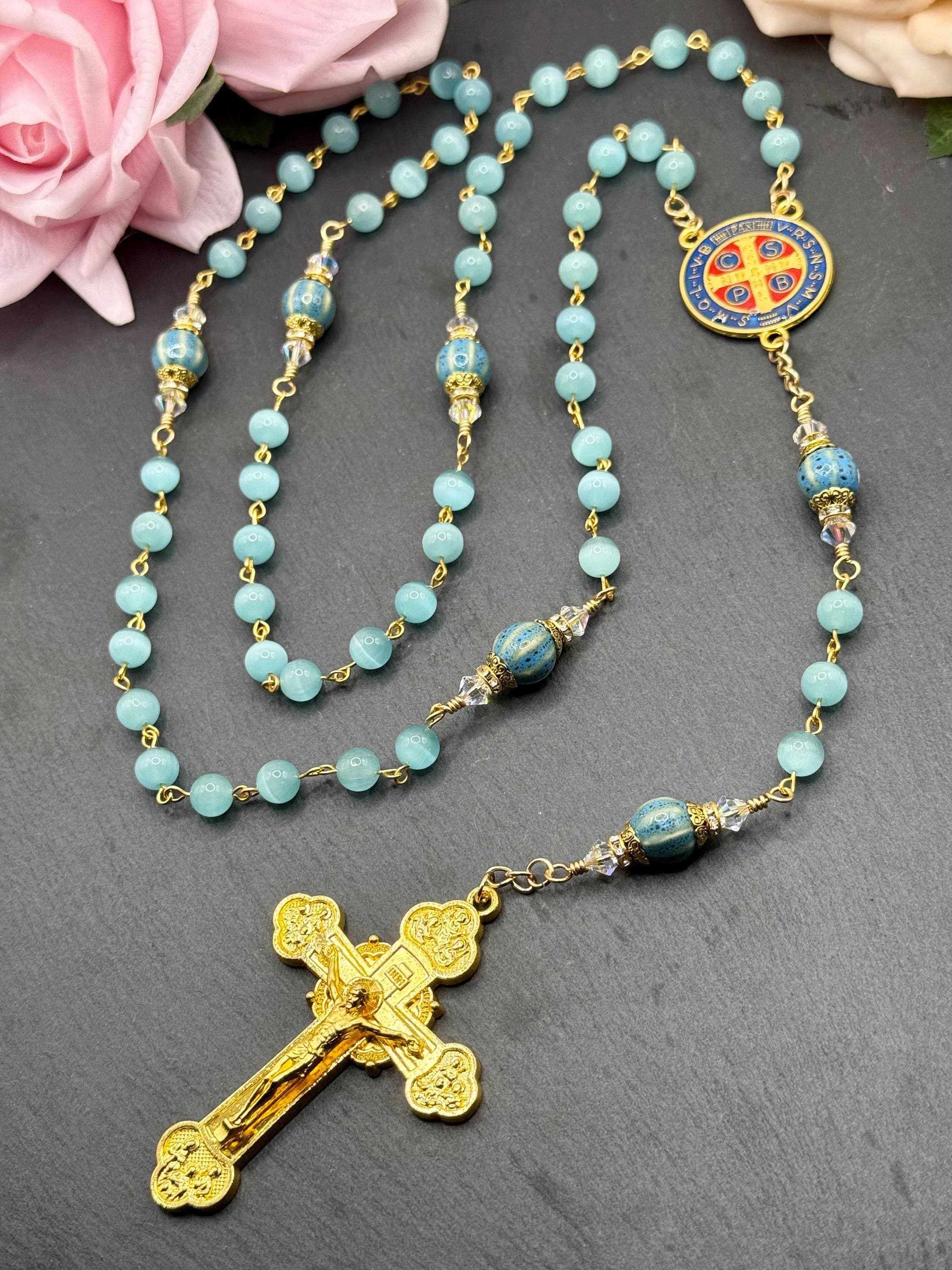 Immerse yourself in a serene moment of prayer with this exquisite rosary, featuring luminous lake blue cats eye beads that inspire calm and spiritual clarity. Crafted with devotion, the design incorporates a radiant 18K gold Saint Benedict Medal and a finely detailed 12 Apostles Crucifix, making it a meaningful symbol of faith and protection. Whether gifted for a special religious occasion or cherished for personal devotion, this rosary beautifully blends artistry and sacred tradition.