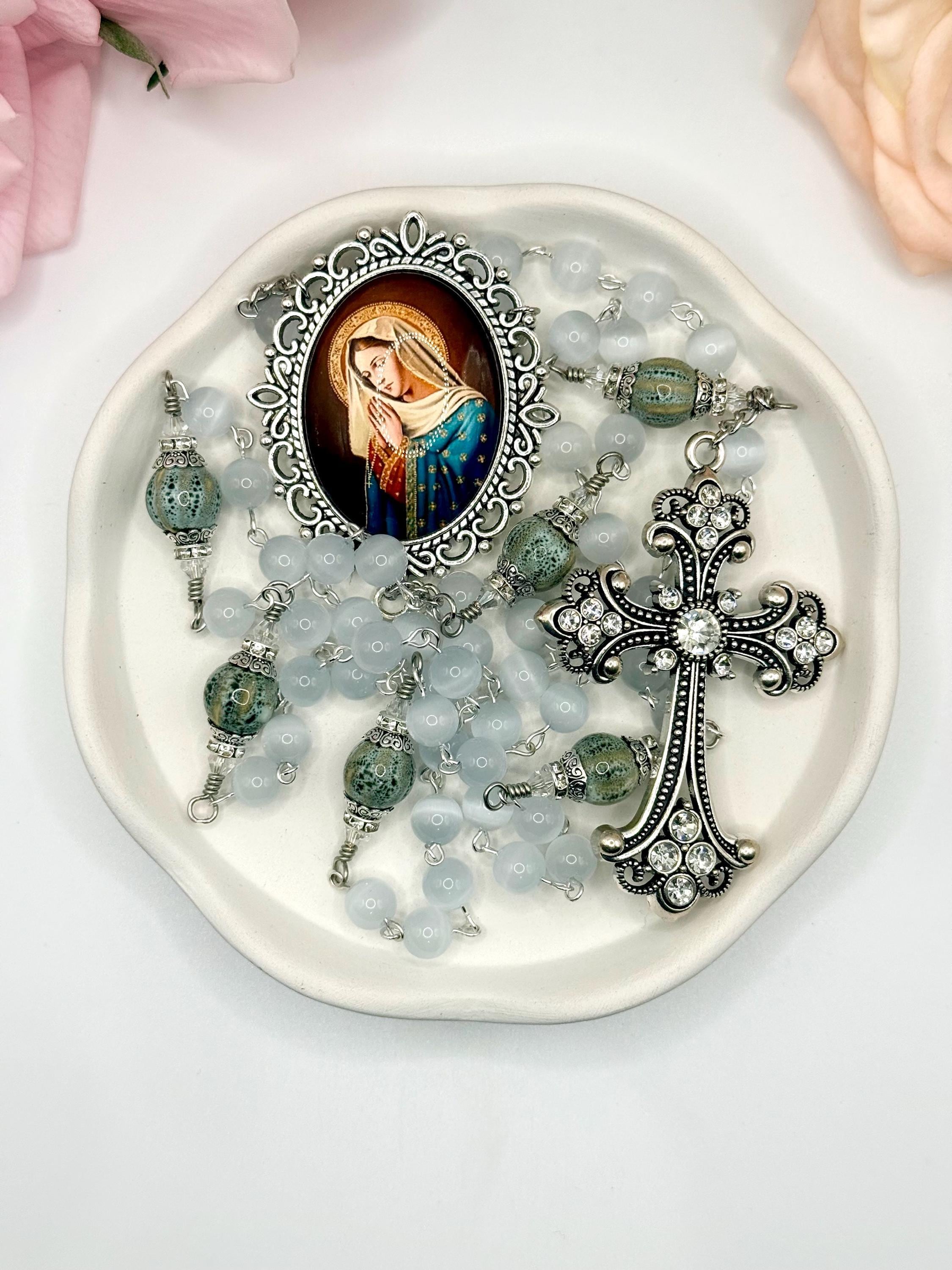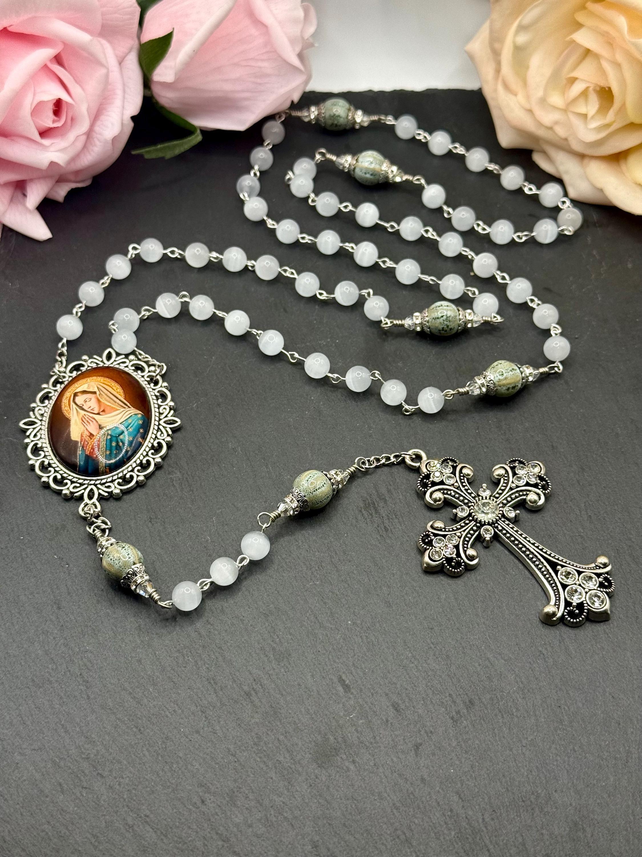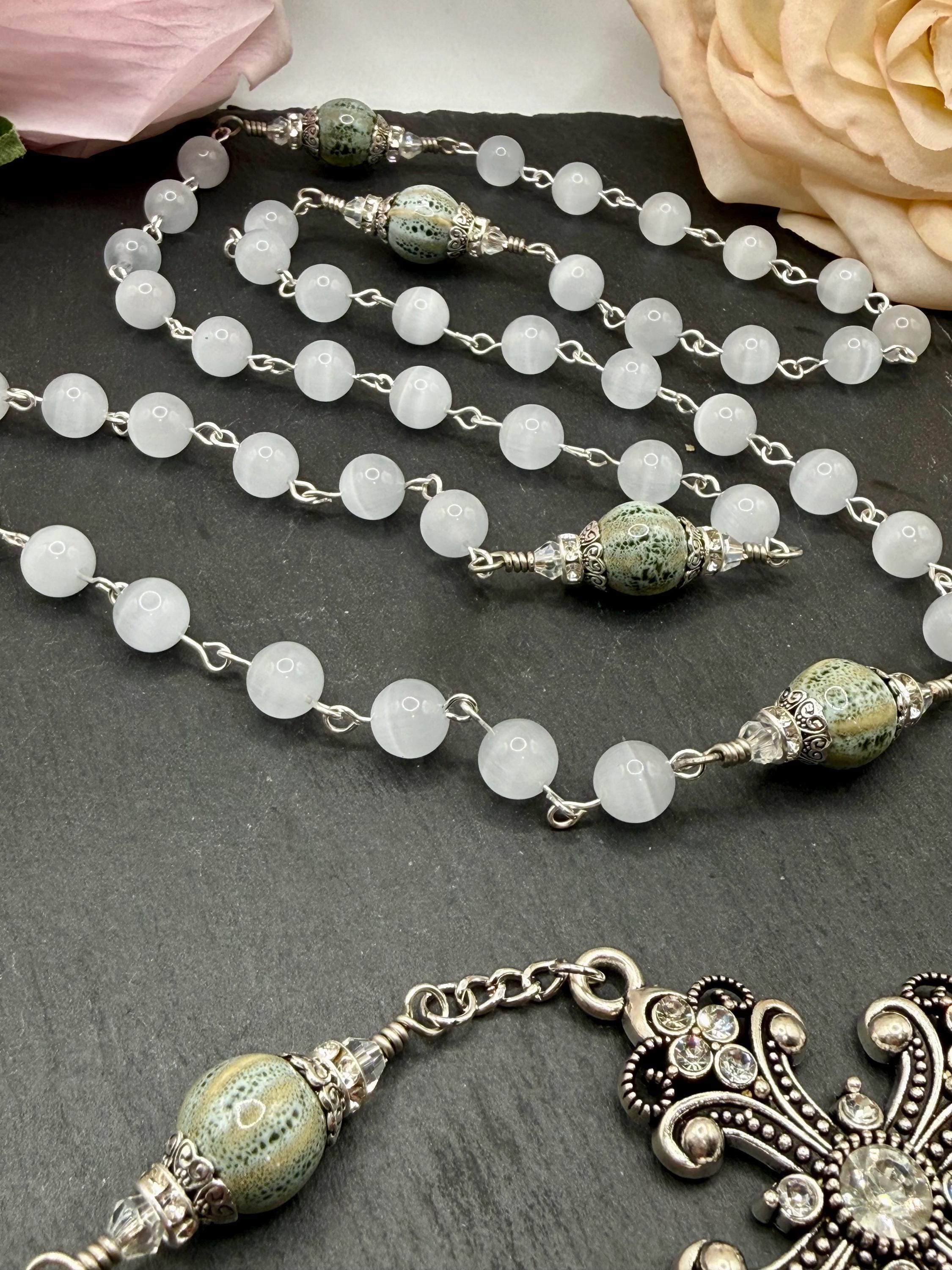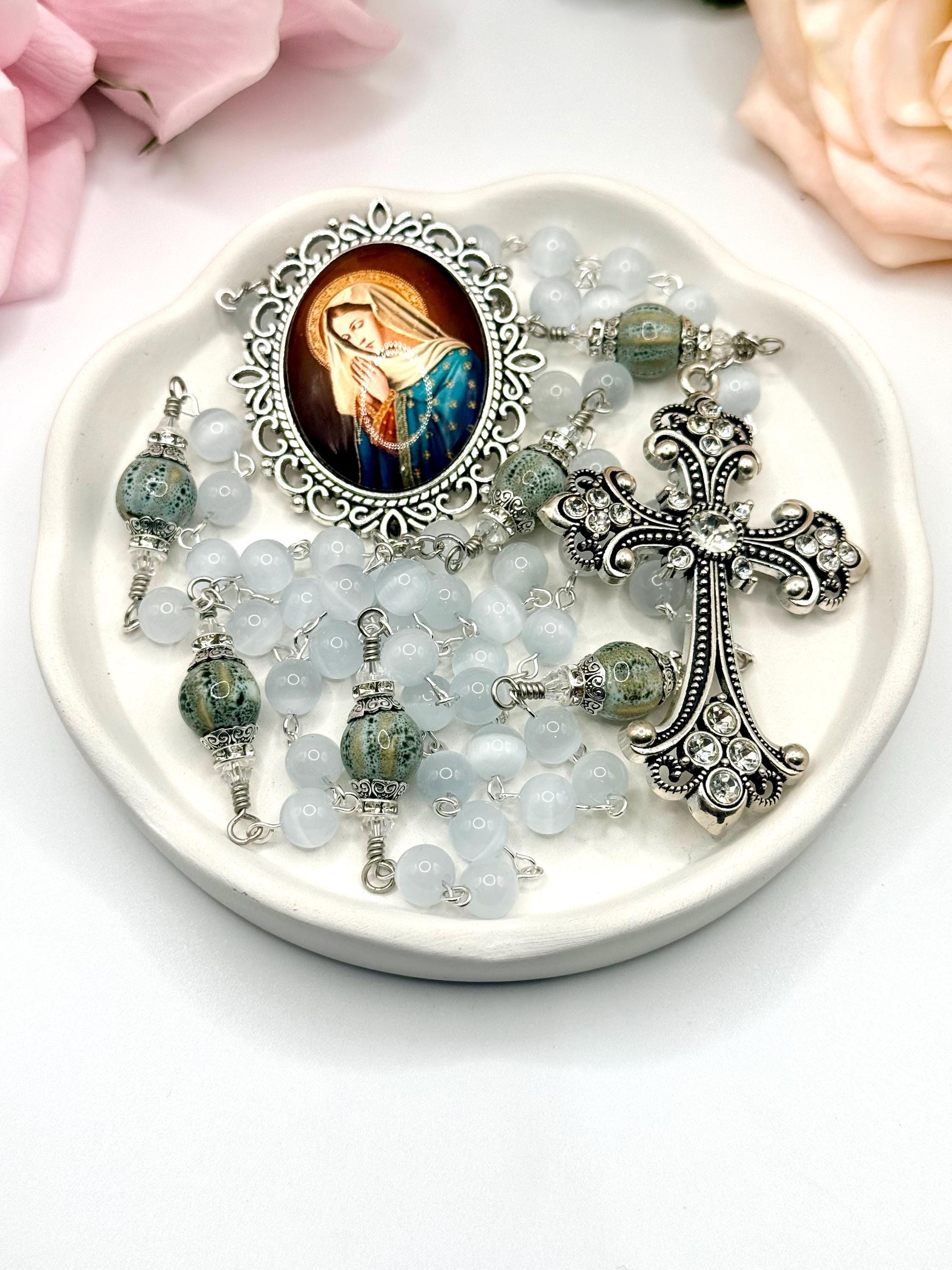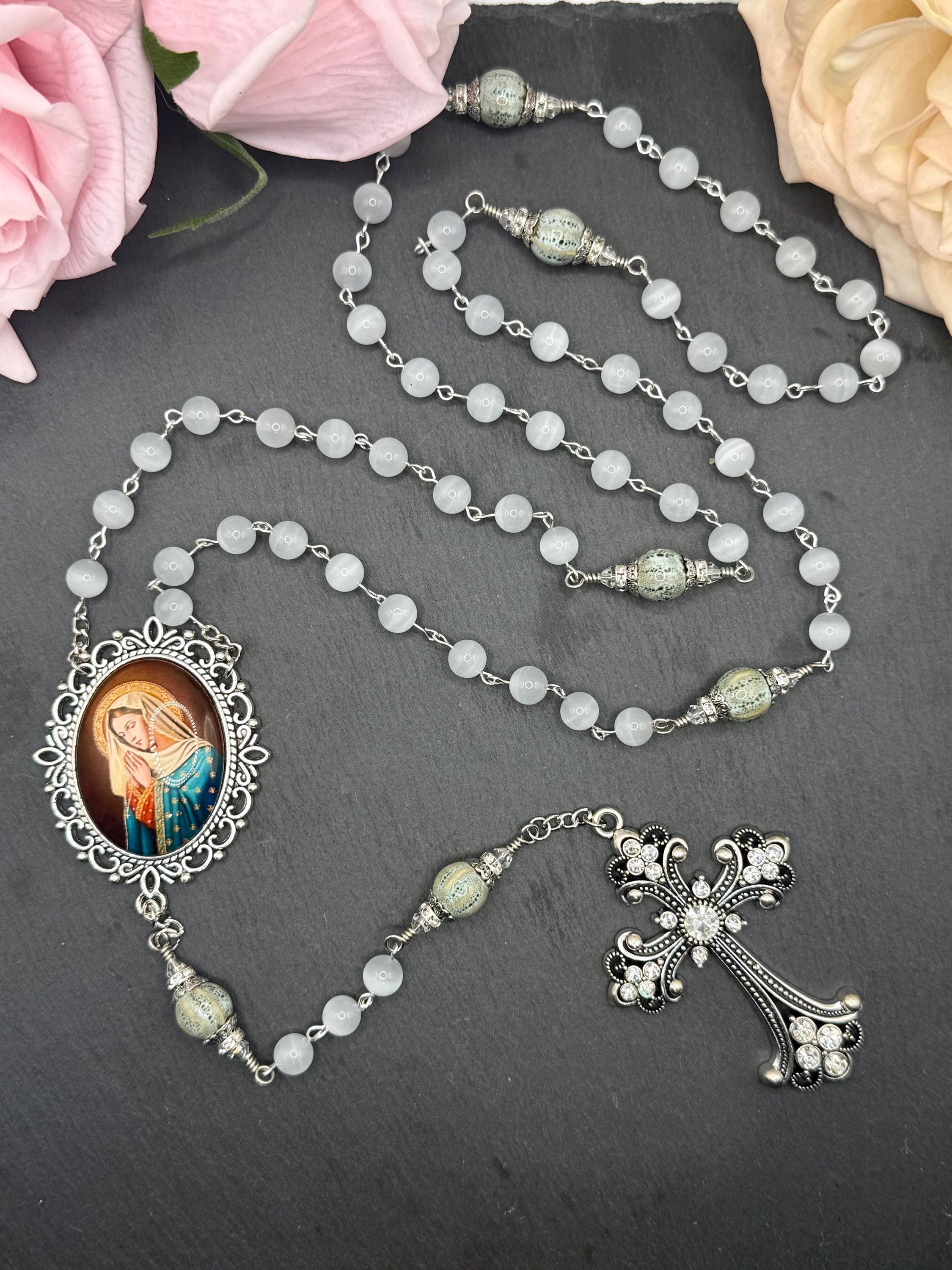 Discover the serene beauty of this handmade antique silver rosary, thoughtfully crafted with luminous white cats eye beads and distinctive ceramic Our Father beads. Each bead is carefully selected to create a meaningful prayer experience, blending tradition with unique artistry. This five decade rosary is perfect for those seeking a Catholic gift idea that combines elegance and devotion.