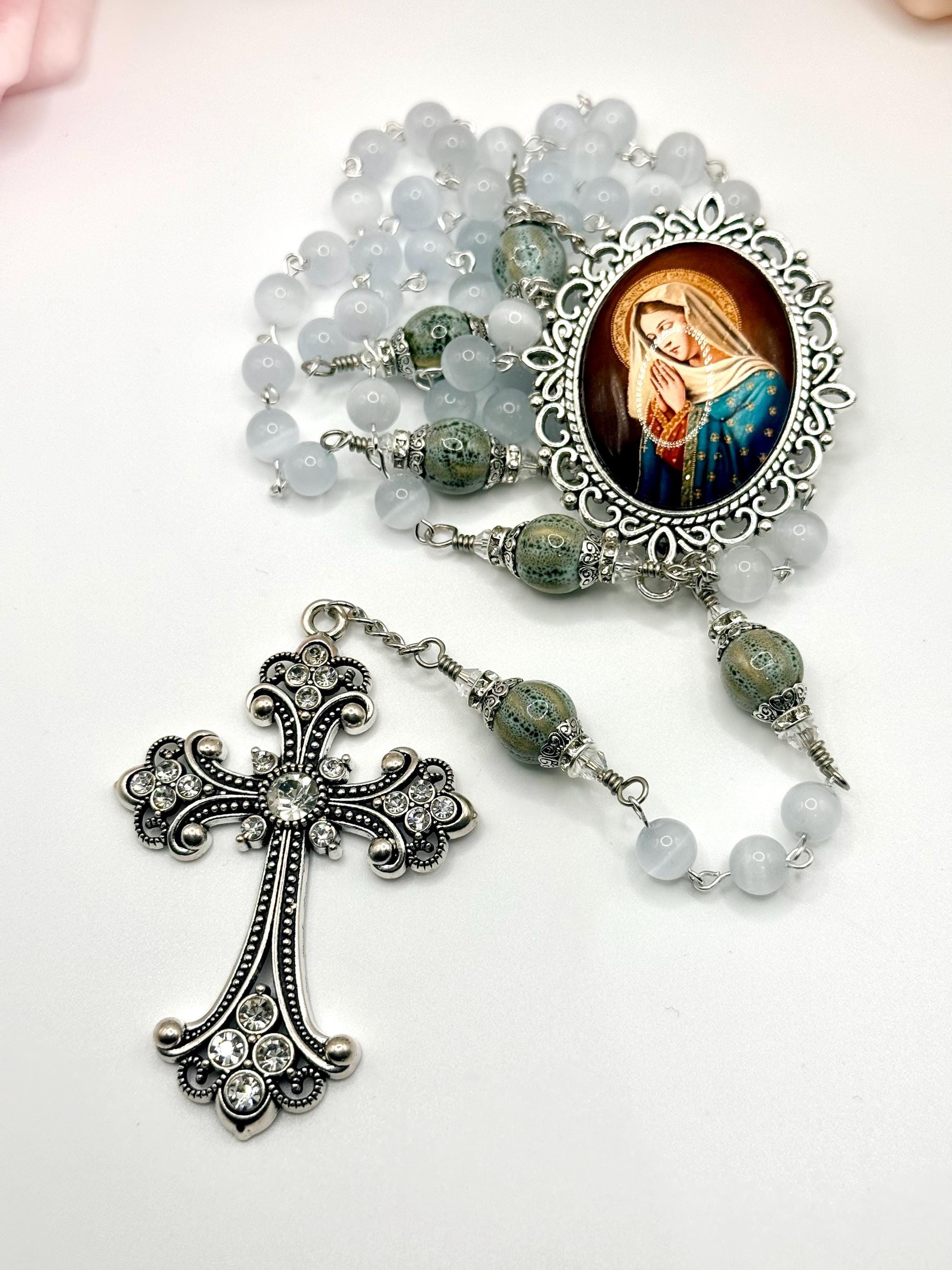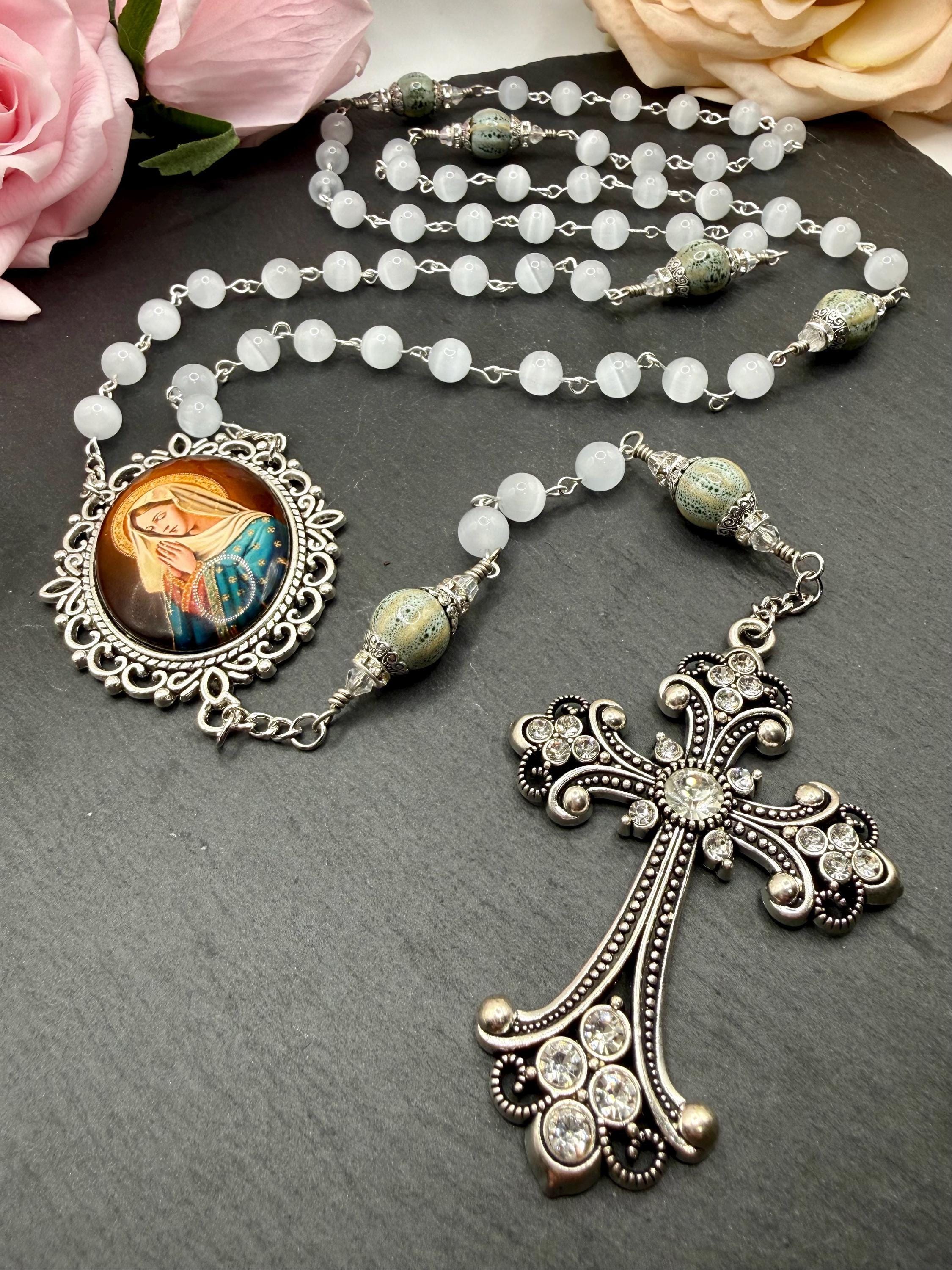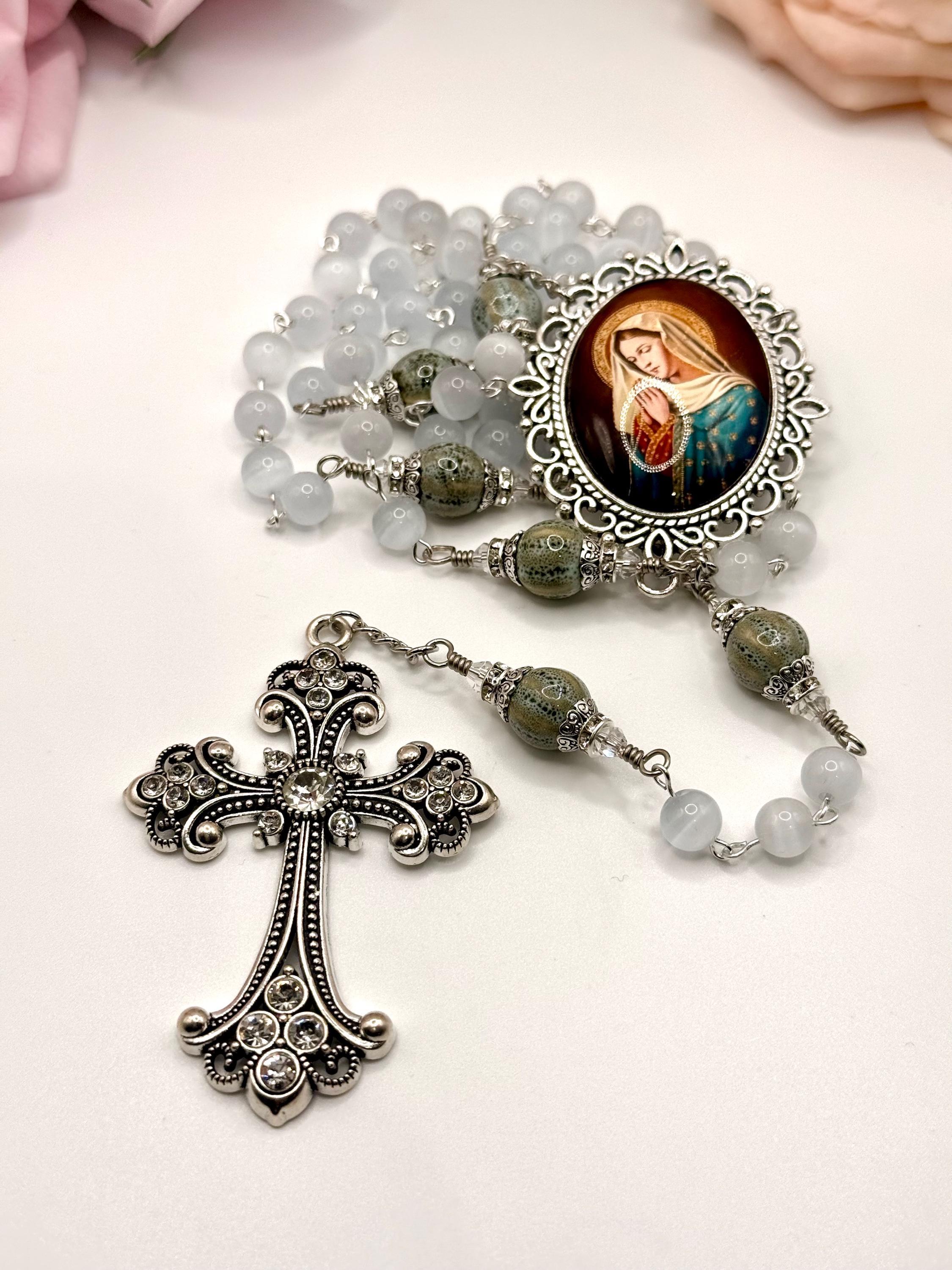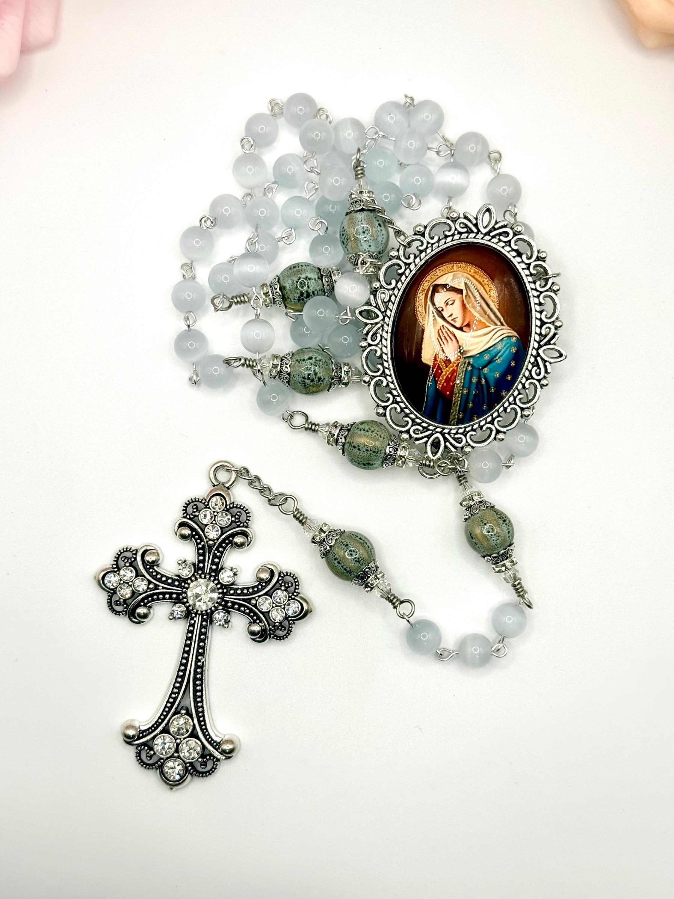 Discover the serene beauty of this handmade antique silver rosary, thoughtfully crafted with luminous white cats eye beads and distinctive ceramic Our Father beads. Each bead is carefully selected to create a meaningful prayer experience, blending tradition with unique artistry. This five decade rosary is perfect for those seeking a Catholic gift idea that combines elegance and devotion.