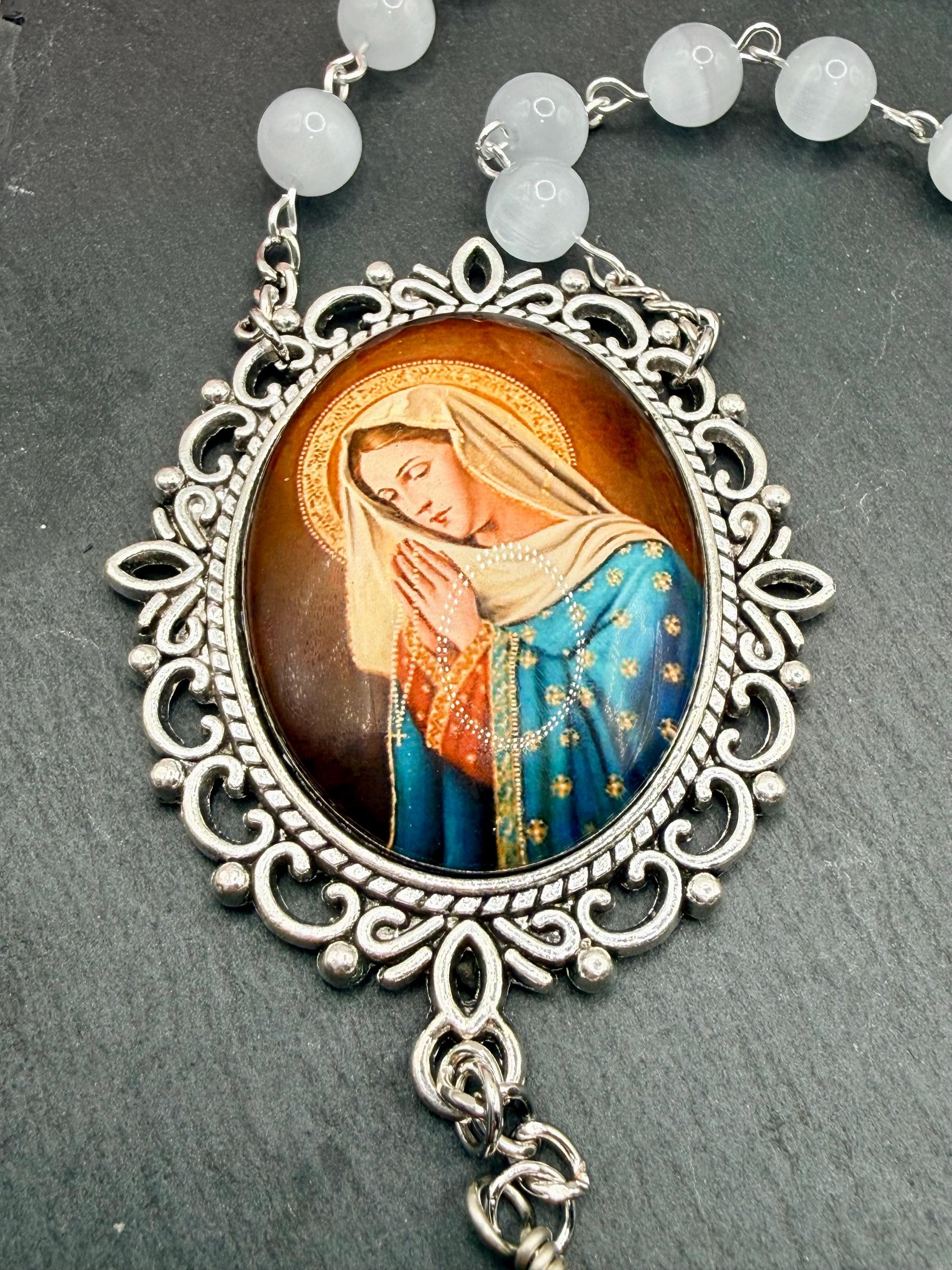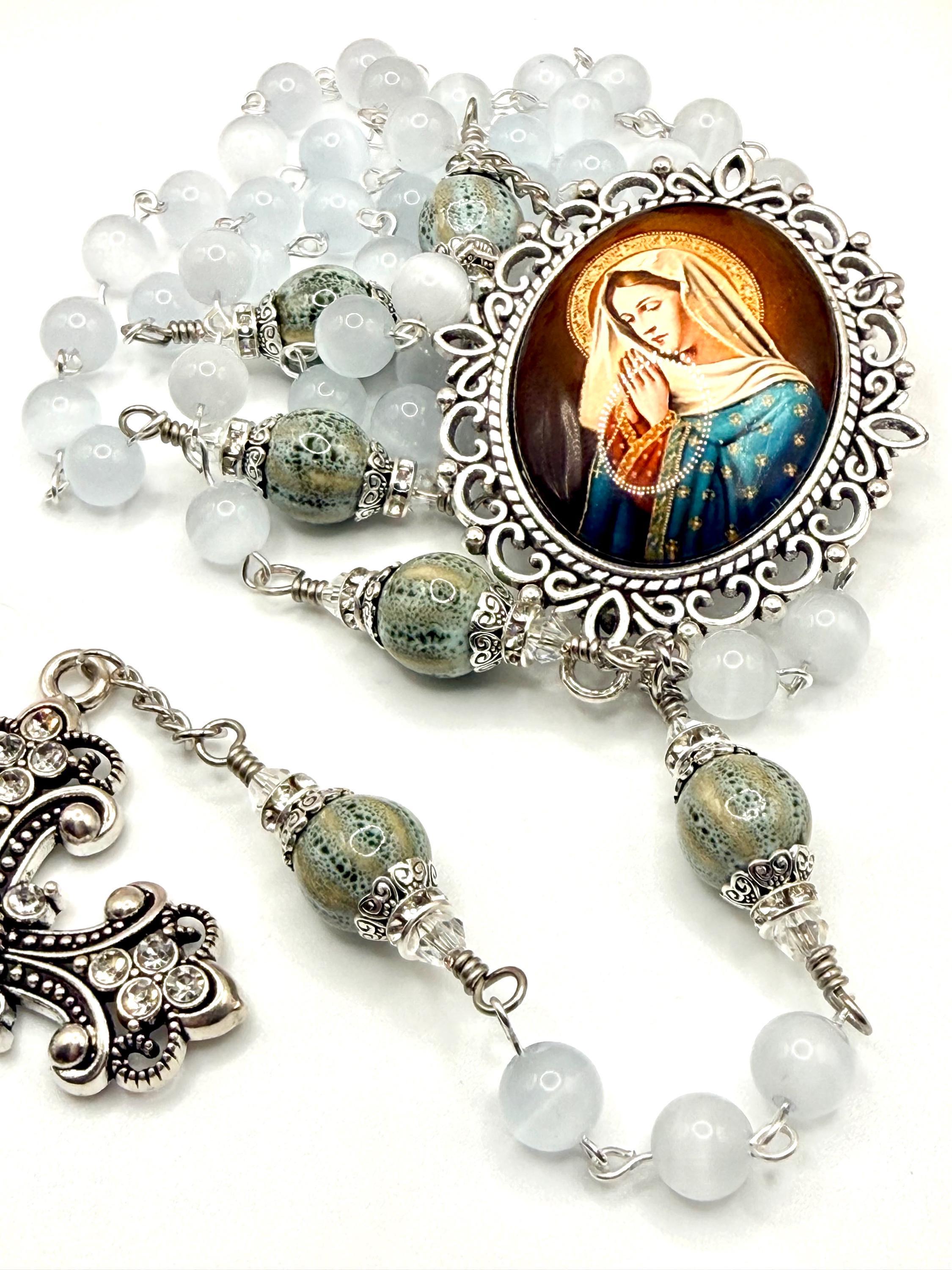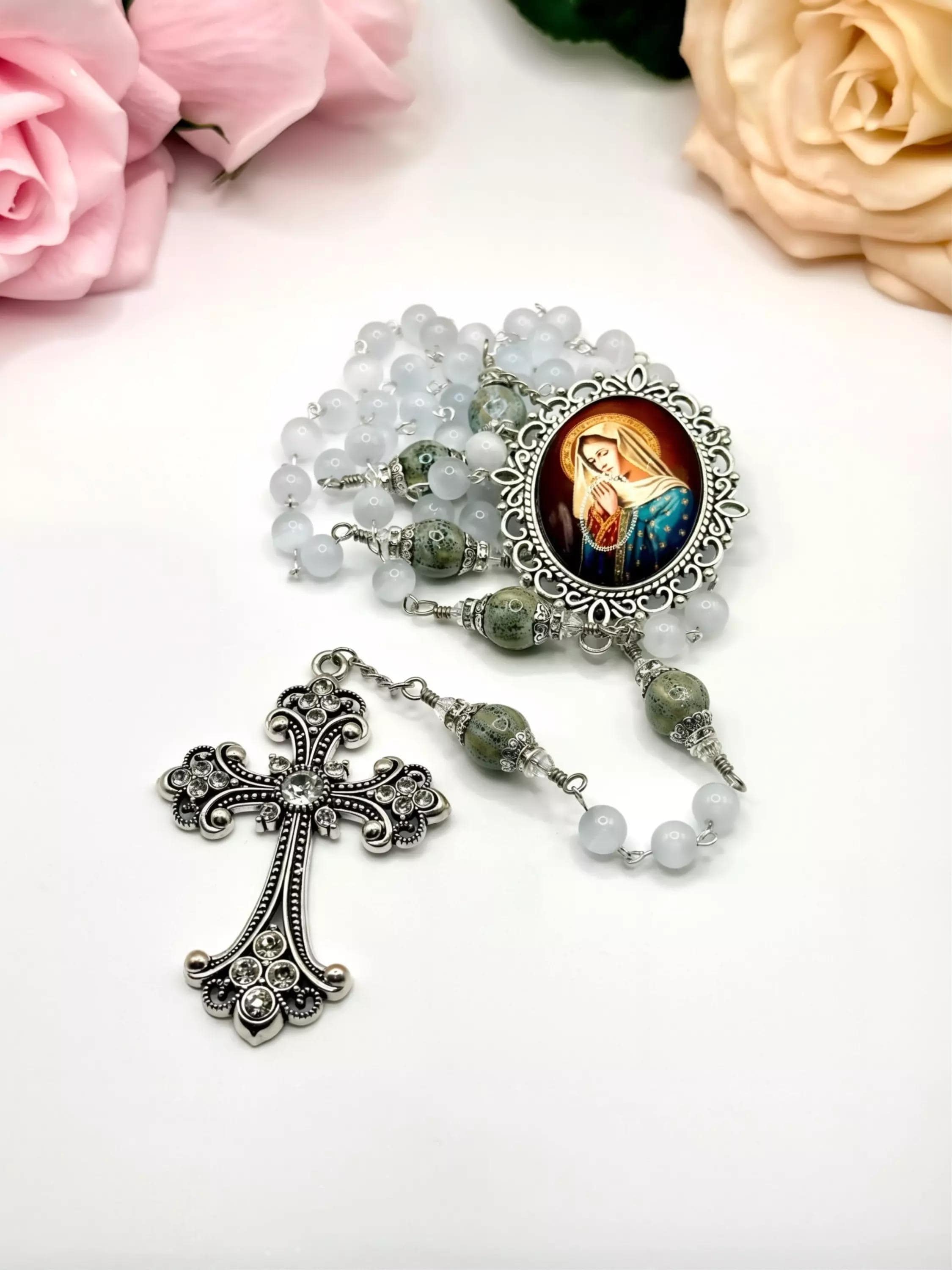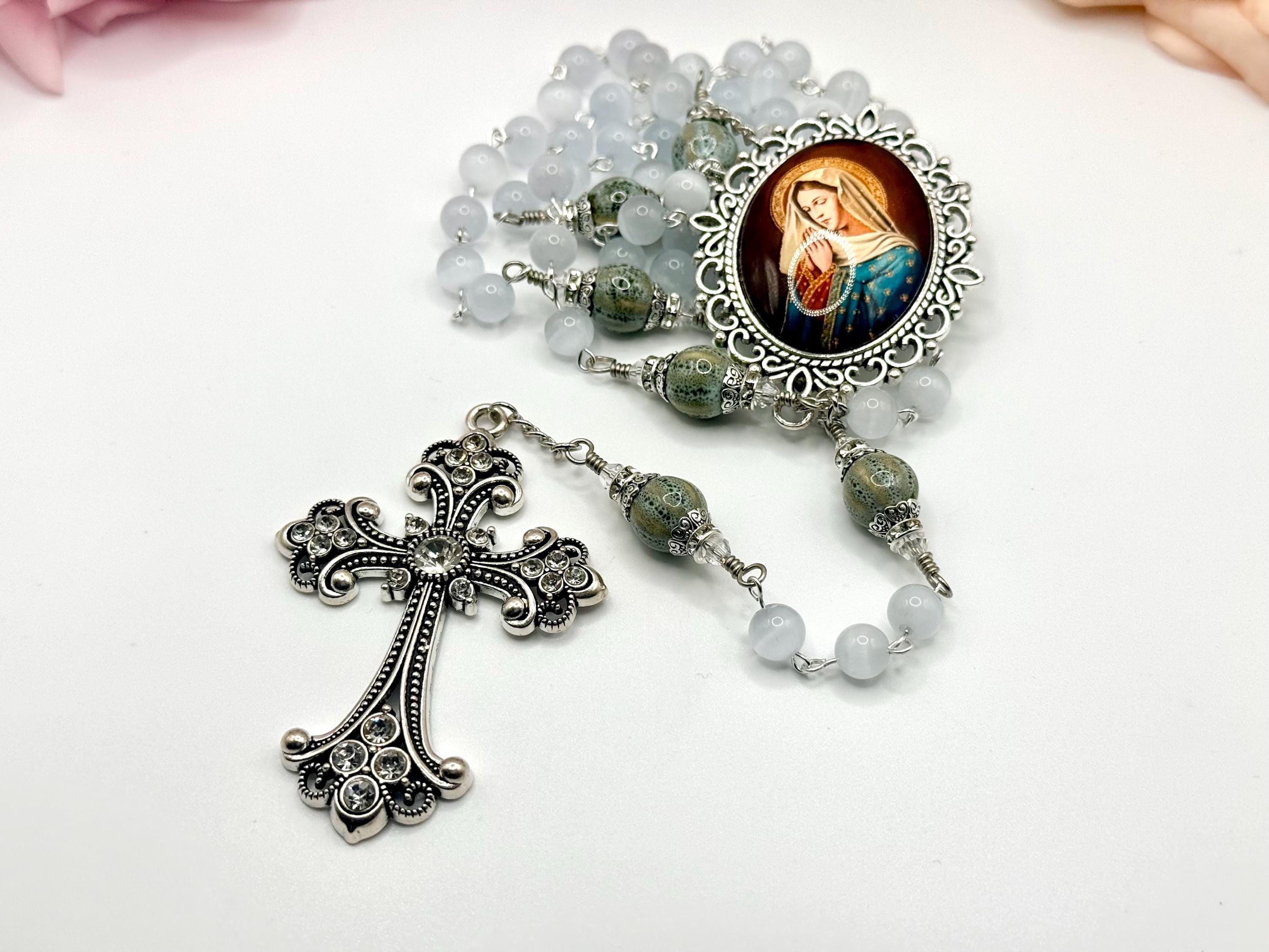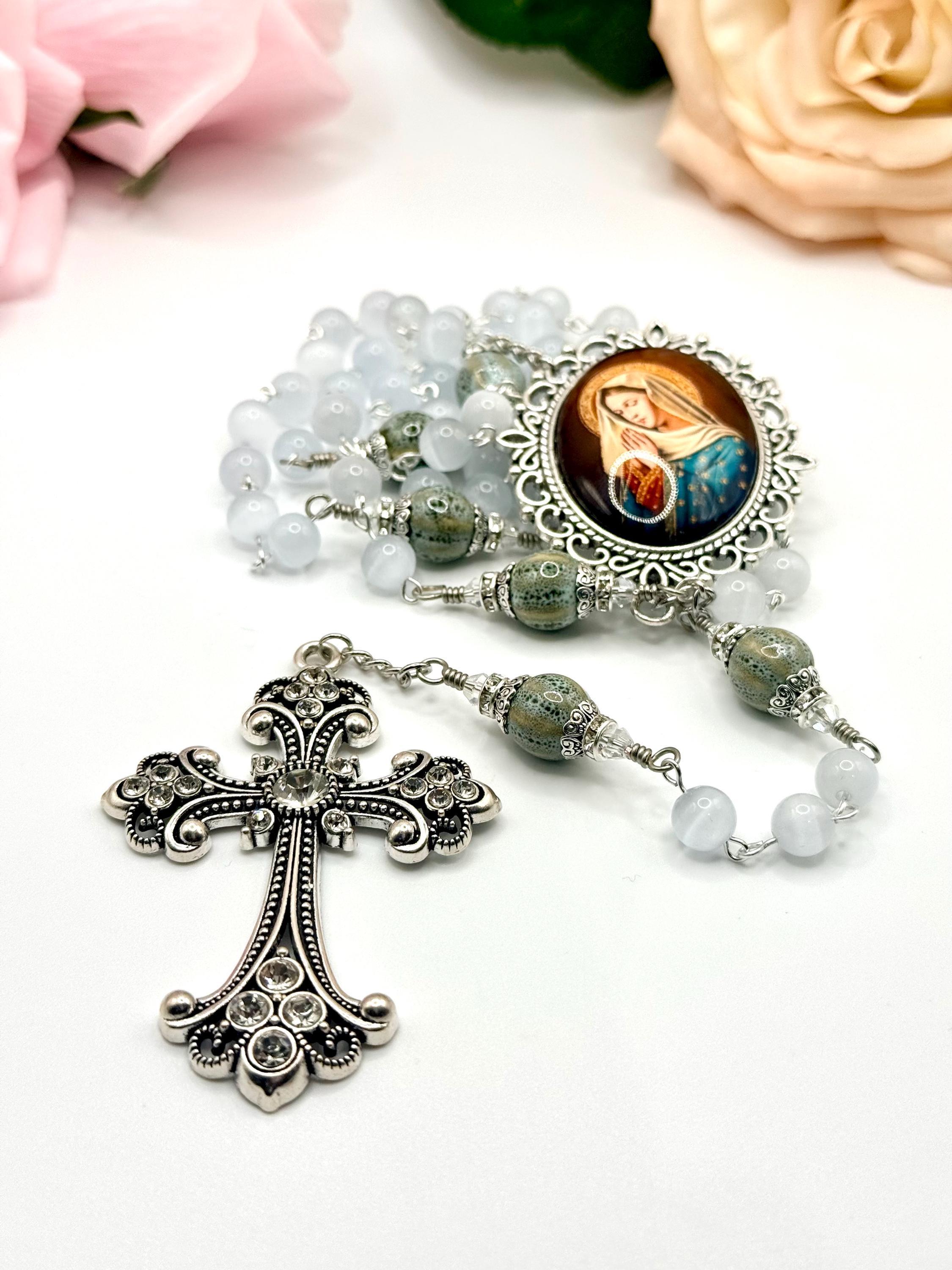 Discover the serene beauty of this handmade antique silver rosary, thoughtfully crafted with luminous white cats eye beads and distinctive ceramic Our Father beads. Each bead is carefully selected to create a meaningful prayer experience, blending tradition with unique artistry. This five decade rosary is perfect for those seeking a Catholic gift idea that combines elegance and devotion.