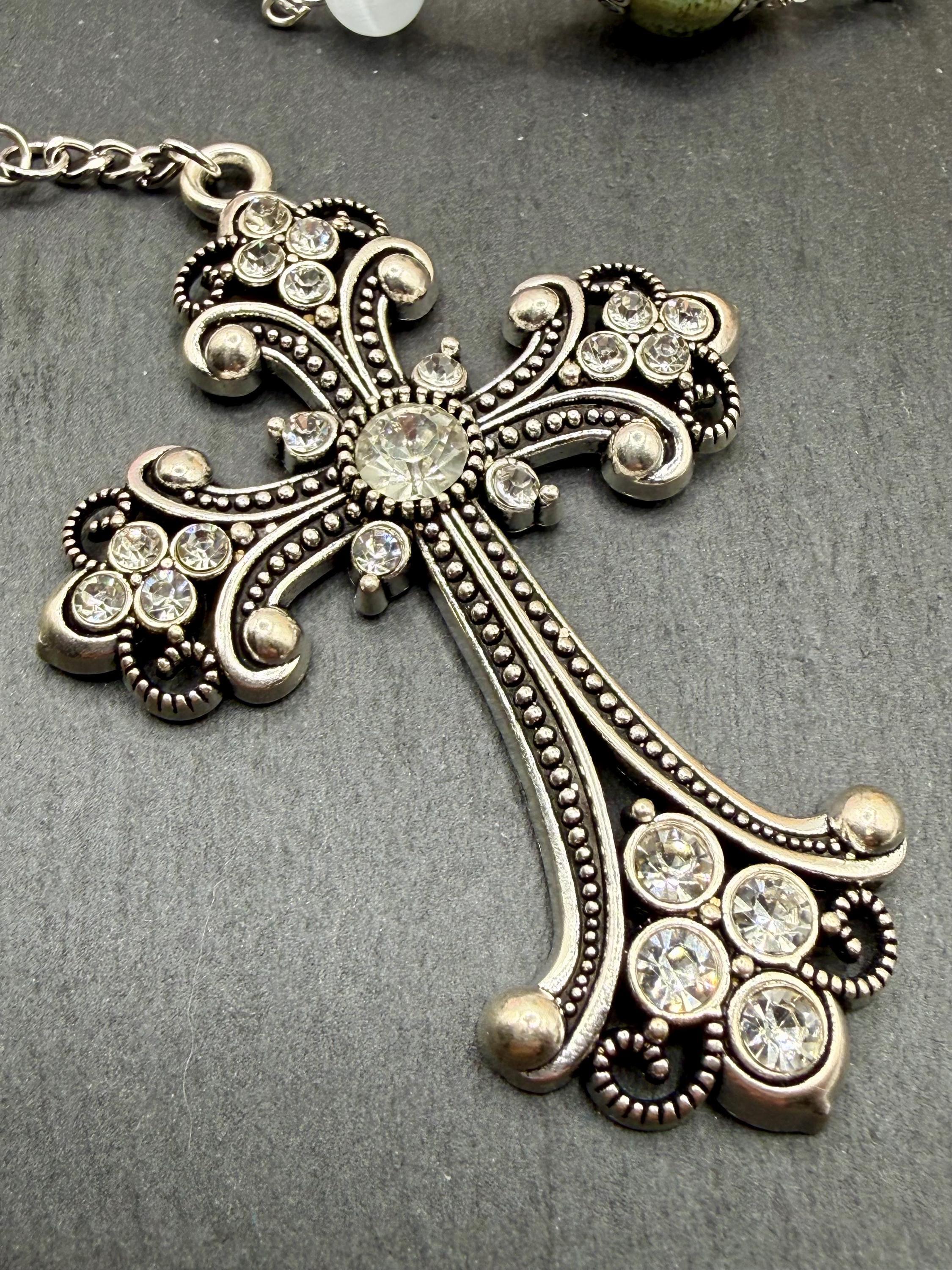 - Sparkling rhinestone crucifix that catches the light gracefully