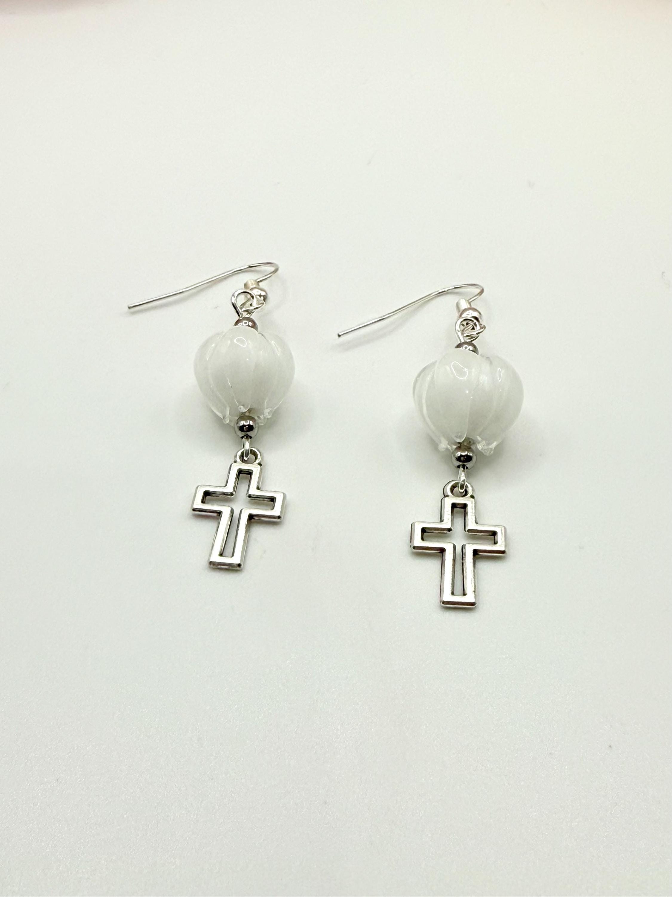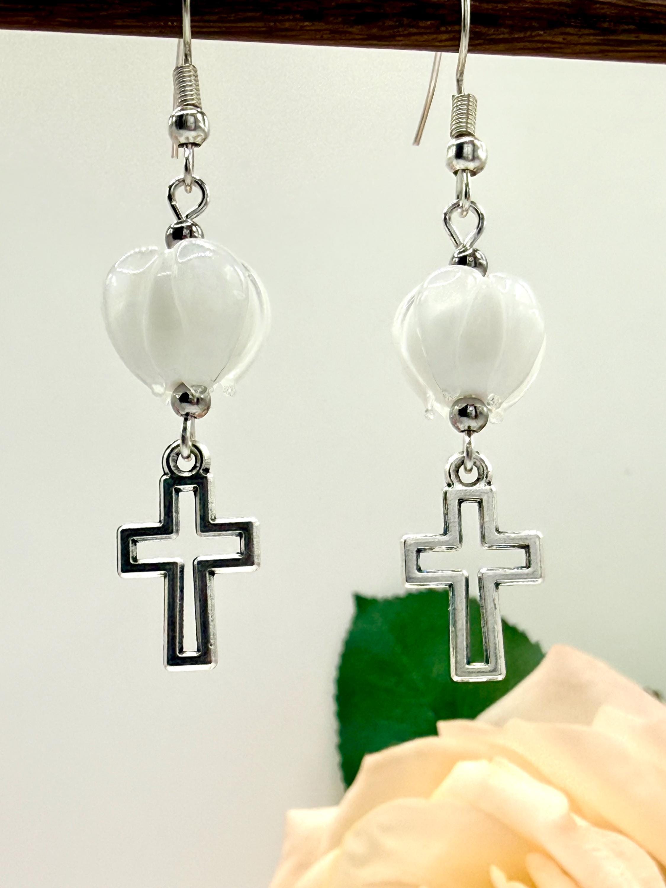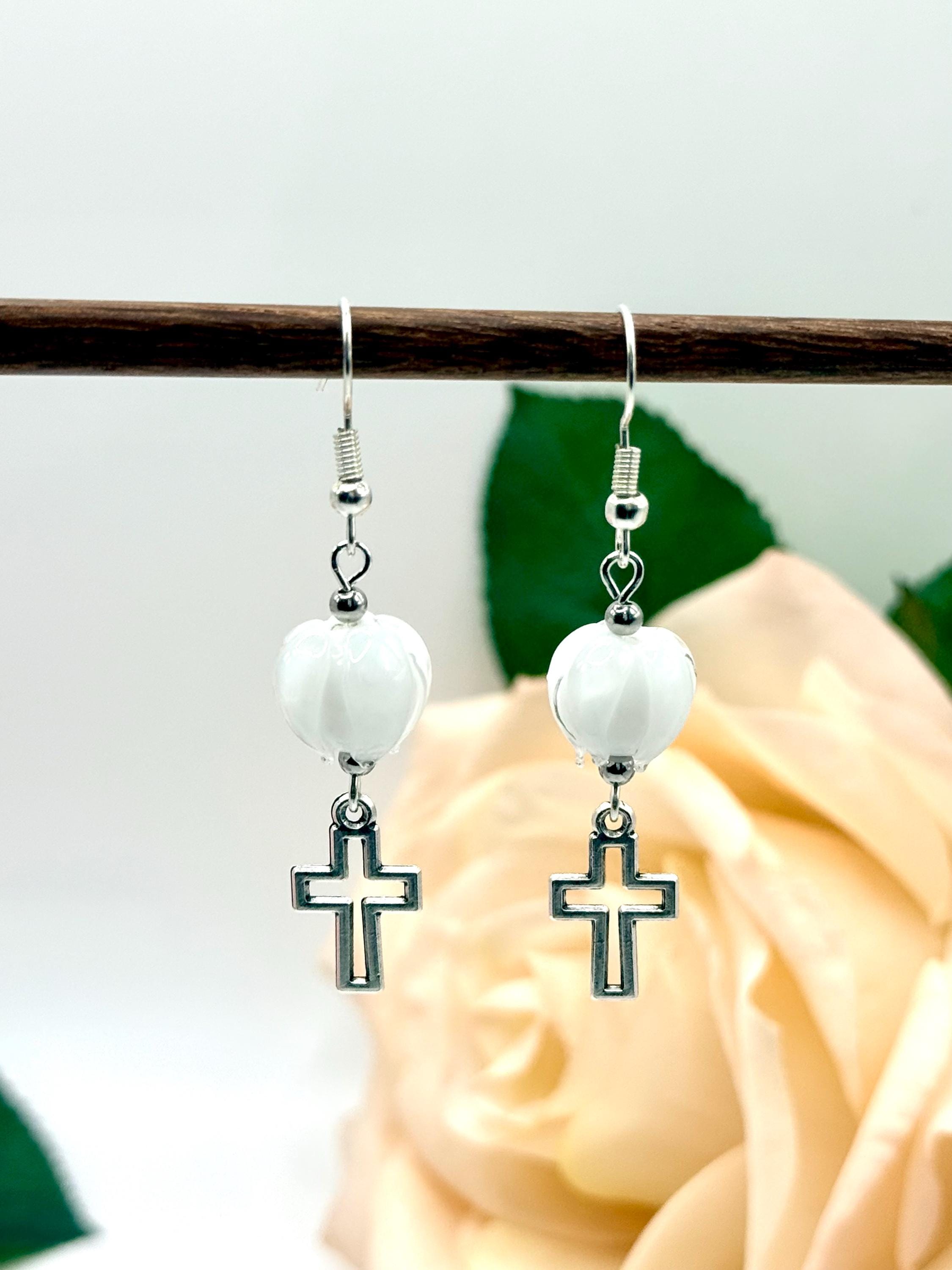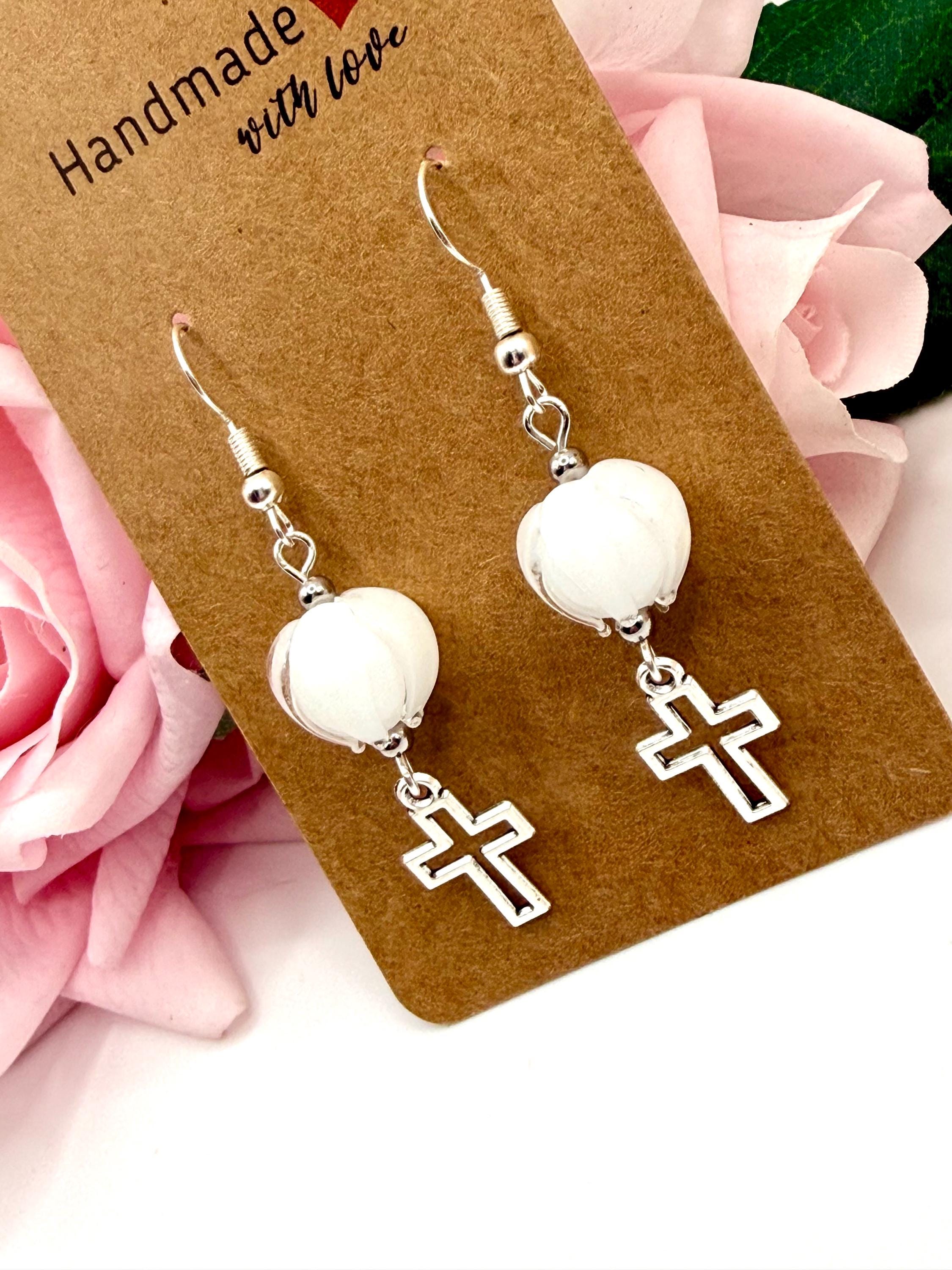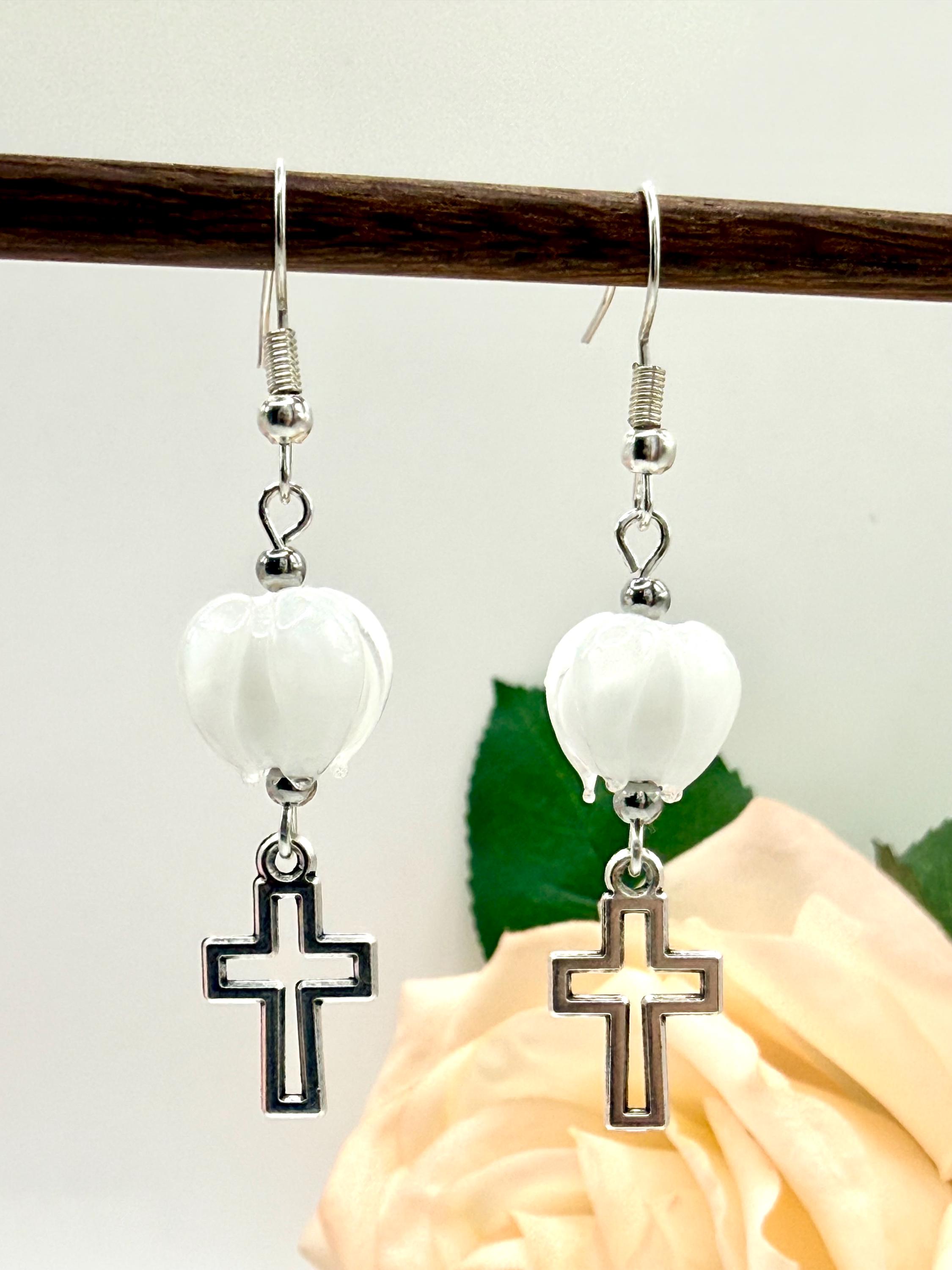Discover the delicate charm of these handmade earrings, where a vibrant Murano glass tulip meets a graceful cross charm, creating a faith-inspired gift perfect for any occasion. Designed with Christian women in mind, these tulip cross dangle earrings blend artistry and devotion in every handcrafted detail. Whether you're searching for Easter jewelry or a meaningful baptism gift, this pair offers timeless elegance and heartfelt symbolism.
