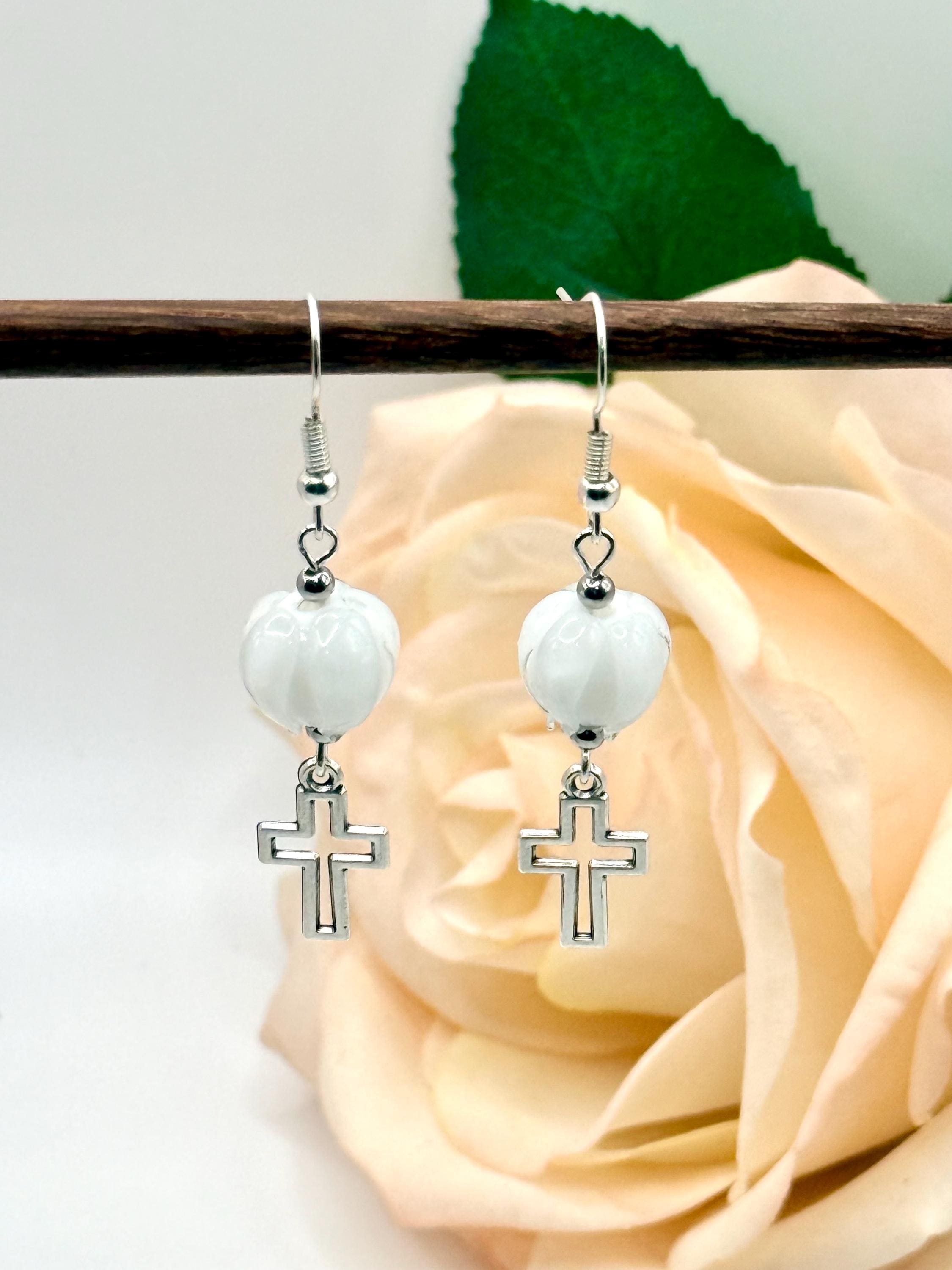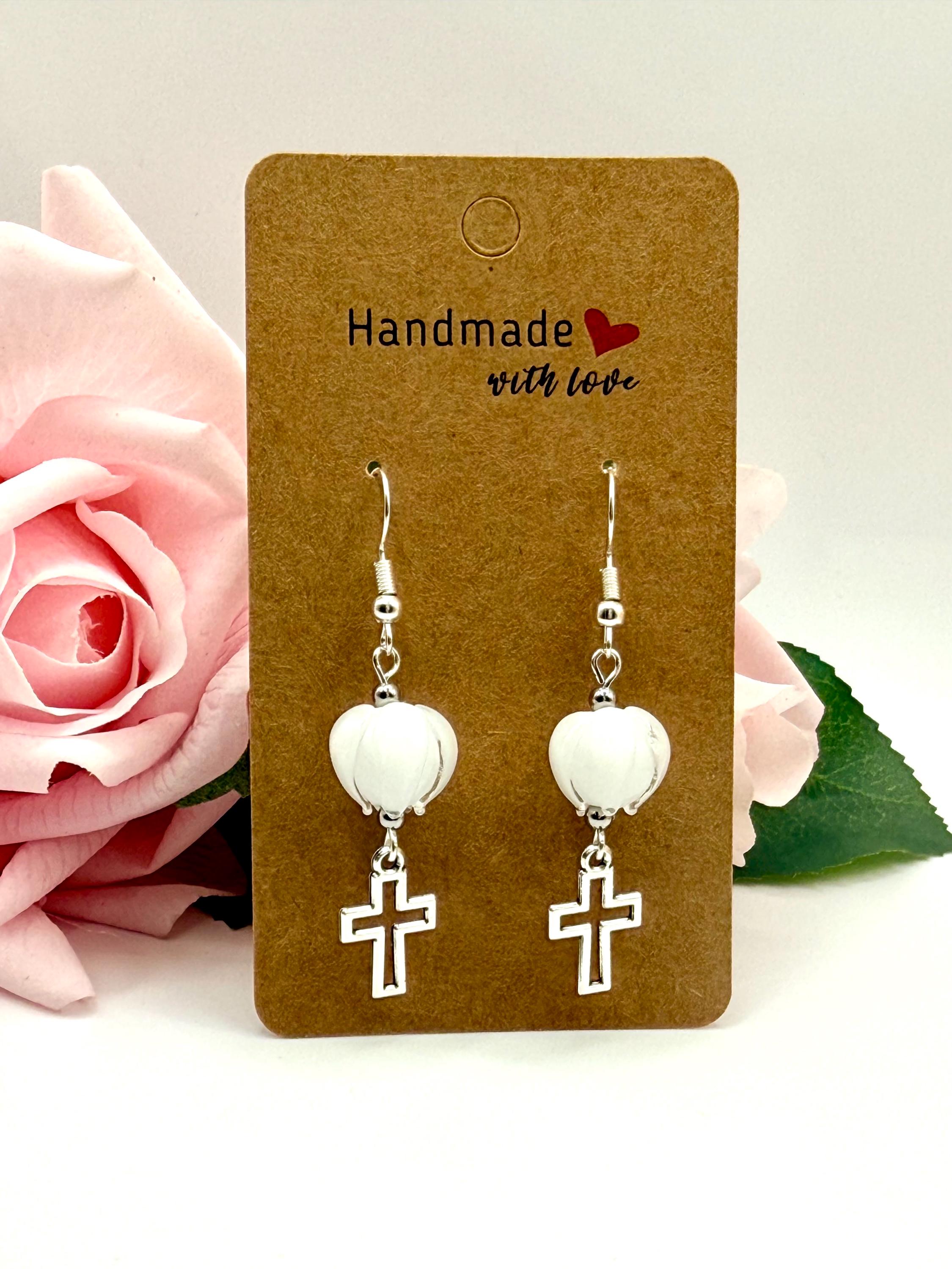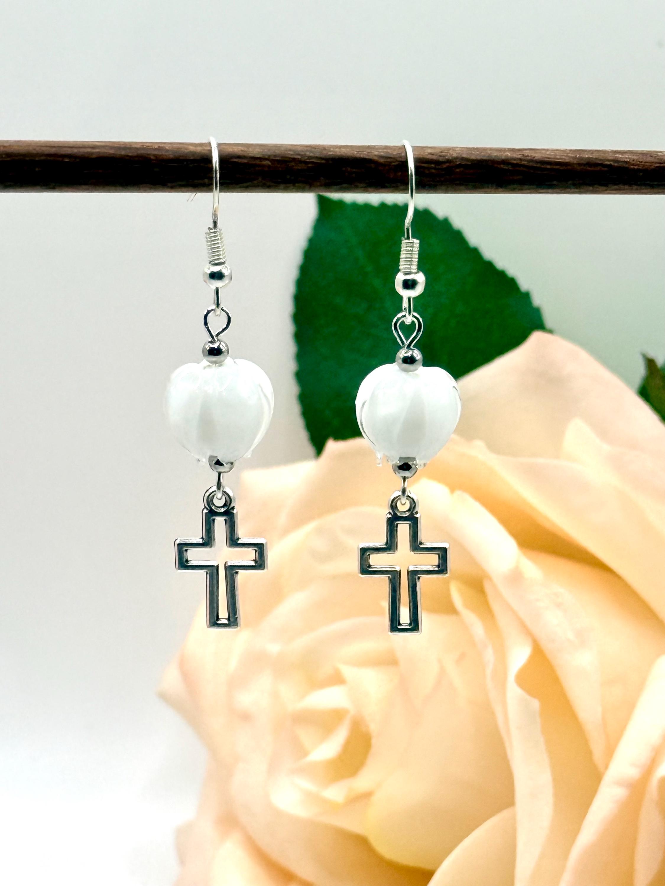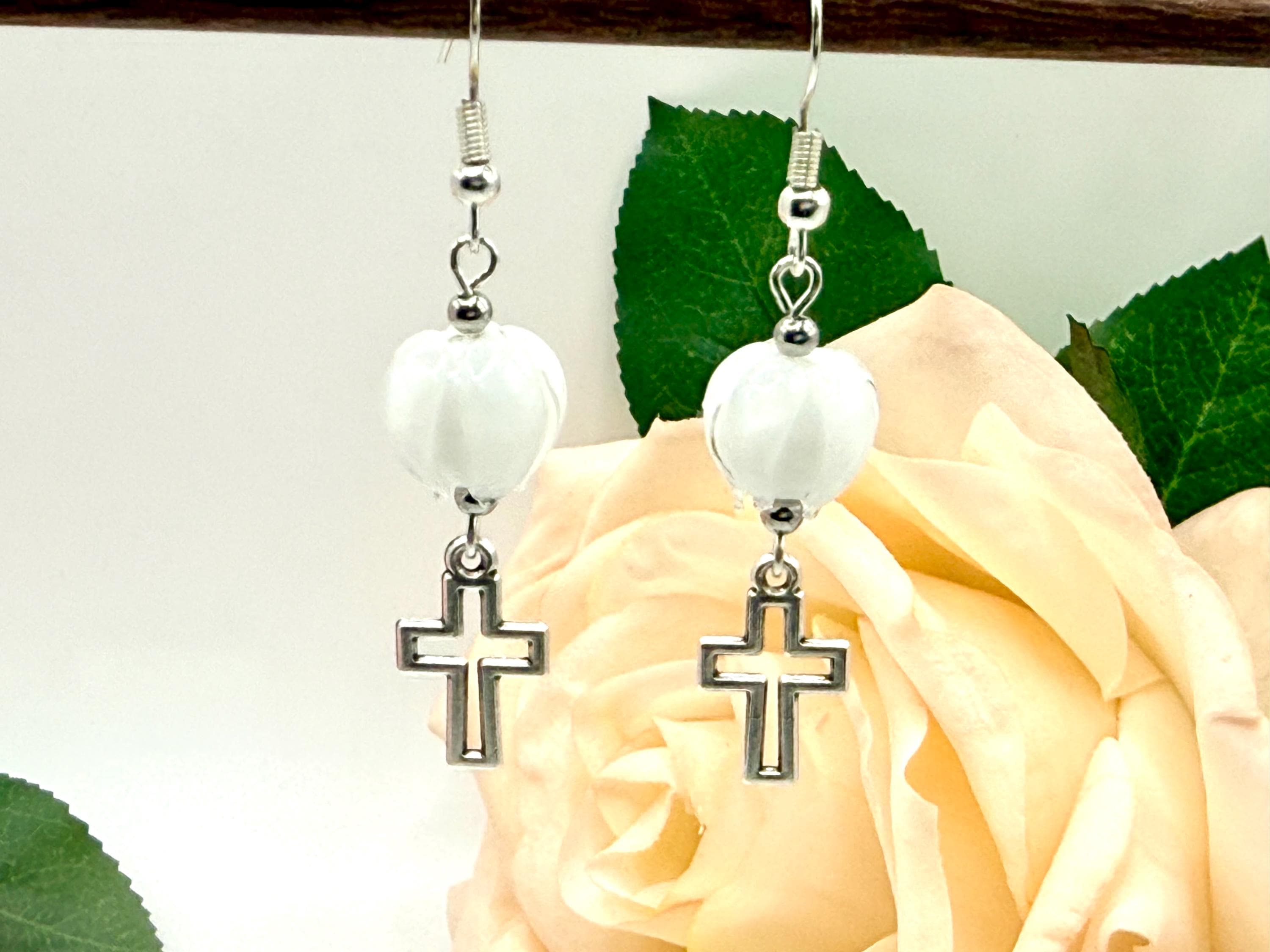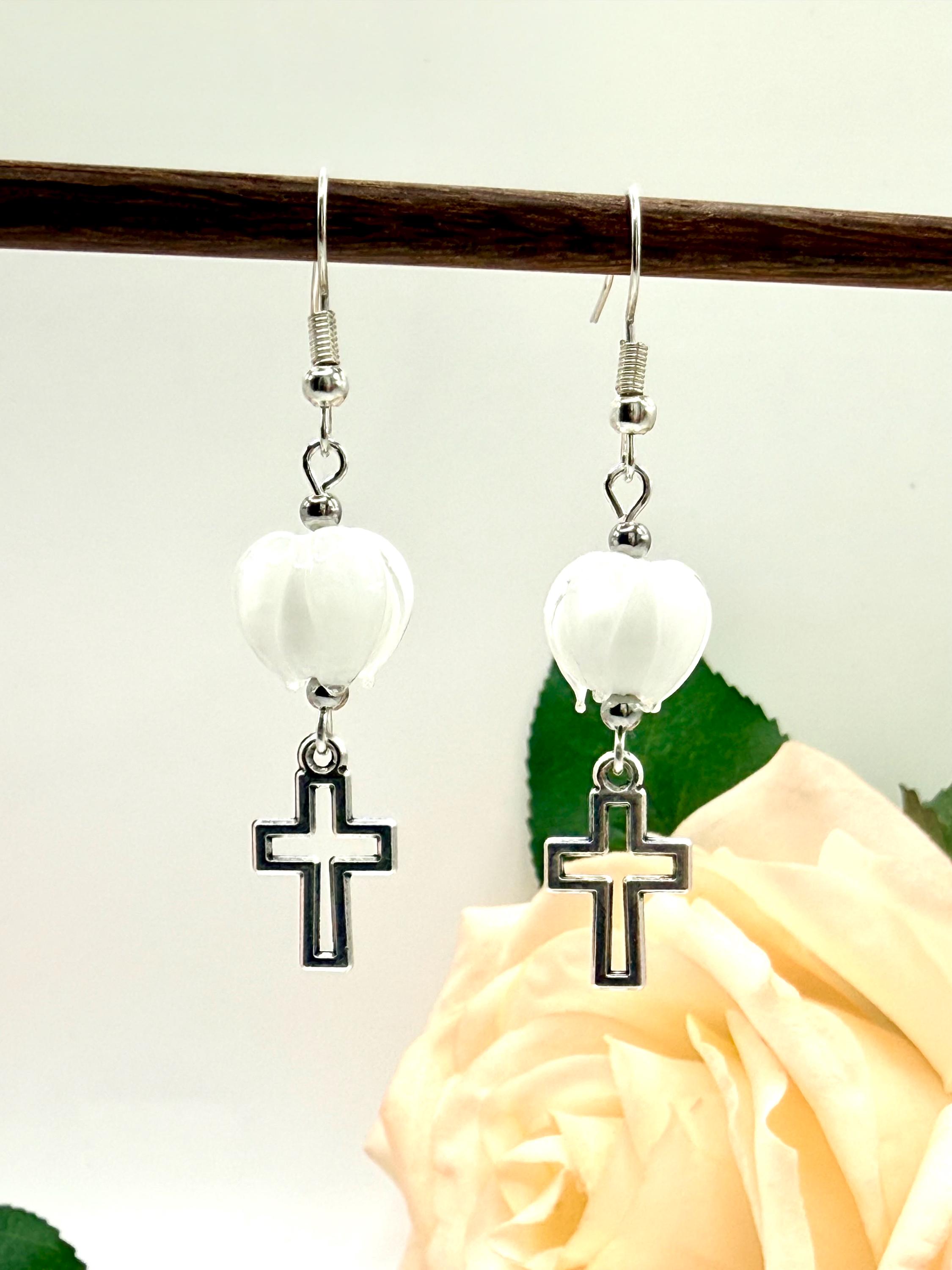 Discover the delicate charm of these handmade earrings, where a vibrant Murano glass tulip meets a graceful cross charm, creating a faith-inspired gift perfect for any occasion. Designed with Christian women in mind, these tulip cross dangle earrings blend artistry and devotion in every handcrafted detail. Whether you're searching for Easter jewelry or a meaningful baptism gift, this pair offers timeless elegance and heartfelt symbolism.